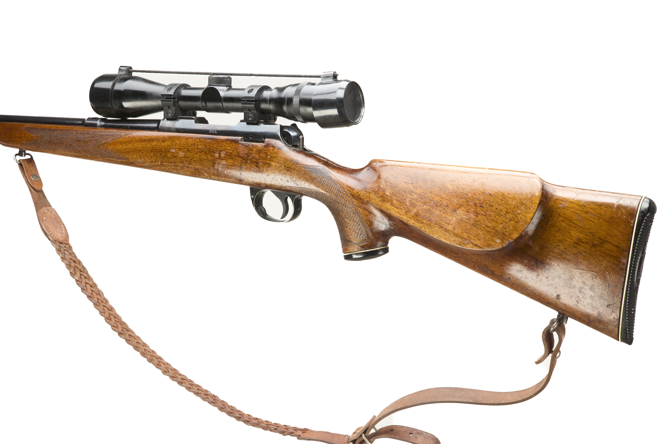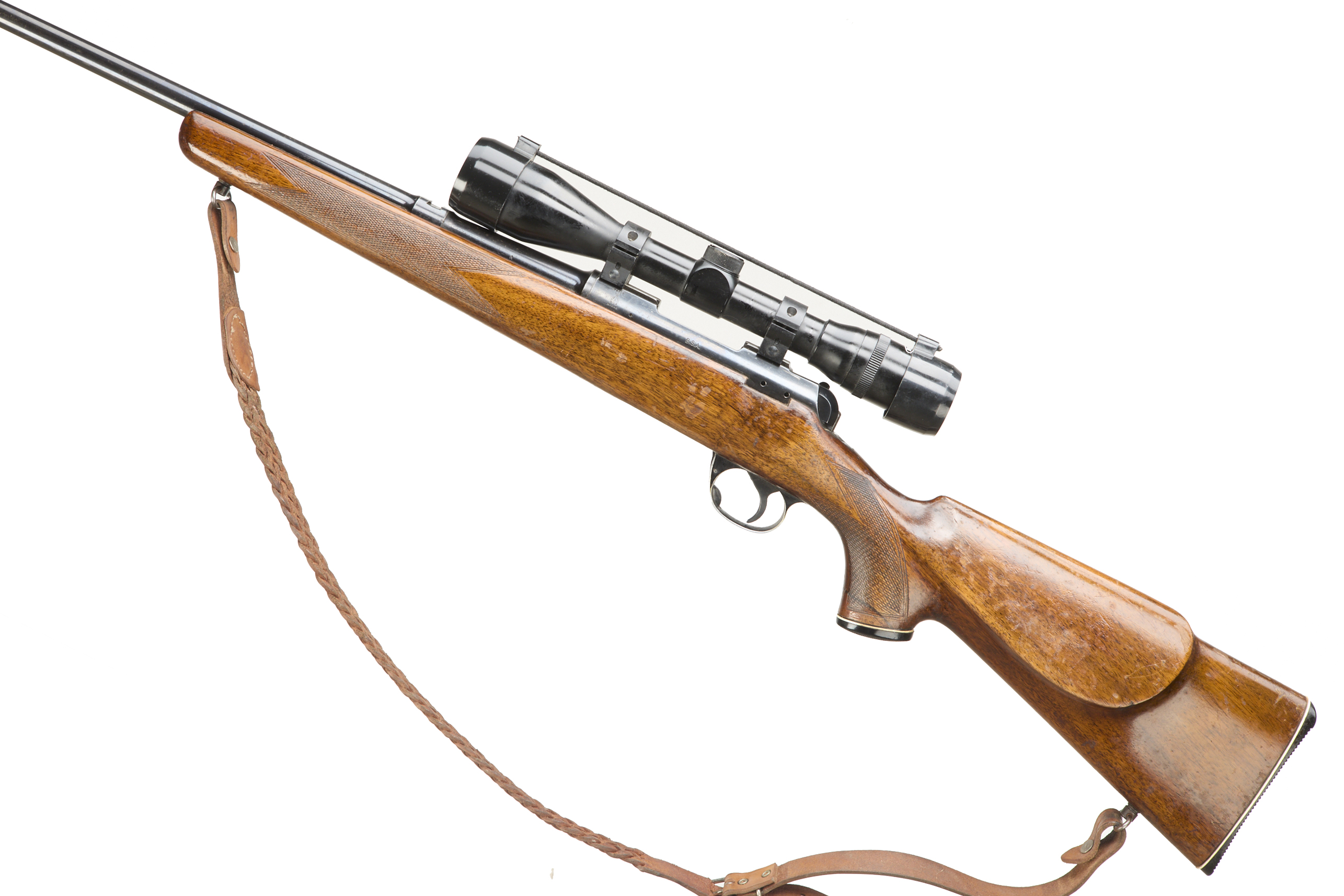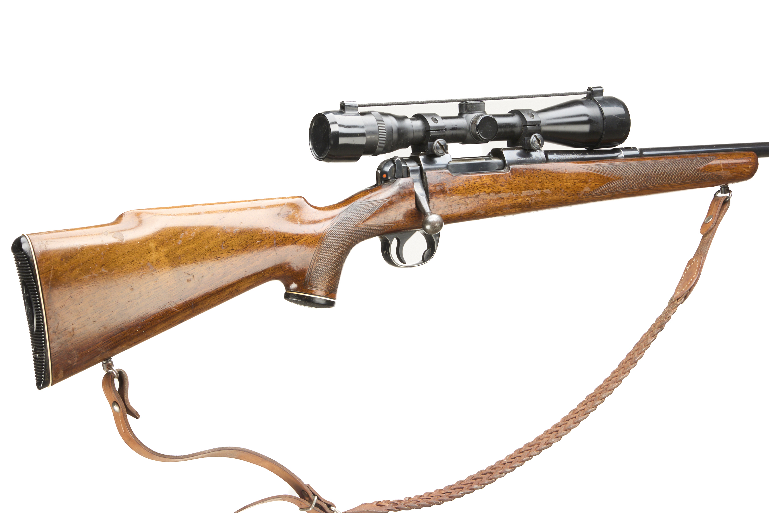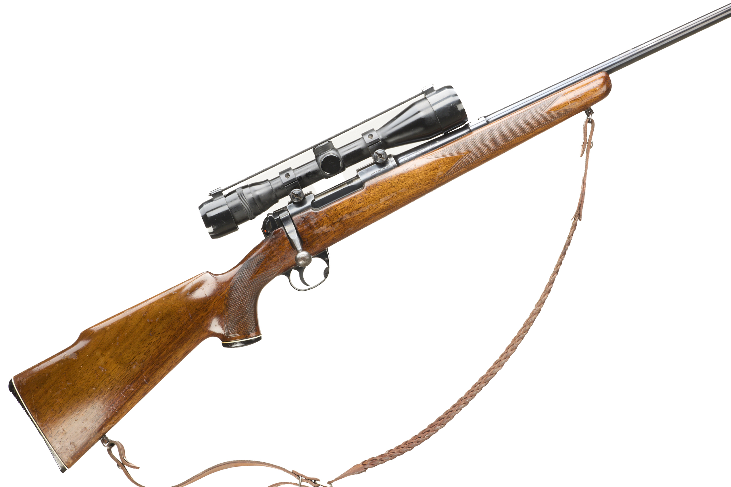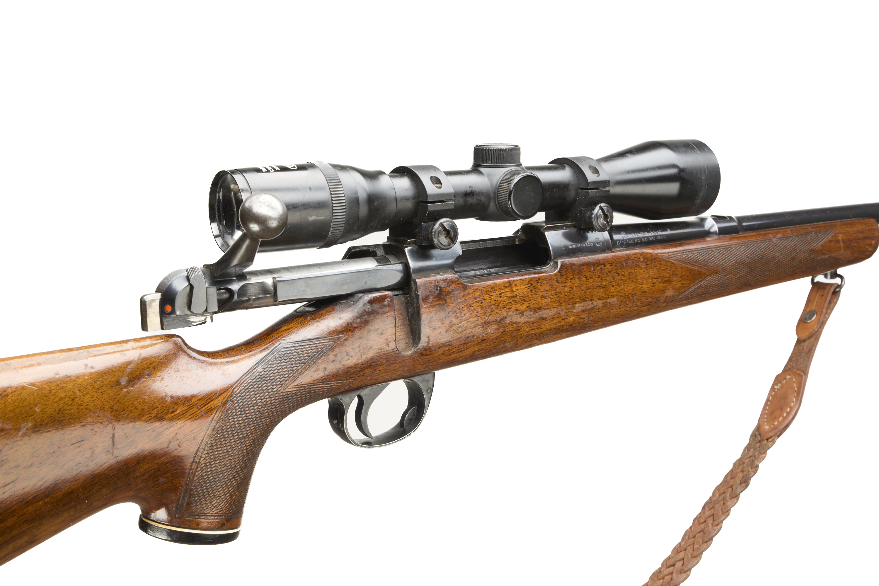 Ebonite butt, semi-pistol grip, rounded forend. Sling attachments and leather sling. Plain muzzle. Internal magazine with hinged floor plate.