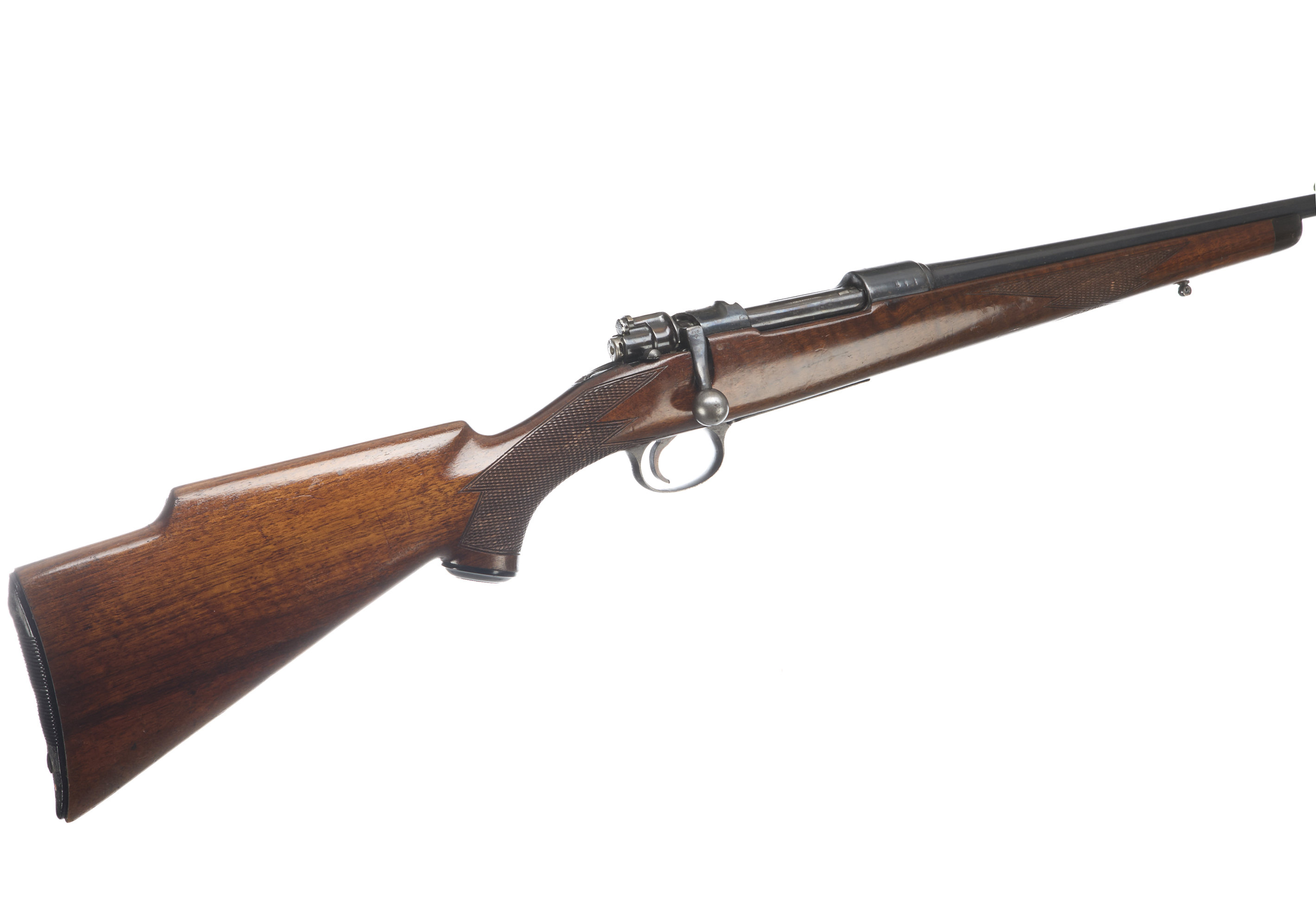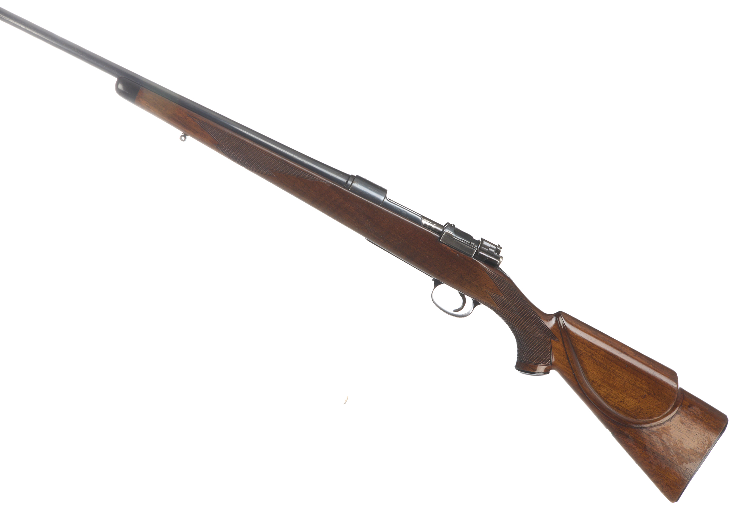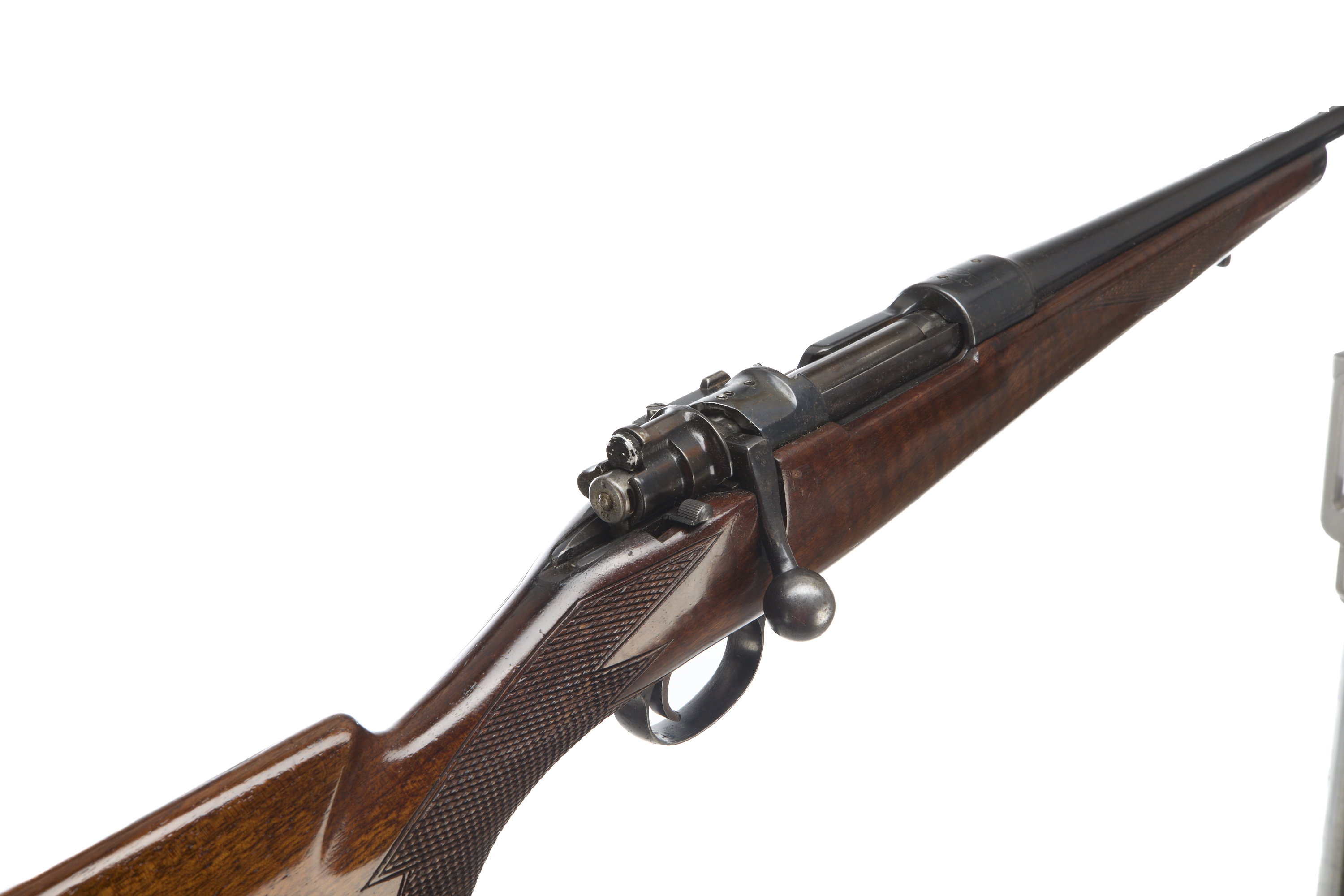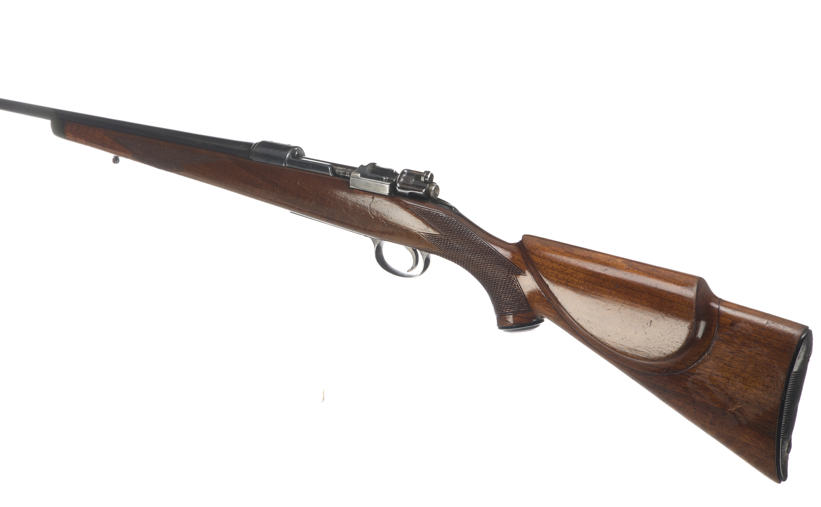 Plastic butt, semi-pistol grip, rounded forend with horn tips to both. Plain muzzle, unsighted barrel. Internal magazine with hinged floor plate. Gw98 action with side safety.