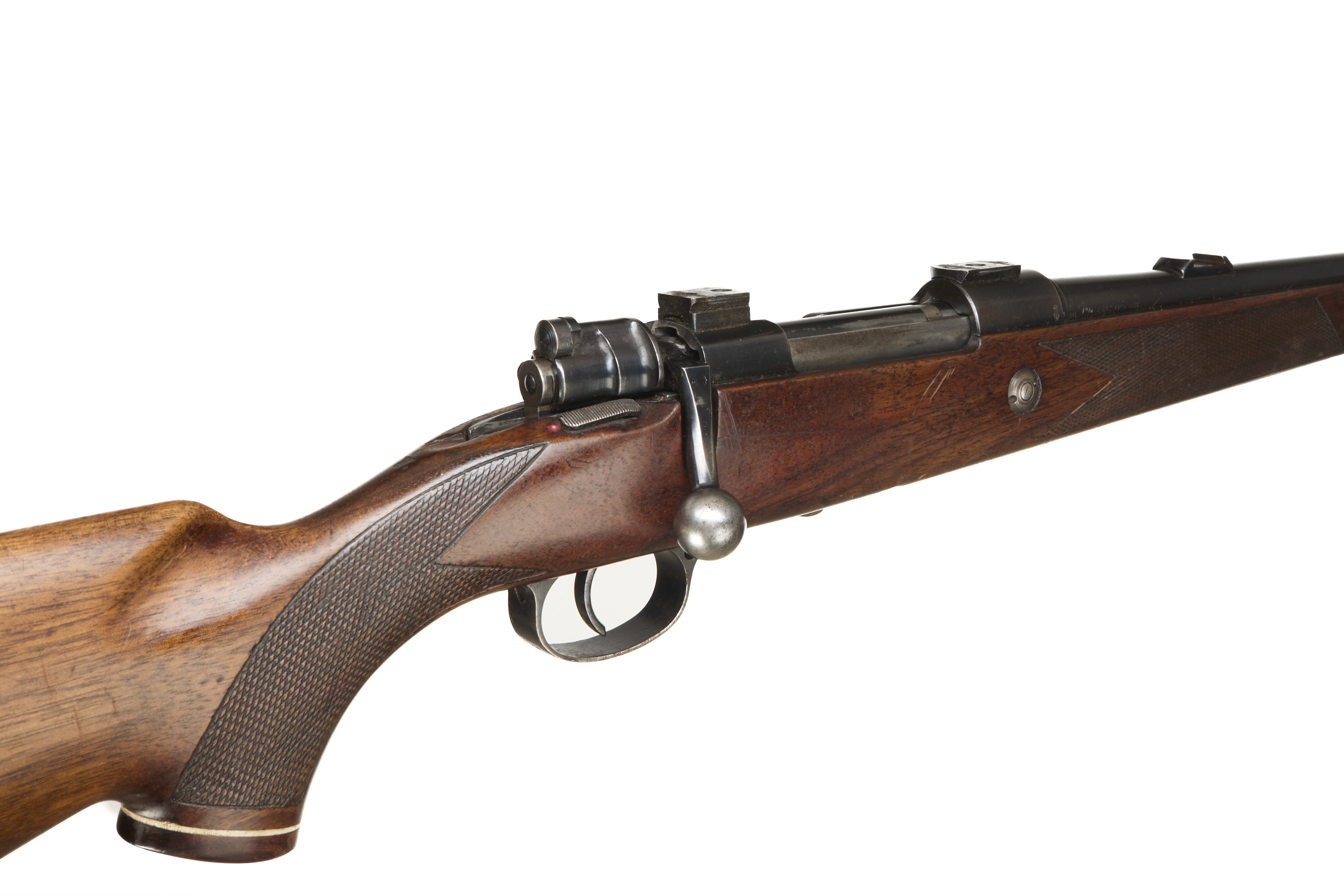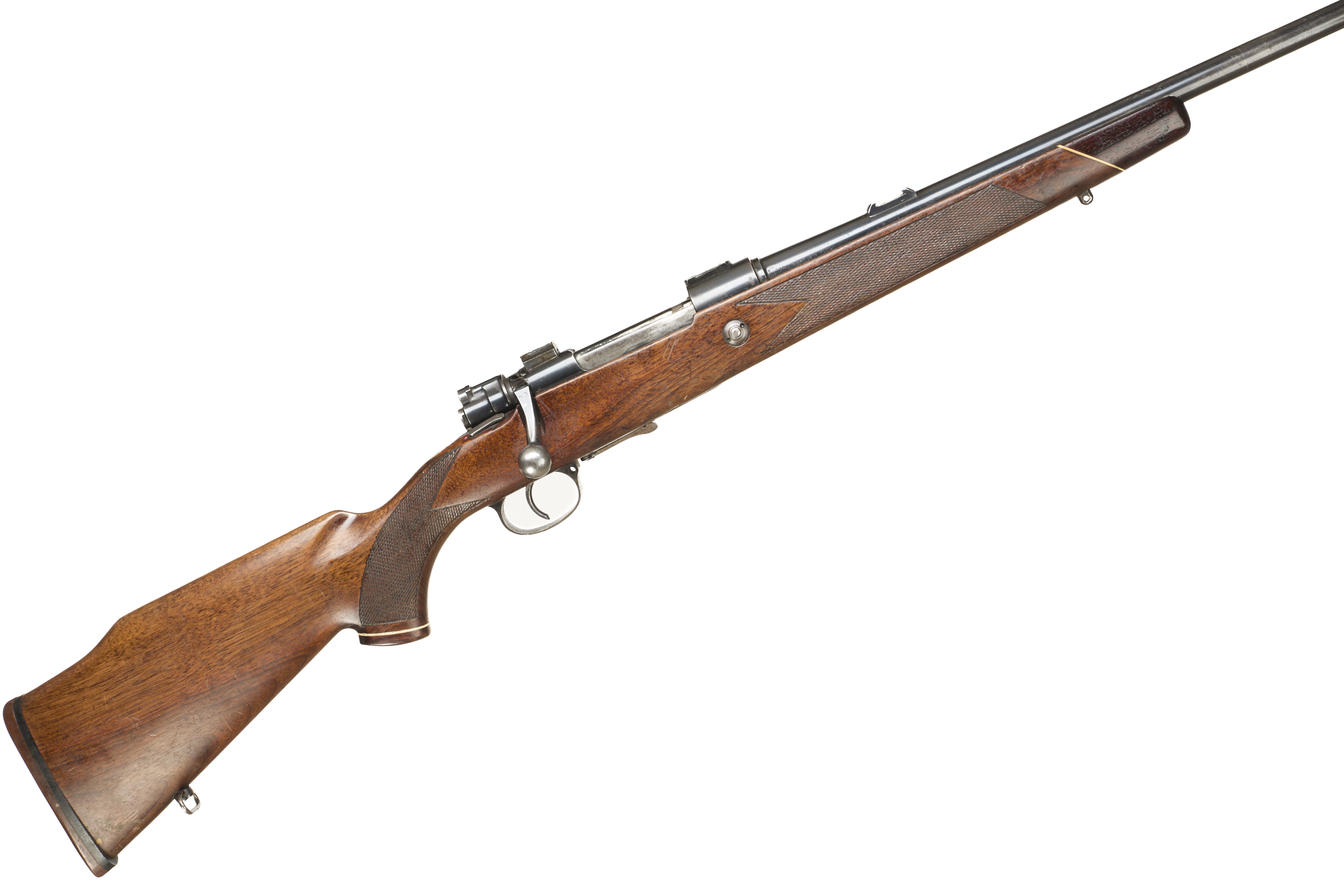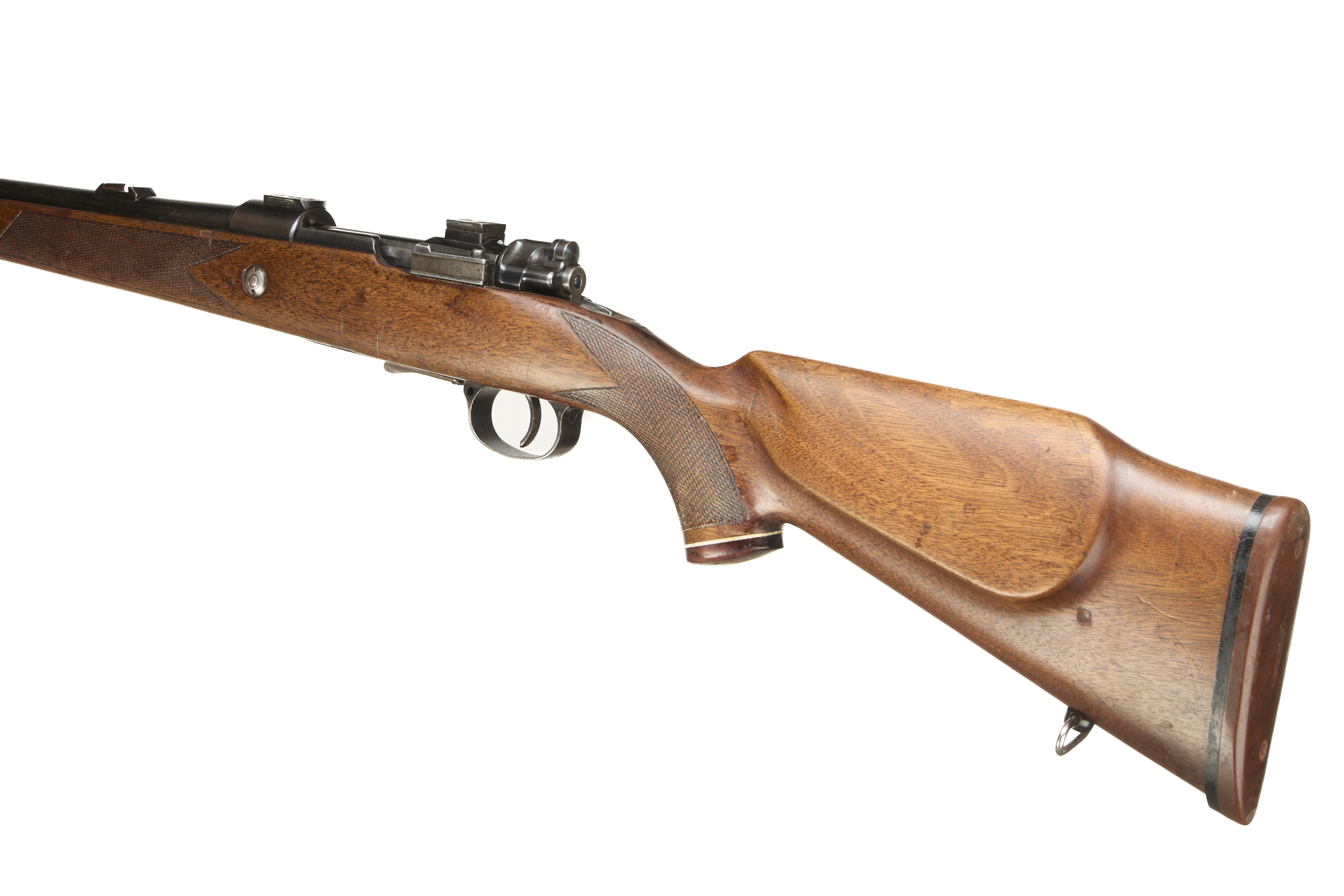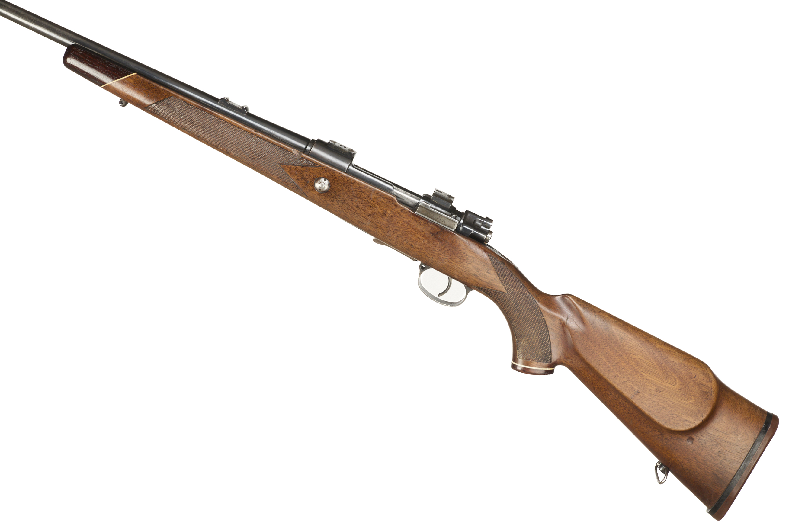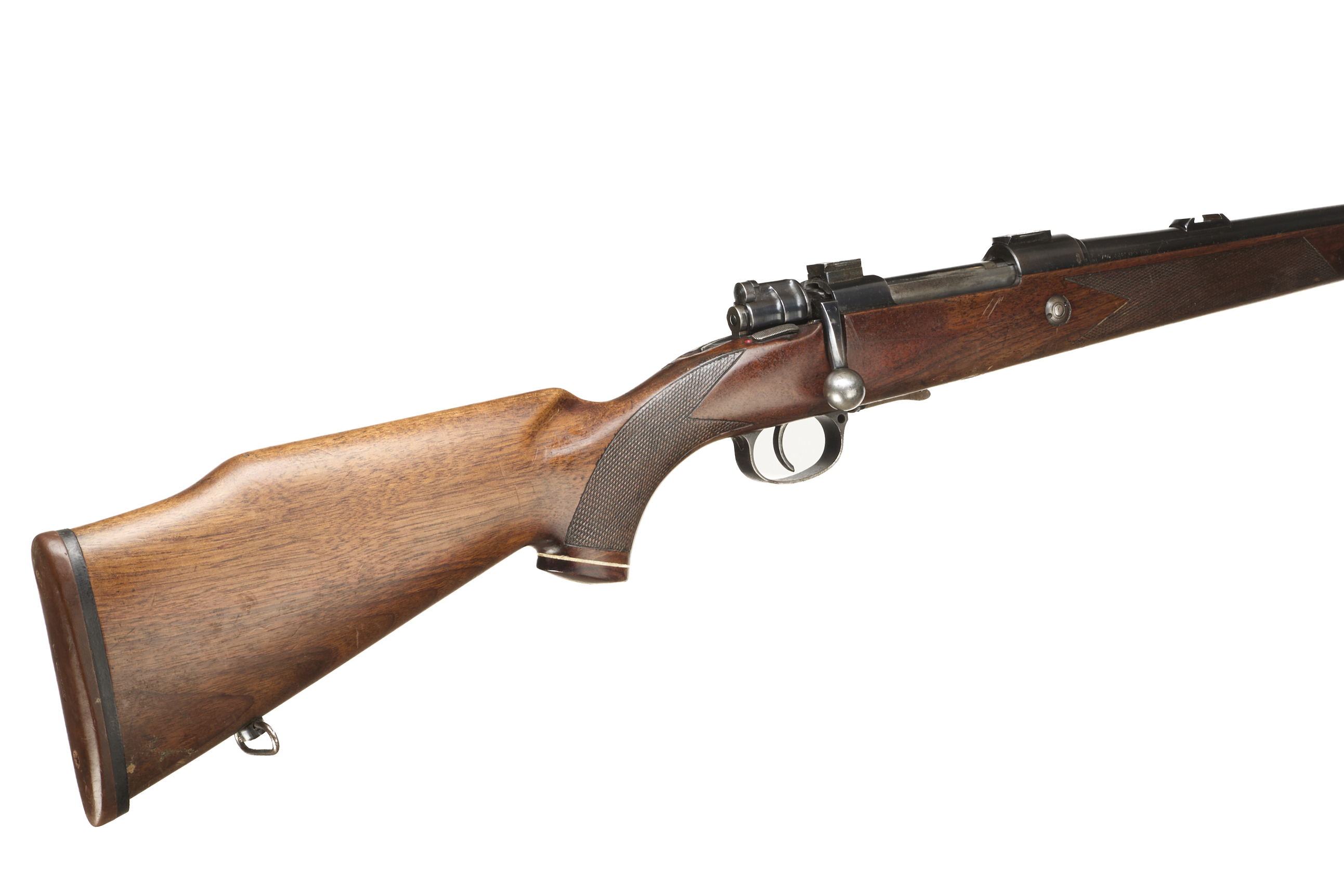 Rubber butt, semi-pistol grip, rounded forend, rosewood caps to both. Sling attachments, plain muzzle, bead foresight, rearsight absent. Internal magazine with releasable hinged floor plate. Gew98 action.