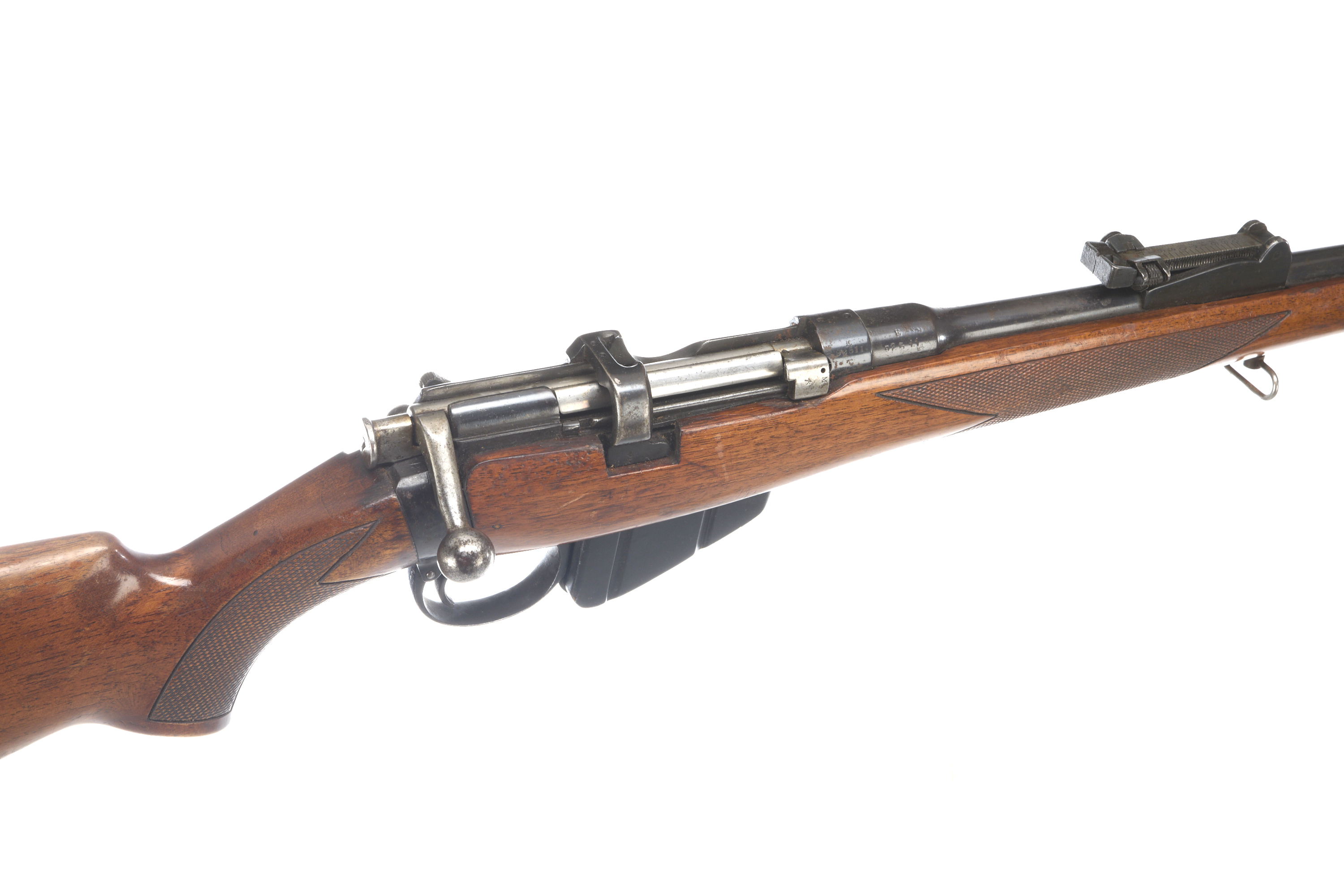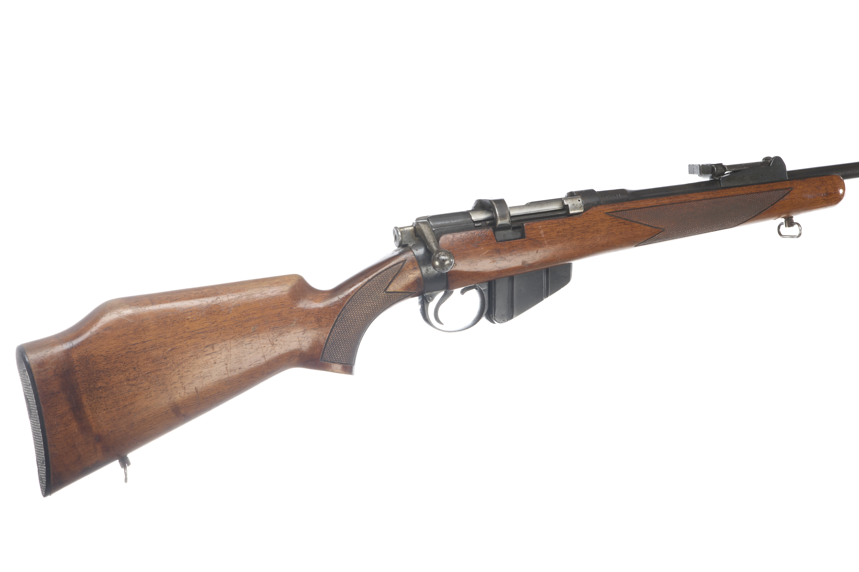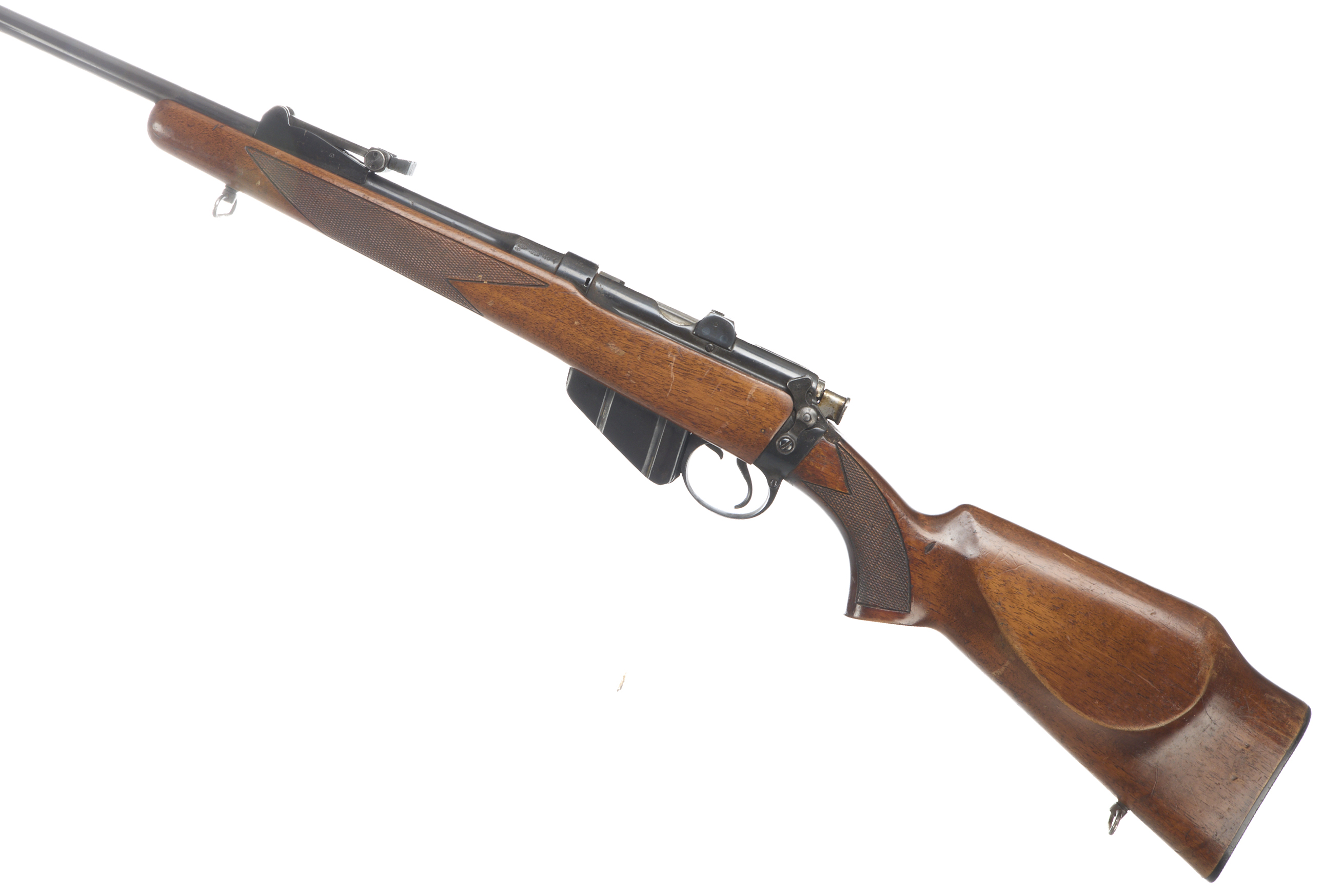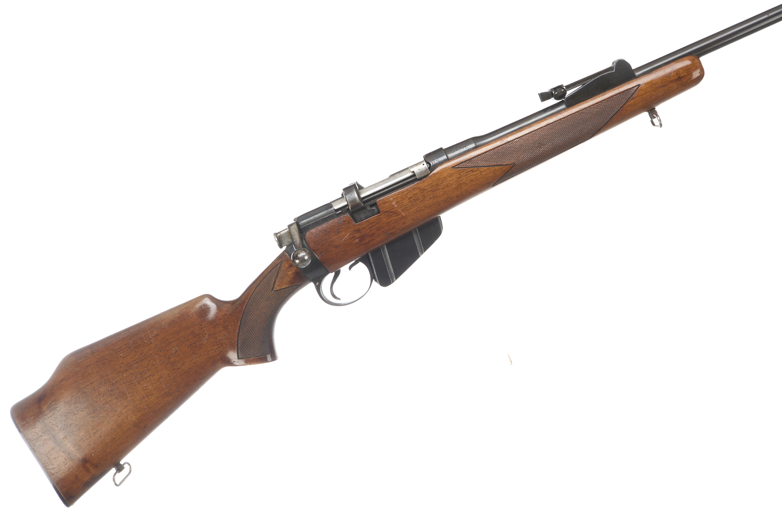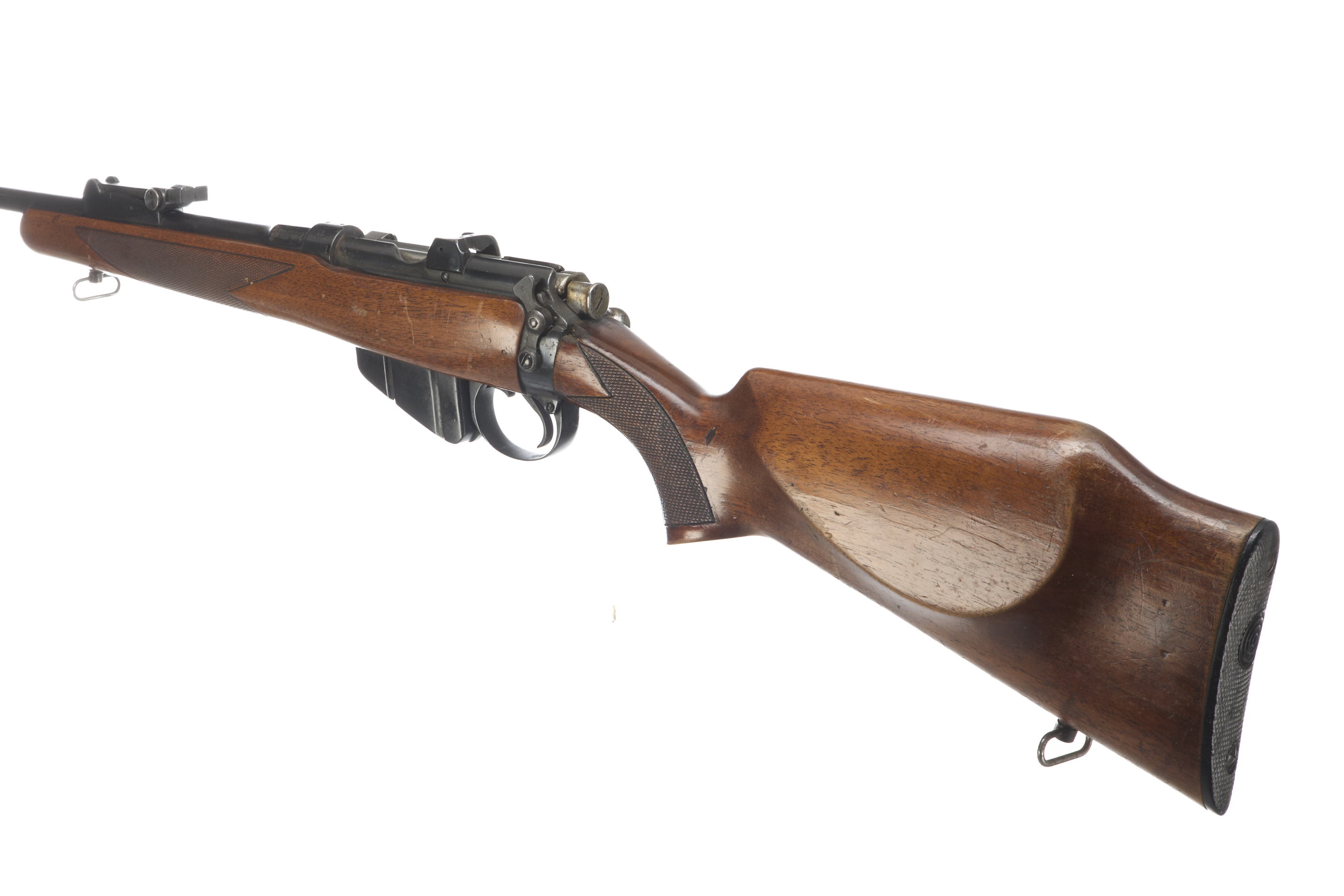 Ebonite butt plate, chequered semi-pistol grip and forend, raised cheek piece. Adjustable, large rearsight, ramp blade foresight. Screw cut for scope. Sling swivels. Detachable magazine. Side flag safety.