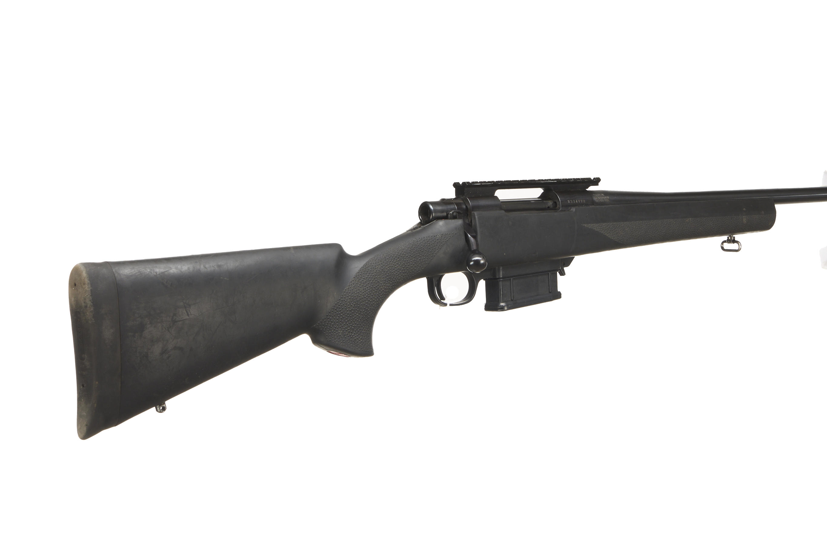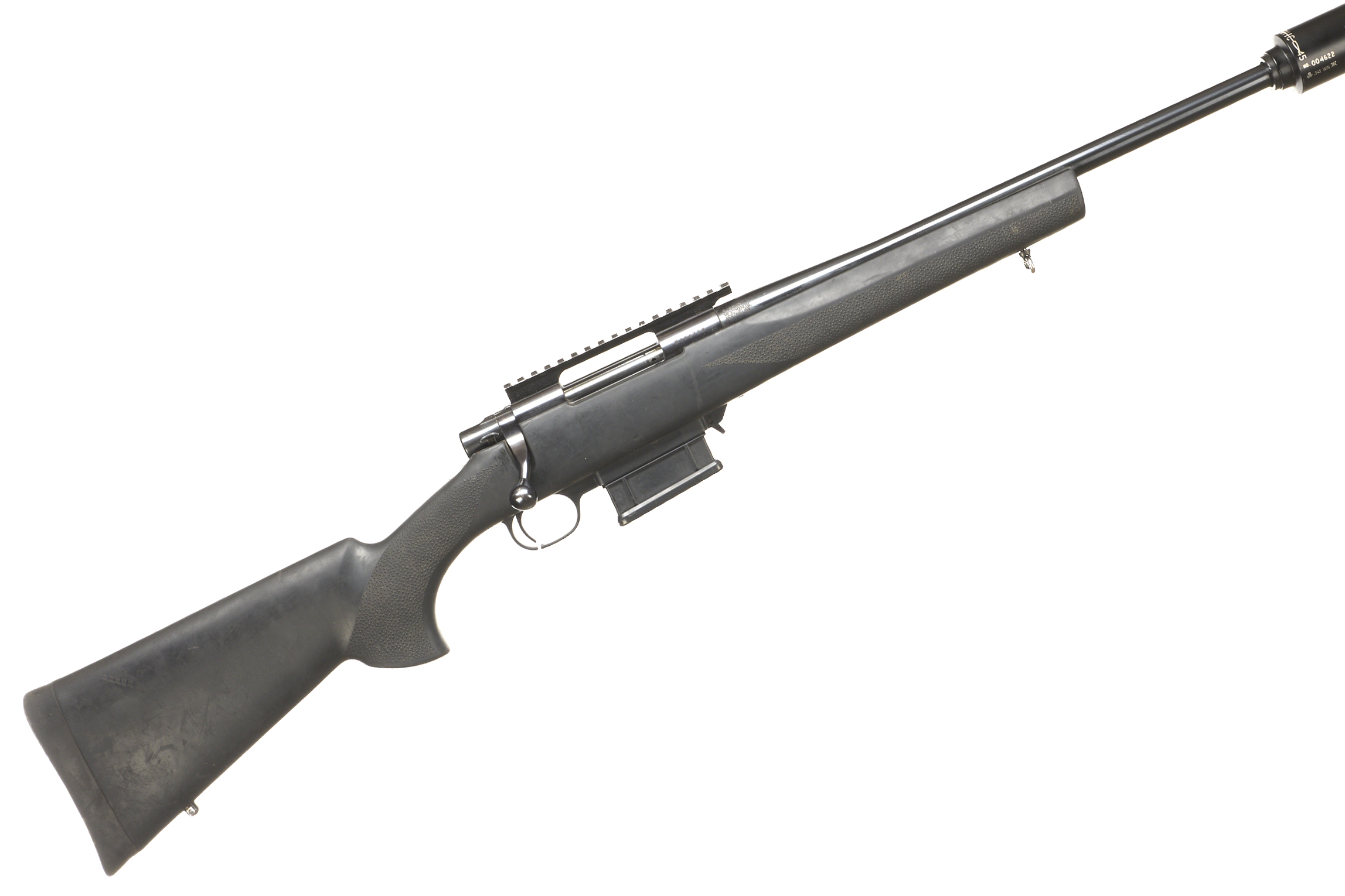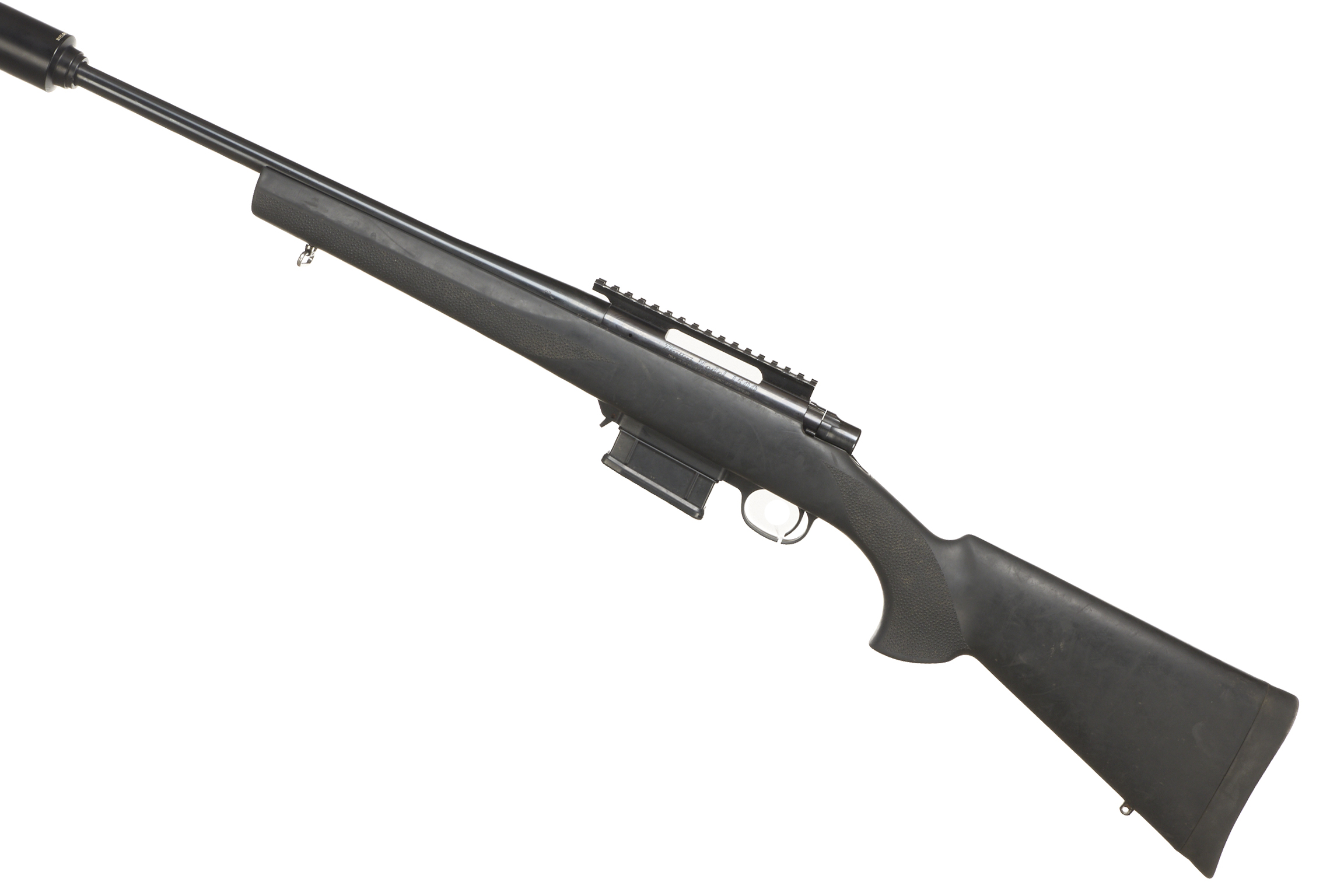 Cushioned butt, semi-pistol grip, rounded forend. Sling attachments. Screw cut muzzle, Sound moderator. Weaver rail, unsighted barrel. Detachable magazine. Synthetic stock.