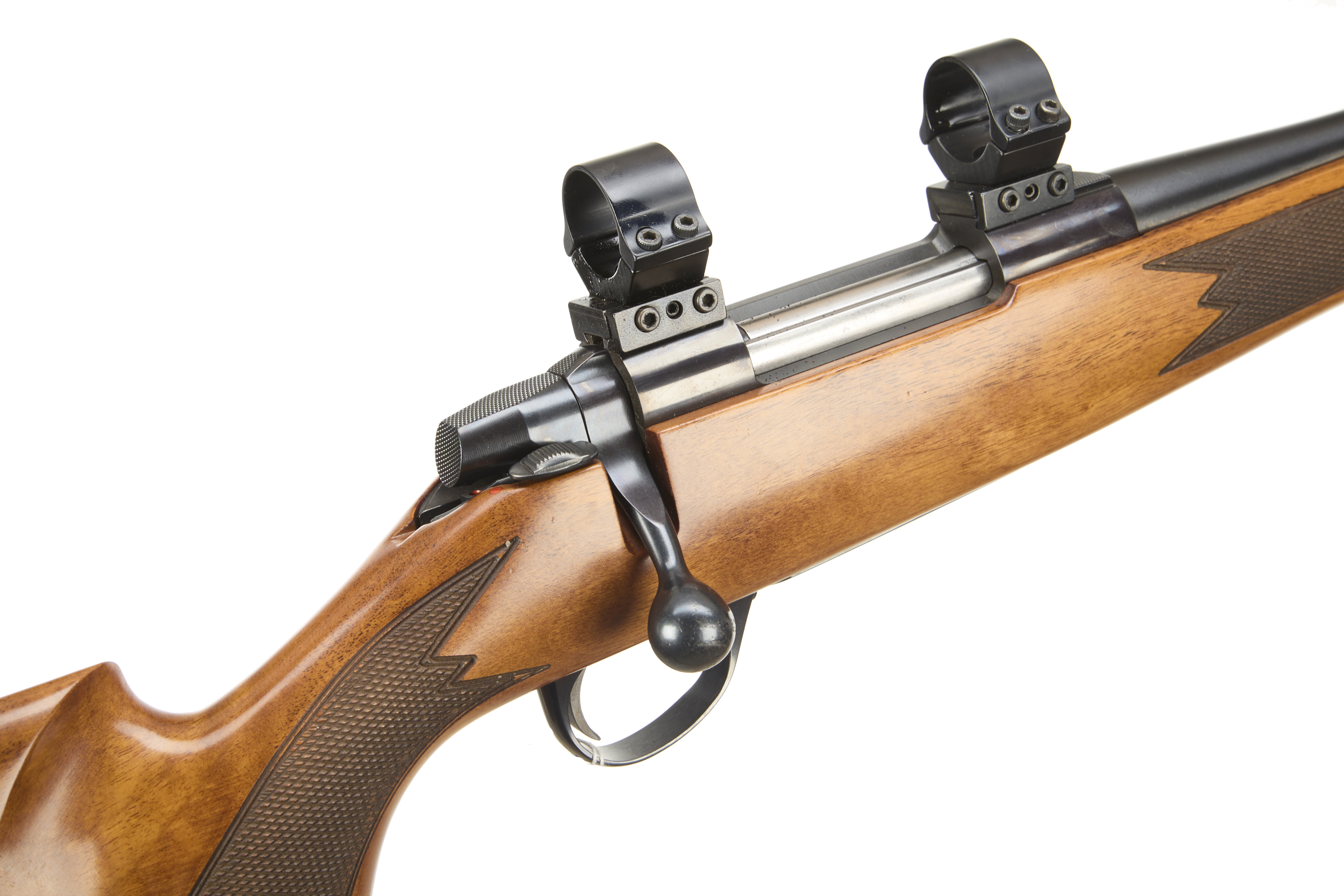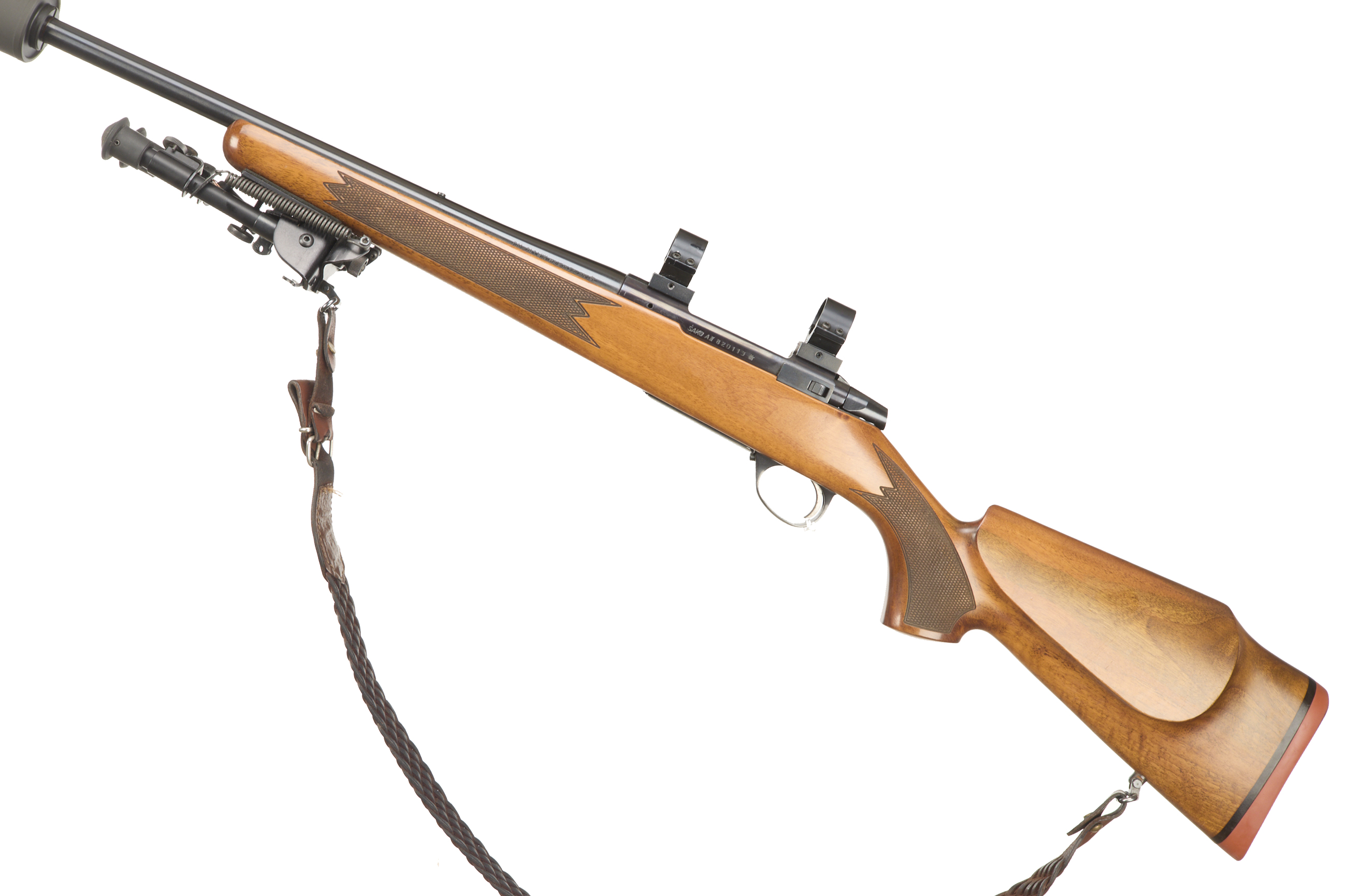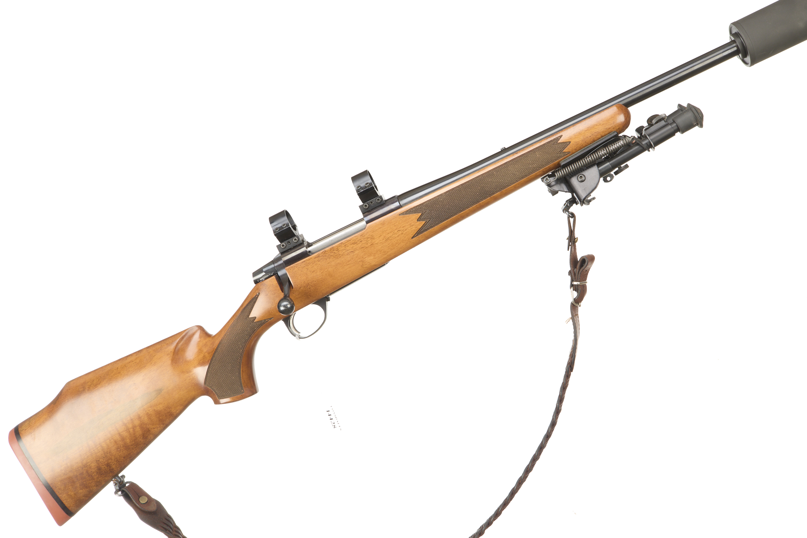 Rubber butt pad, semi-pistol grip with palm swell, rounded forend. Sling attachments and leather sling. Harris Bi pod. Screwcut muzzle, ASE reflex T4 moderator. Unsighted barrel, 25mm scope mounts. Internal magazine with hinged floor plate.
