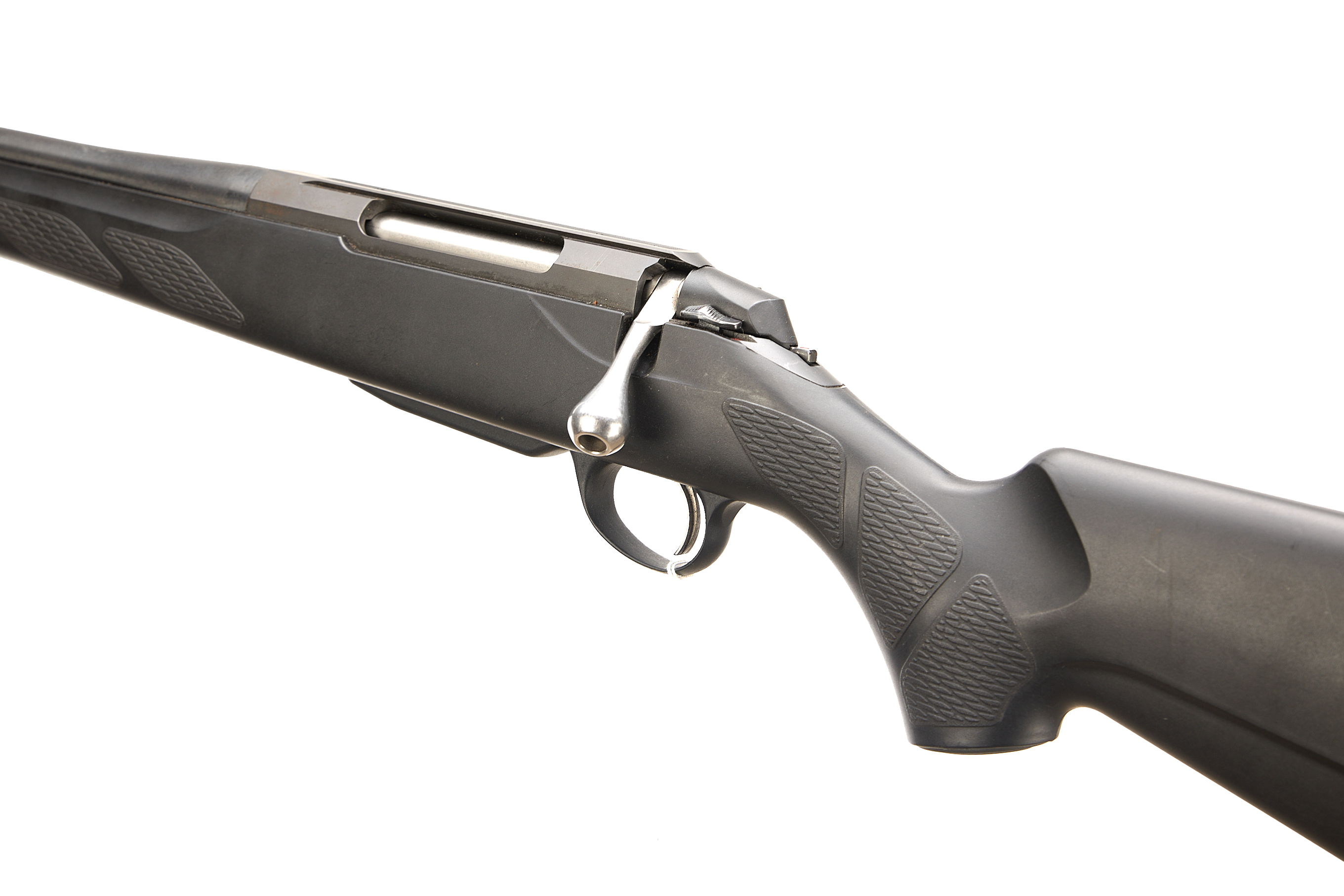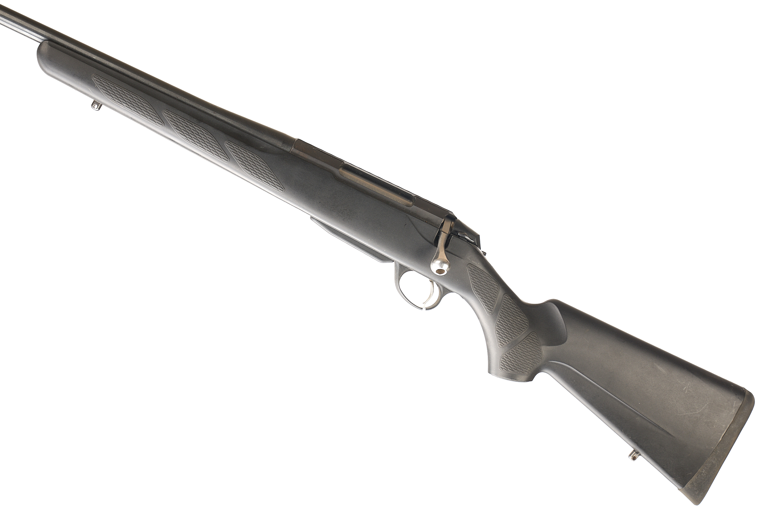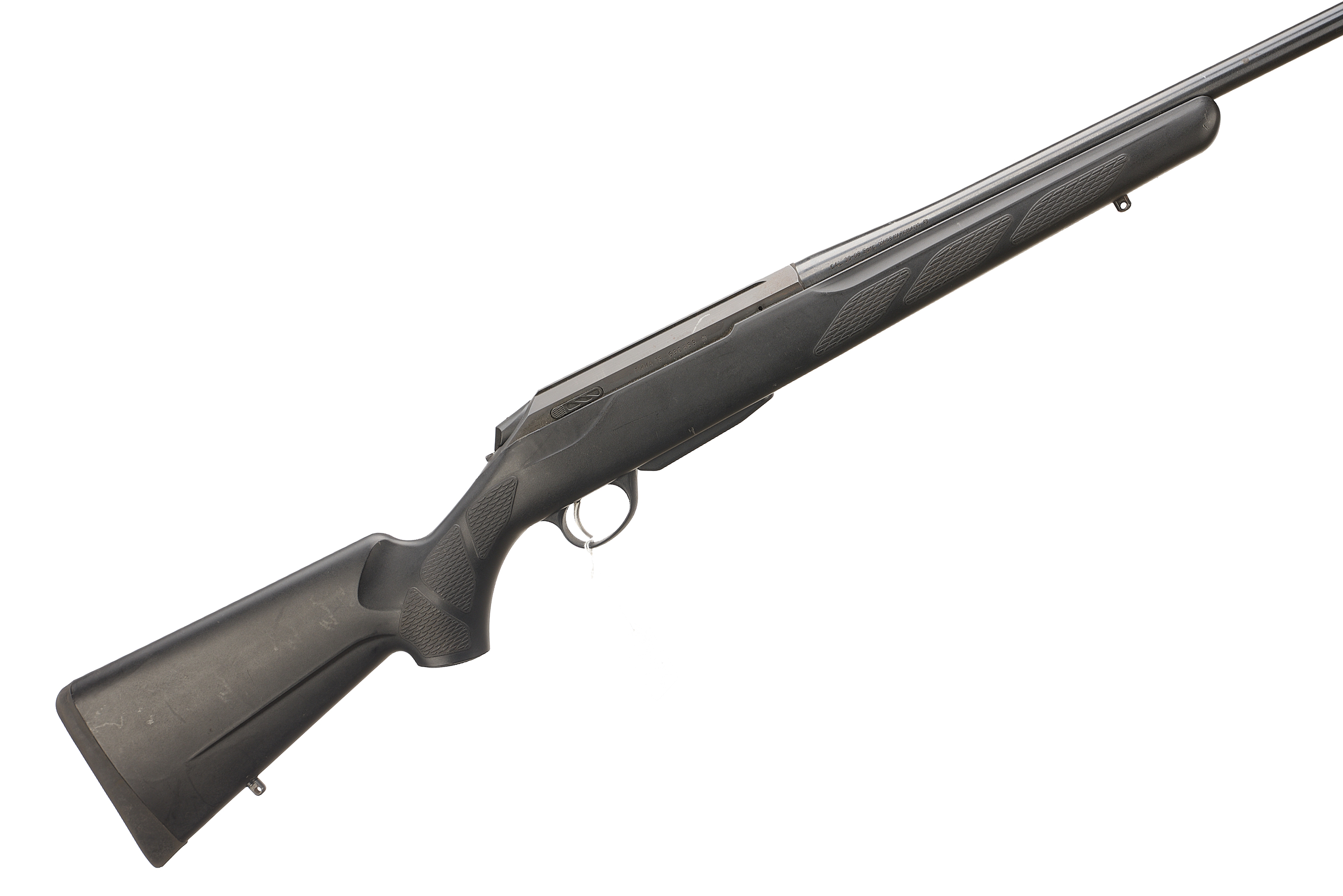 Soft rubber butt pad, synthetic stock. Dovetail scope rail, screw cut barrel with thread protector.
