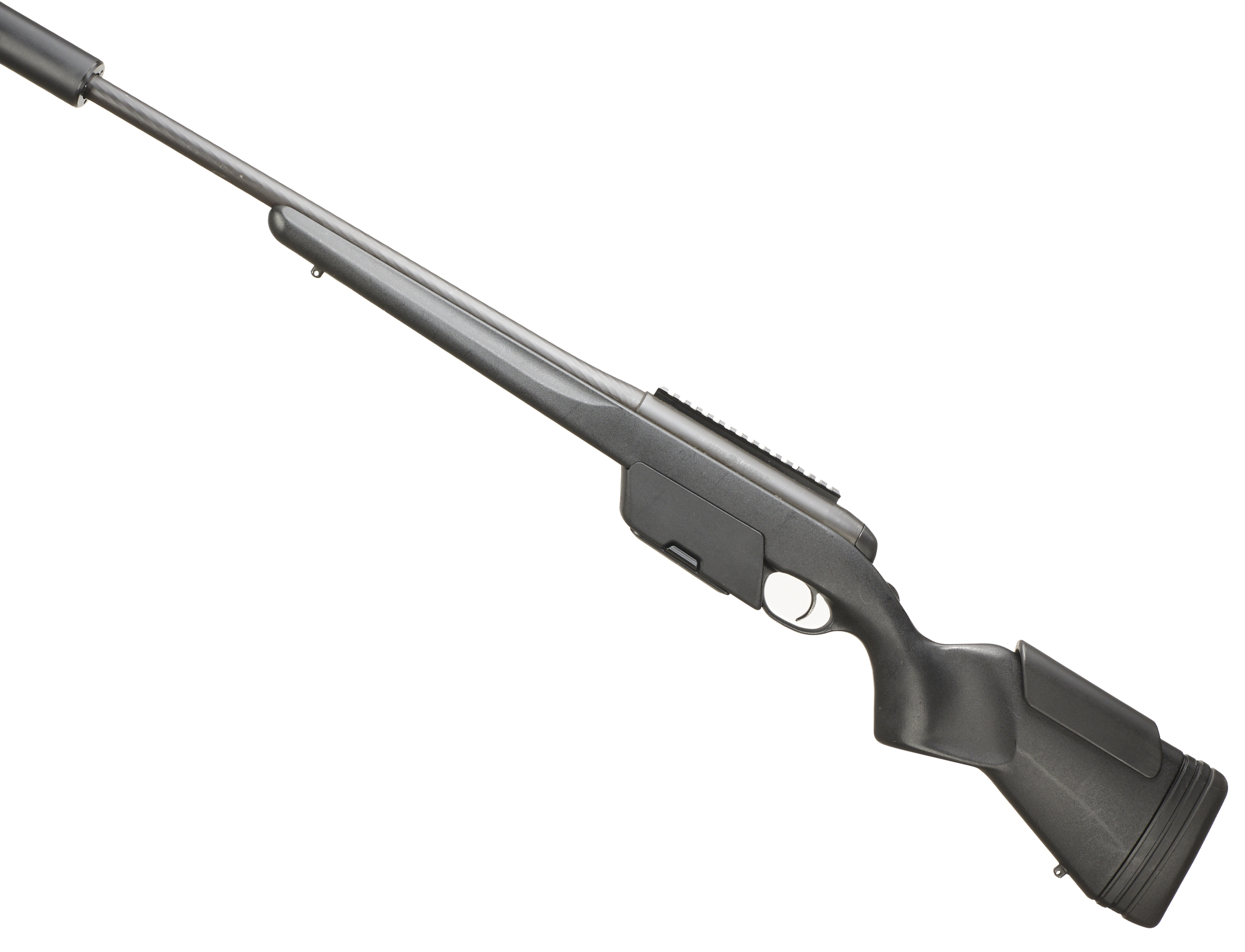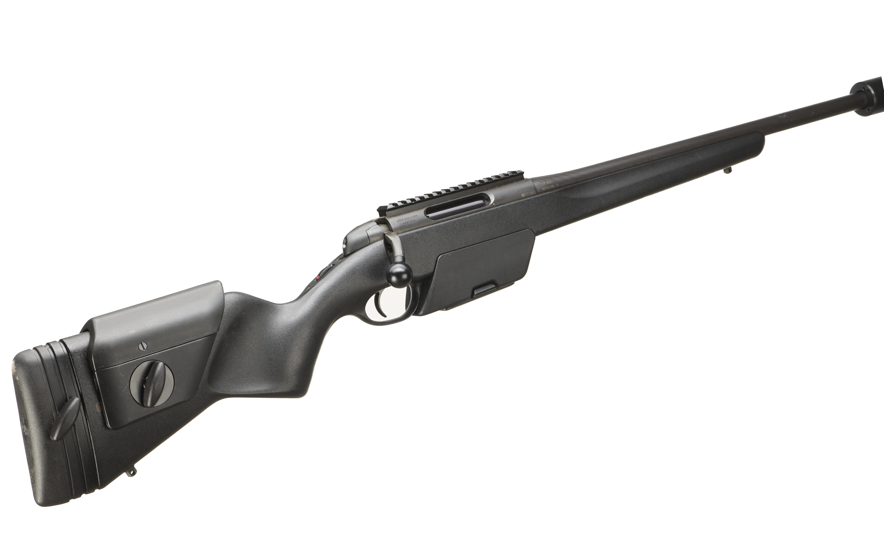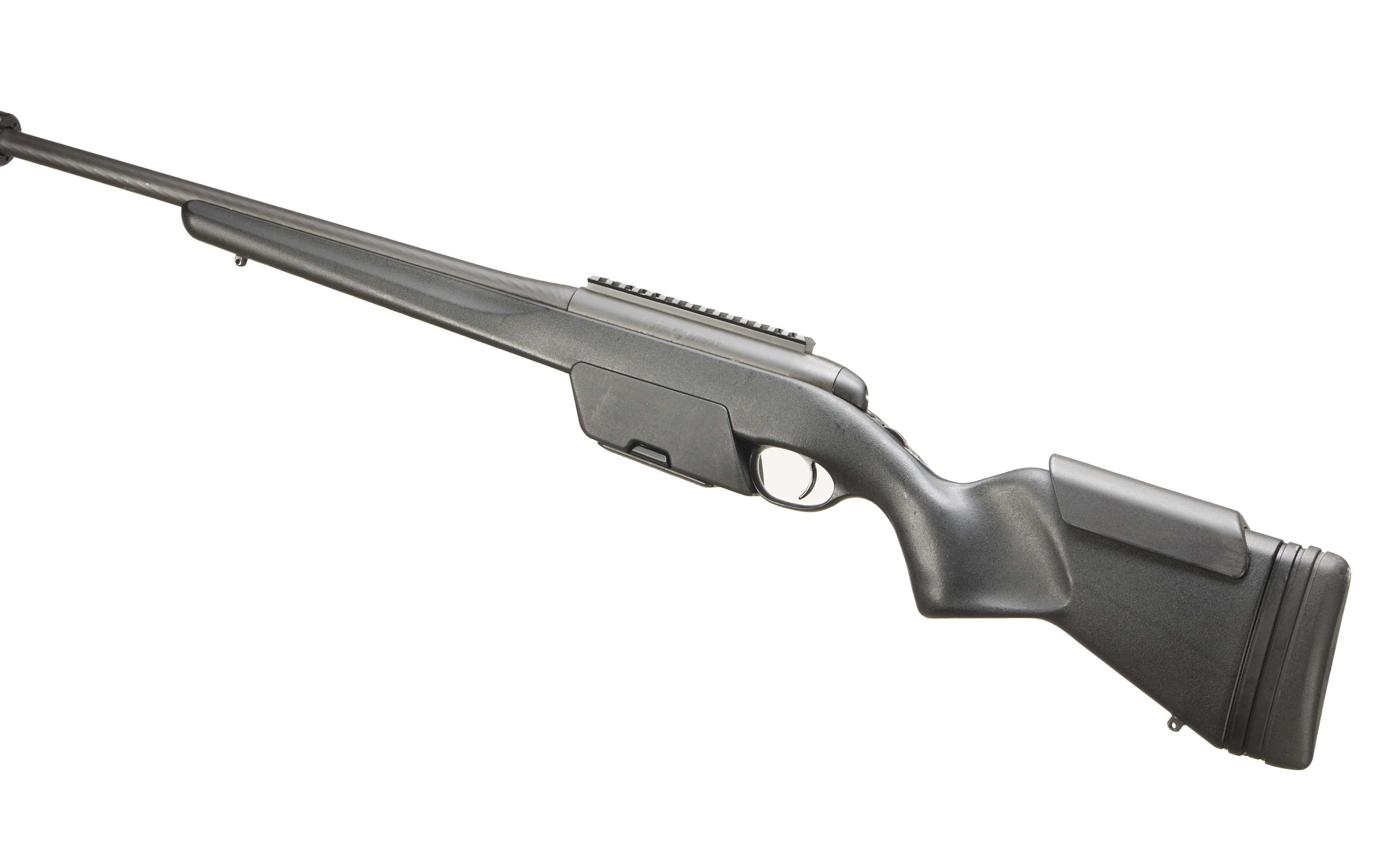 Cushioned butt, synthetic fully formed stock with raised cheek piece. Sling attachments. Screw cut muzzle , heavy unsighted barrel. Detachable magazine.
