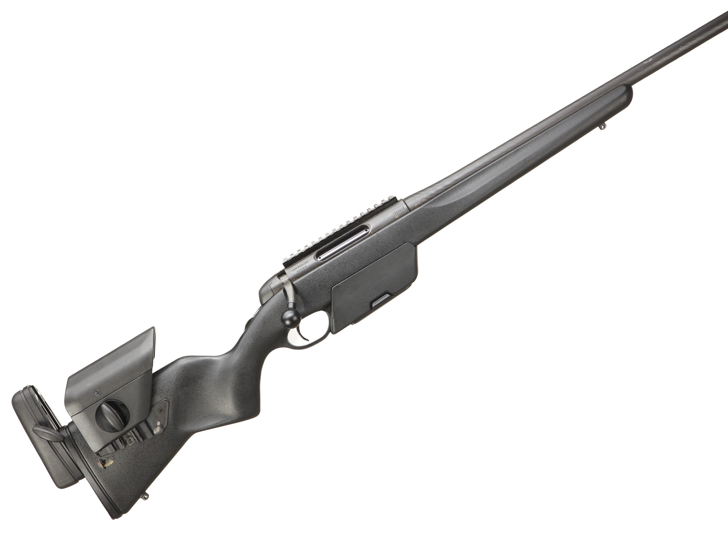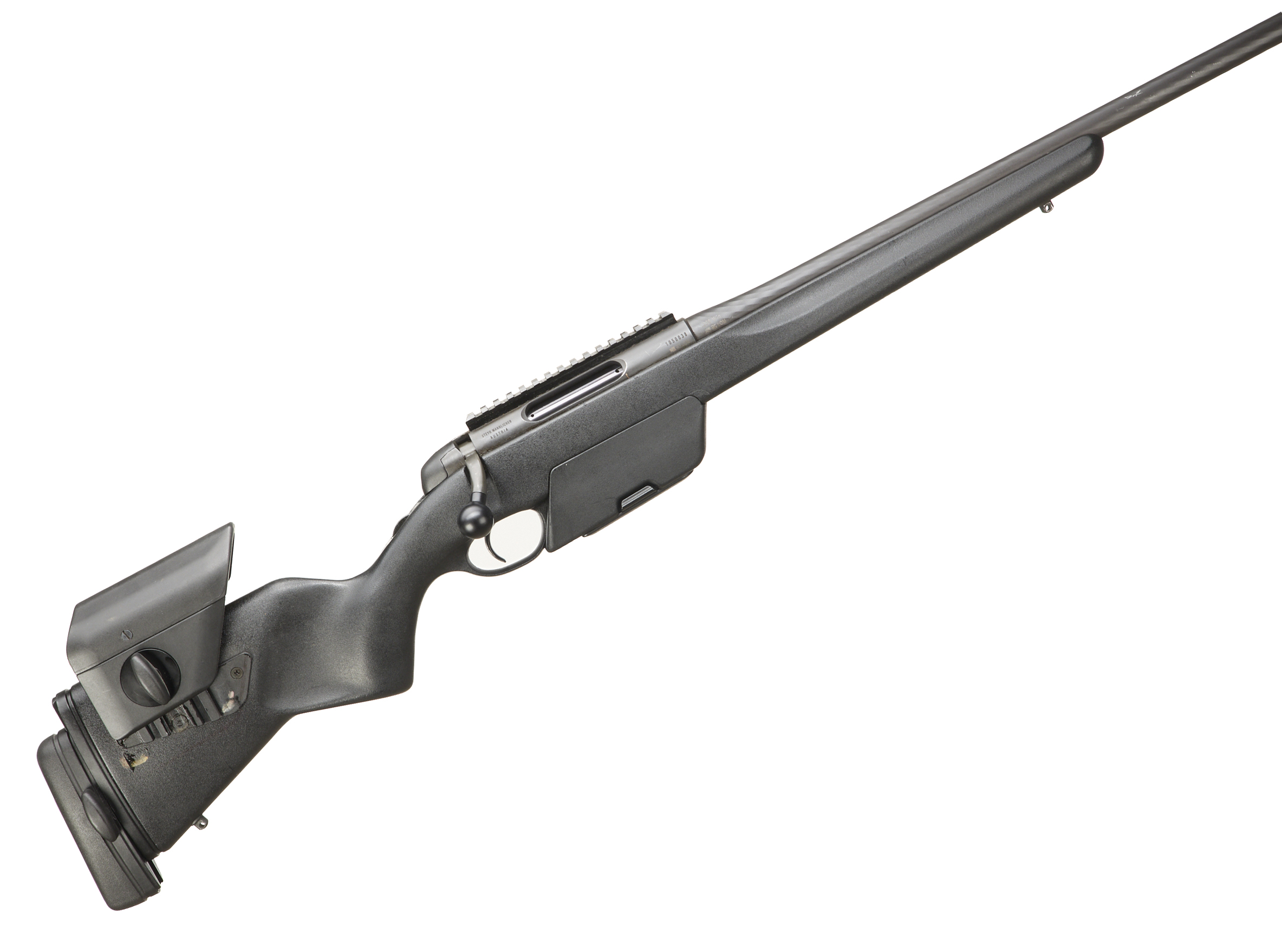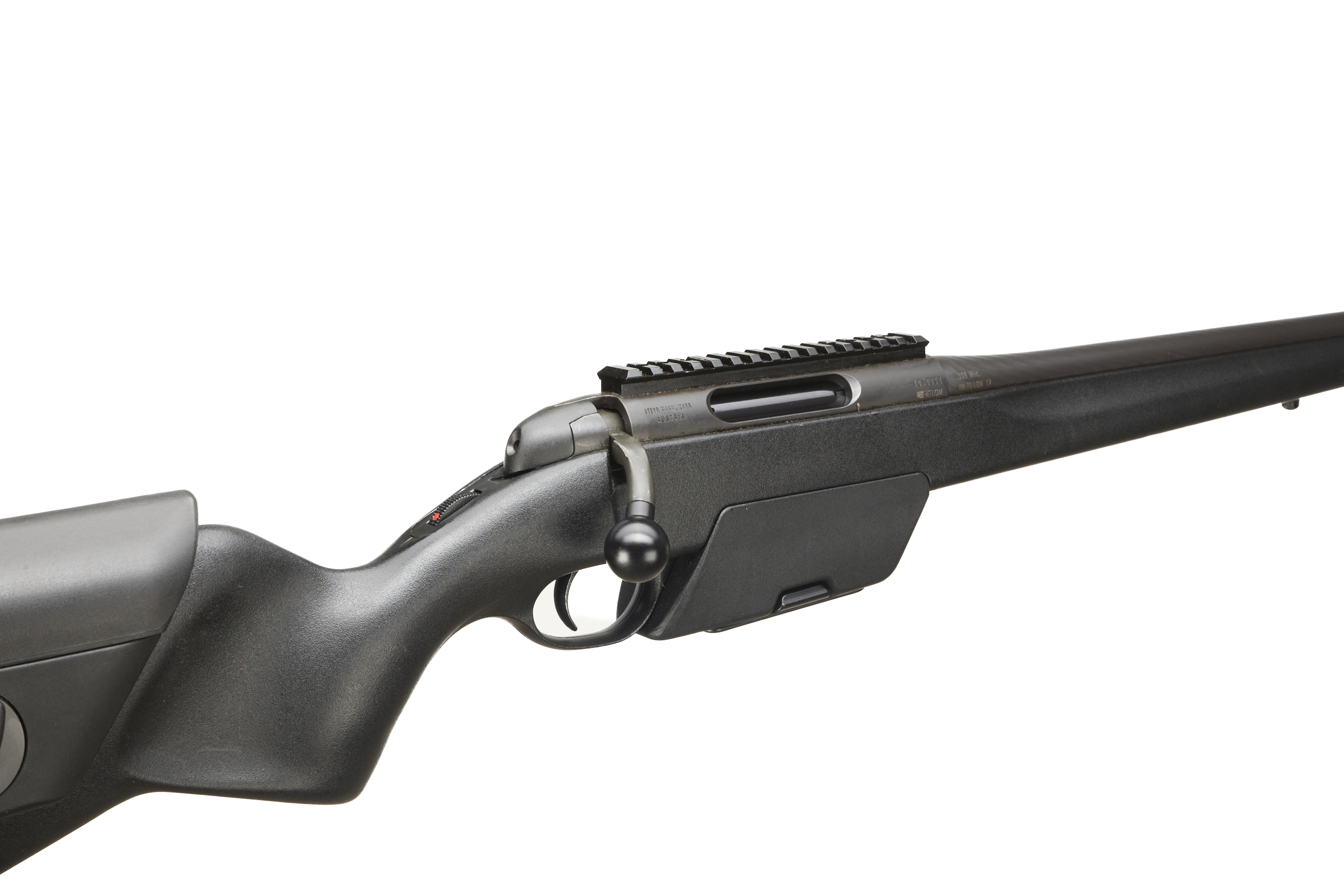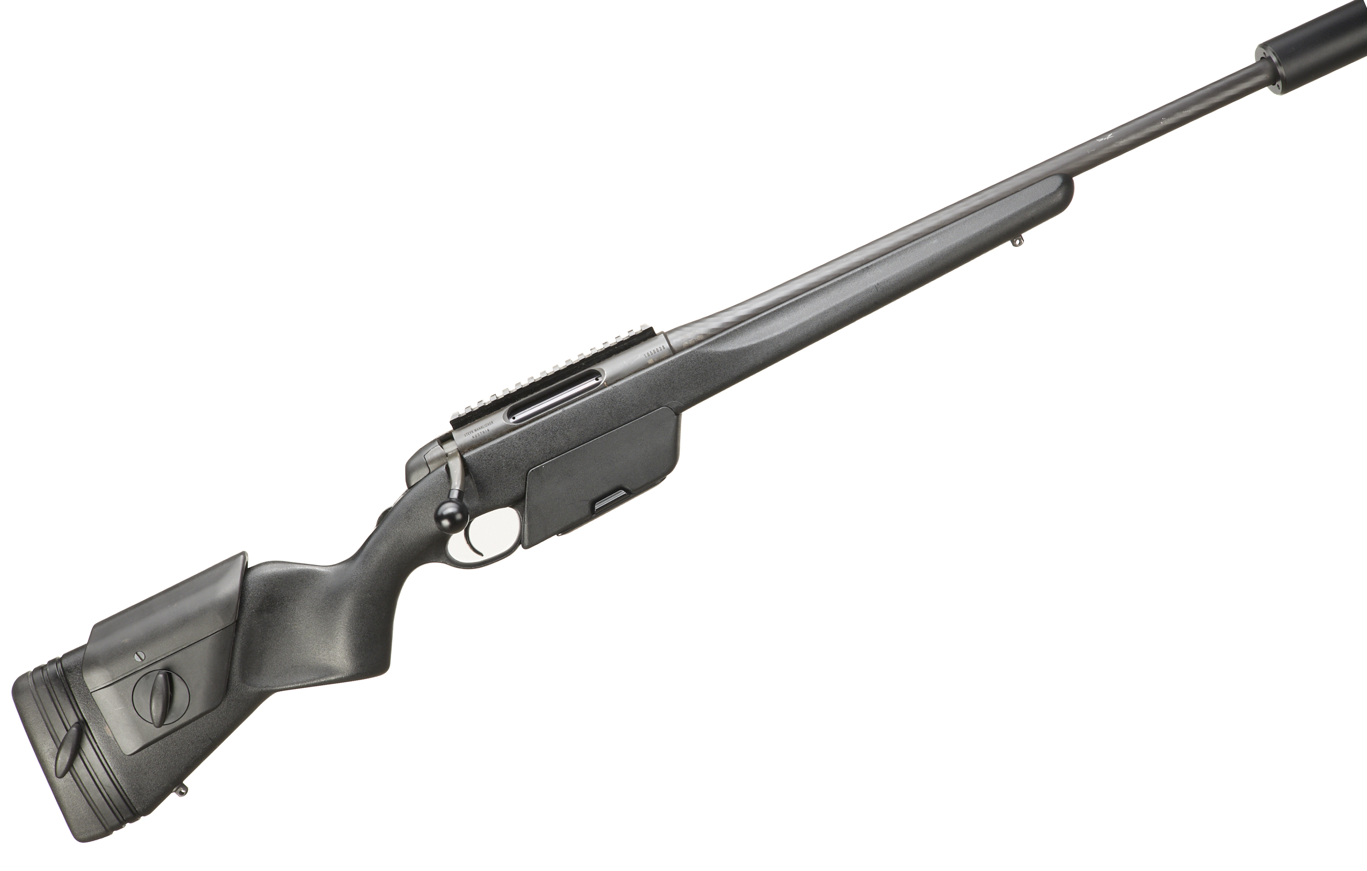Cushioned butt, synthetic fully formed stock with raised cheek piece. Sling attachments. Screw cut muzzle , heavy unsighted barrel. Detachable magazine.