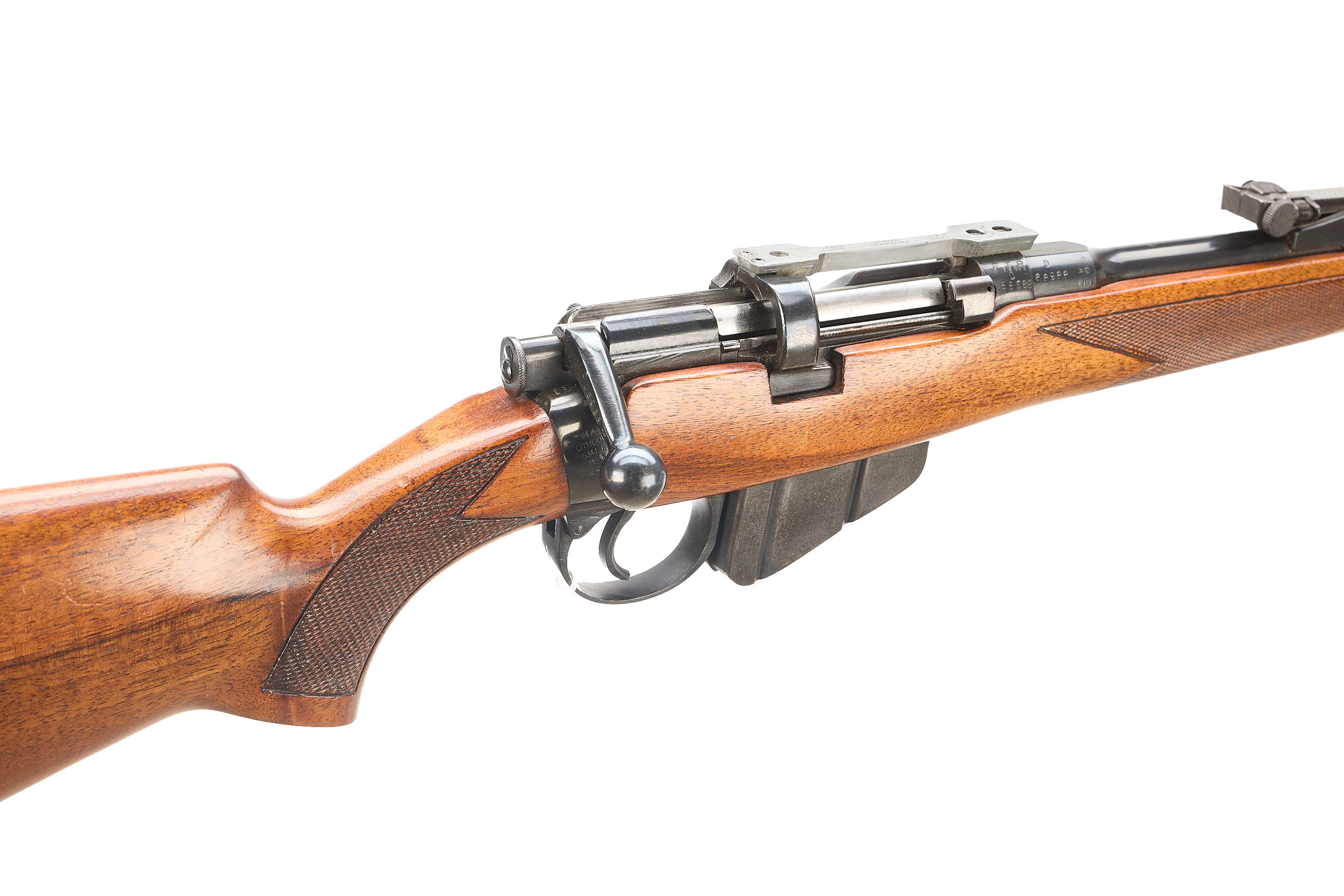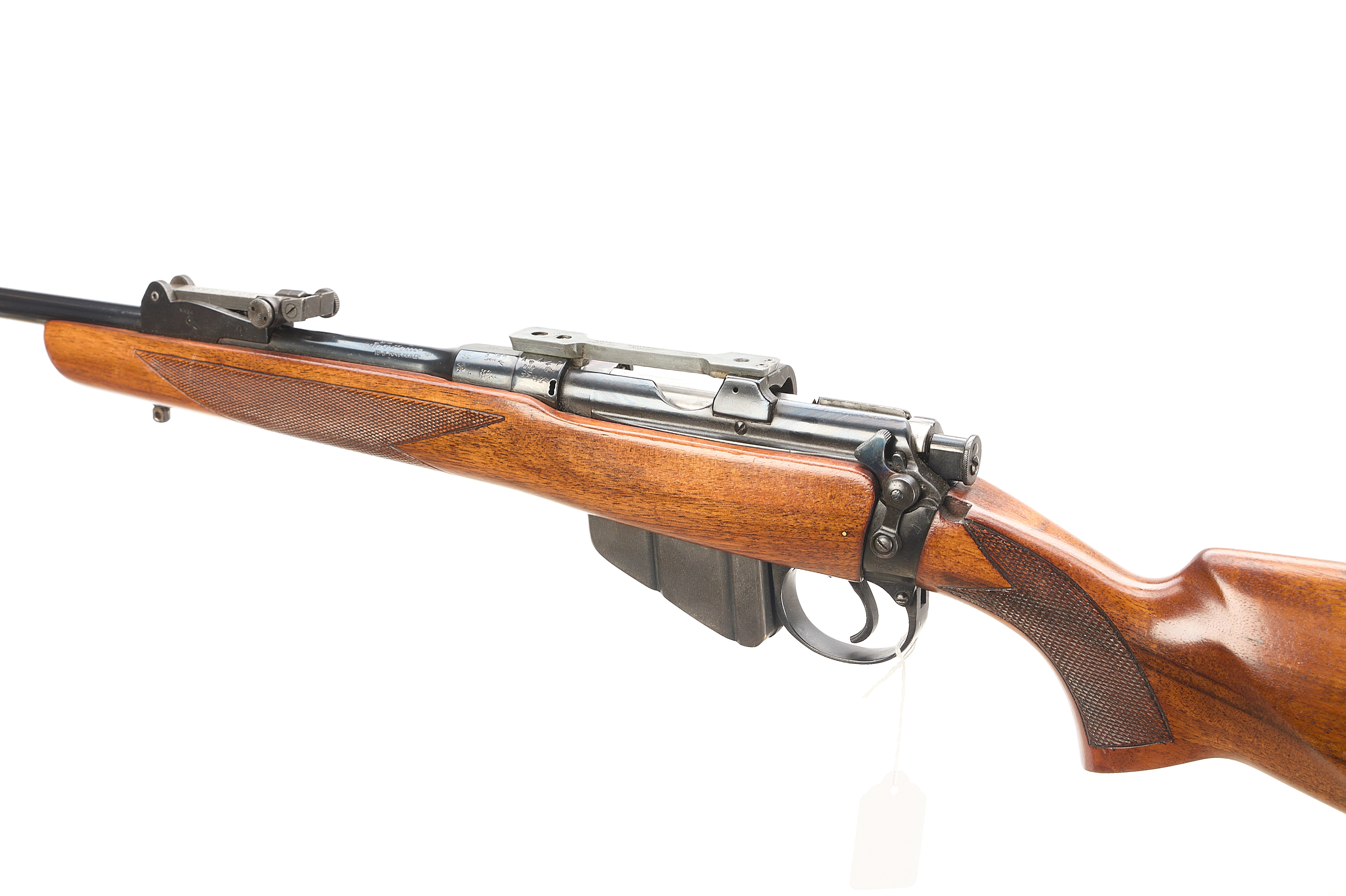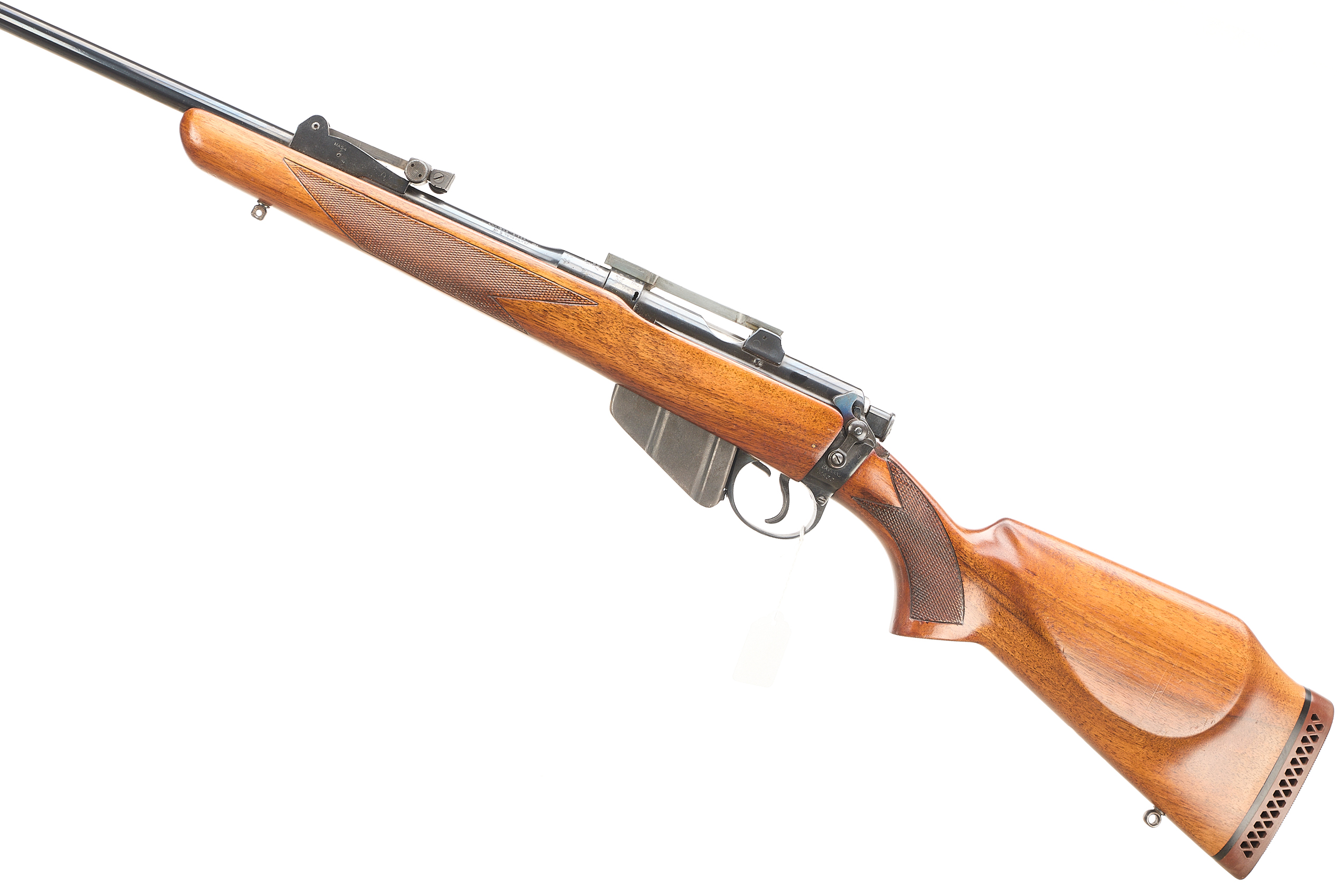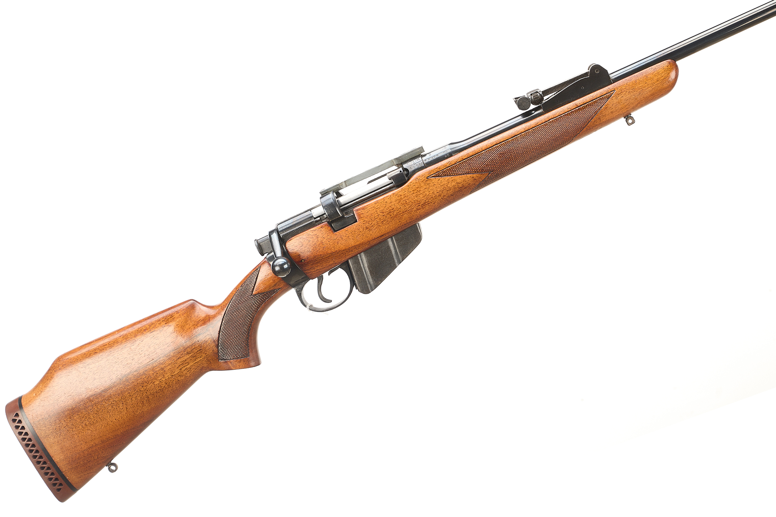 A sporterised SMLE with ventilated rubber butt pad, monte-carlo stock with chequered grip and forend. CW front and rear sling studs. Post front sight, notch rear sight, tapped for dovetail scope rings.