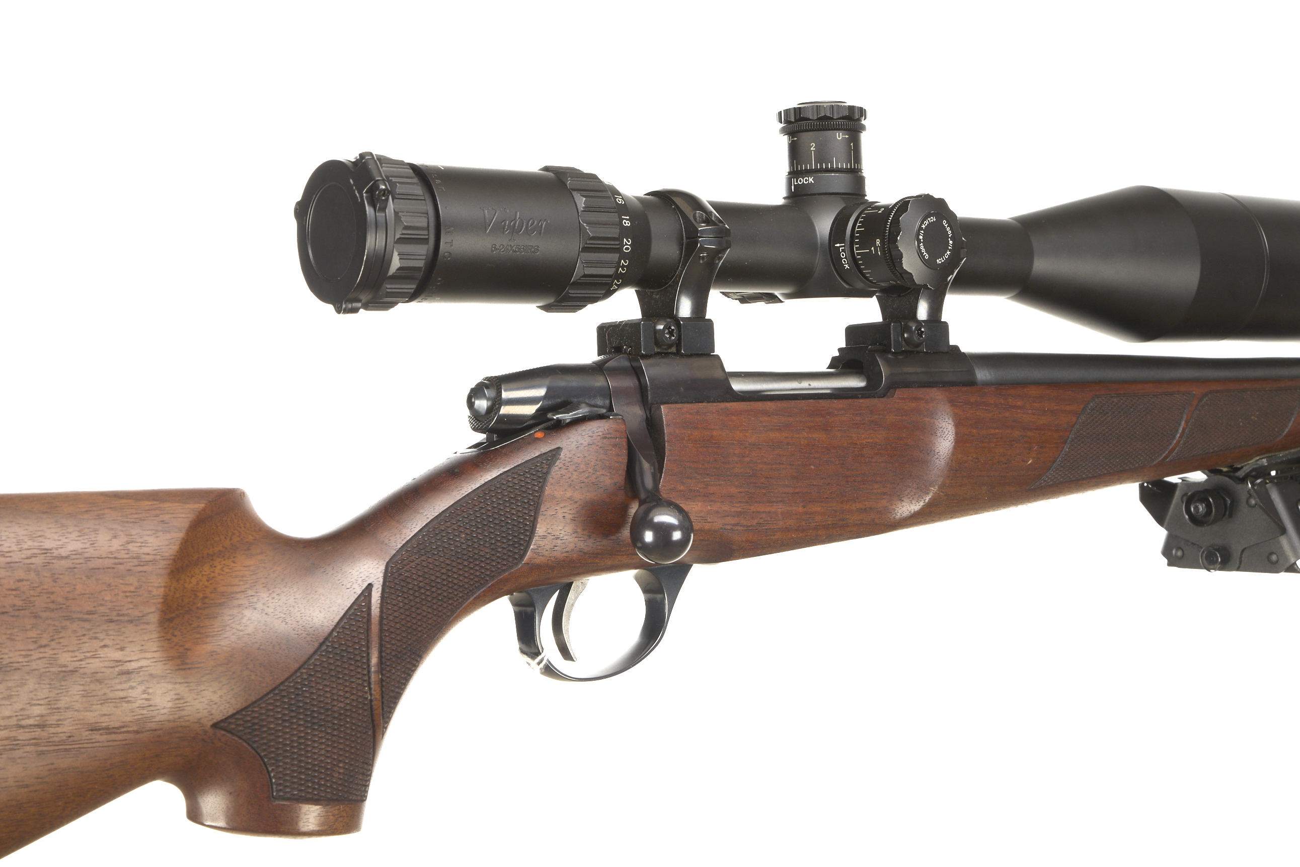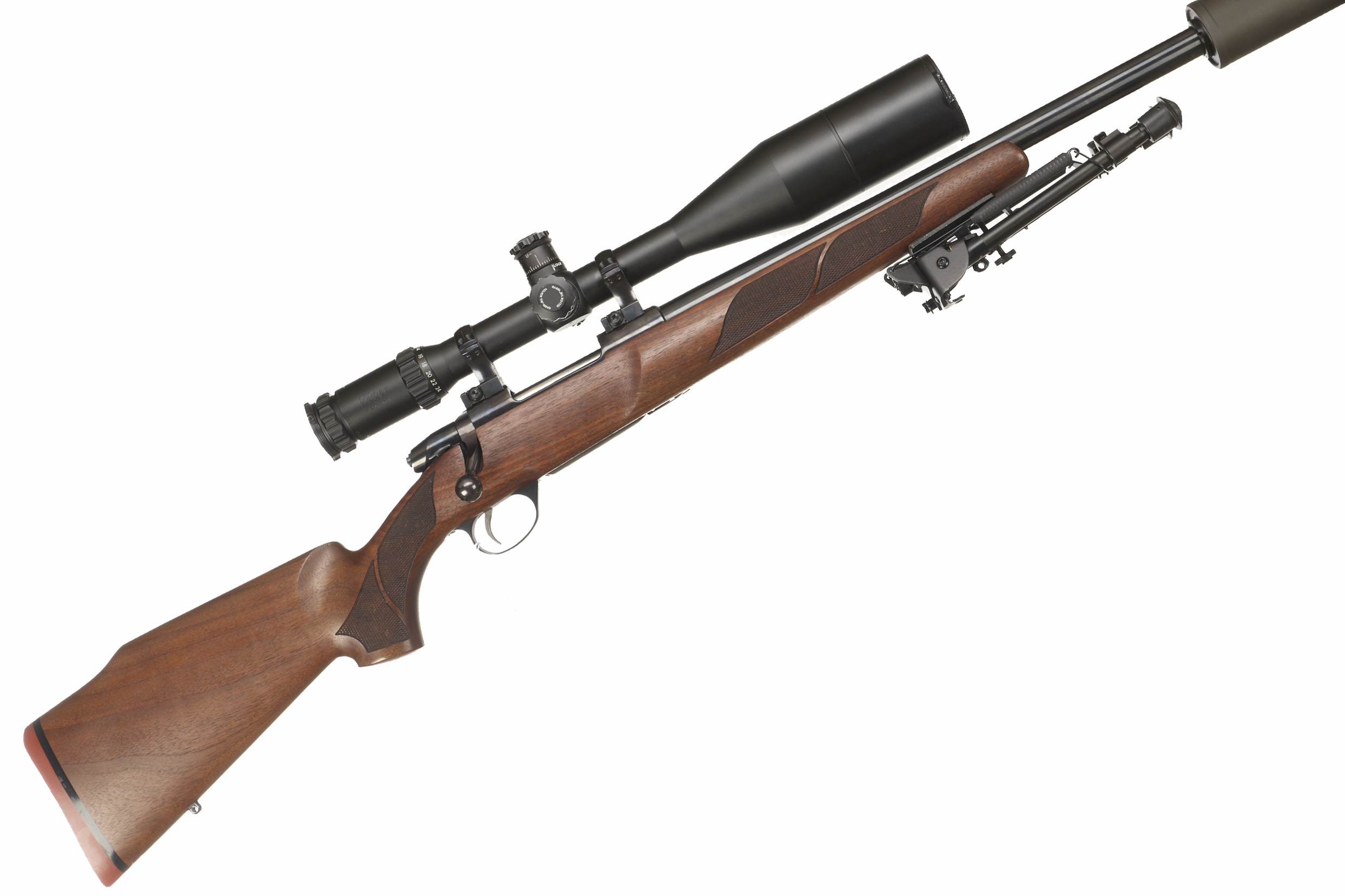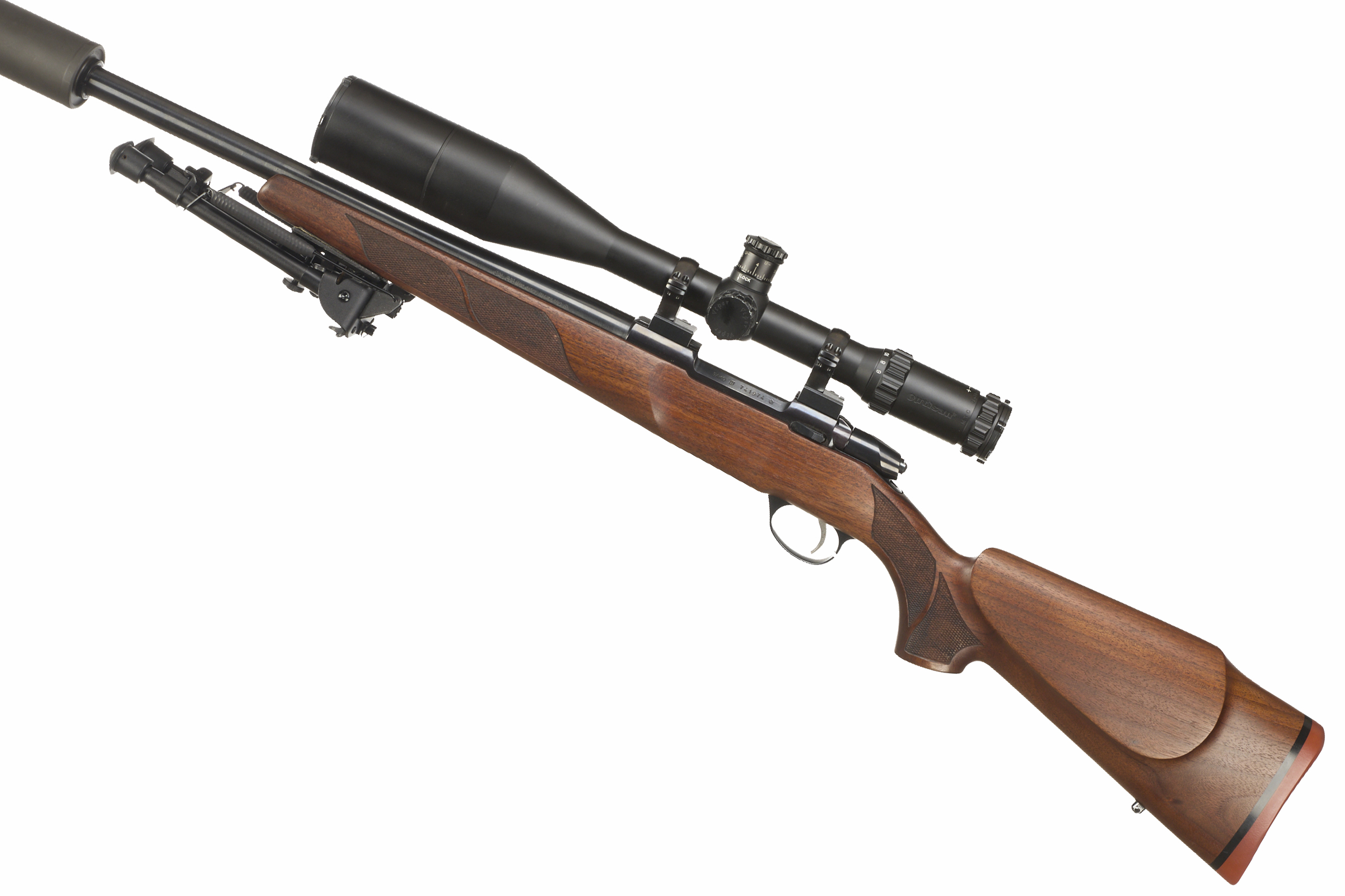 Rubber butt pad, raised cheek comb, chequered semi-pistol grip with palm swell, rounded forend. Sling attachments. Bi pod. Screwcut muzzle, ASE reflex T8 moderator. Unsighted heavy barrel, detachable box magazine, thumb safety. Viper Optisan 6-24×56 irs scope.