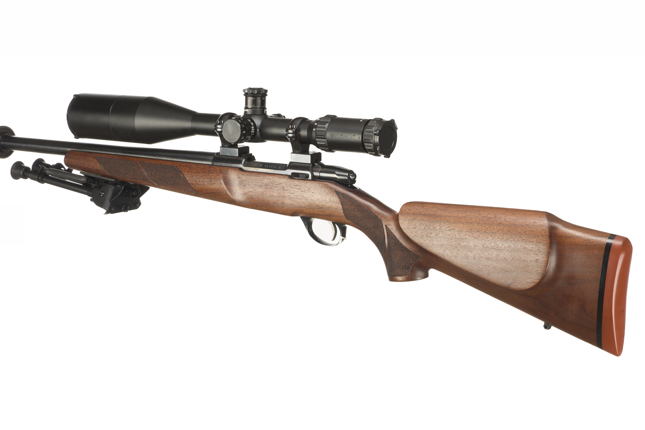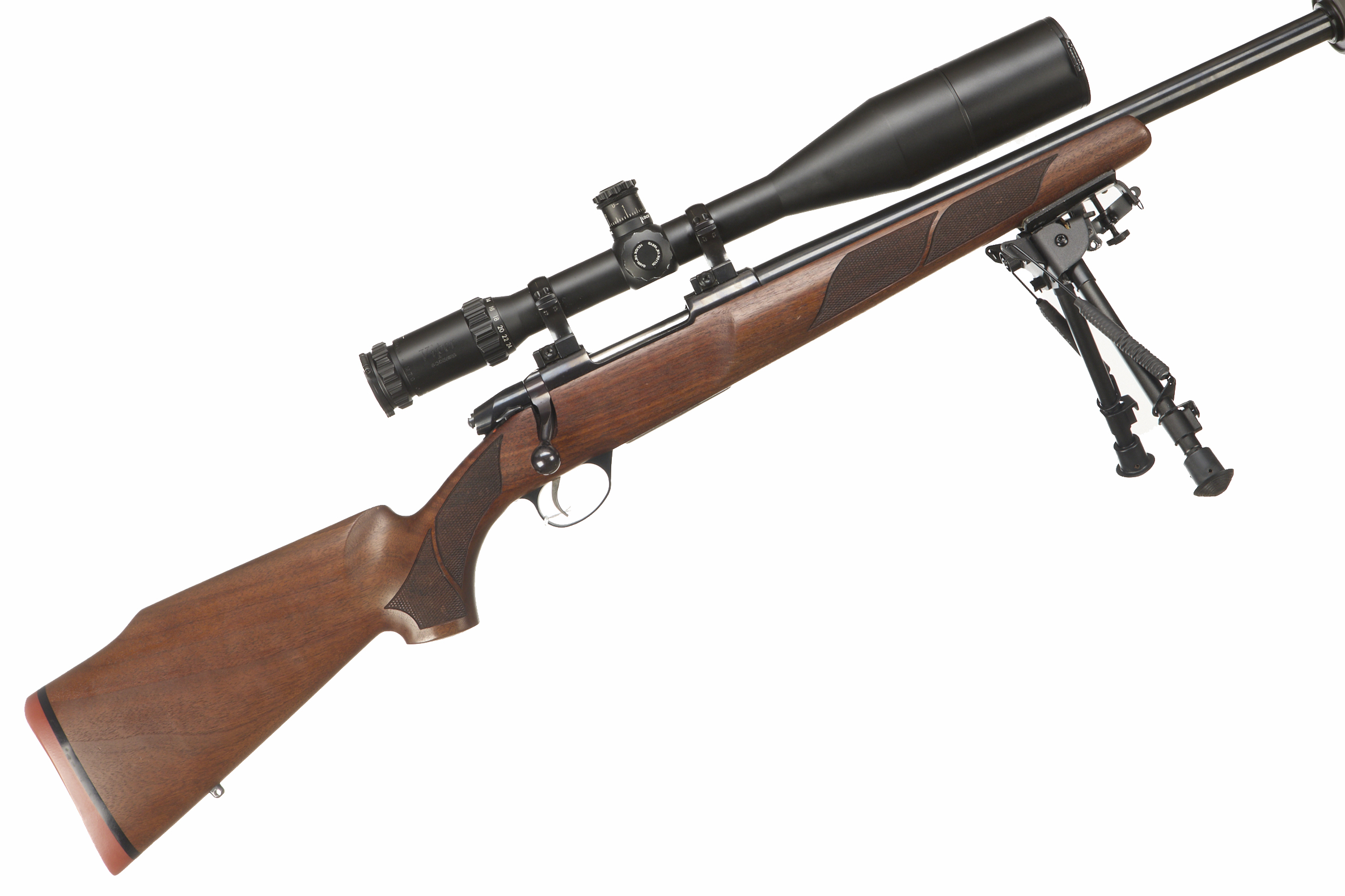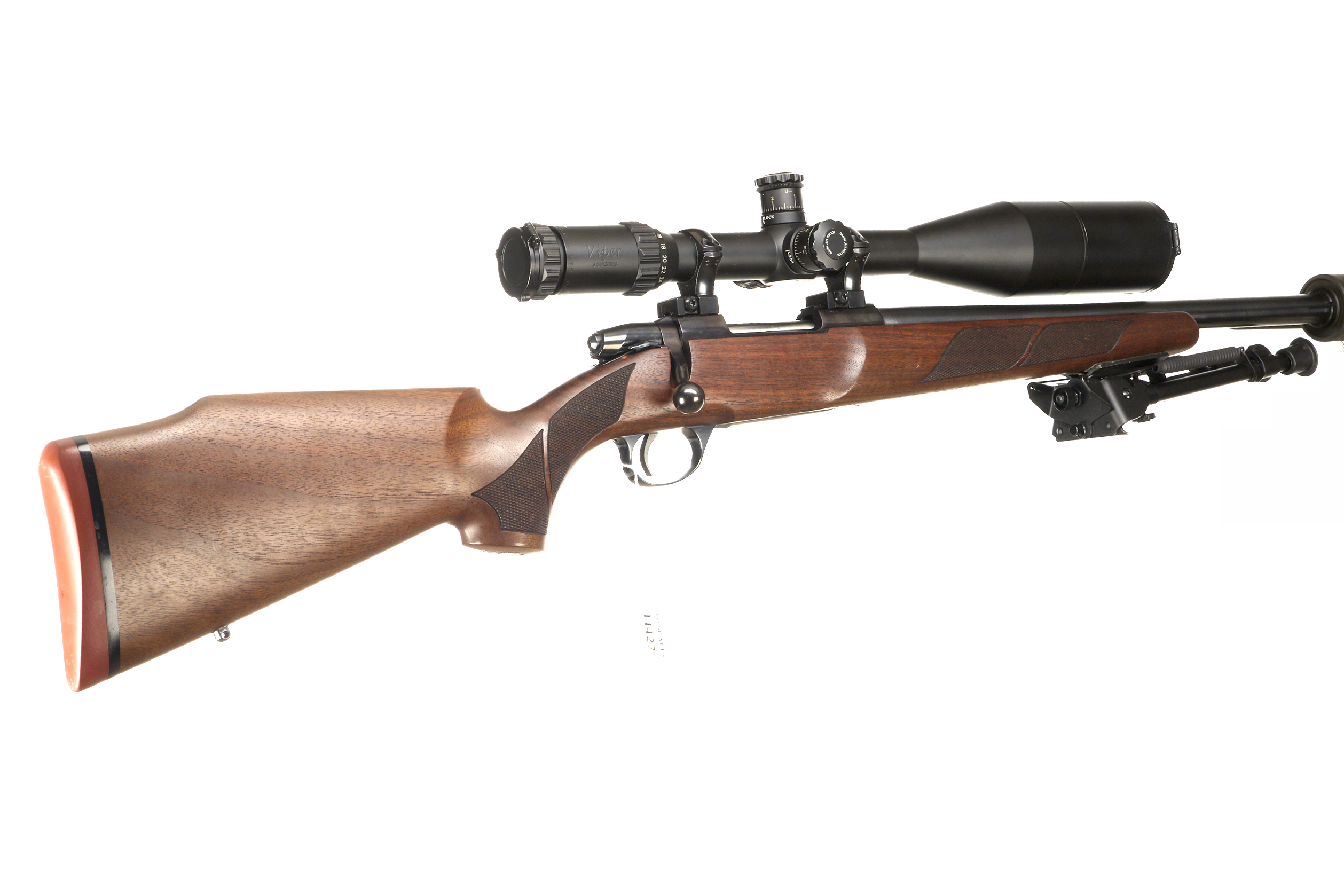 Rubber butt pad, raised cheek comb, chequered semi-pistol grip with palm swell, rounded forend. Sling attachments. Bi pod. Screwcut muzzle, ASE reflex T8 moderator. Unsighted heavy barrel, detachable box magazine, thumb safety. Viper Optisan 6-24×56 irs scope.
