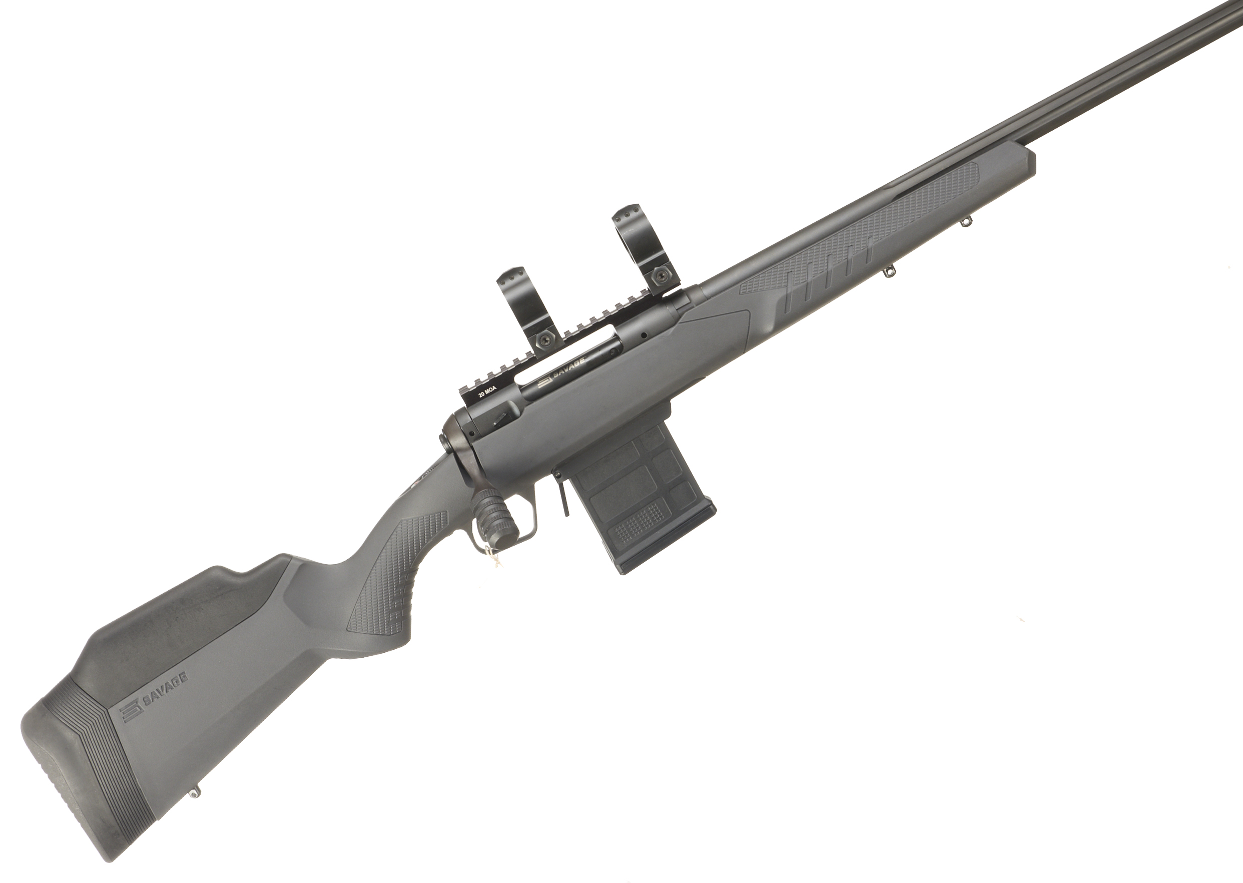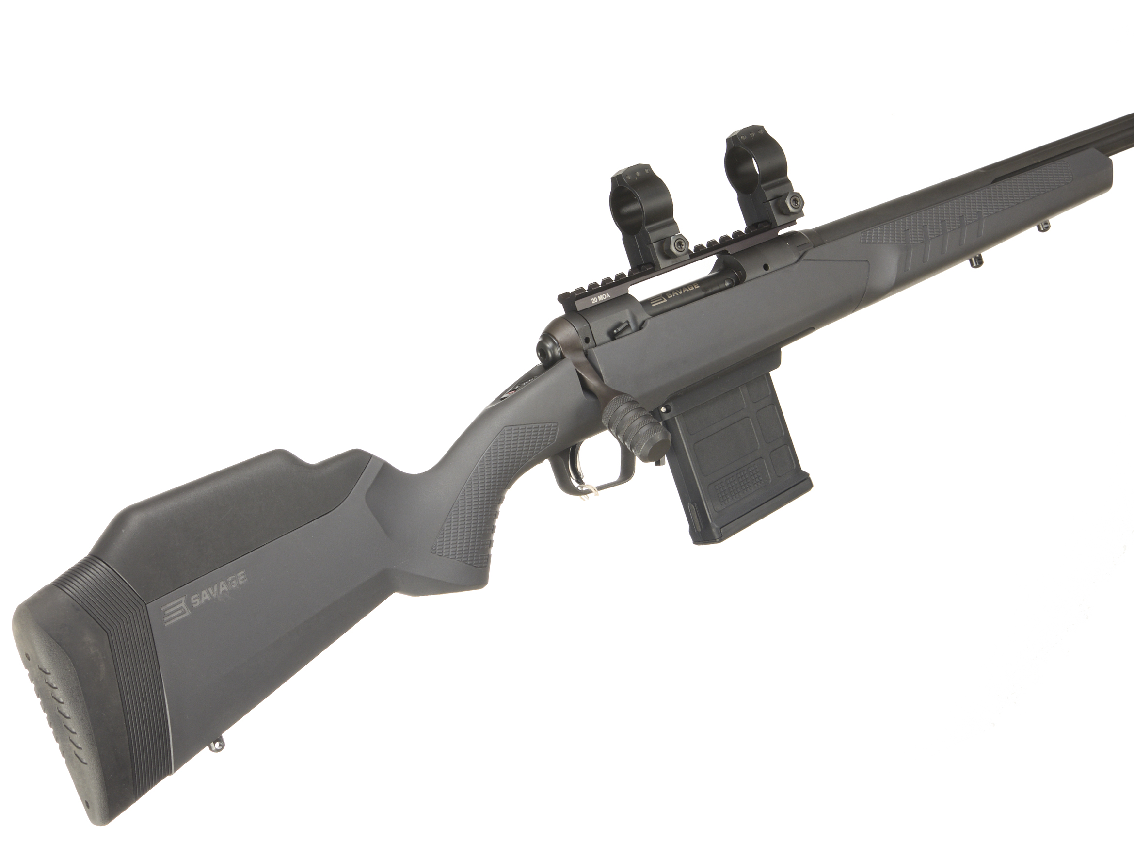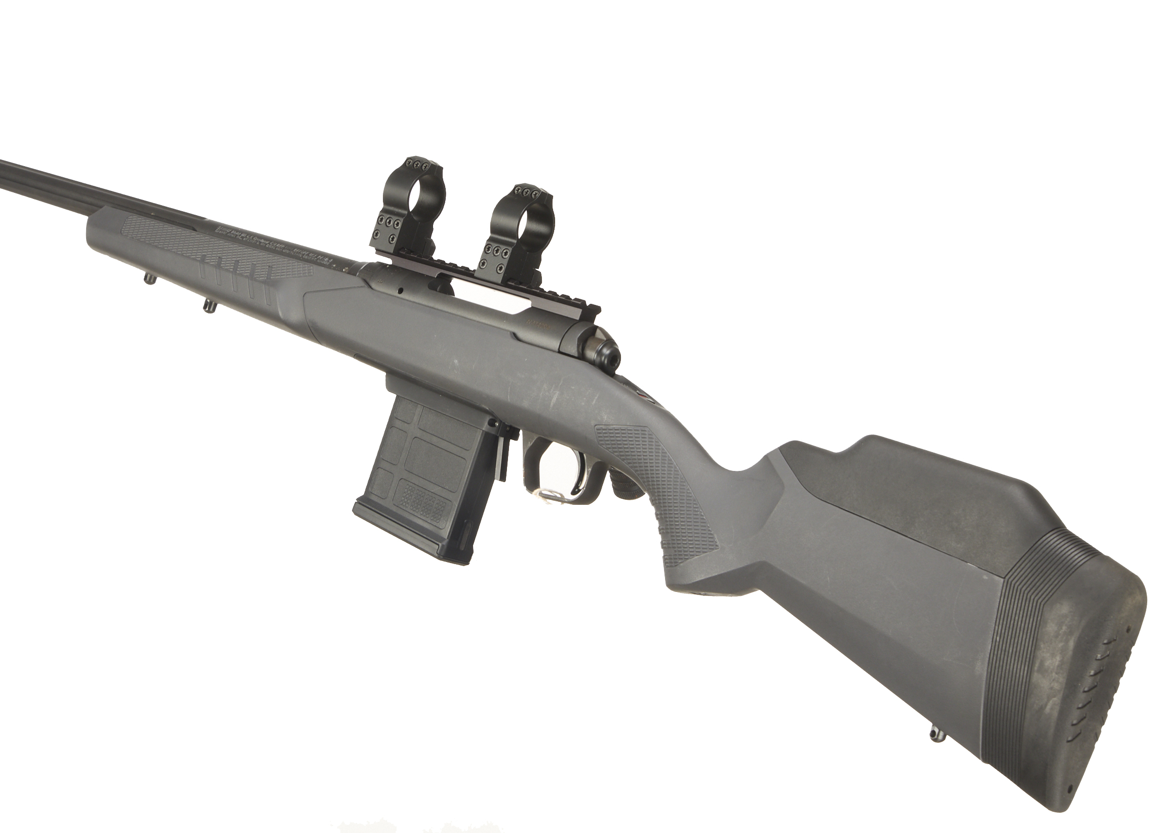 Cushioned butt, synthetic stock, semi-pistol grip, rounded forend. Sling attachments. Screwcut muzzle, unsighted fluted barrel. Detachable magazine. 30mm scope rings, 20 MOA Weaver rail