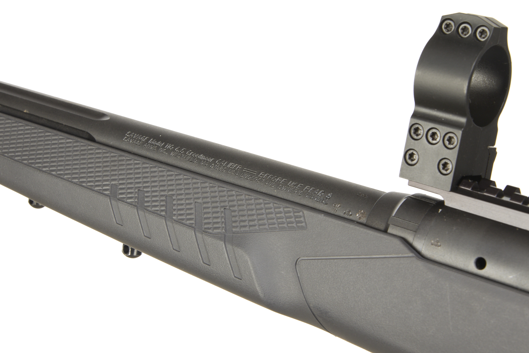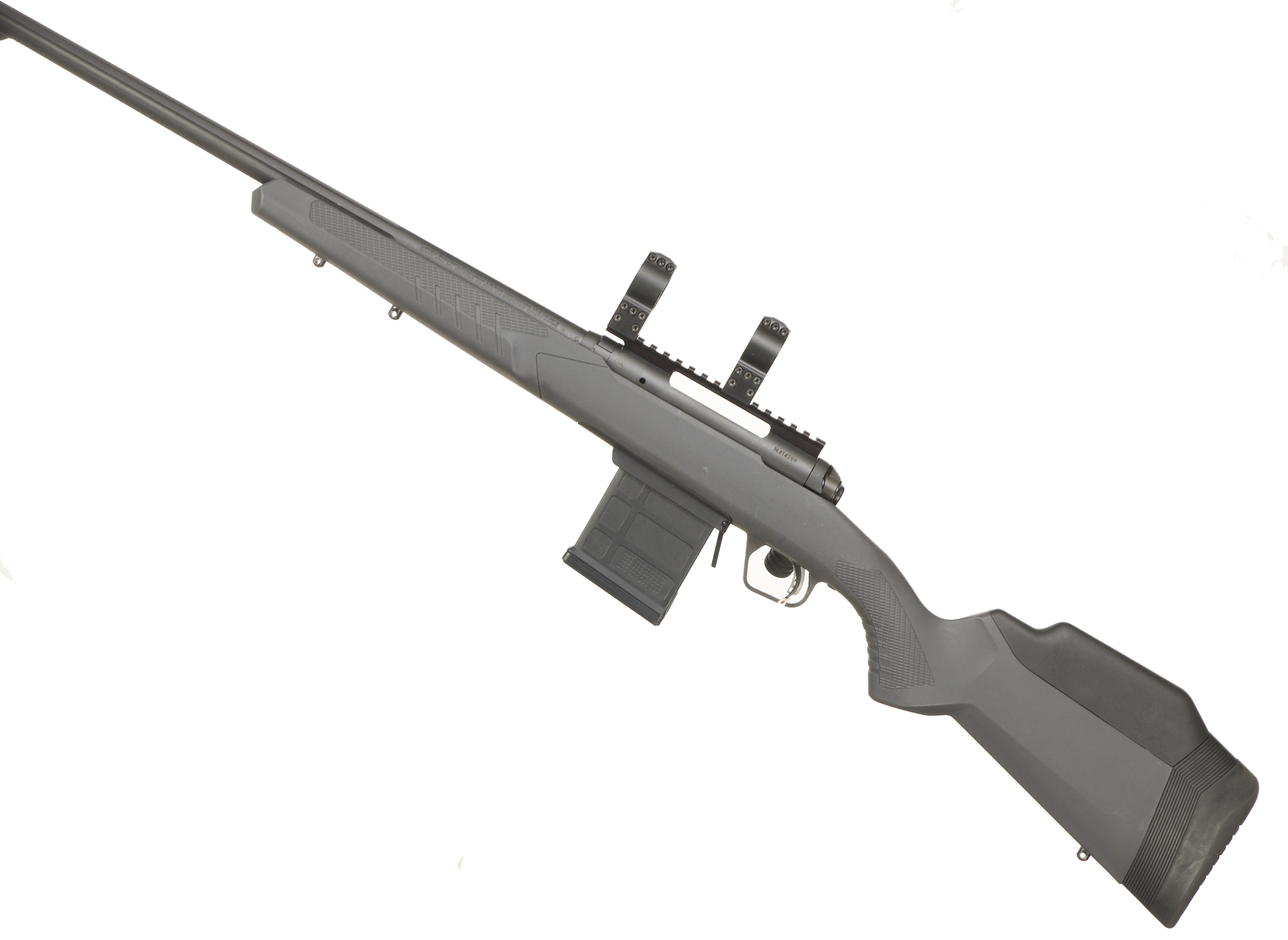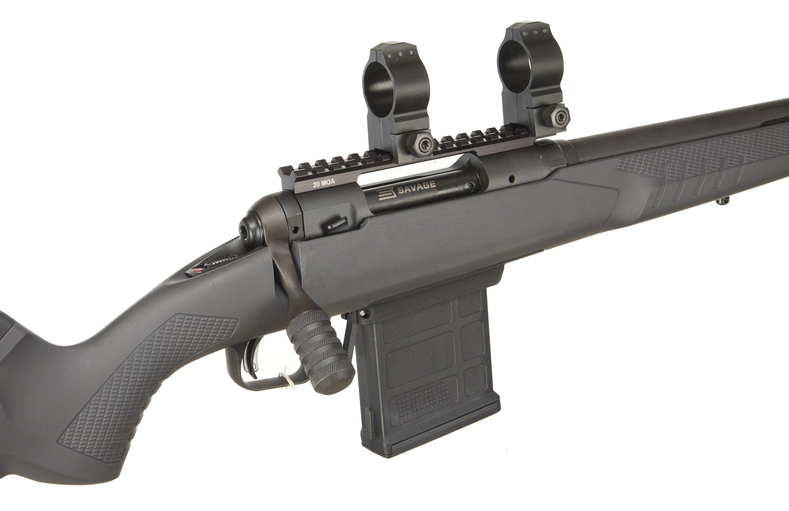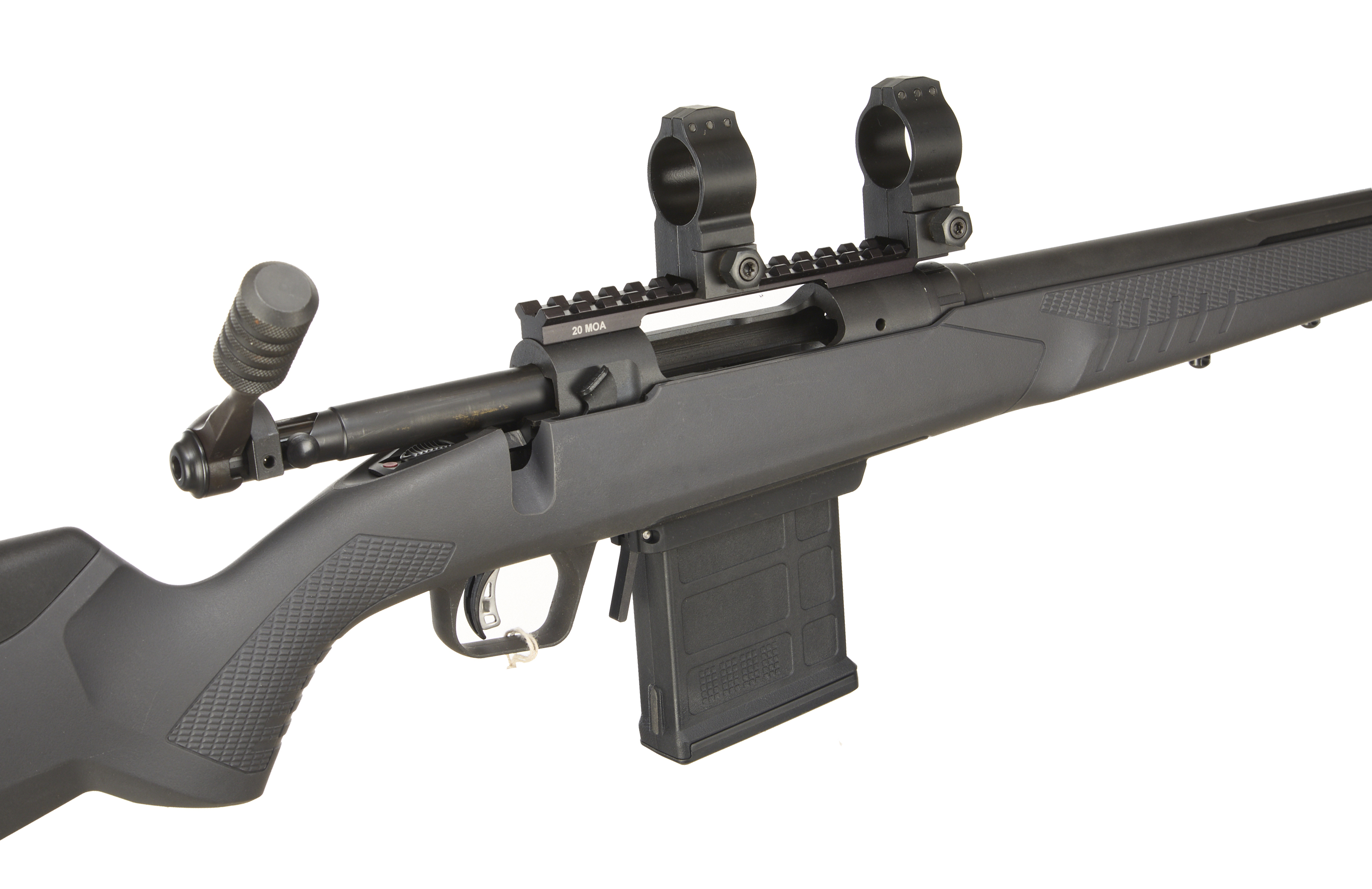 Cushioned butt, synthetic stock, semi-pistol grip, rounded forend. Sling attachments. Screwcut muzzle, unsighted fluted barrel. Detachable magazine. 30mm scope rings, 20 MOA Weaver rail
