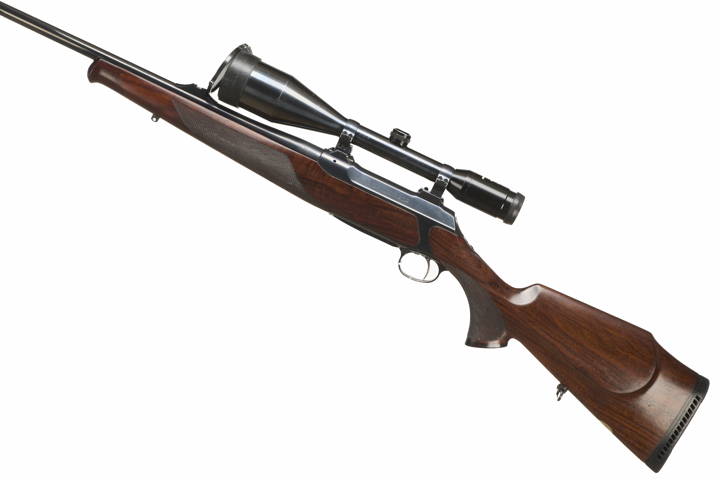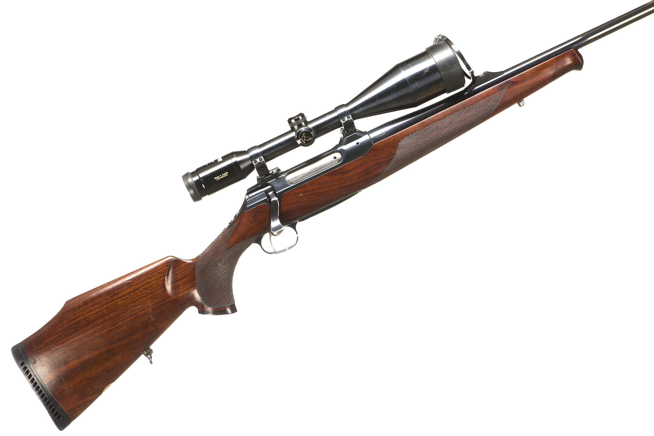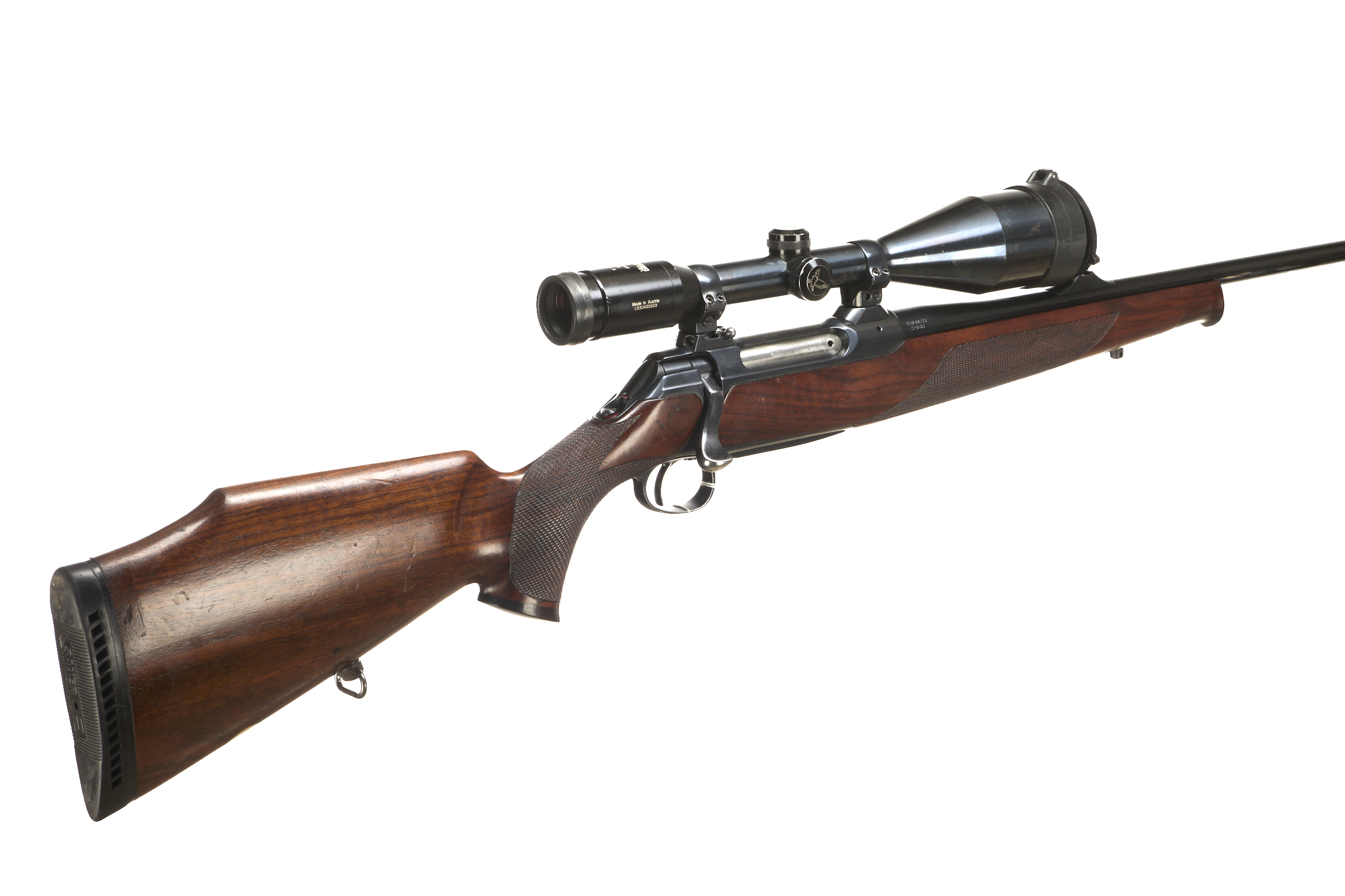 Cushioned butt, semi-pistol grip with rosewood cap, schnabel rosewood forend. Screwcut muzzle, unsighted barrel. Detachable magazine.