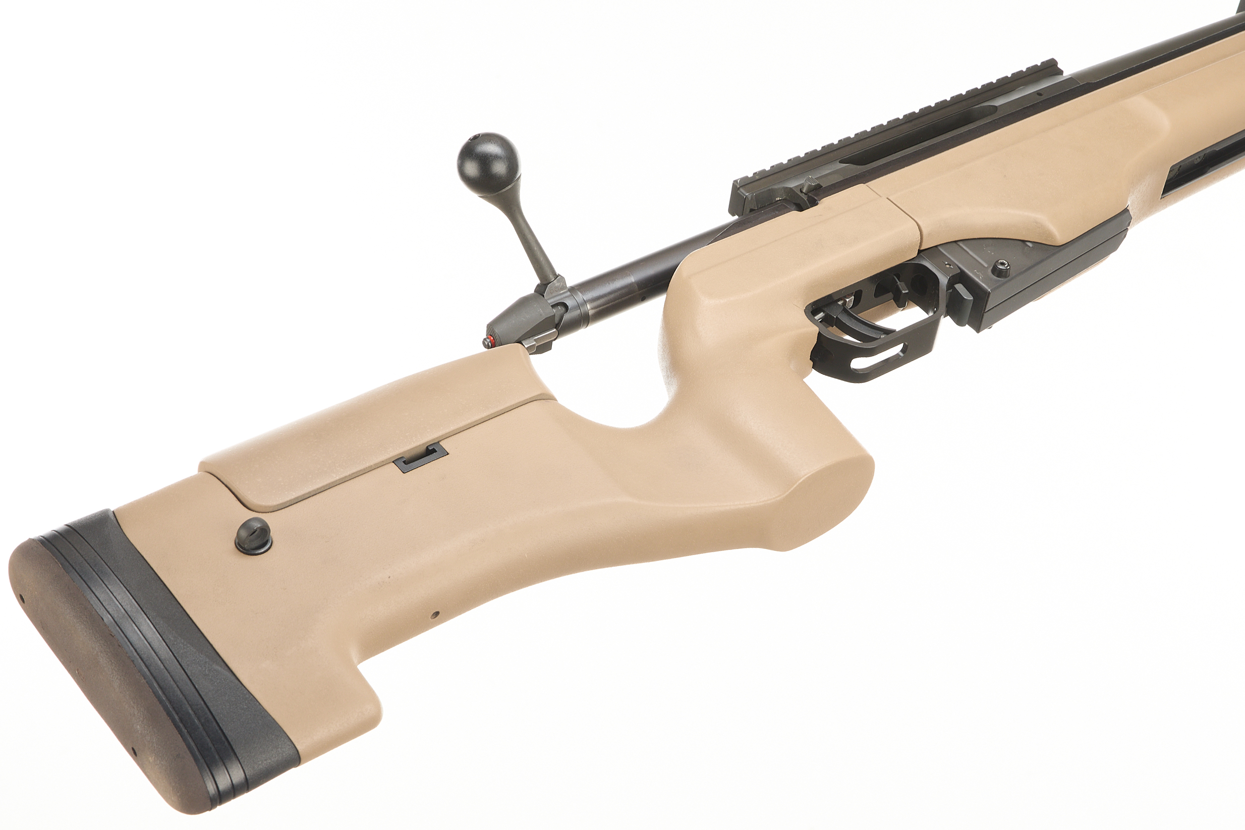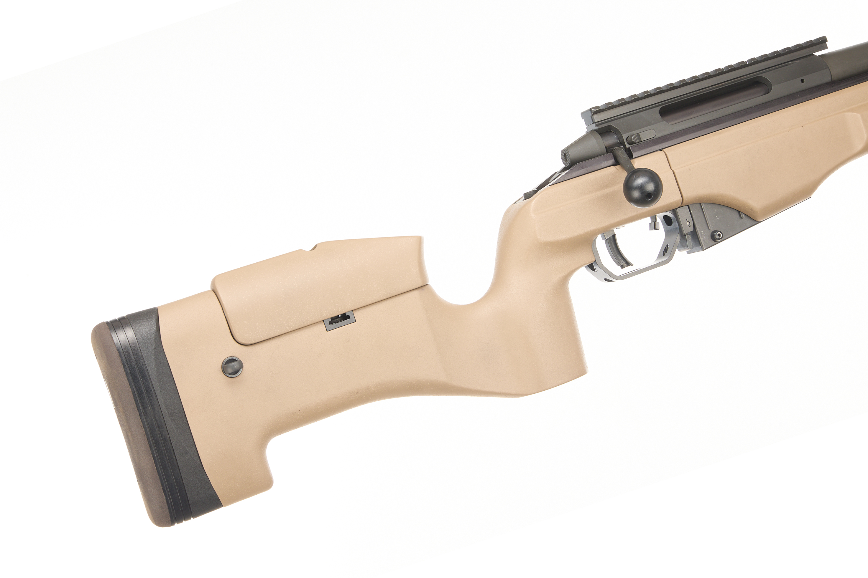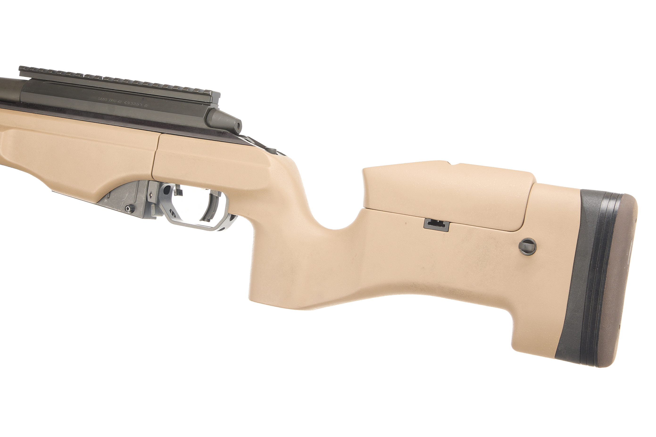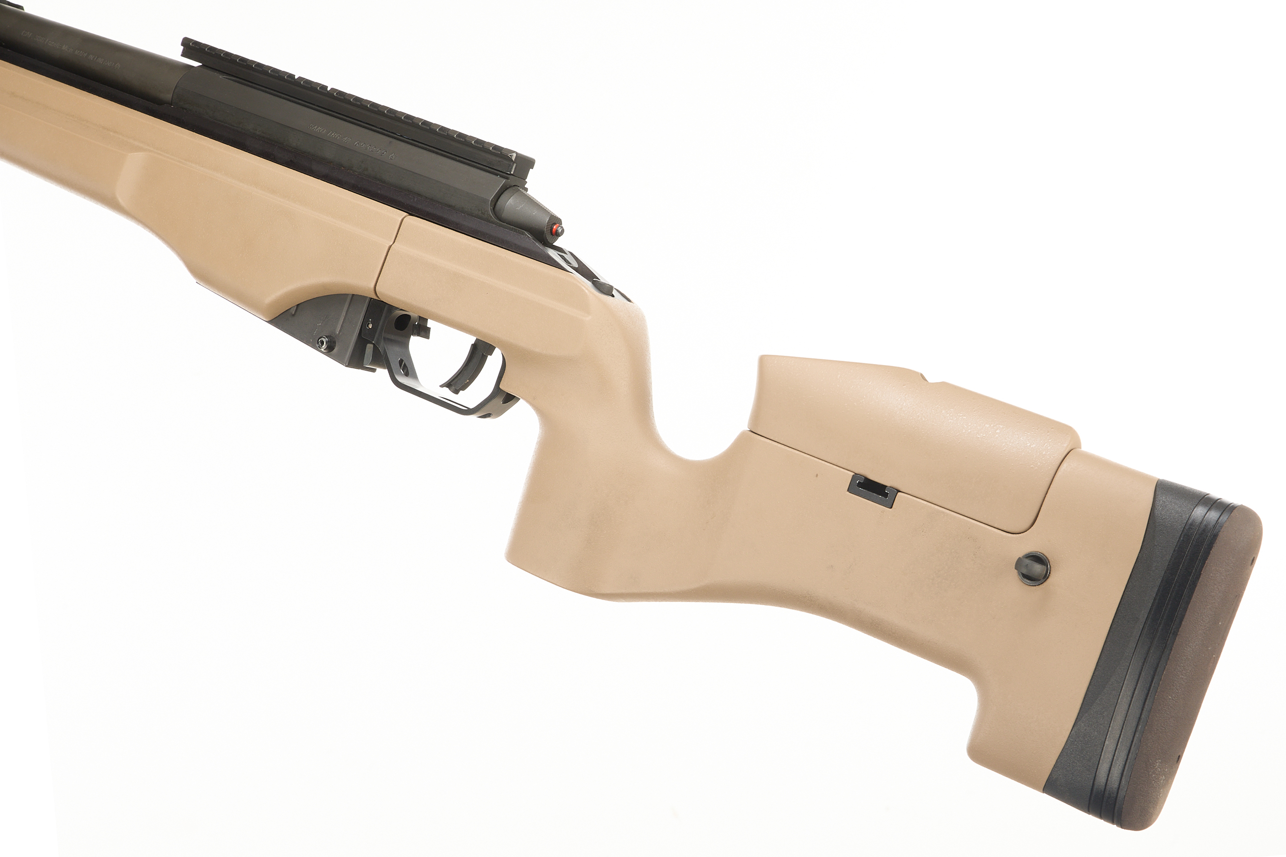 Rubber butt pad with spacers, brown polymer stock with front and rear sling studs and a UIT rail. Adjustable cheek piece and adjustable trigger. CW picatinny top rail and night vision rail.