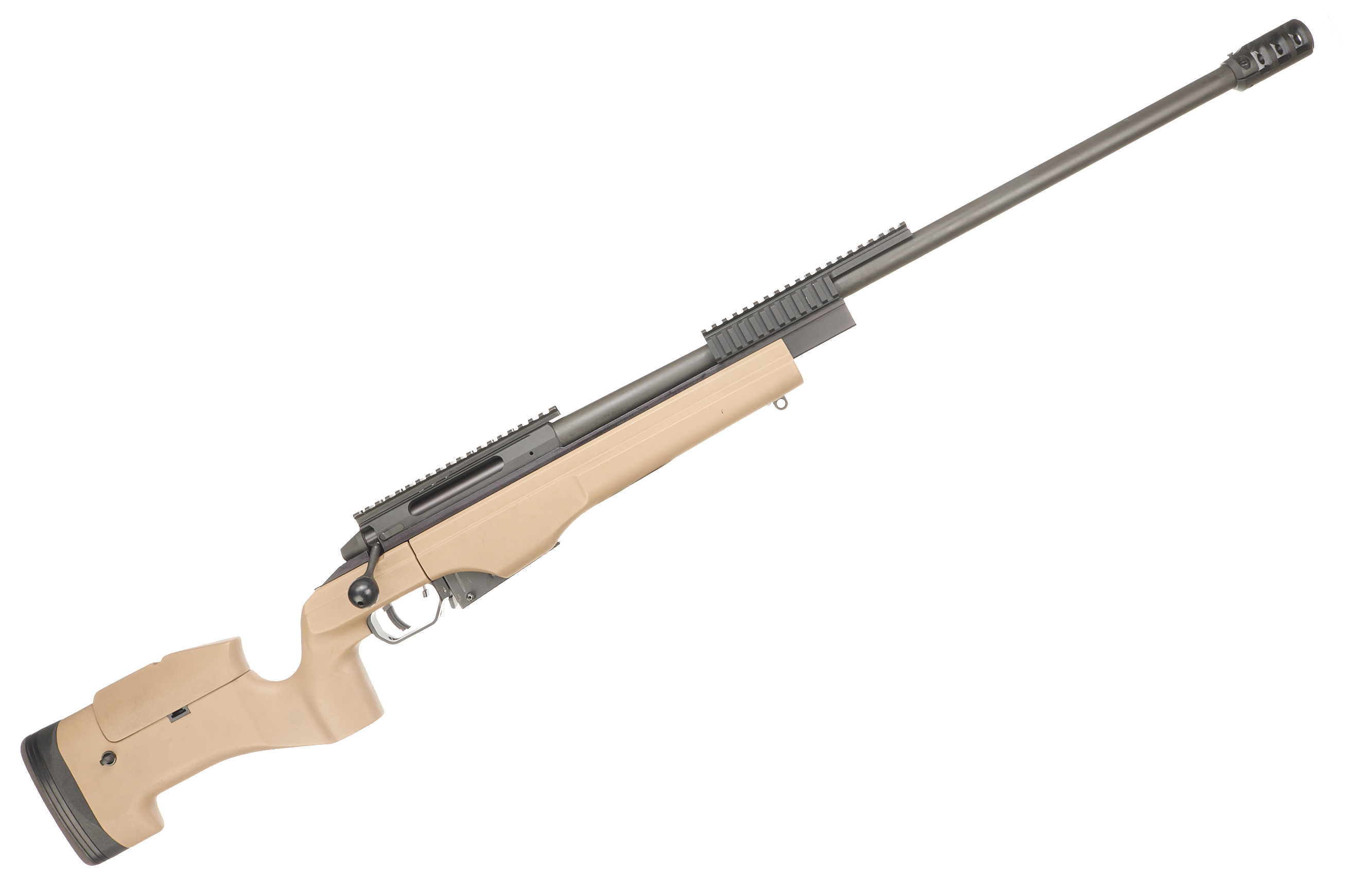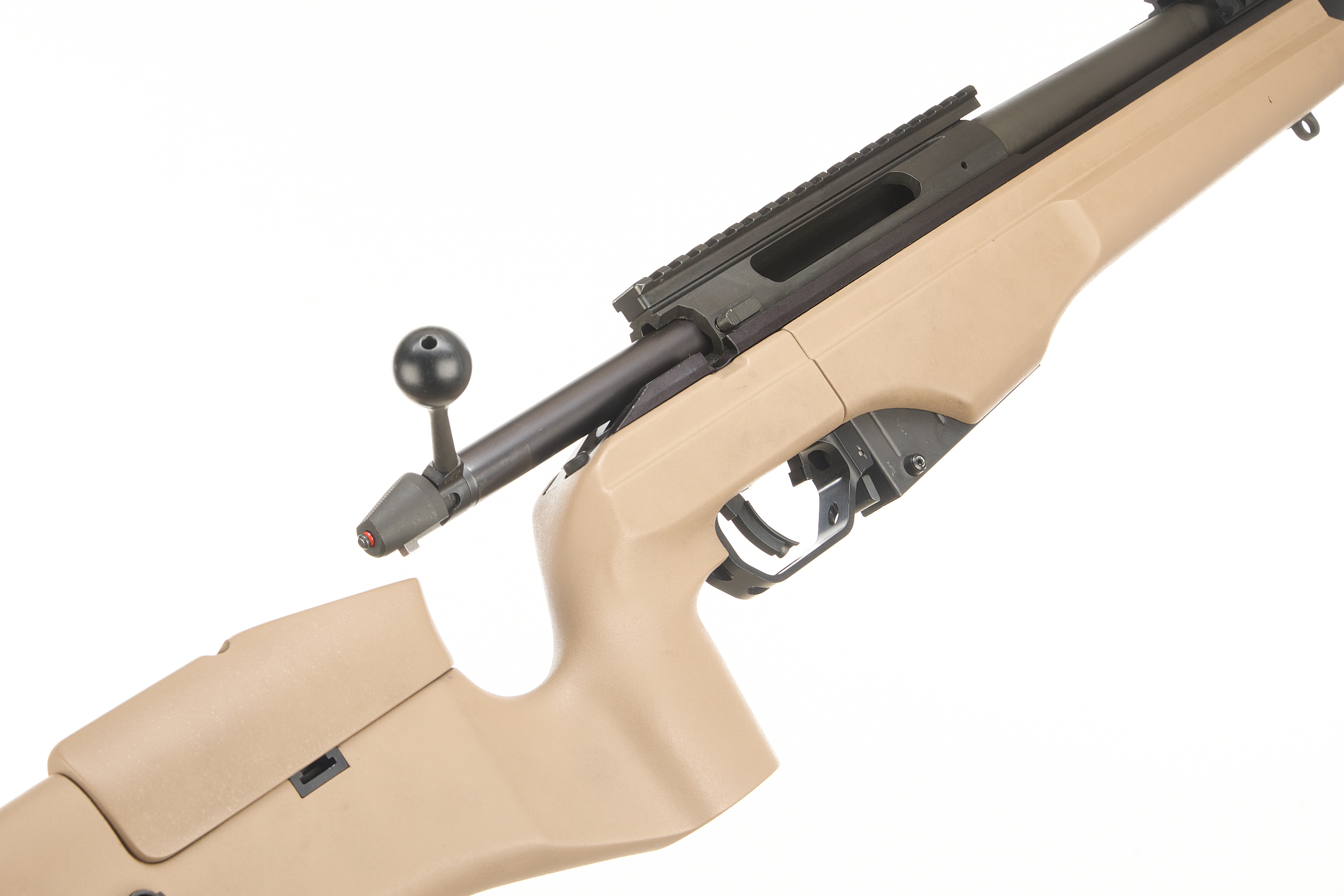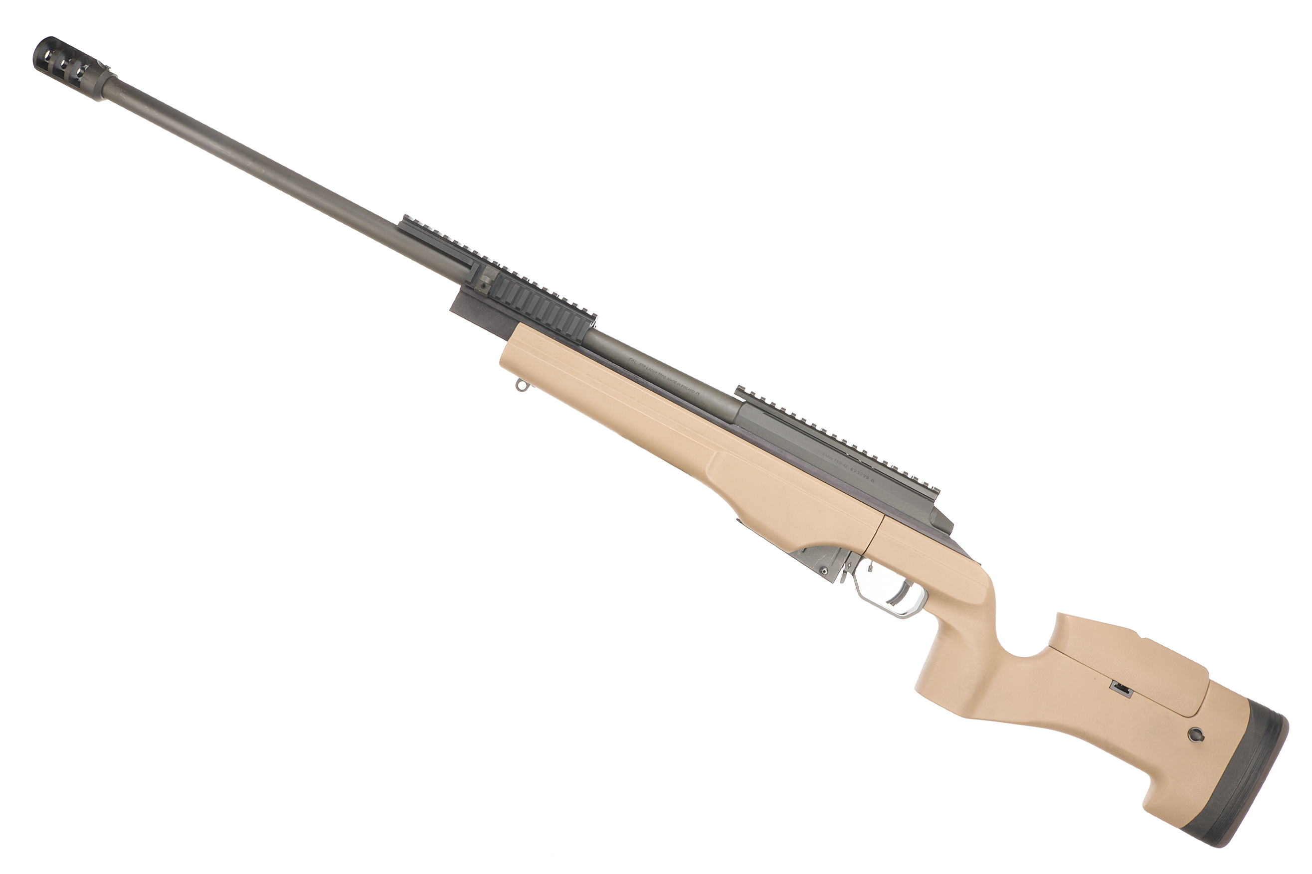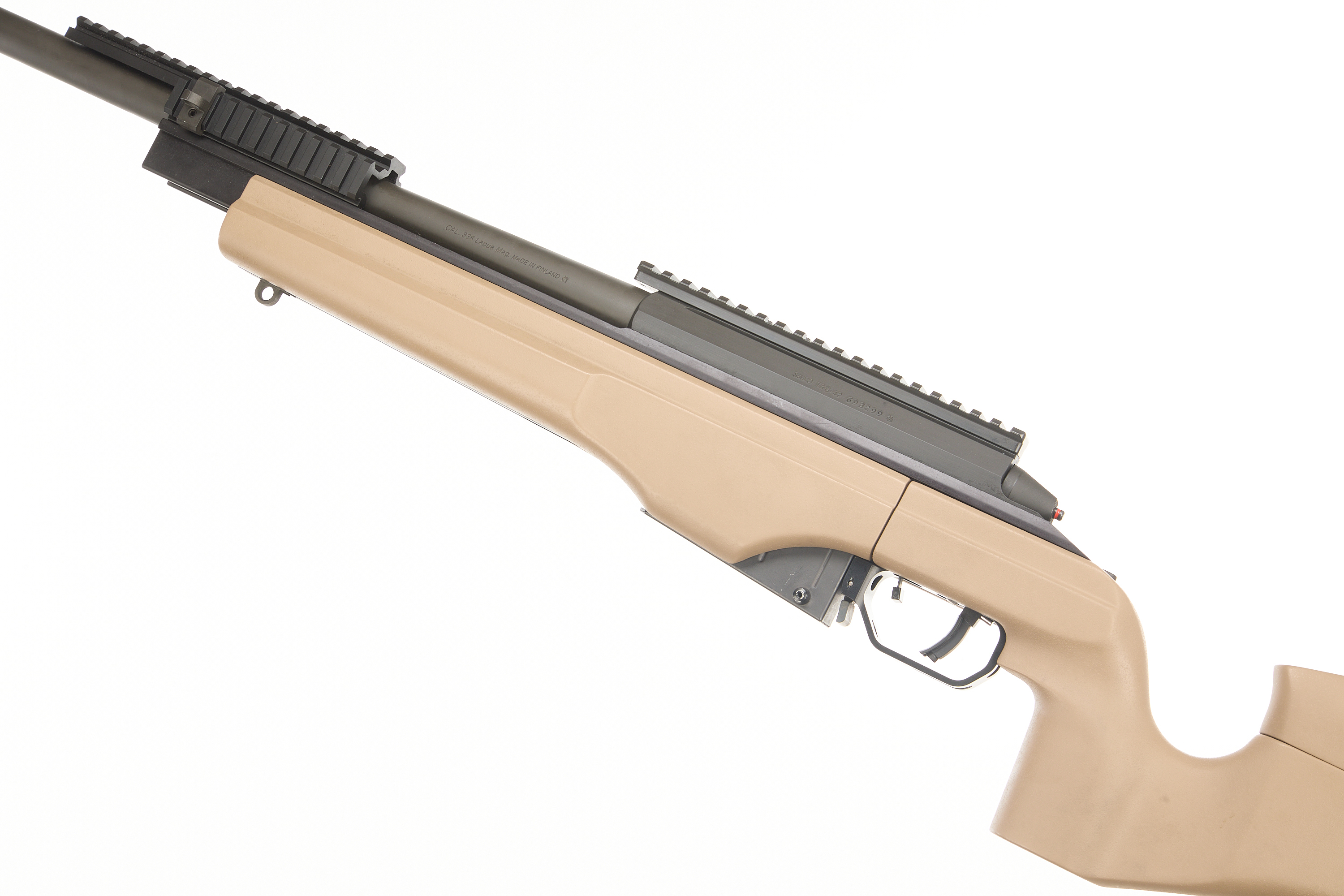 Rubber butt pad with spacers, brown polymer stock with front and rear sling studs and a UIT rail. Adjustable cheek piece and adjustable trigger. CW picatinny top rail and night vision rail.