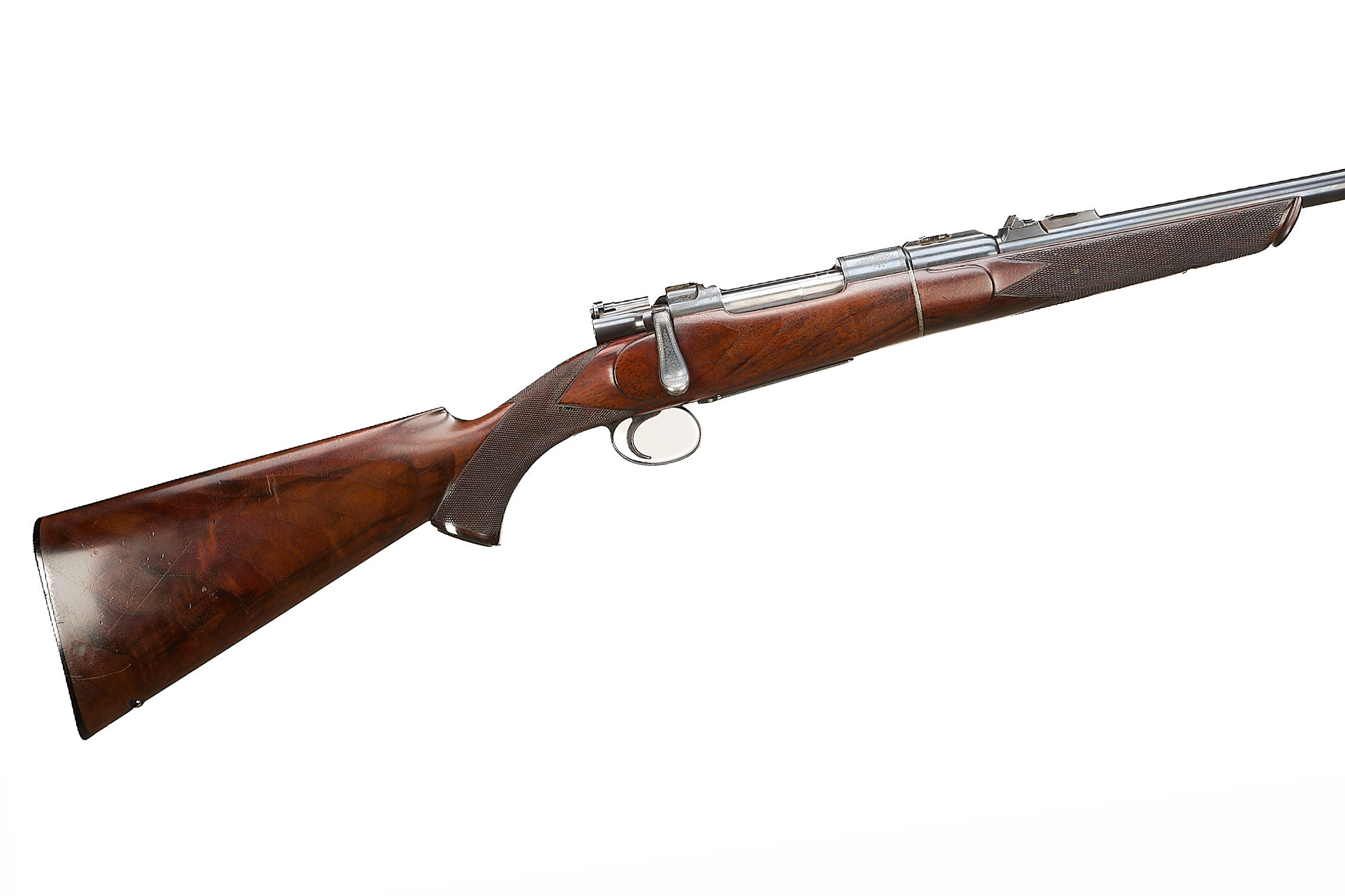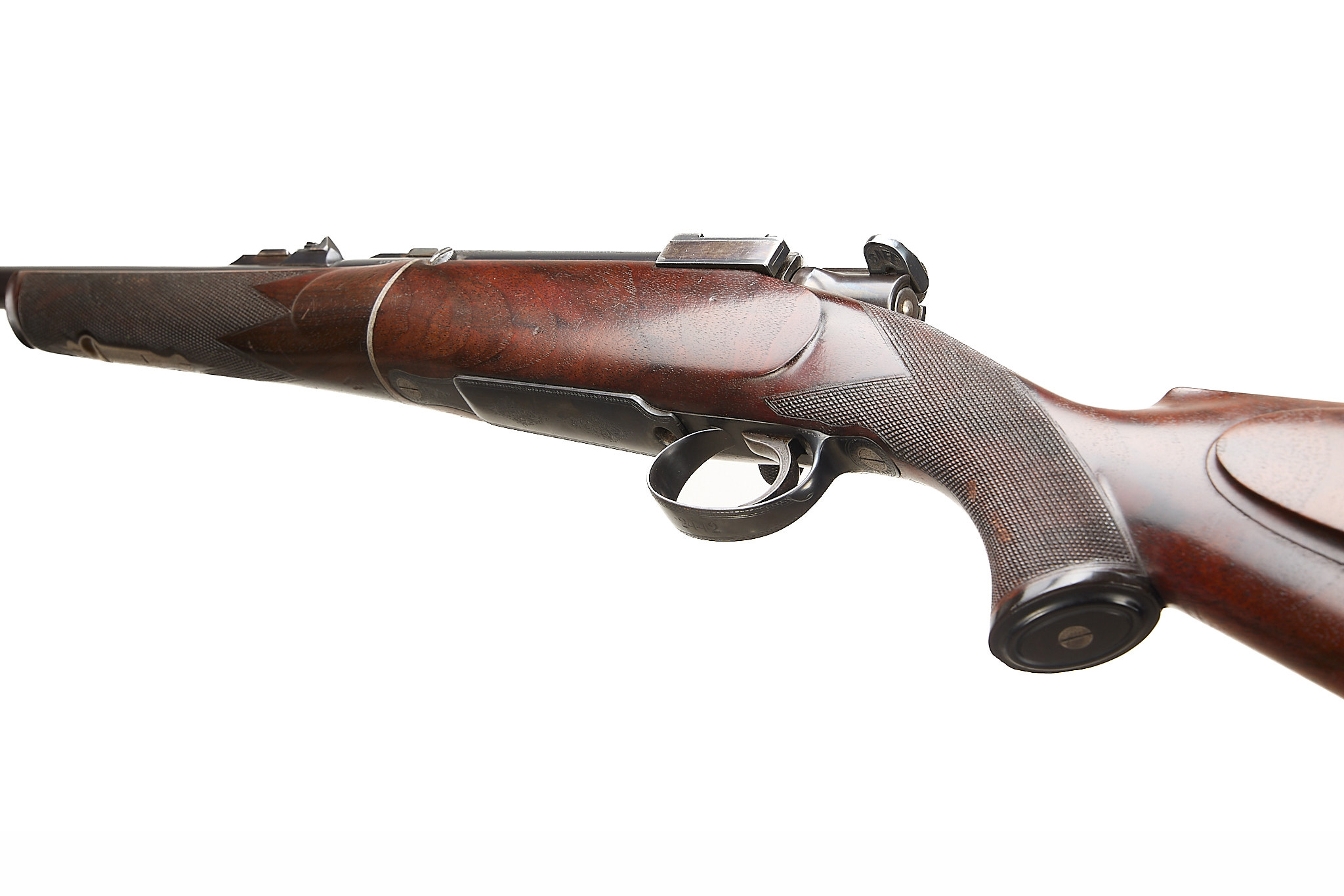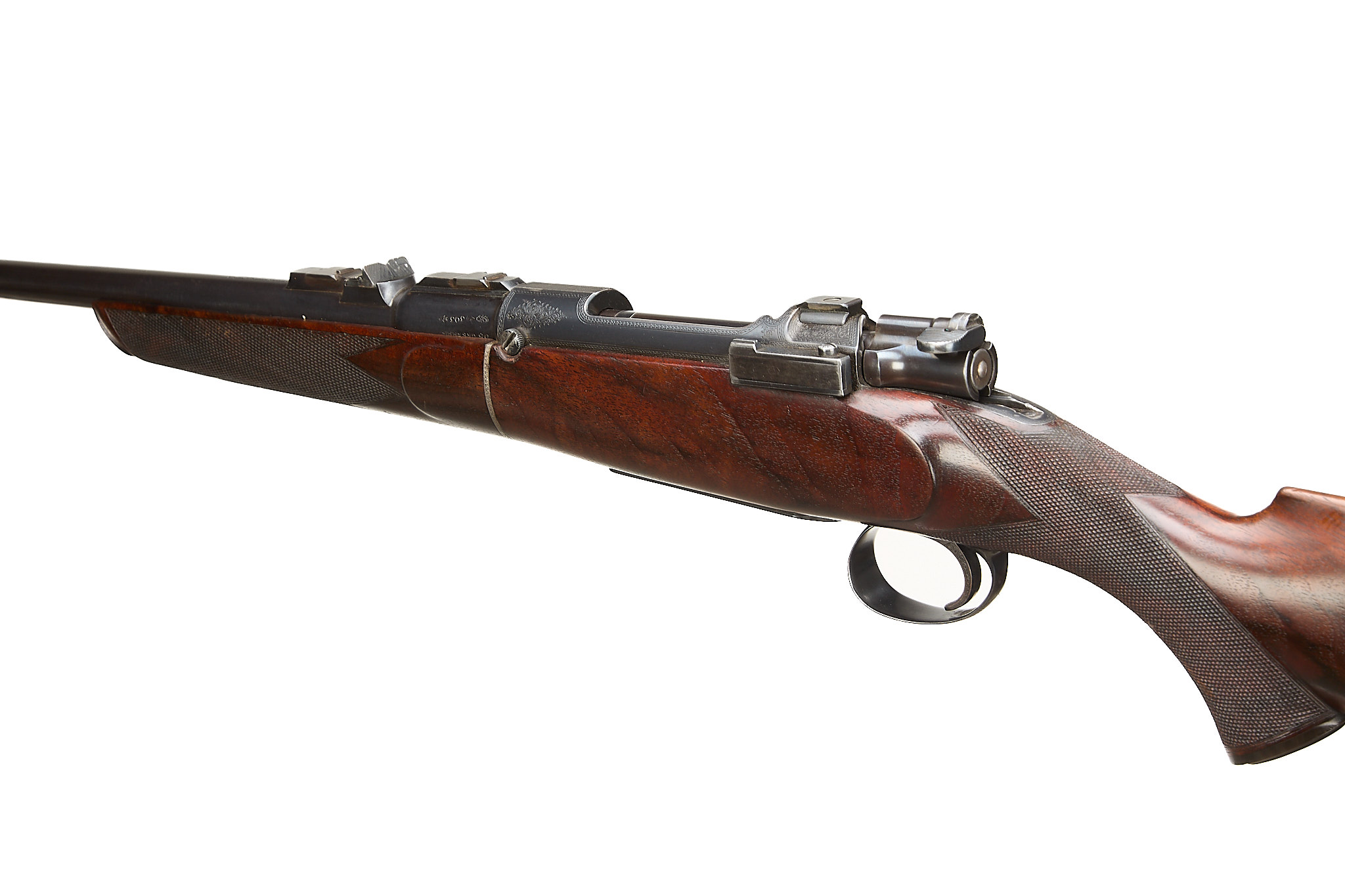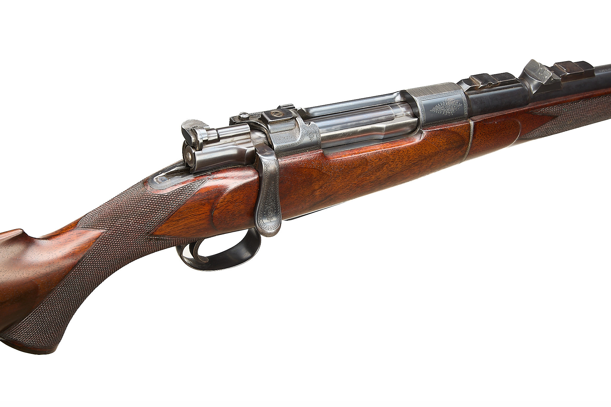 Chequered, ebonite butt, recessed sling attachment and comb. Finely chequered semi-pistol grip with endcap, bolstered, rounded, forend with Henry-type finial, Deeley & Edge release, machined main body ring. Detachable, hooded, block-mounted flip-up, bead foresight, sling attachment, block-mounted rear sights with folding leaves engraved 100, 200, 300, dovetail mount for scope. The nitro-proved barrel engraved ‘DANL. FRASER & CO. GUN & RIFLE MANUFACTURERS. 4 LEITH ST. TERRACE. EDINBURGH’. Internal magazine with hinged floor plate, recessed release. Flag safety, turned down cocking handle, rear dovetail mount. The action with ropework border to the whole, acanthus highlights. Chambers 7.65mm Belgian, Argentinian Mauser. In the manufacturer’s leather edged, canvas covered, oak case with tools and accessories.
