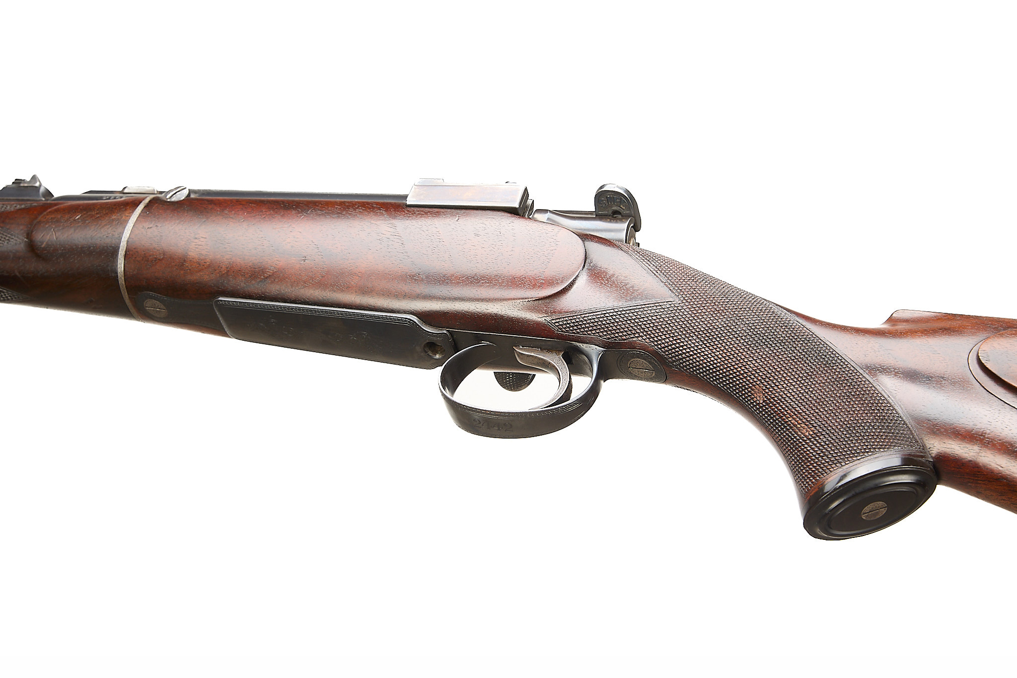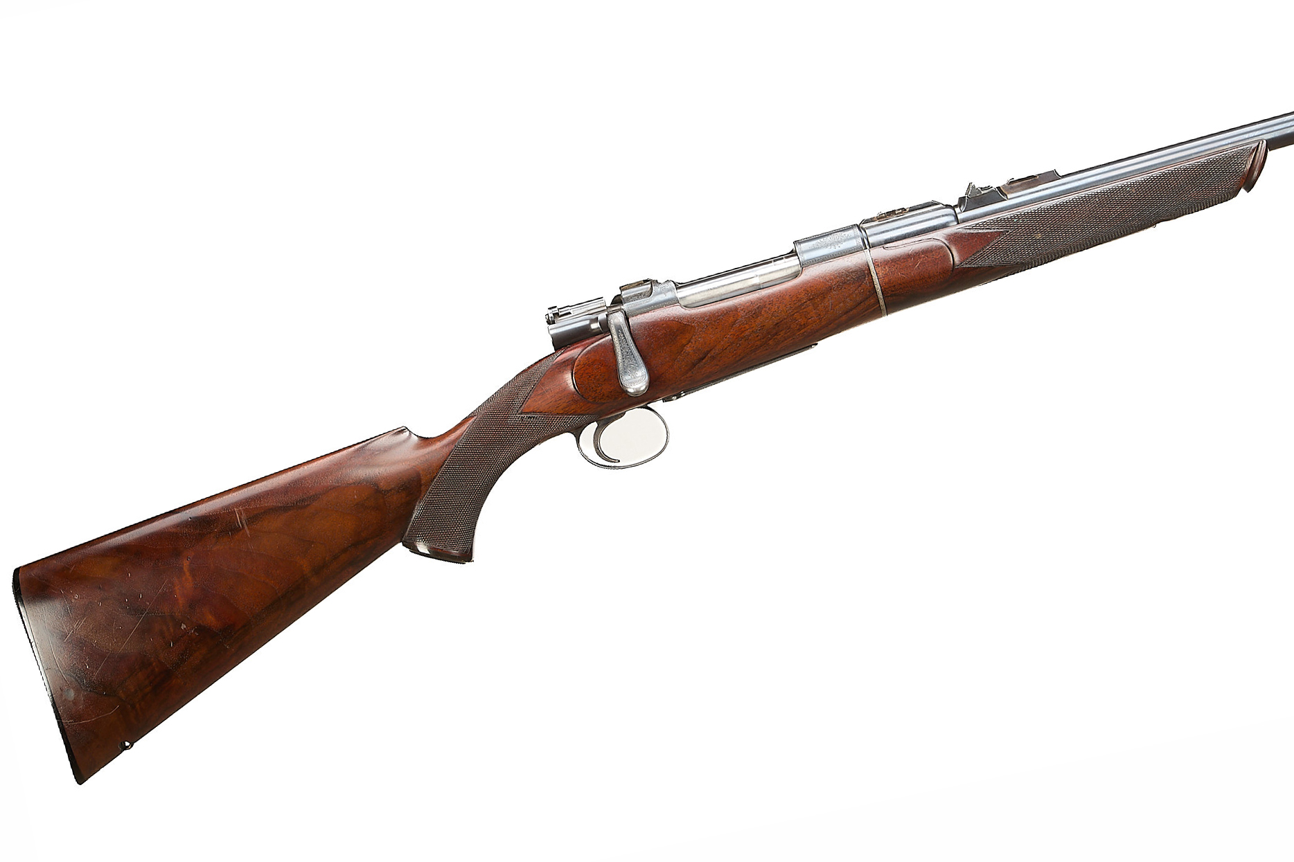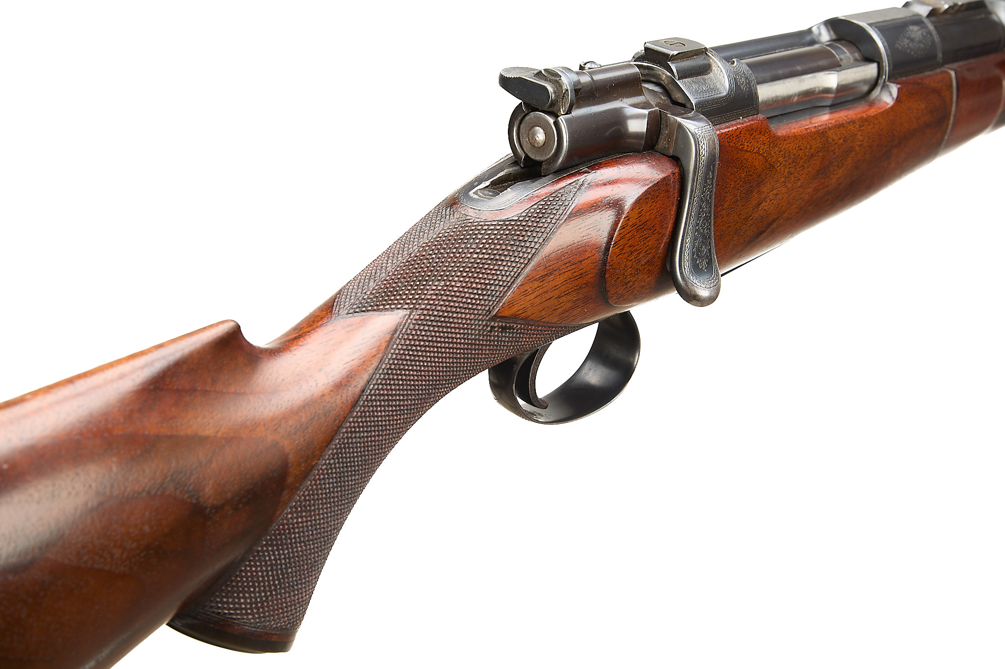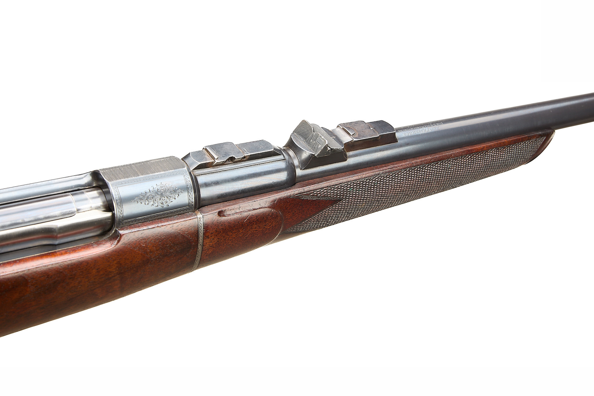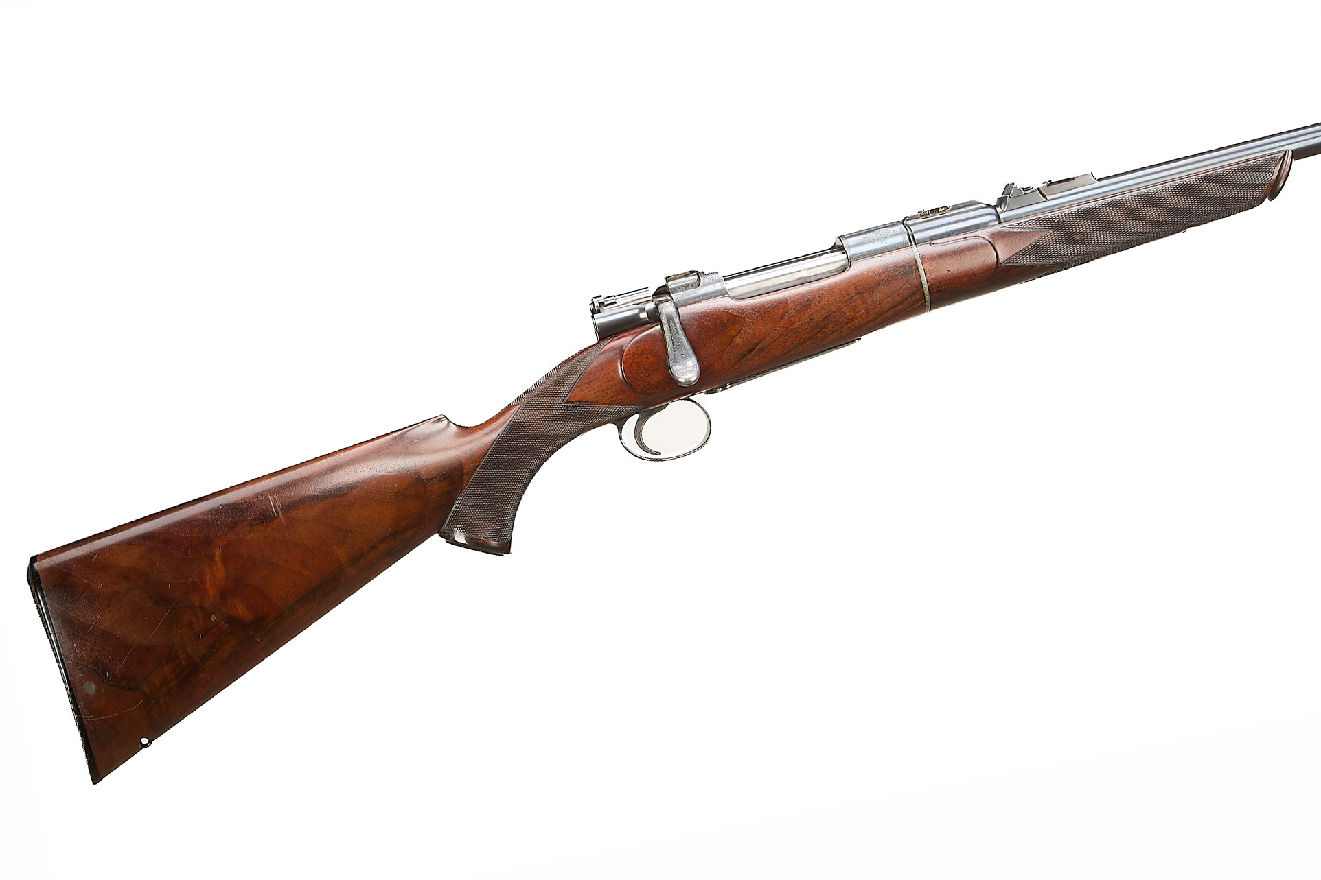 Chequered, ebonite butt, recessed sling attachment and comb. Finely chequered semi-pistol grip with endcap, bolstered, rounded, forend with Henry-type finial, Deeley & Edge release, machined main body ring. Detachable, hooded, block-mounted flip-up, bead foresight, sling attachment, block-mounted rear sights with folding leaves engraved 100, 200, 300, dovetail mount for scope. The nitro-proved barrel engraved ‘DANL. FRASER & CO. GUN & RIFLE MANUFACTURERS. 4 LEITH ST. TERRACE. EDINBURGH’. Internal magazine with hinged floor plate, recessed release. Flag safety, turned down cocking handle, rear dovetail mount. The action with ropework border to the whole, acanthus highlights. Chambers 7.65mm Belgian, Argentinian Mauser. In the manufacturer’s leather edged, canvas covered, oak case with tools and accessories.