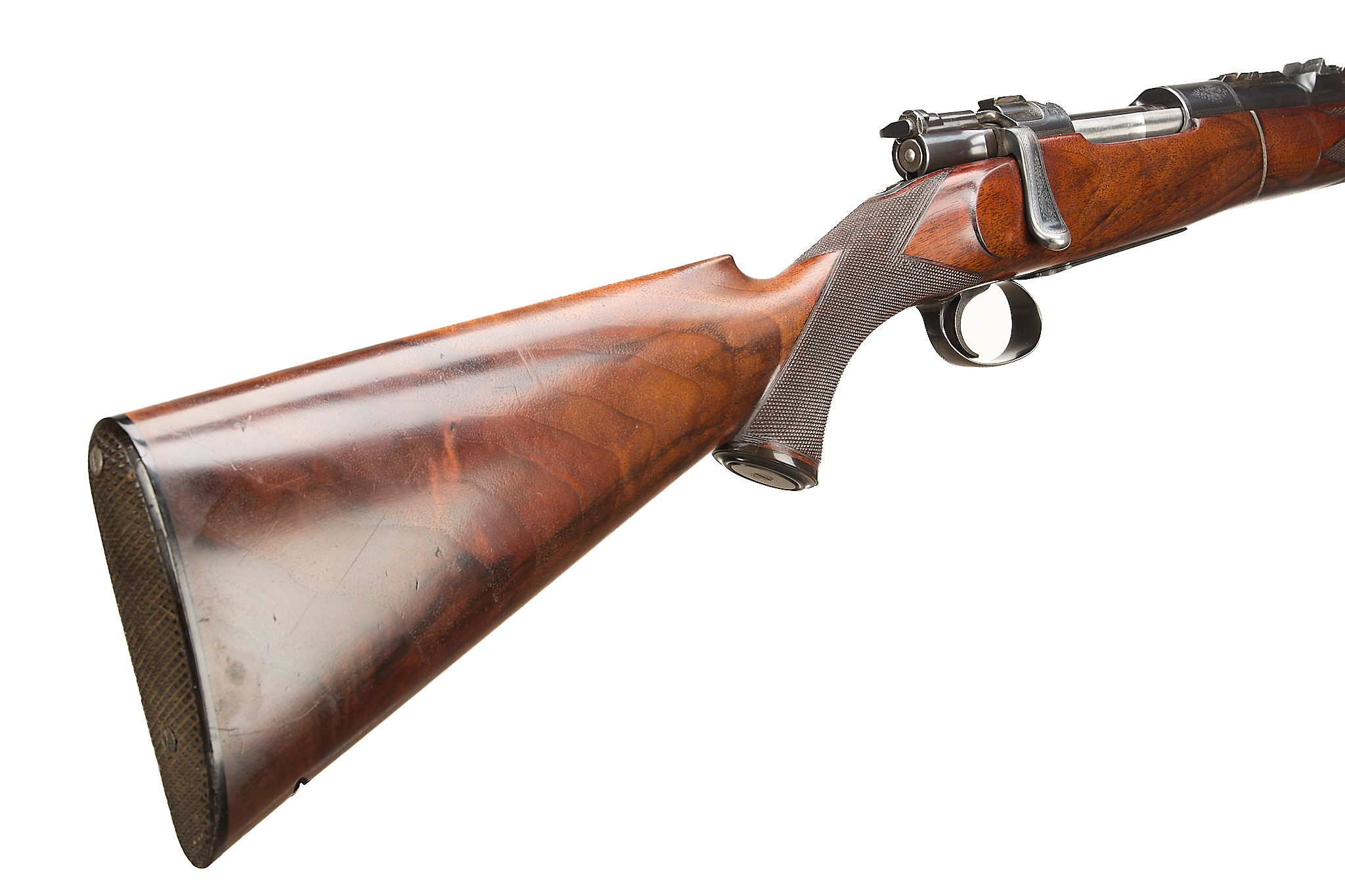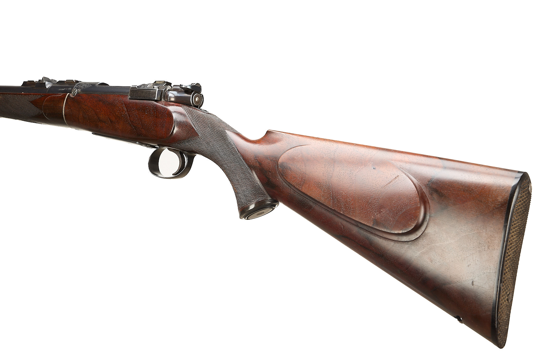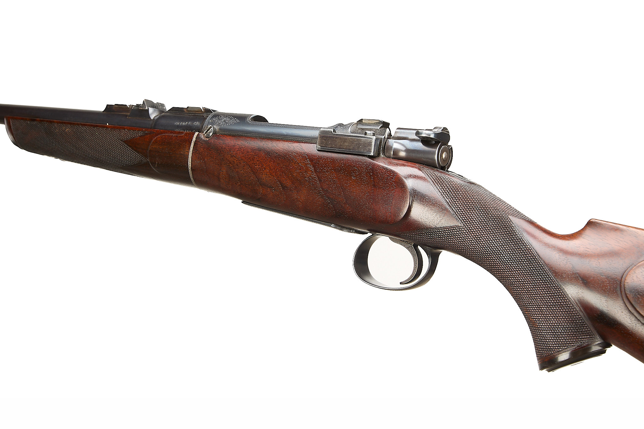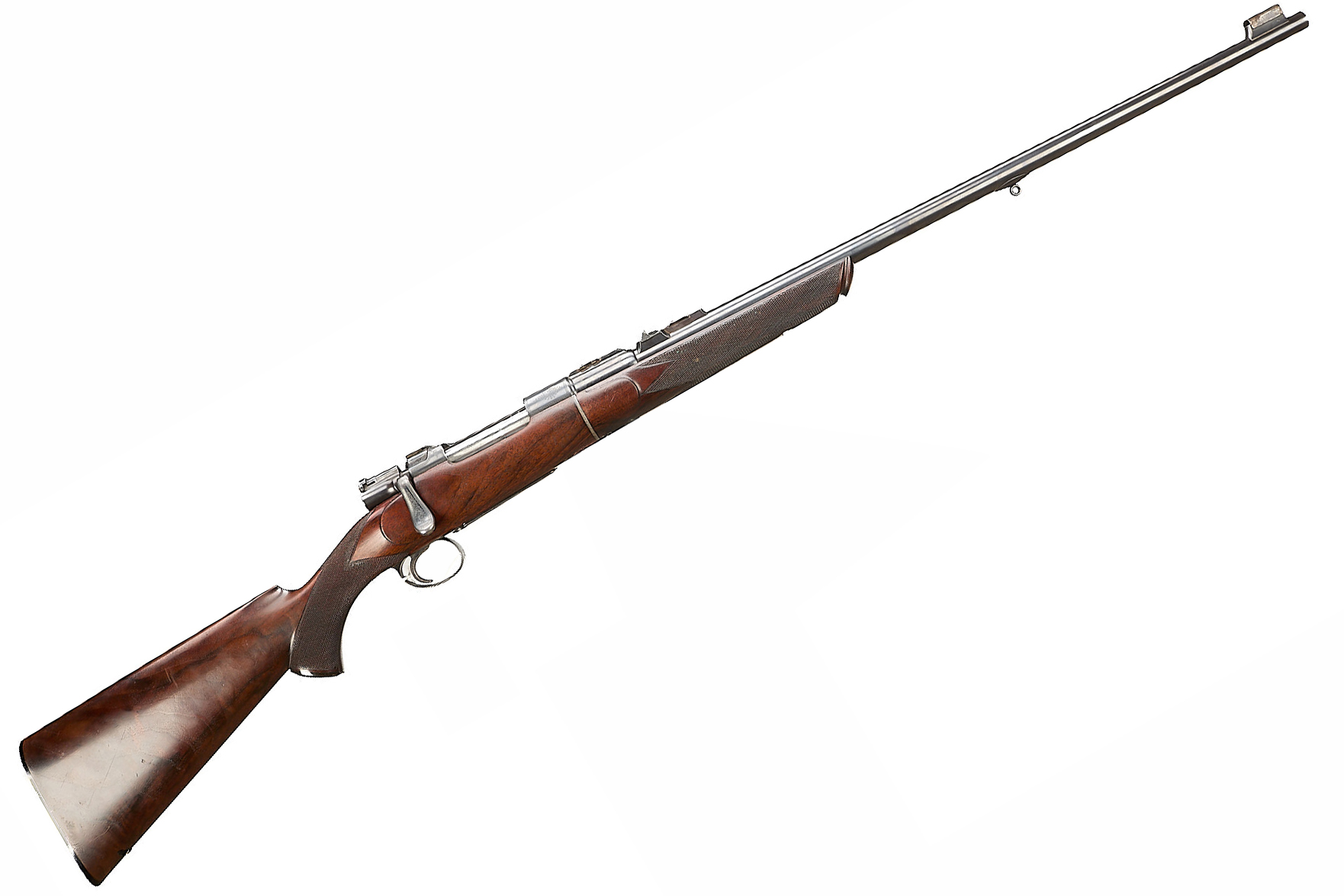 Chequered, ebonite butt, recessed sling attachment and comb. Finely chequered semi-pistol grip with endcap, bolstered, rounded, forend with Henry-type finial, Deeley & Edge release, machined main body ring. Detachable, hooded, block-mounted flip-up, bead foresight, sling attachment, block-mounted rear sights with folding leaves engraved 100, 200, 300, dovetail mount for scope. The nitro-proved barrel engraved ‘DANL. FRASER & CO. GUN & RIFLE MANUFACTURERS. 4 LEITH ST. TERRACE. EDINBURGH’. Internal magazine with hinged floor plate, recessed release. Flag safety, turned down cocking handle, rear dovetail mount. The action with ropework border to the whole, acanthus highlights. Chambers 7.65mm Belgian, Argentinian Mauser. In the manufacturer’s leather edged, canvas covered, oak case with tools and accessories.