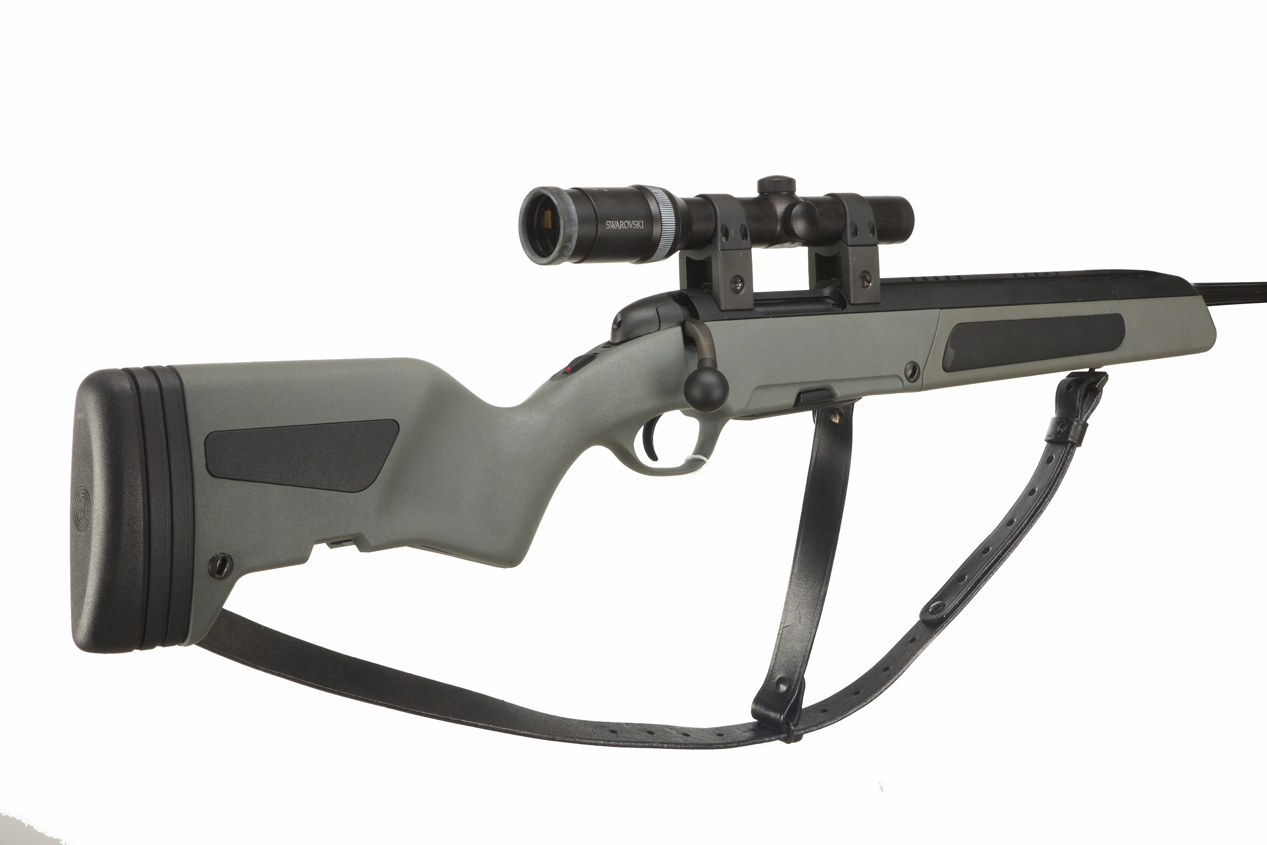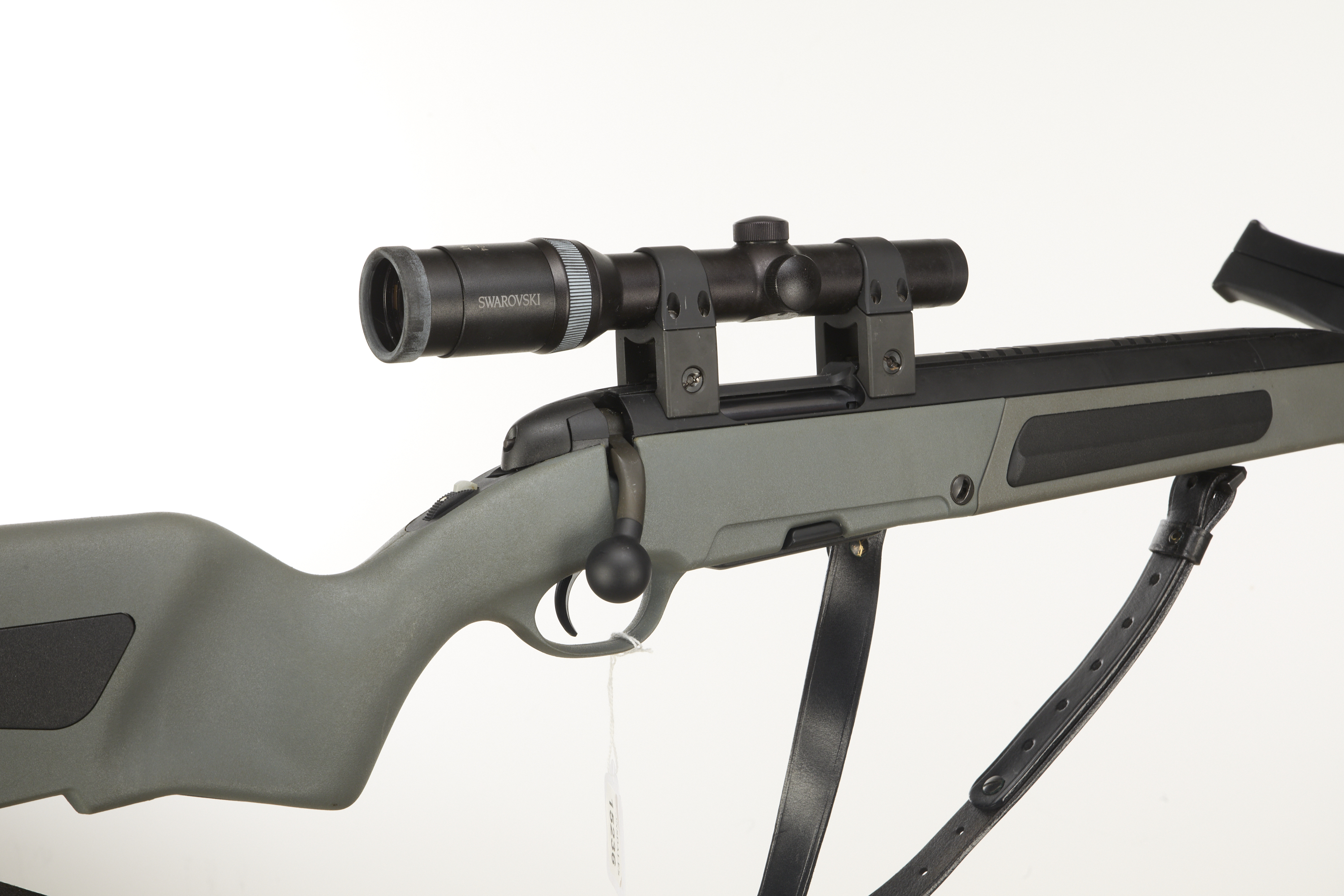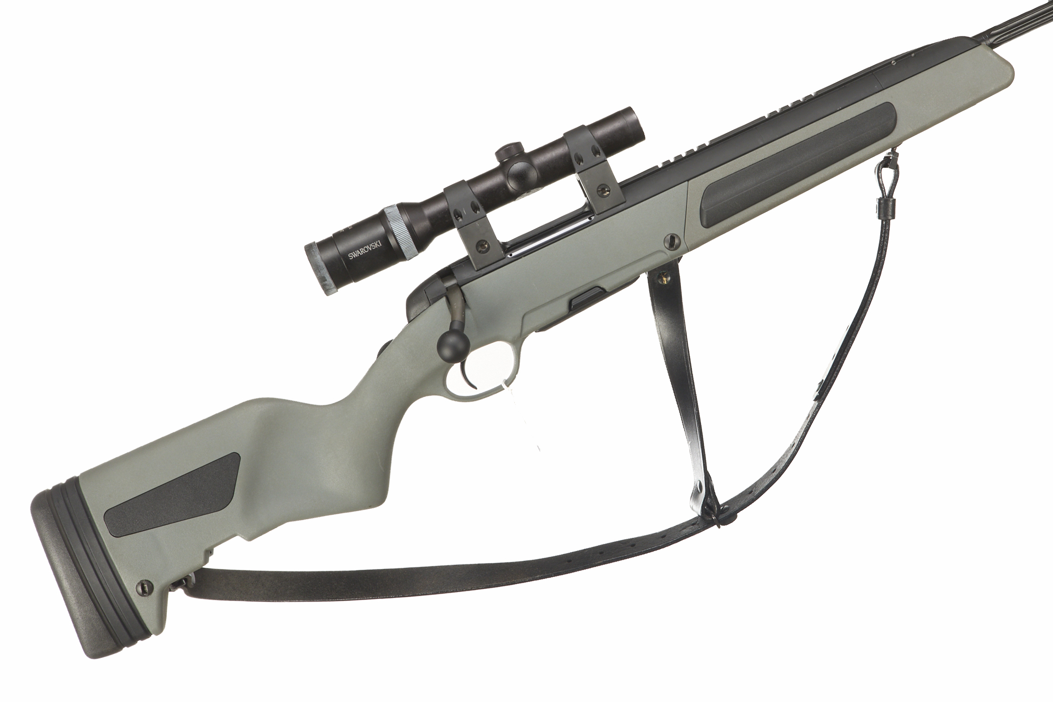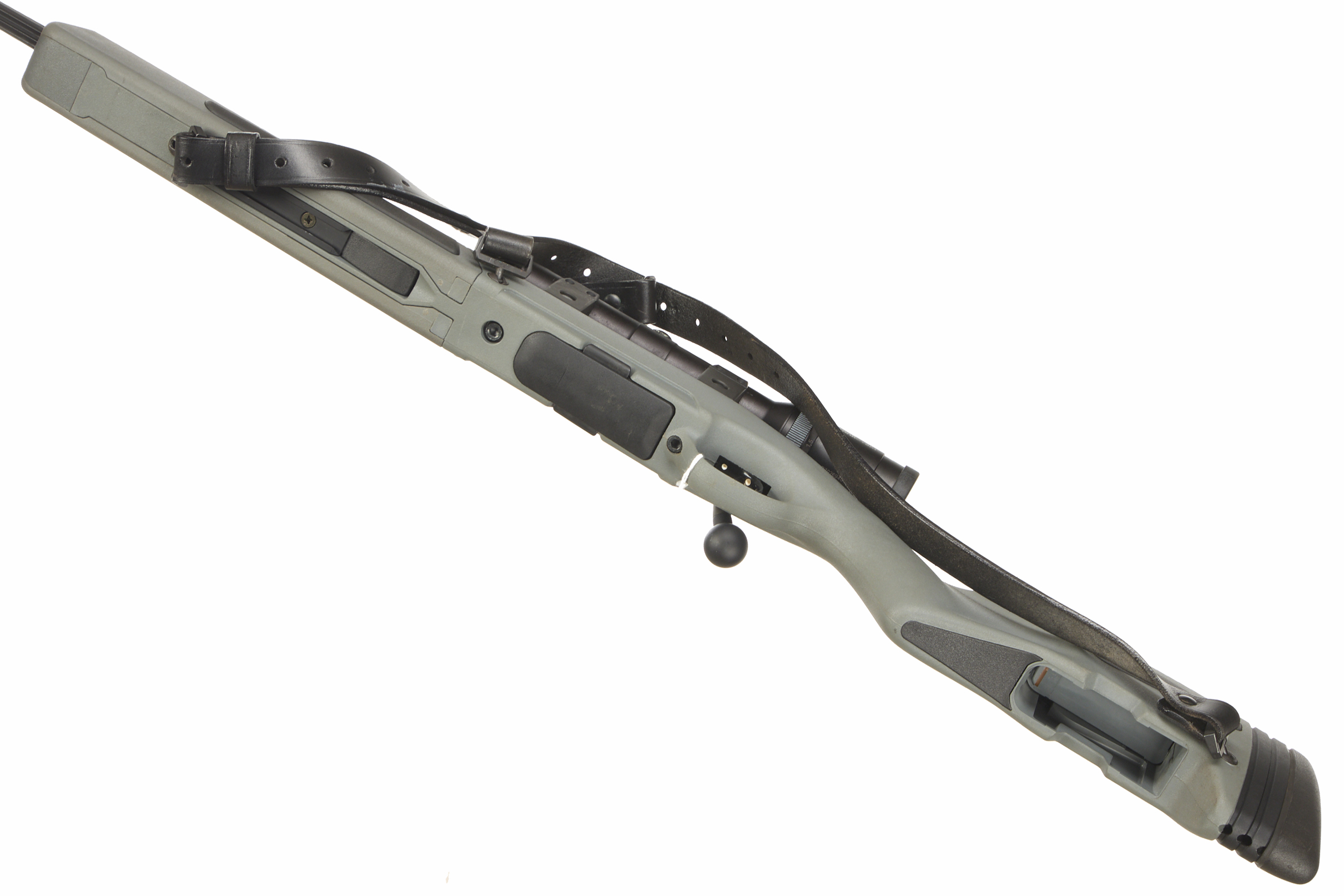 Cushioned butt, synthetic stock, semi-pistol grip, rounded forend. Sling attachments and leather sling. Plain muzzle, unsighted fluted barrel. Detachable magazine. Integrated bipod. post foresight and rearsight
