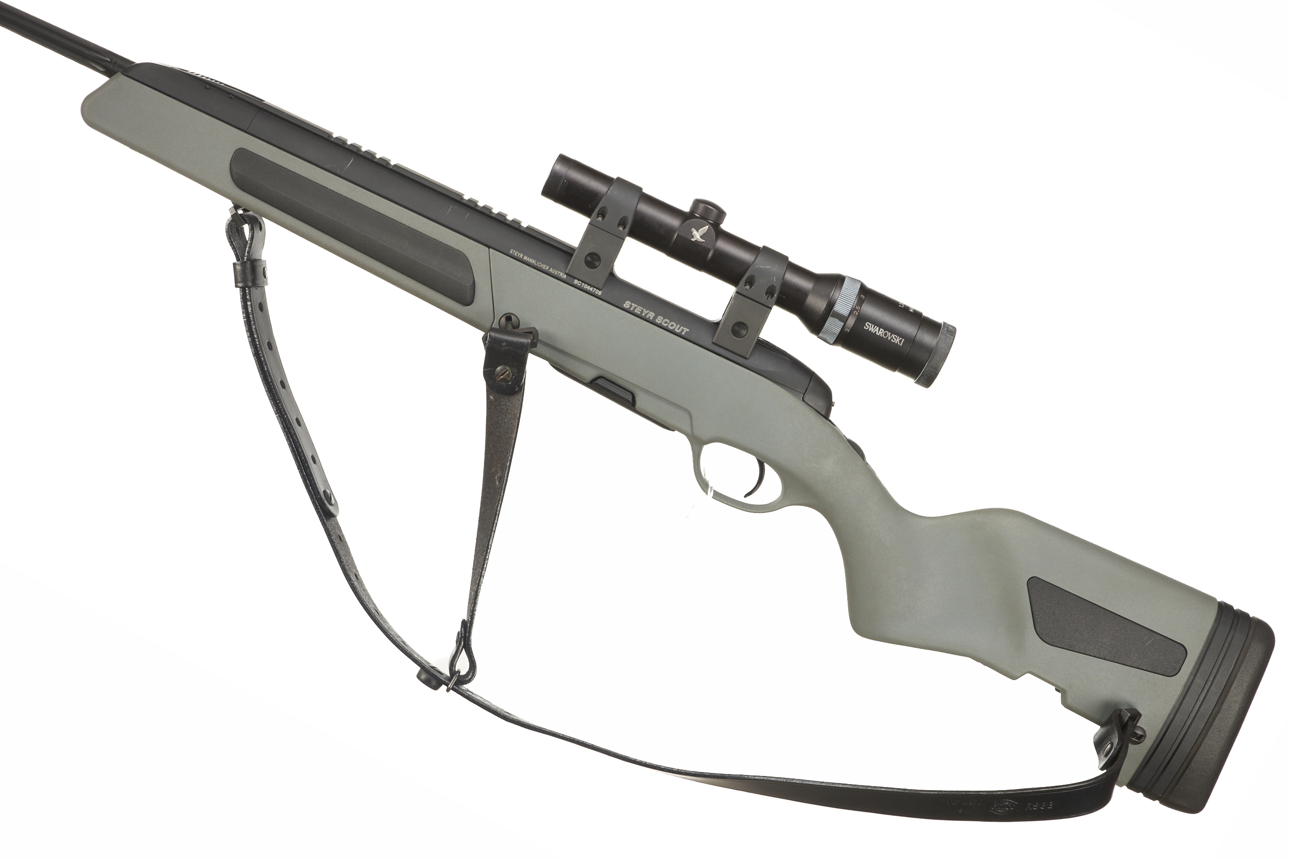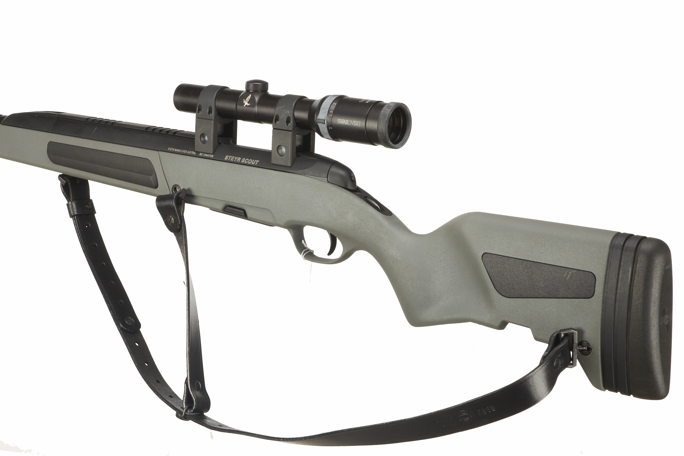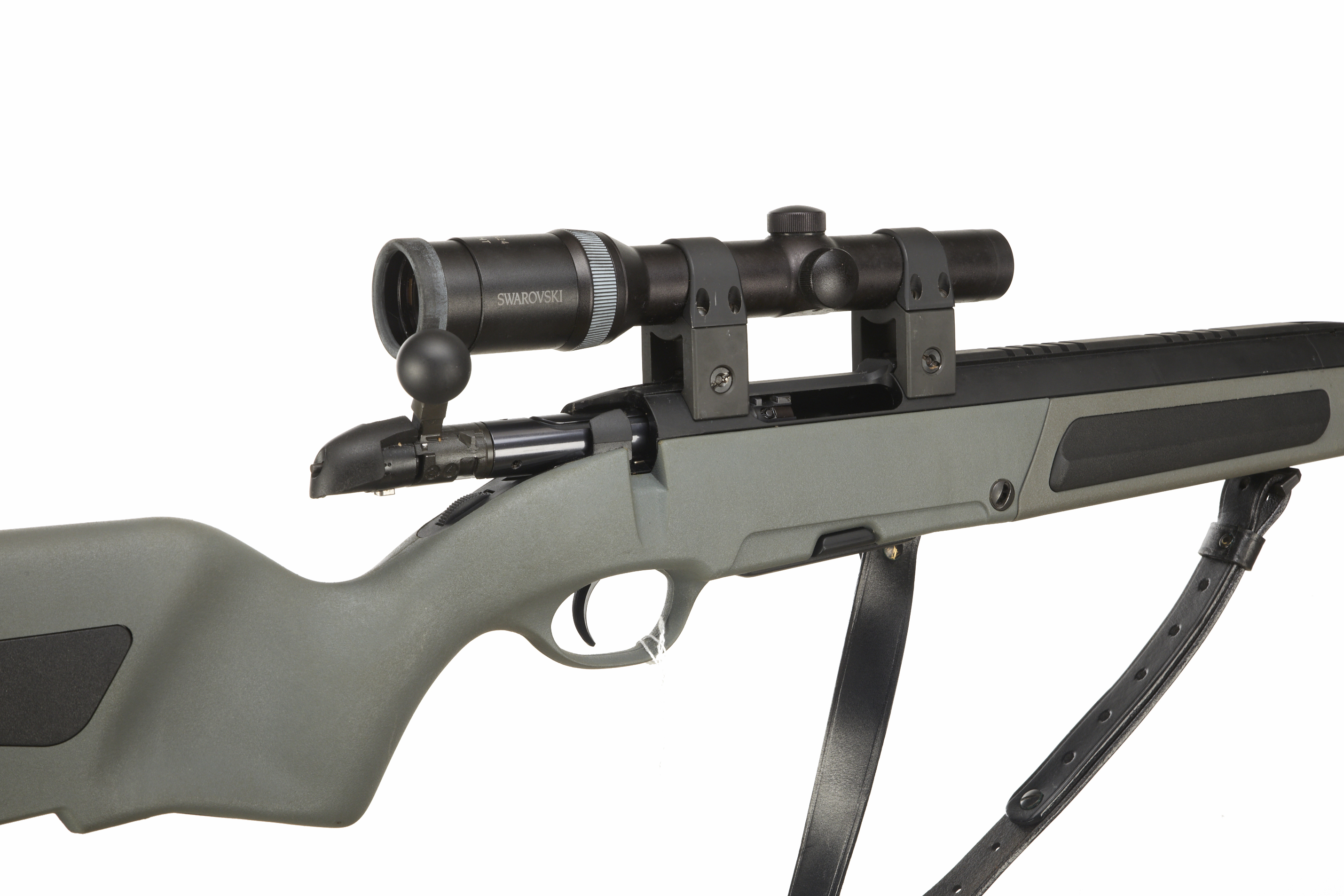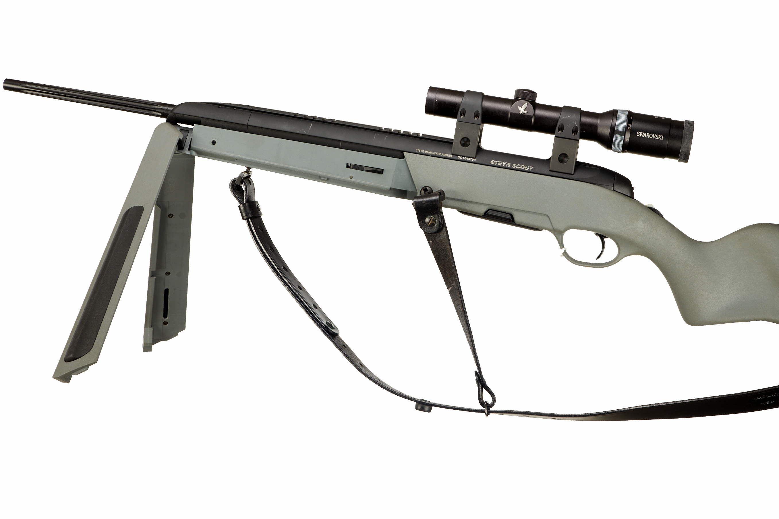 Cushioned butt, synthetic stock, semi-pistol grip, rounded forend. Sling attachments and leather sling. Plain muzzle, unsighted fluted barrel. Detachable magazine. Integrated bipod. post foresight and rearsight