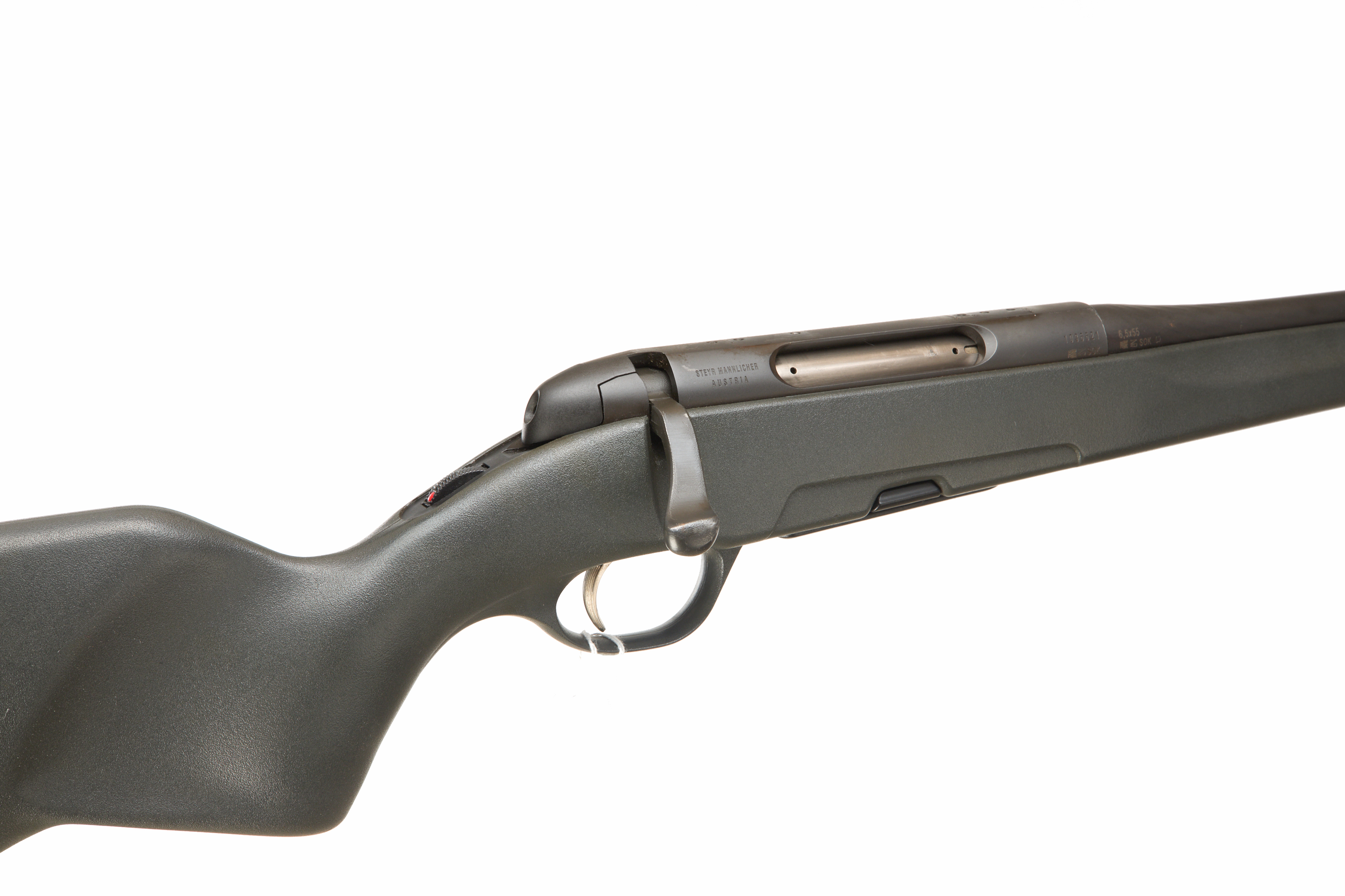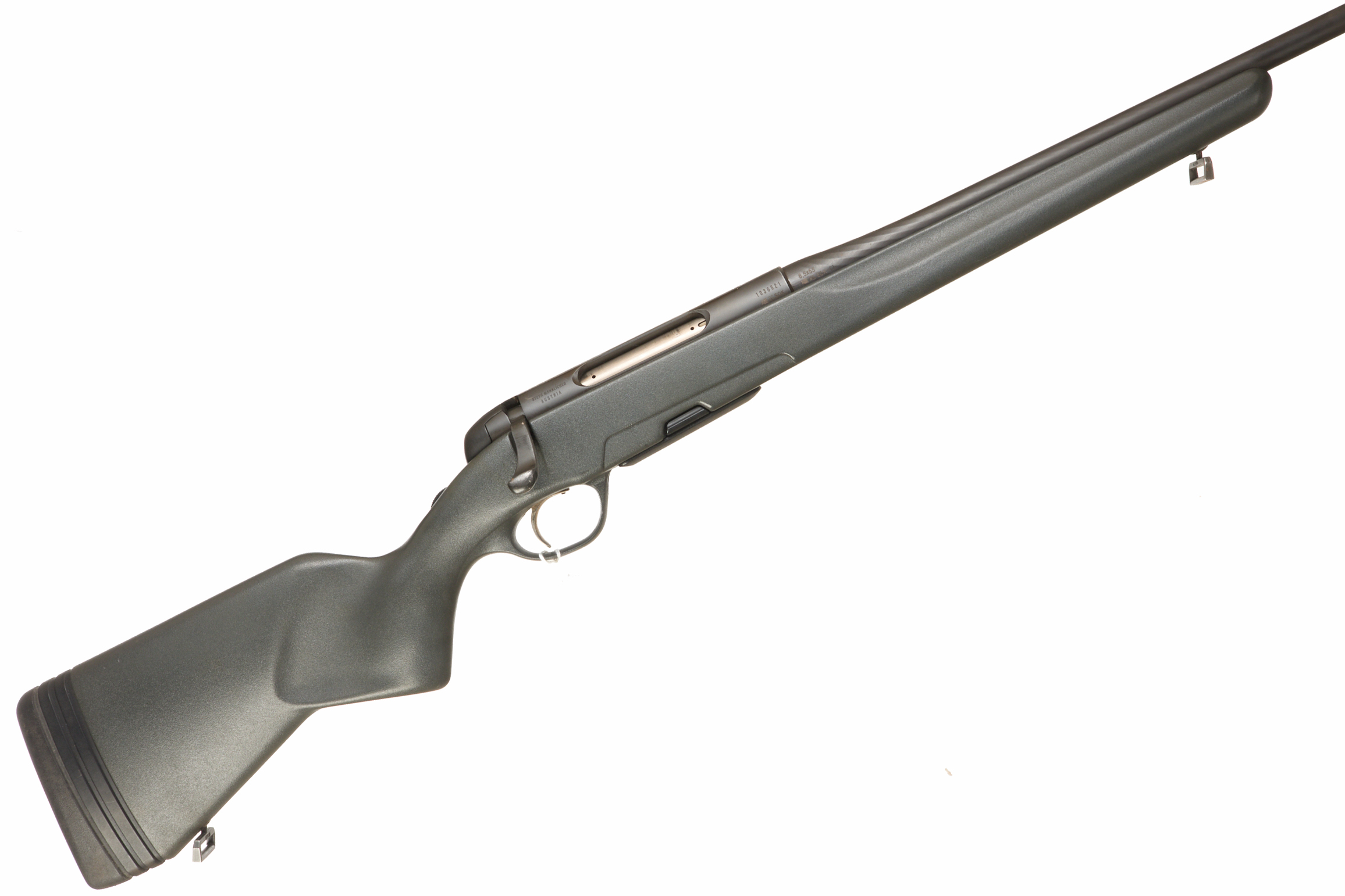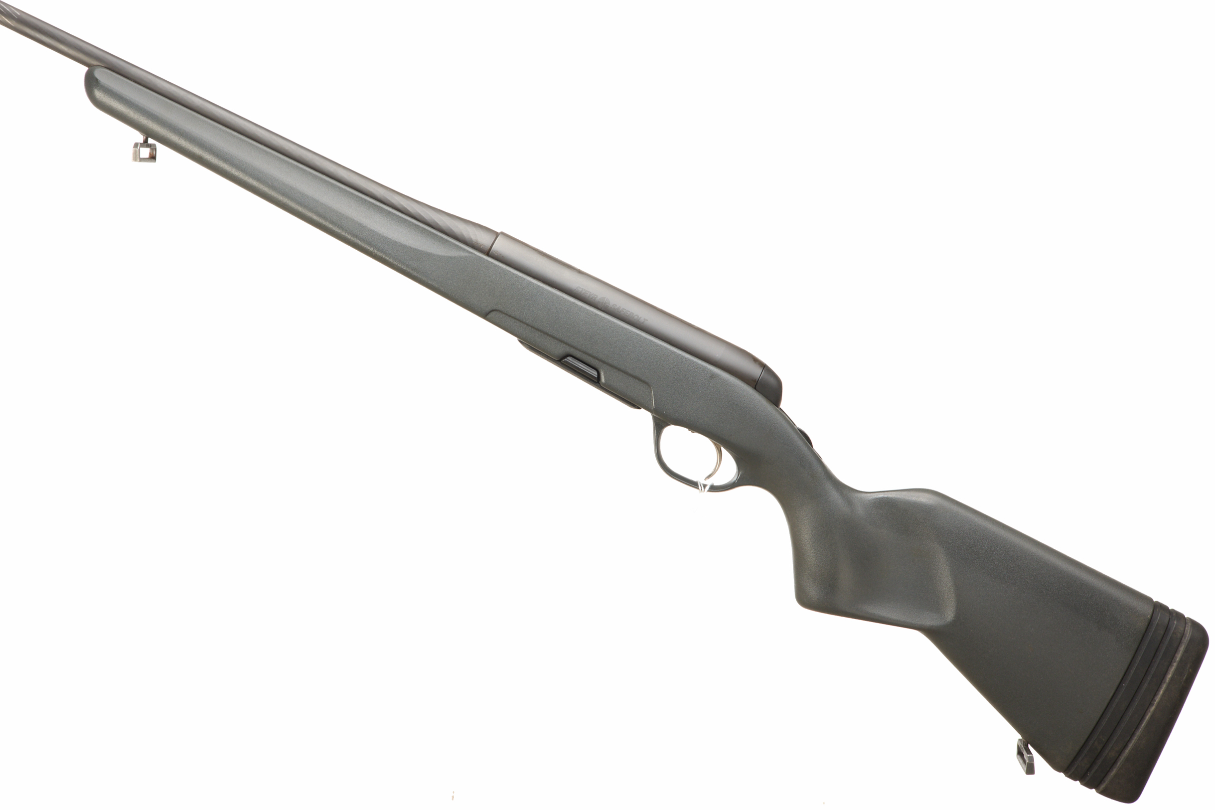 Hard plastic butt pad, unadorned synthetic stock, metal sling swivels, screwcut, unsighted, barley twist fluted barrel. Screw holes for scopes. Detachable magazine, thumb safety.