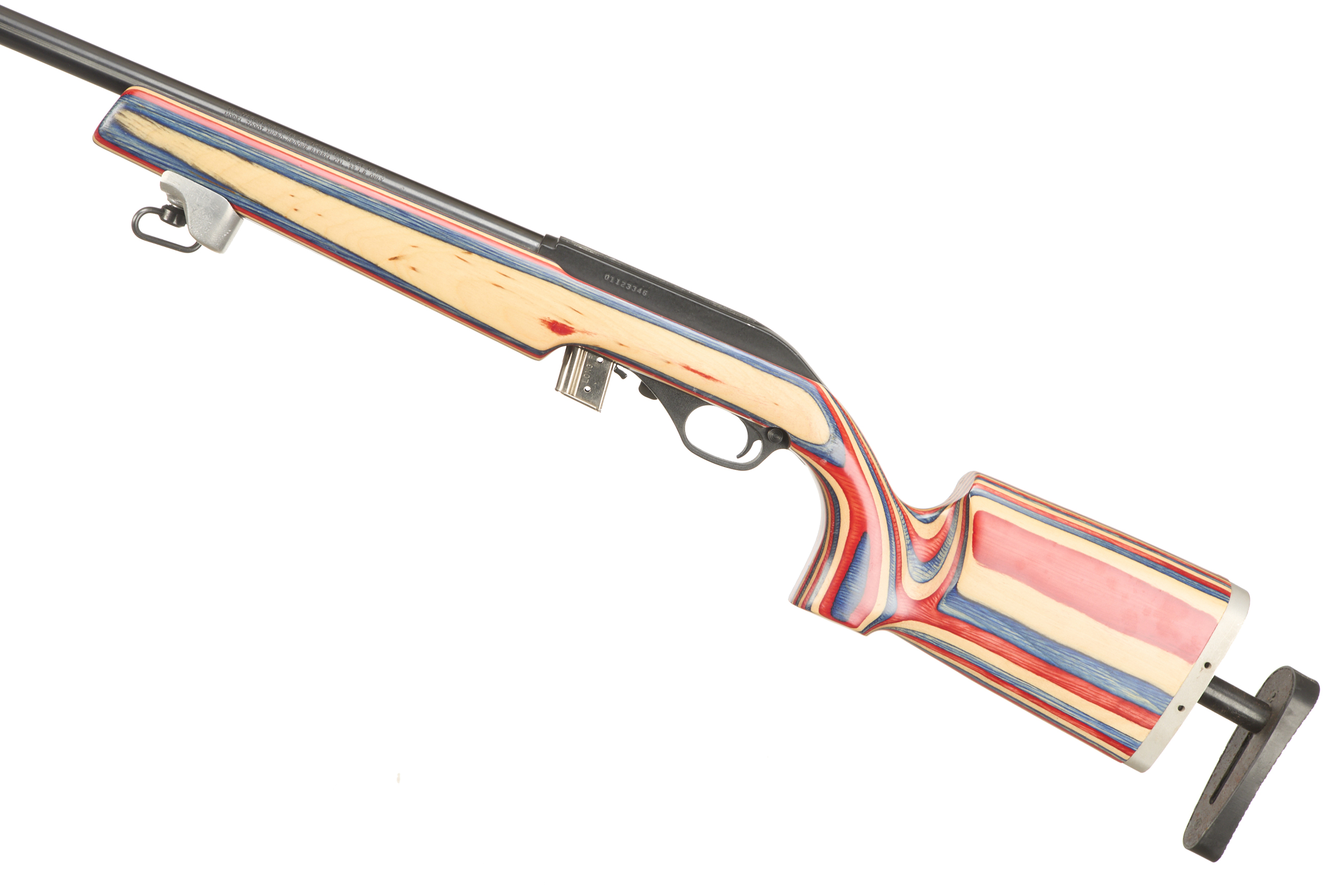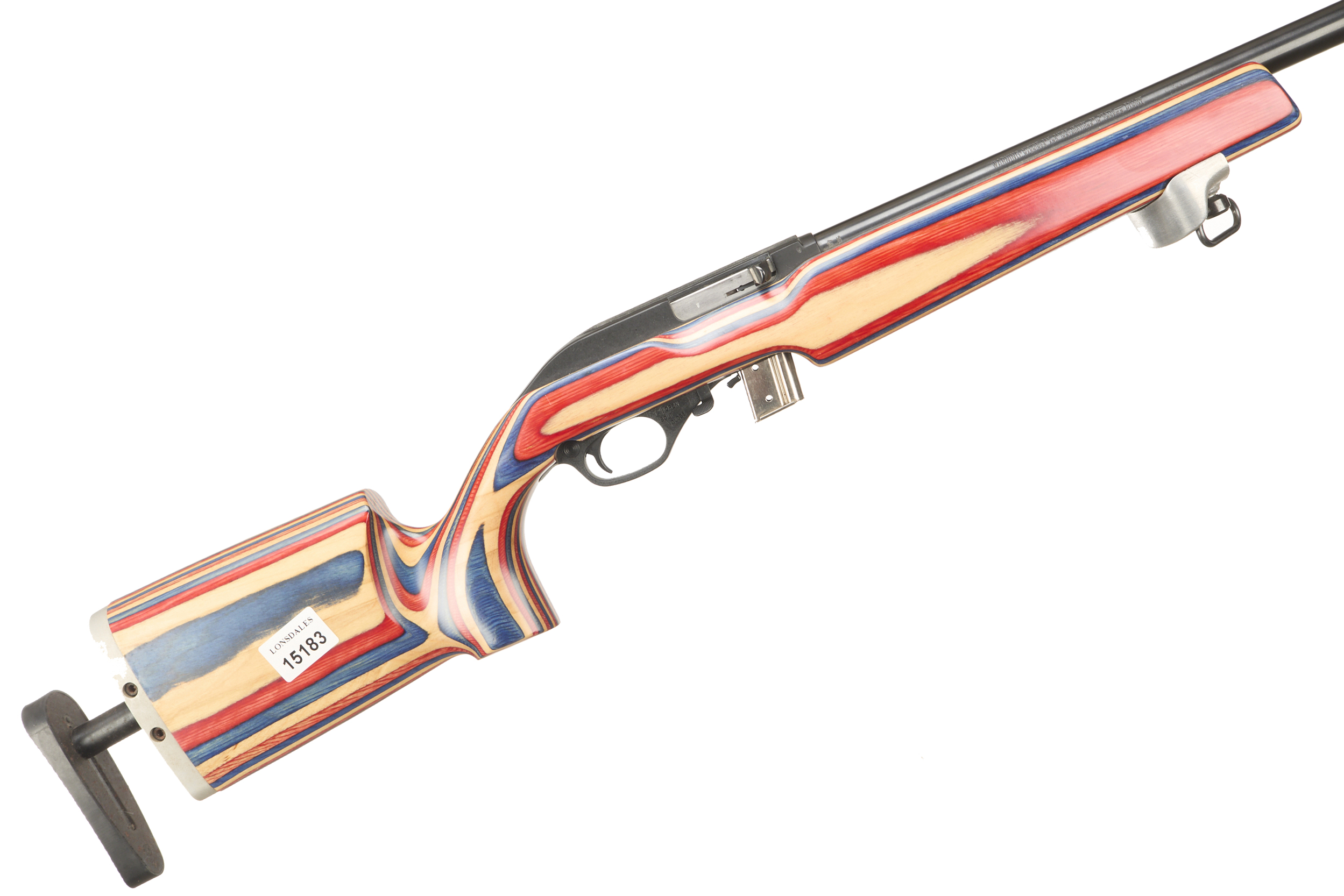 Adjustable butt pad fully-figured target stock with full pistol grip, aluminium rail and hand stop, sling hook, trigger safety.