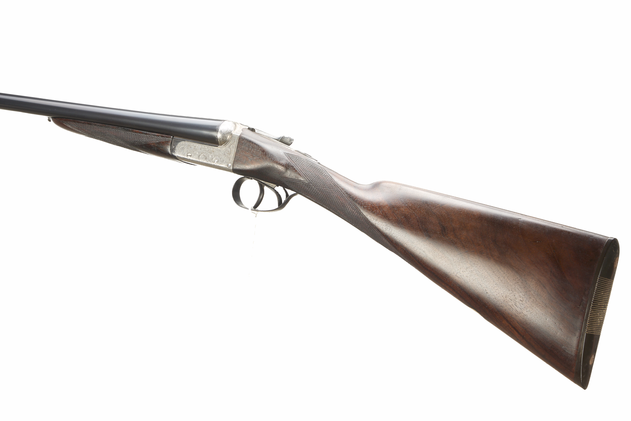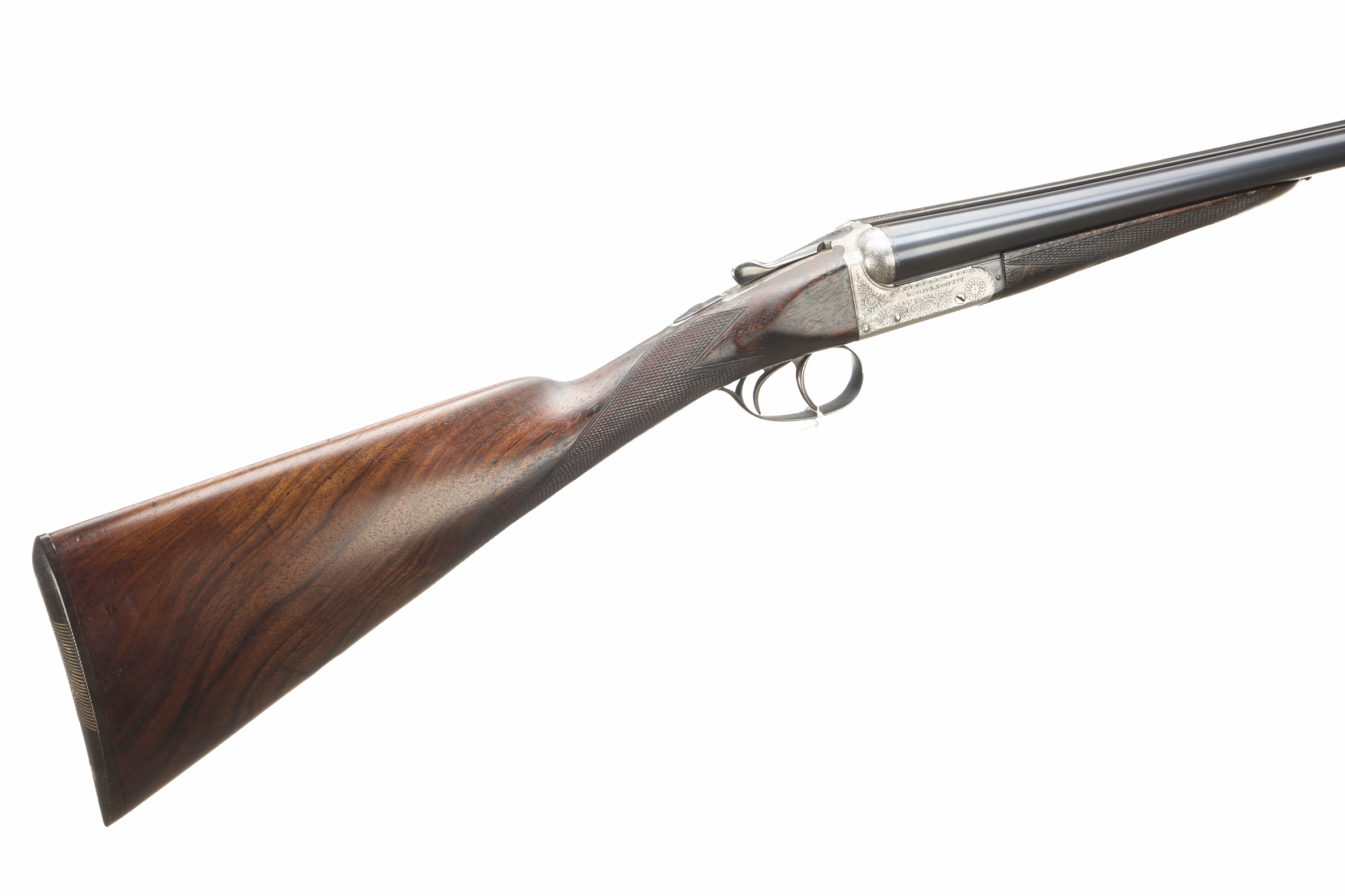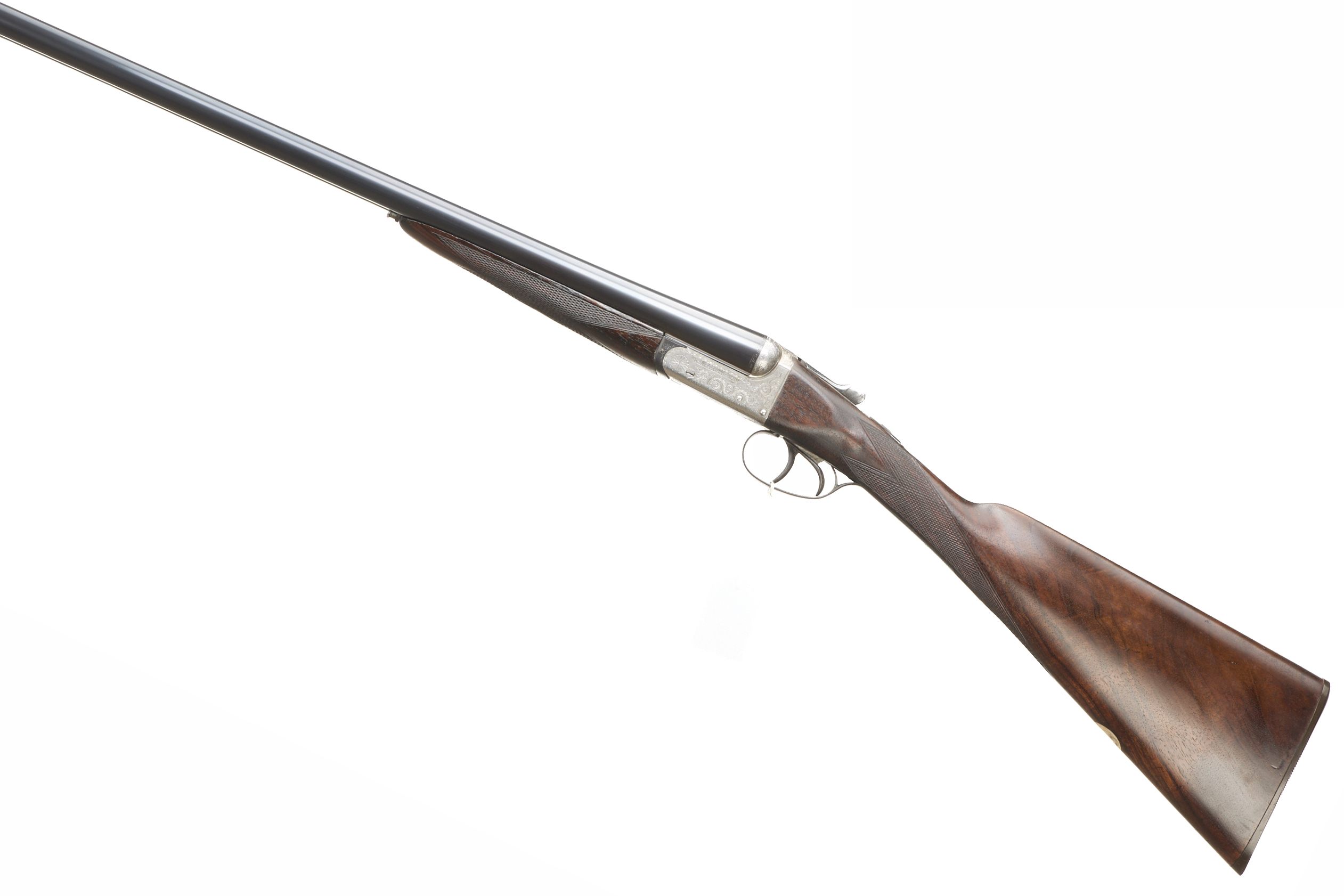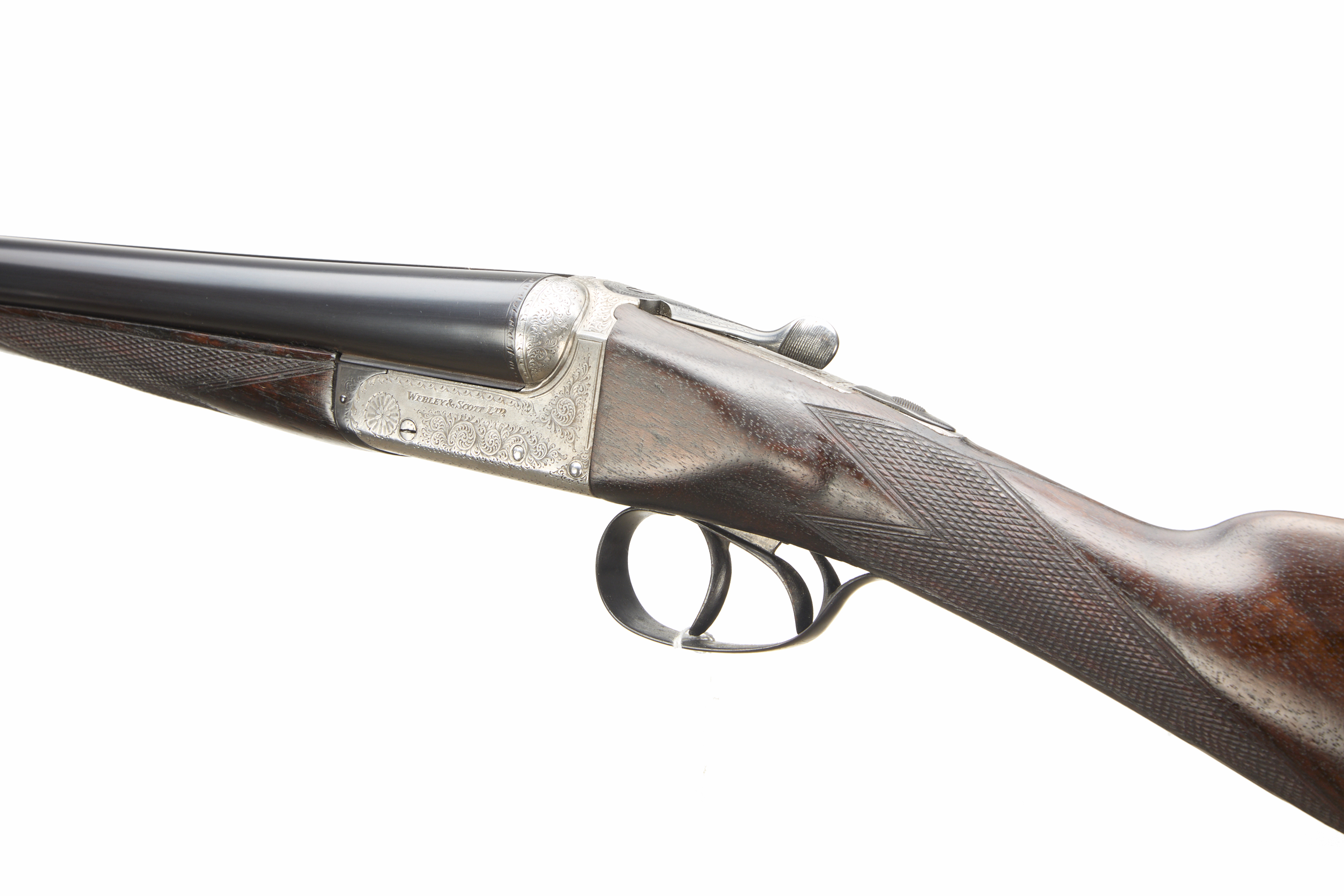 ll-fitting horn butt, chequered straight grip and forend. Tapered rib, the barrels engraved ‘WEBLEY & SCOTT BIRMINGHAM’. Top lever, automatic safety with ‘SAFE’ engraved. The action deeper engraved with bouquets and extensive acanthus scrolling. For 1956.