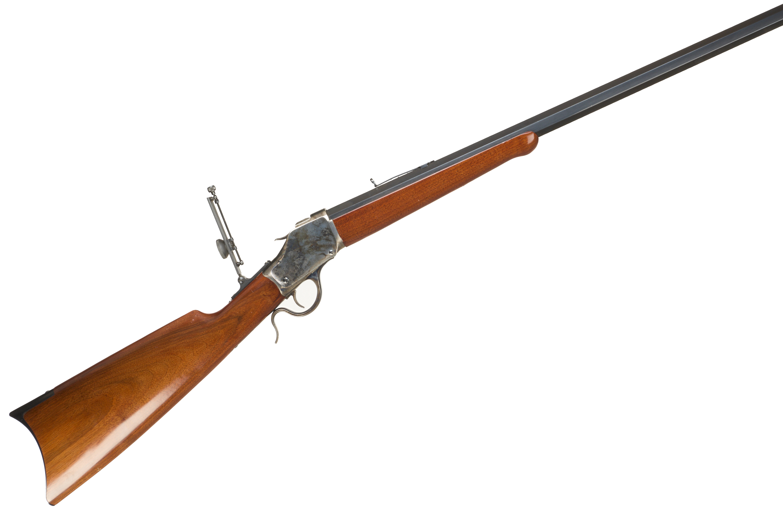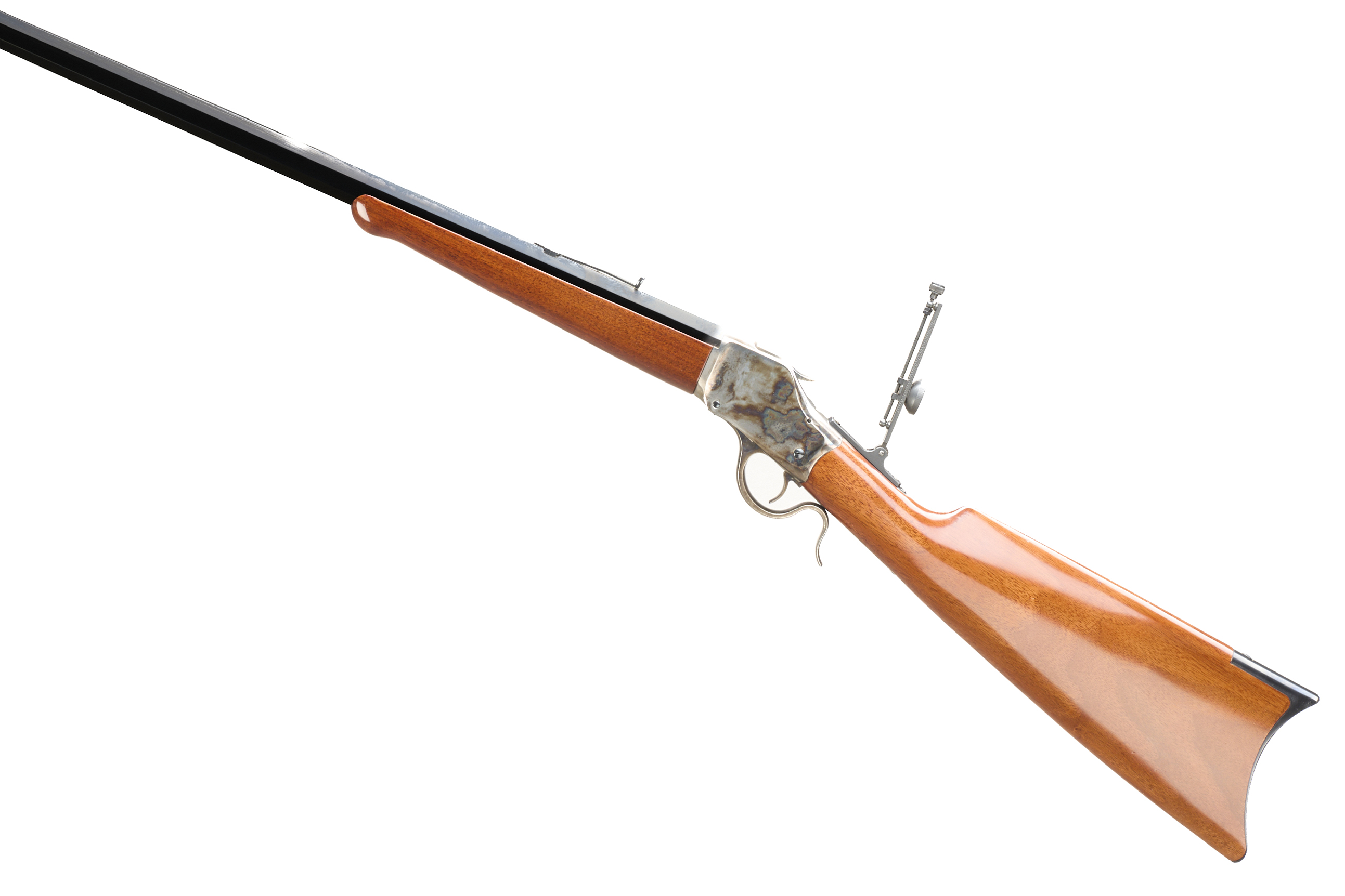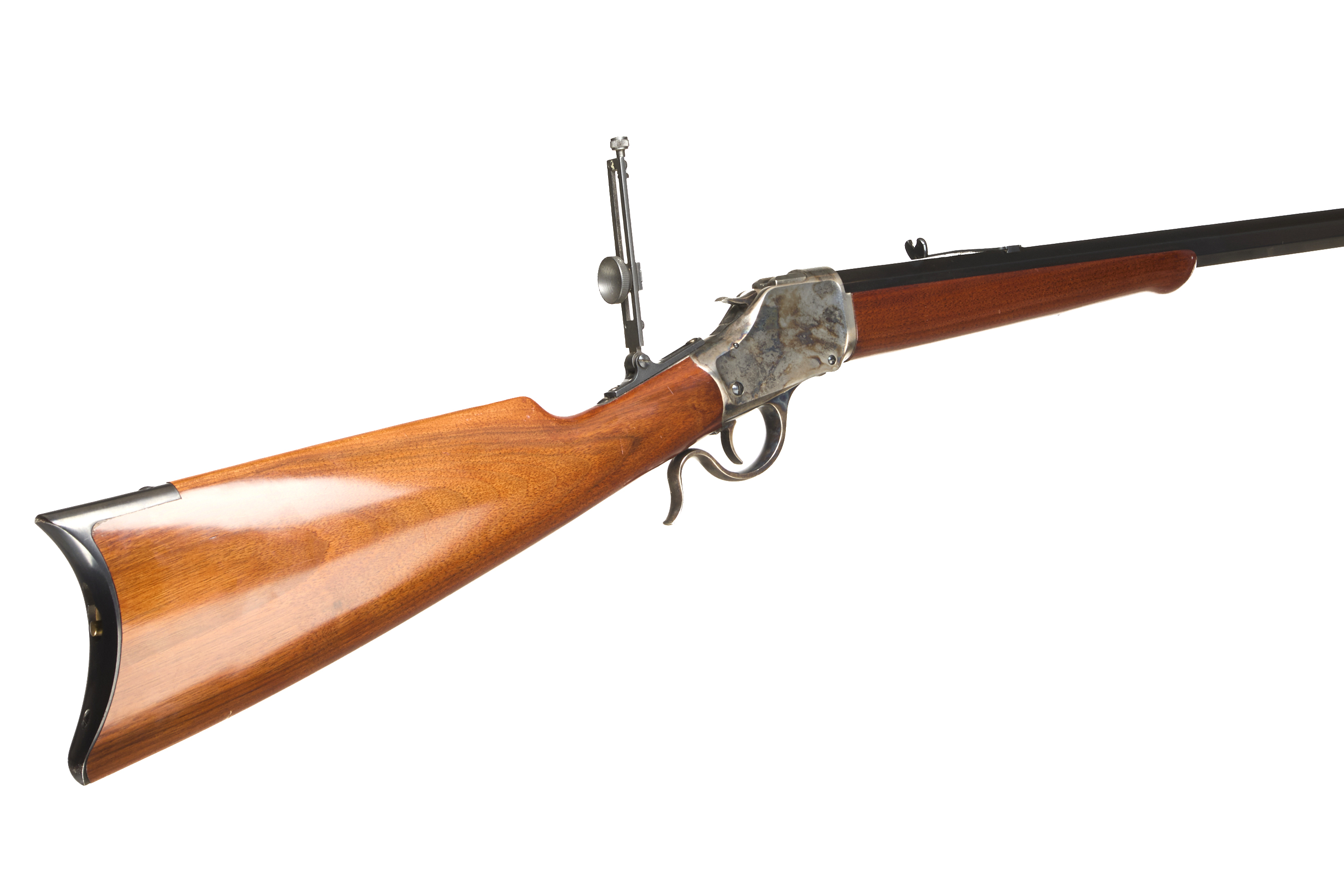 Crescent-shaped, blued butt plate, straight grip, rounded slight Schnabel forend. Hexagonal barrels, Tunnel foresight, buckhorn rearsight (adjuster absent), tang-mounted dioptre rearsight. Full colour hardened body and lever, falling block.