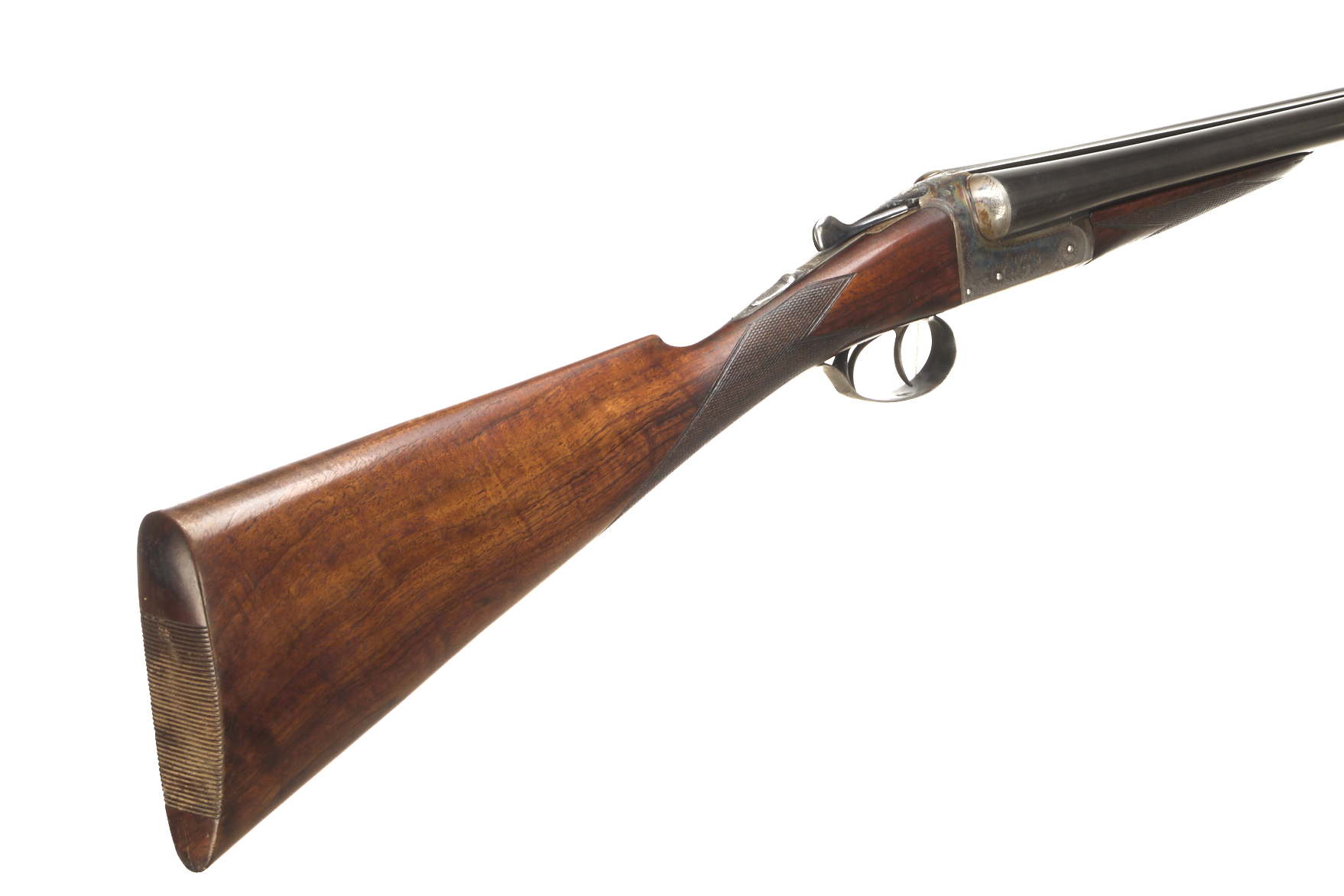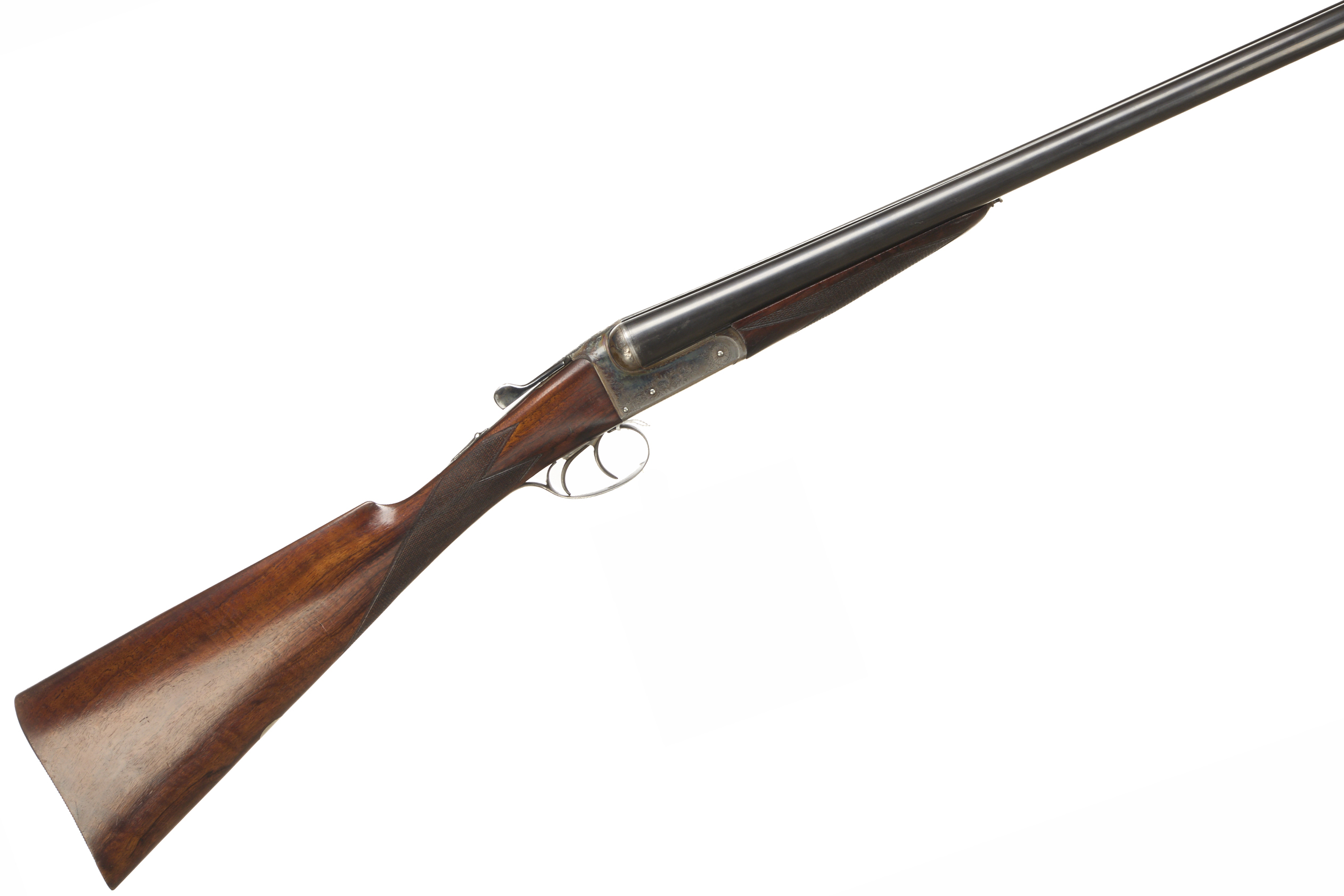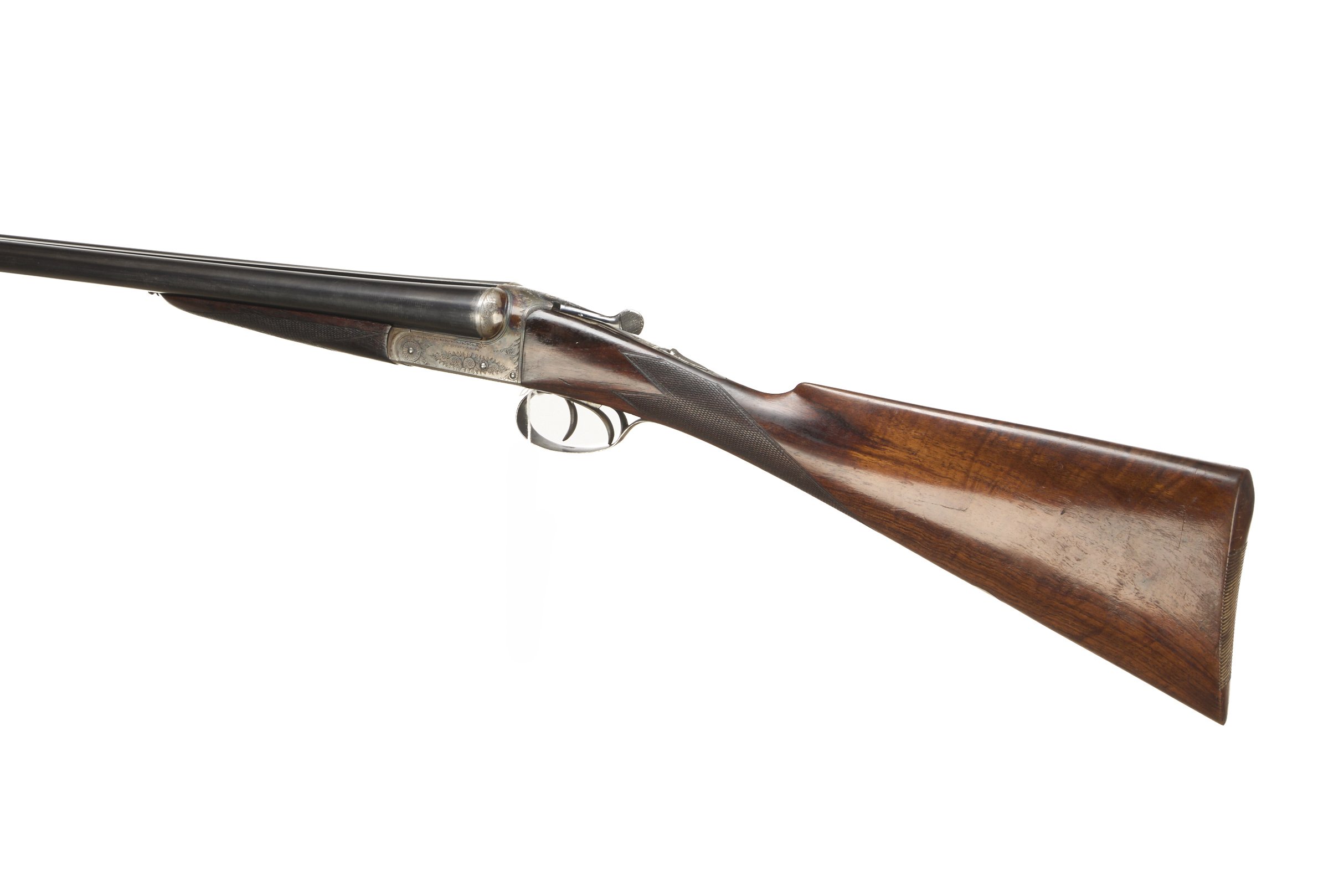 Ribbed butt, chequered straight grip and forend. Rib engraved ‘C. JEFFREY & SONS DORCHESTER’. Top lever, automatic safety with ‘SAFE’. The action engraved with acanthus scrolling. Trigger guard tang replaced – different serial number.