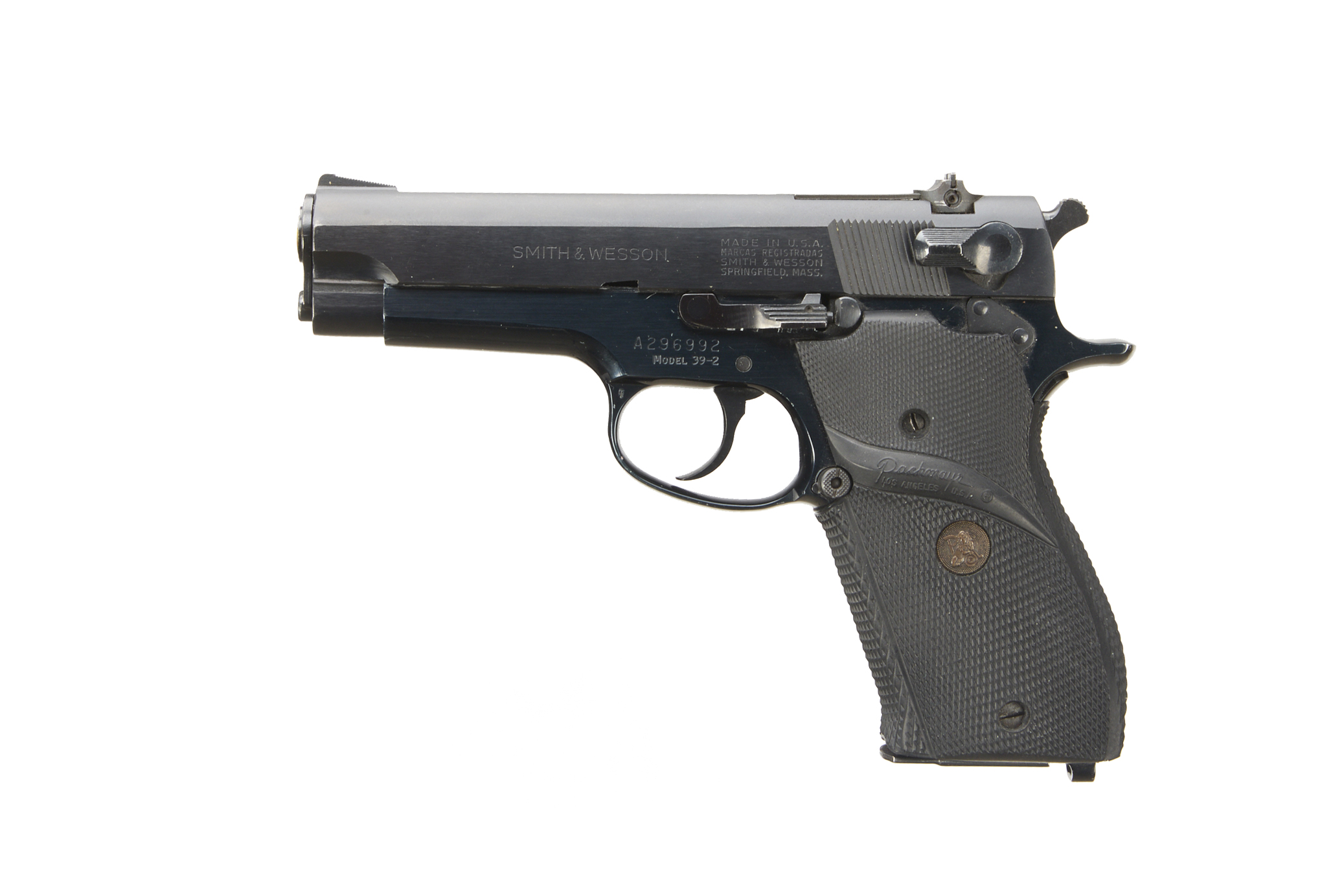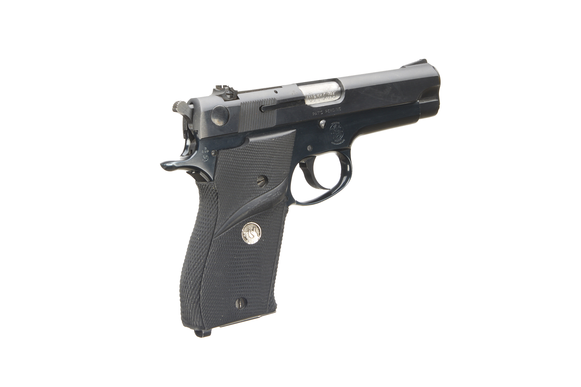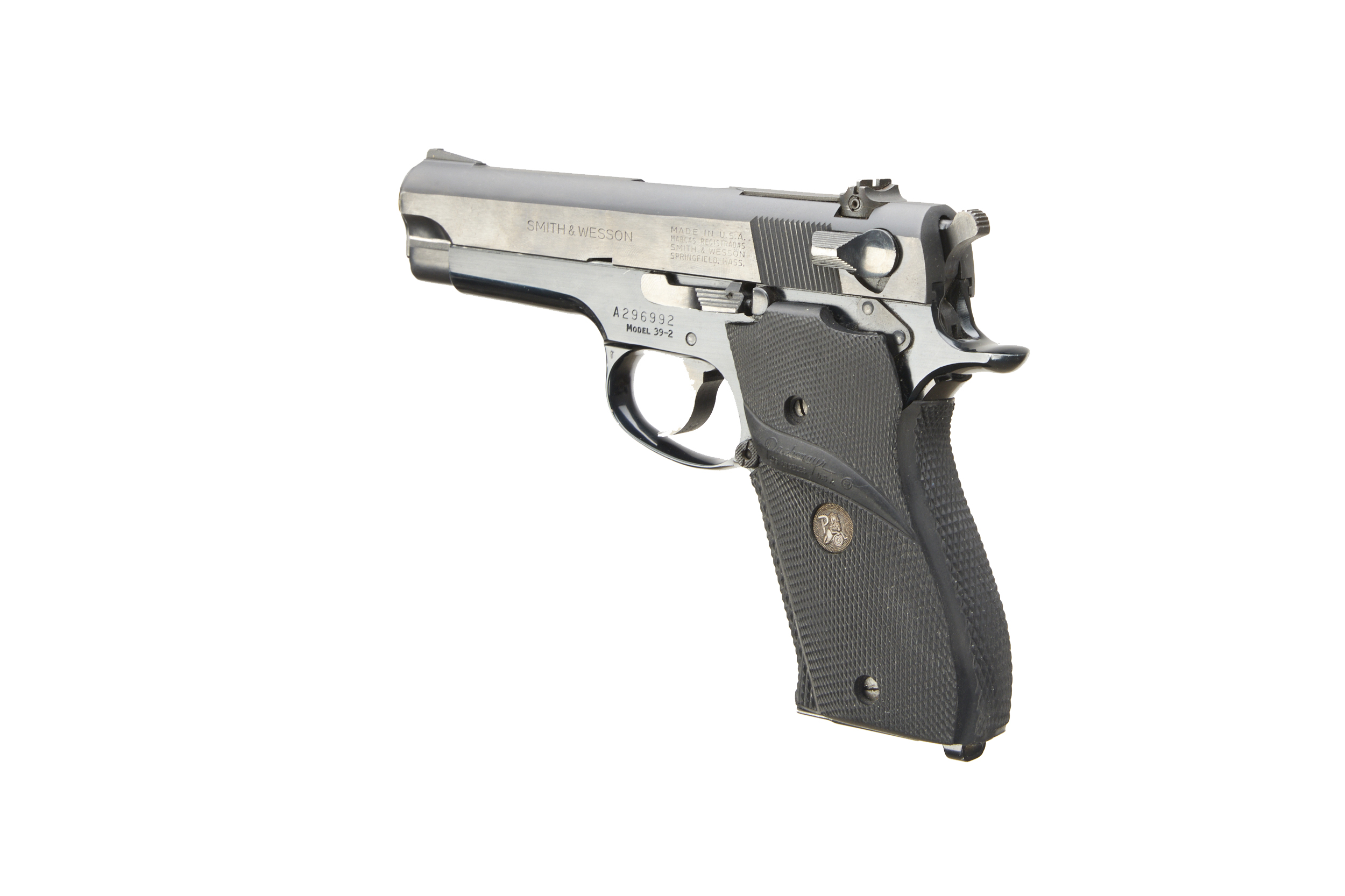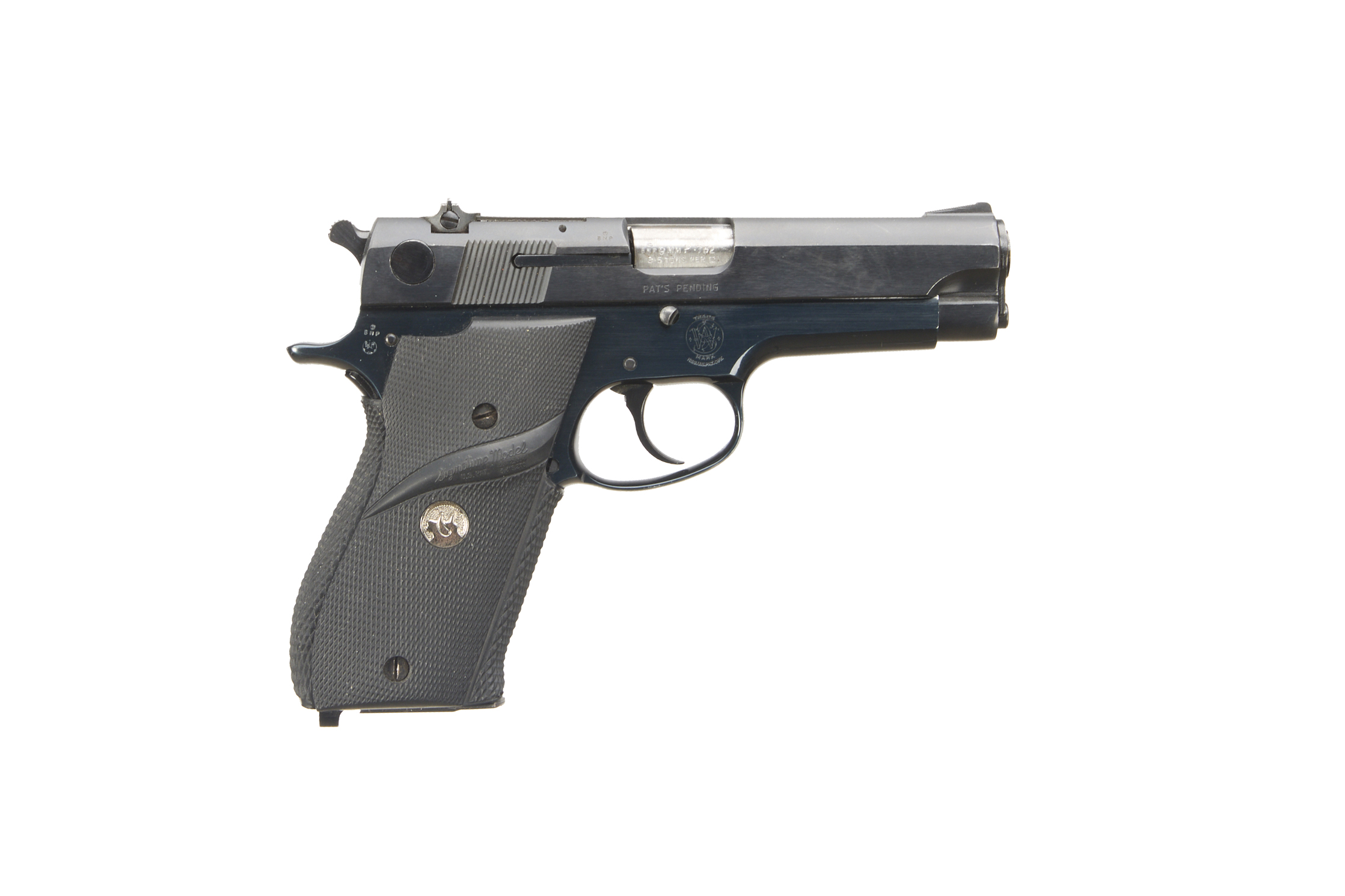 Chequered, plastic pachmeyer grips blued frame and slide, 2 7/8" barrel, ramped post foresight adjustable rearsight, magazine.