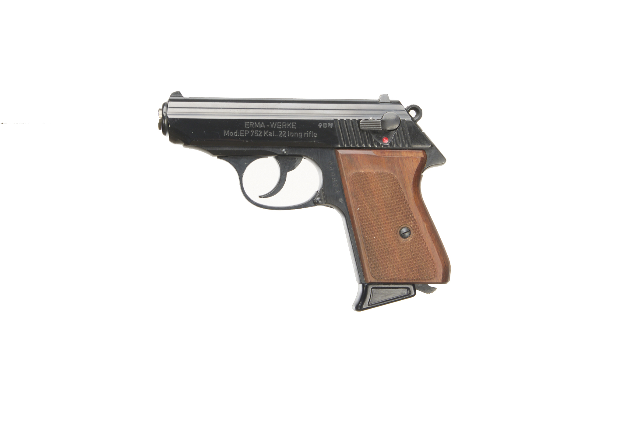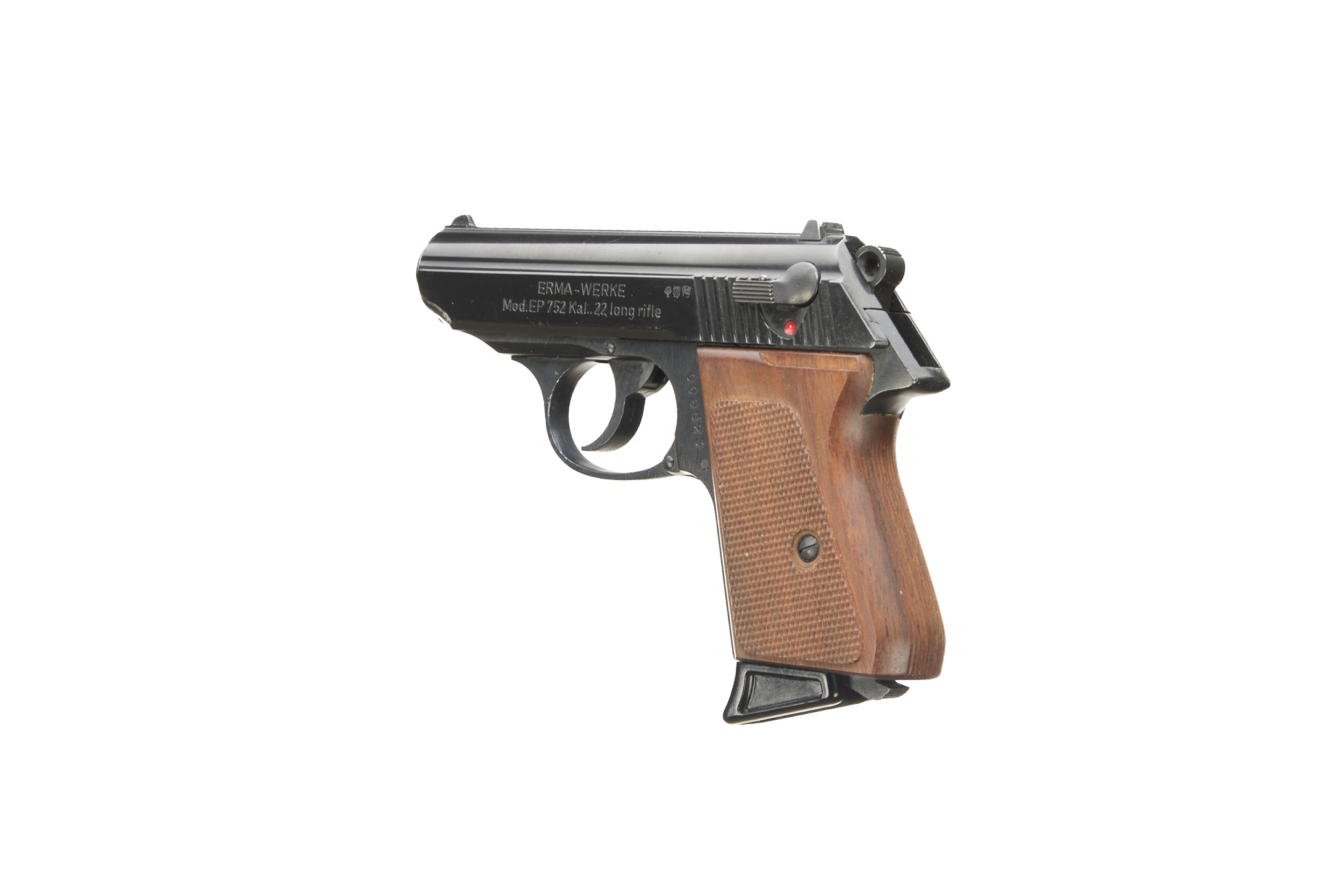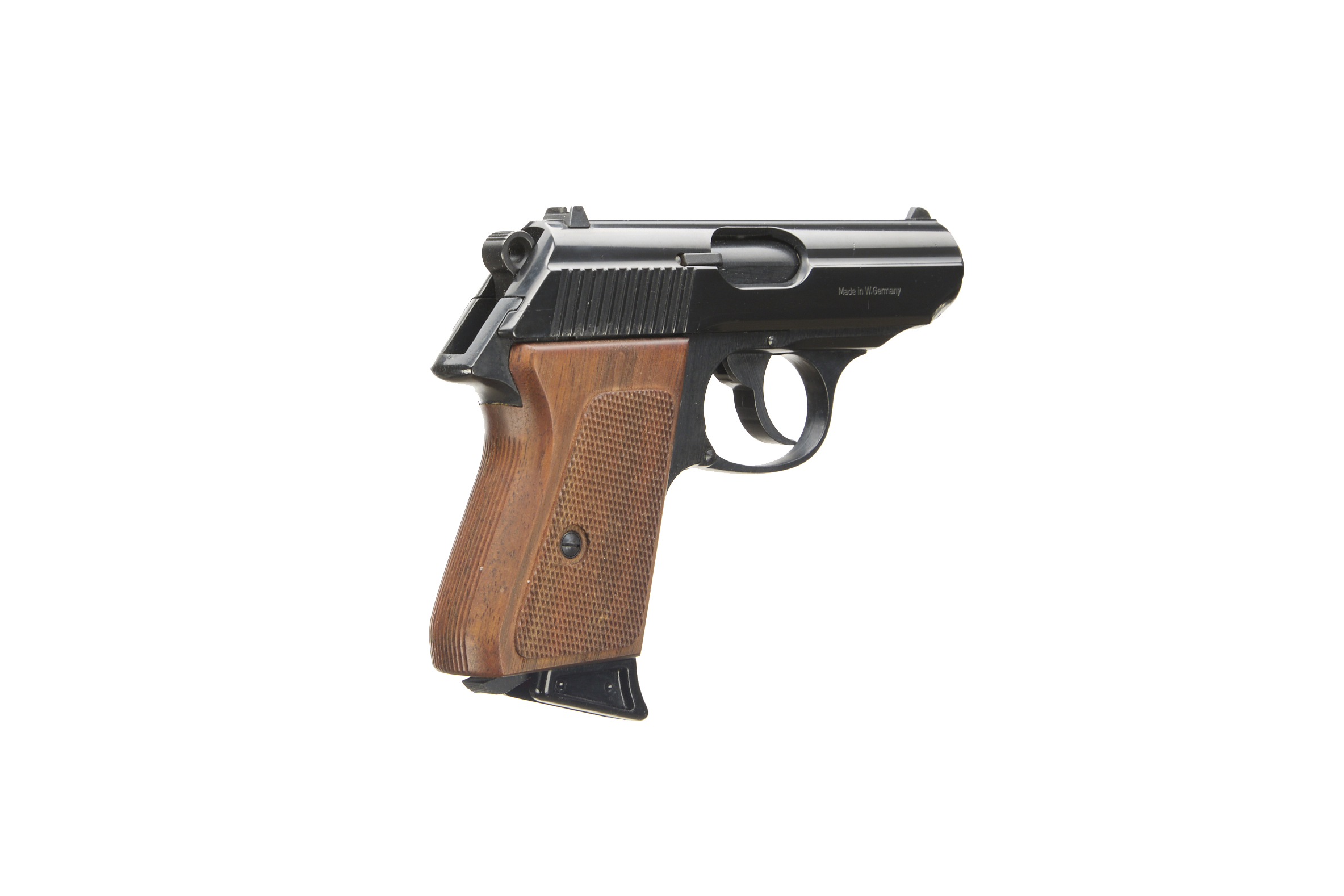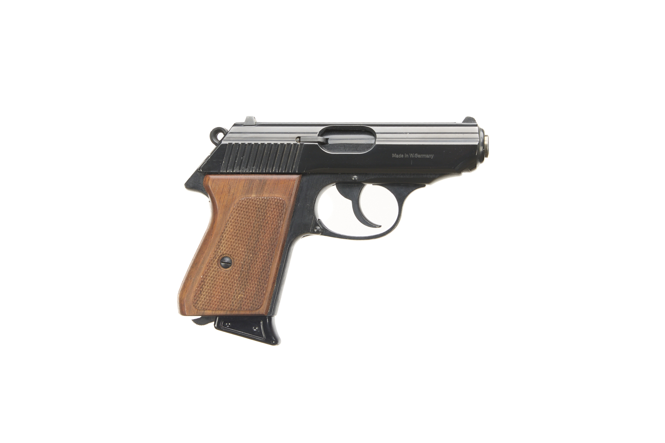 Chequered, wood grips blued frame and slide, 3 1/4" barrel, magazine with finger grip extension.