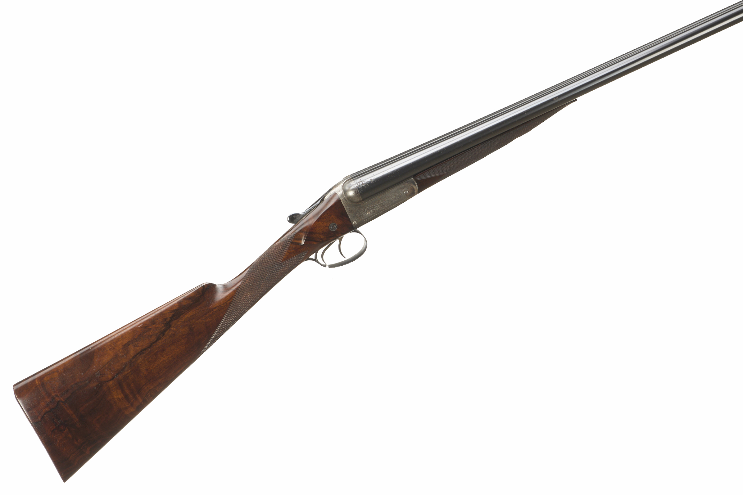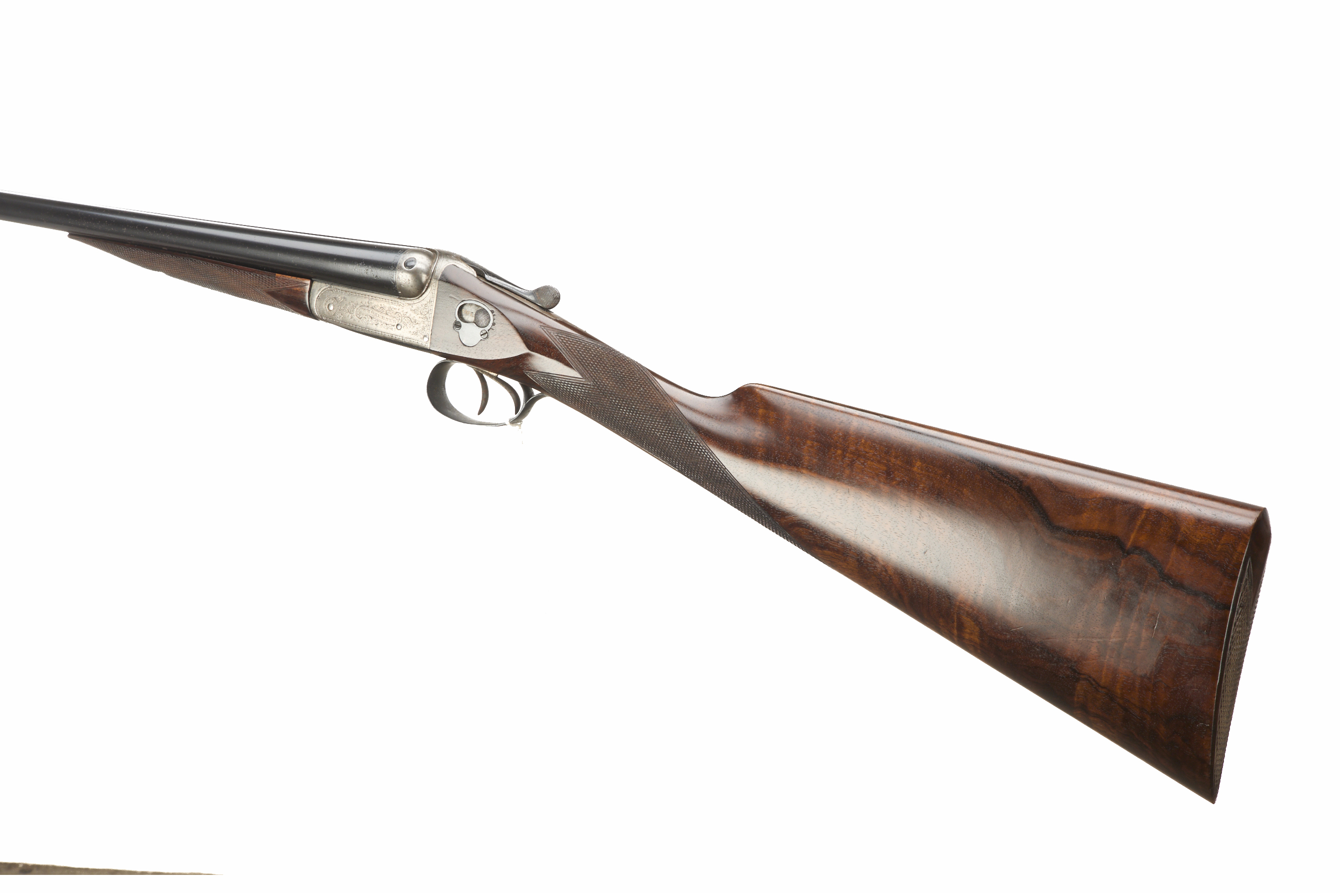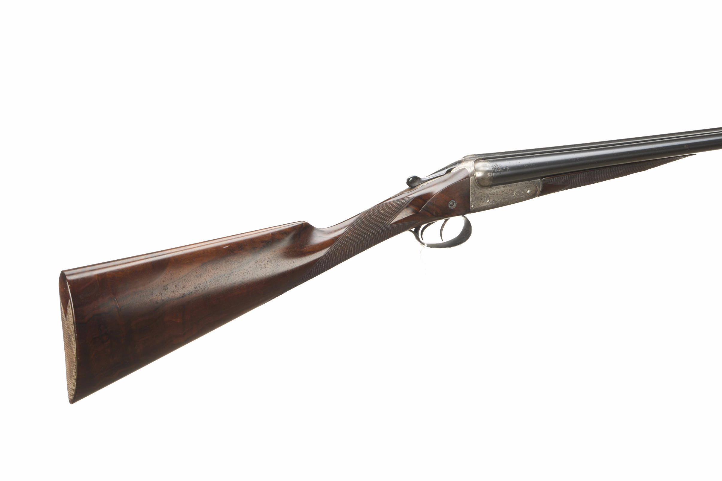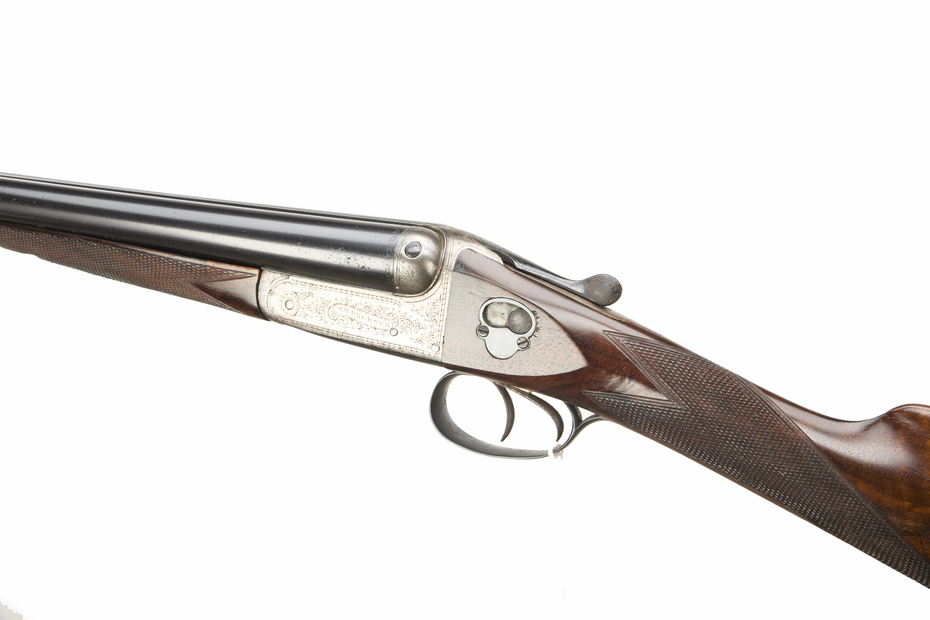 Chequered butt, chequered straight grip and forend. Tapered rib engraved ‘WW GREENER MAKER etc’. Treble grip action, top lever, thumb safety. The action engraved with bouquets and extensive acanthus scrolling.