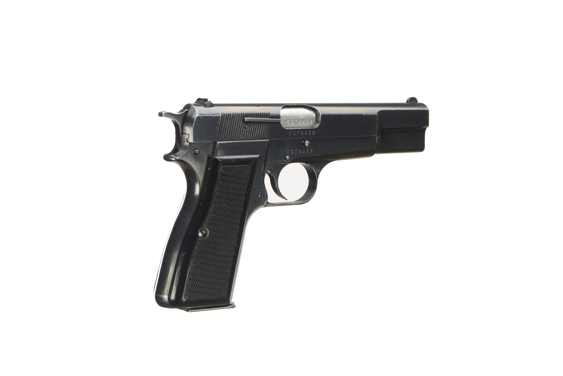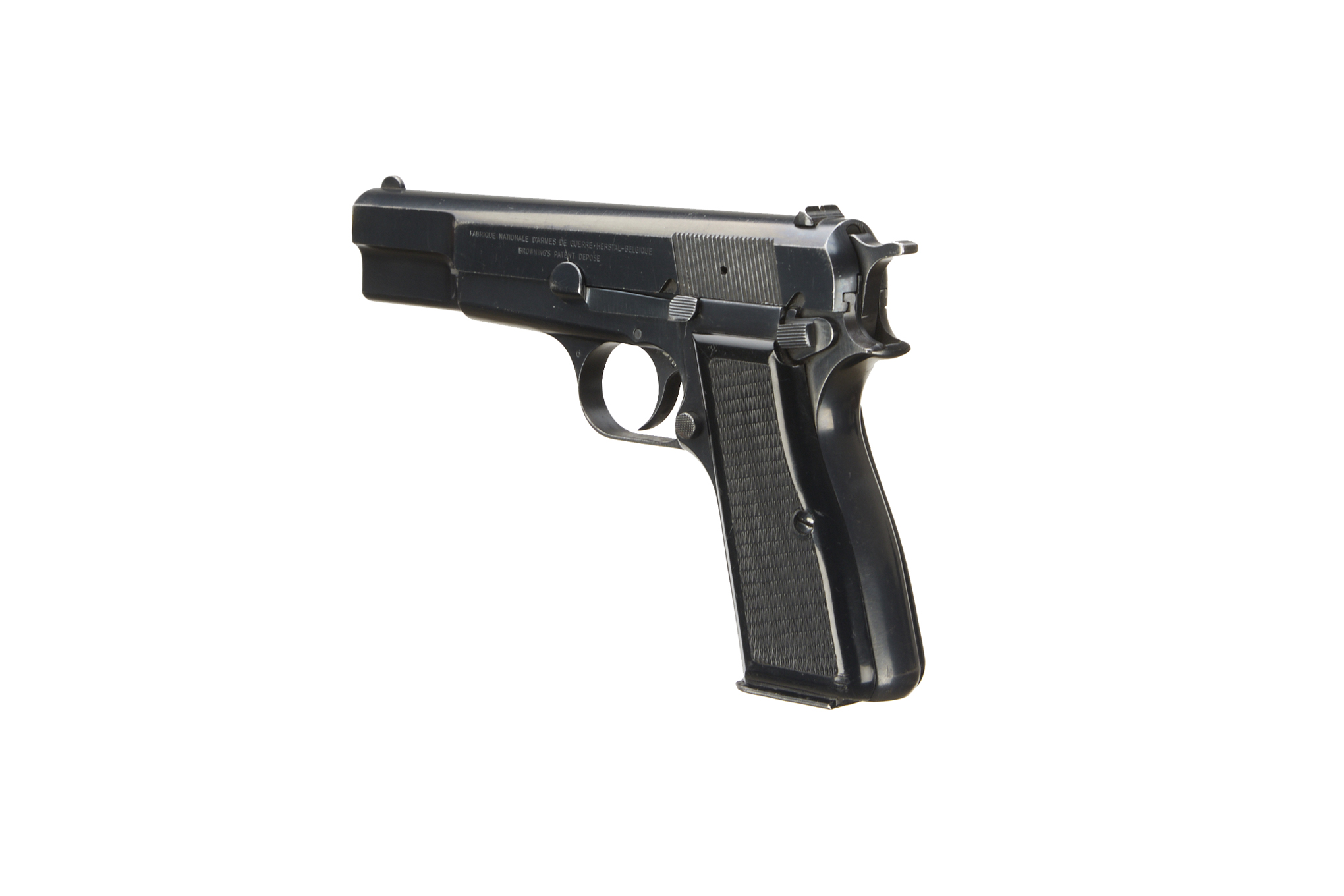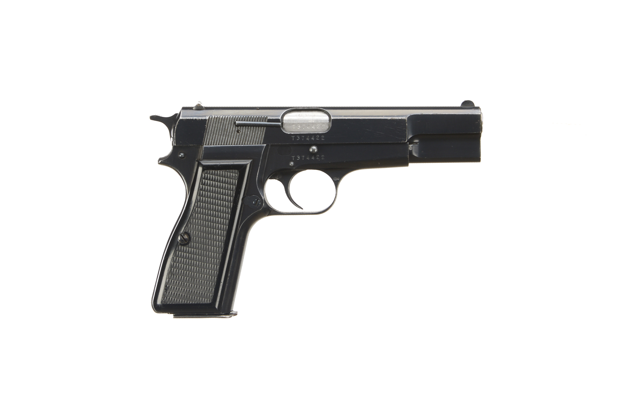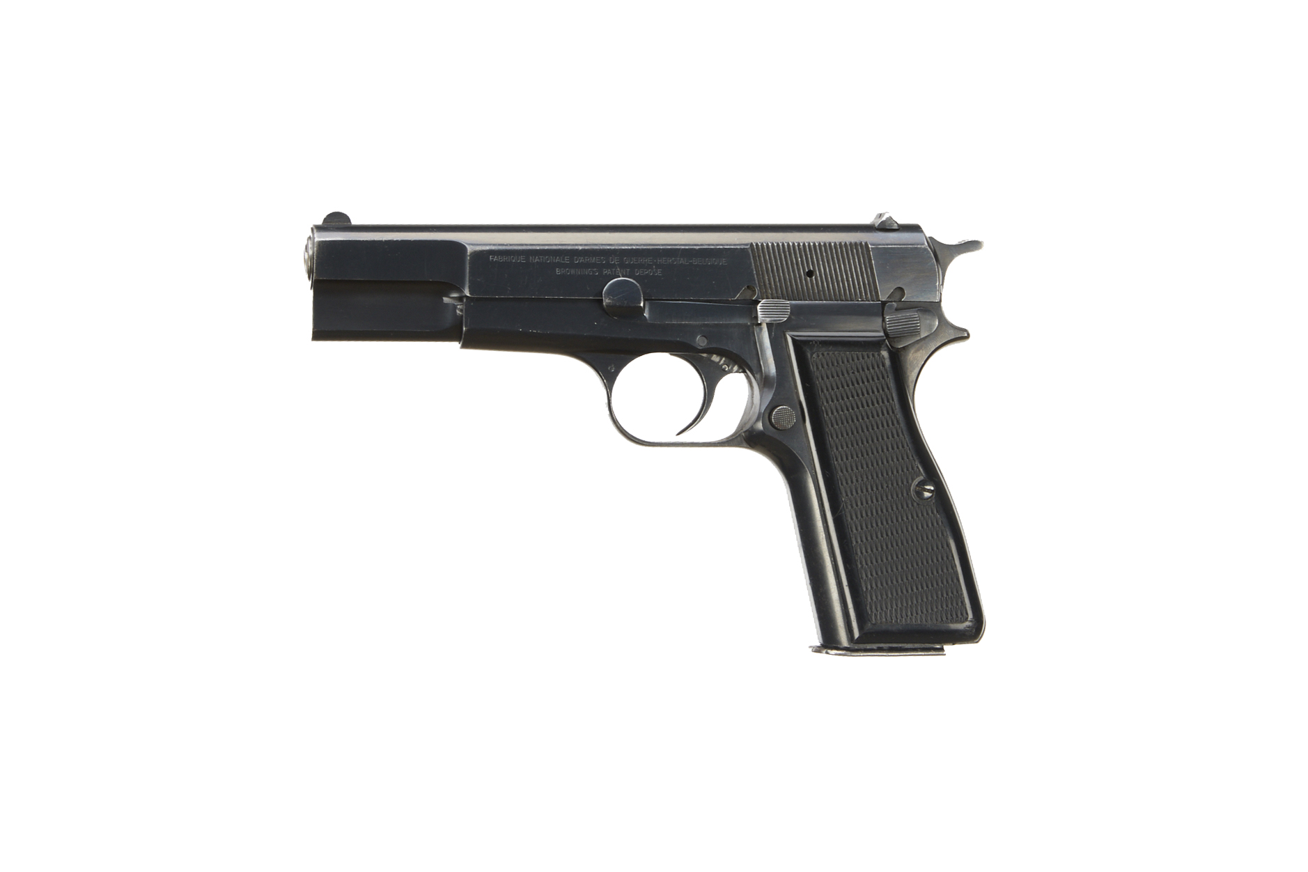 Chequered, plastic grips blued frame and slide engraved ‘FABRIQUE NATIONALE etc’ , 3 1/2" barrel, post foresight notched rearsight, magazine.