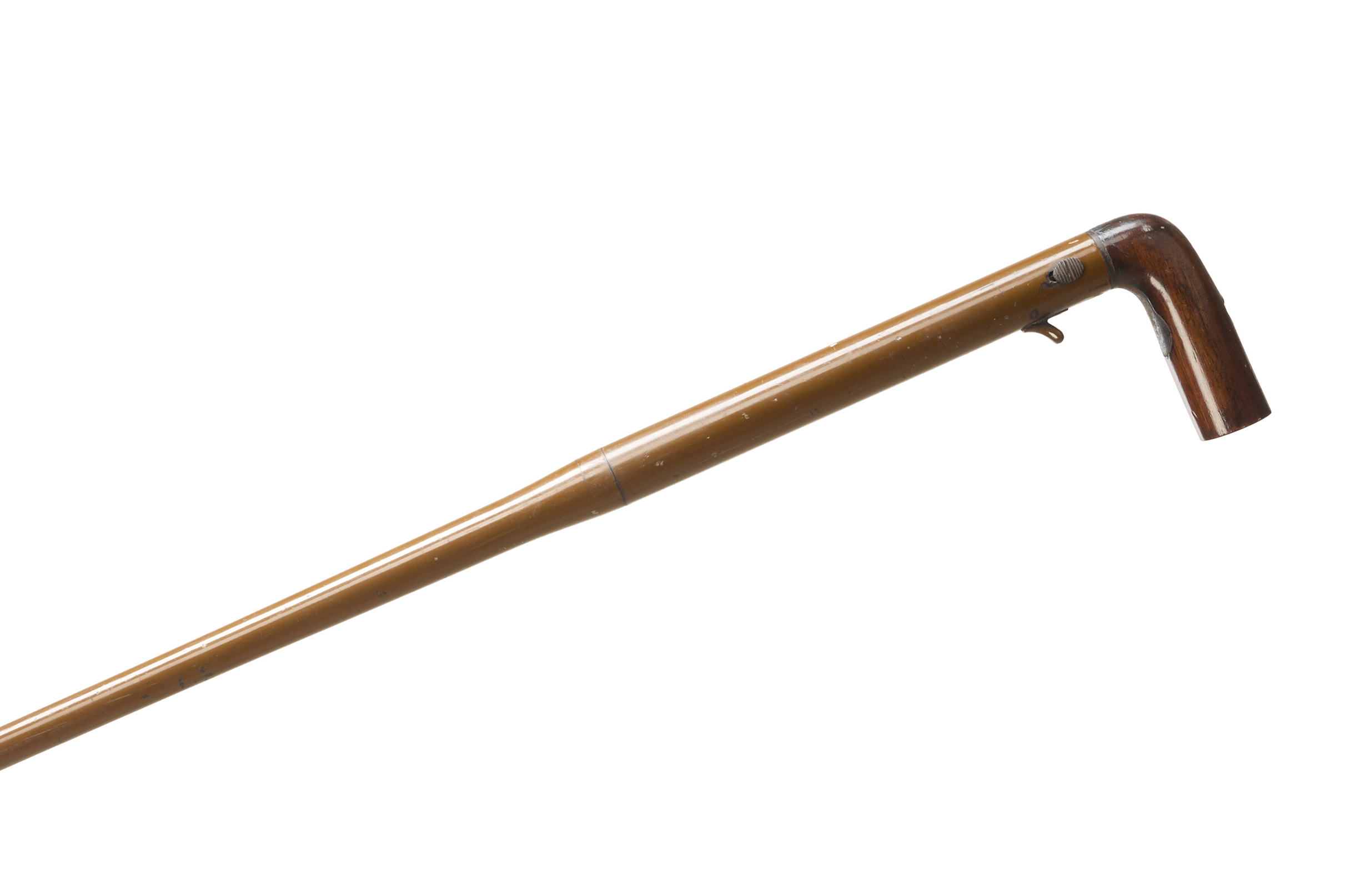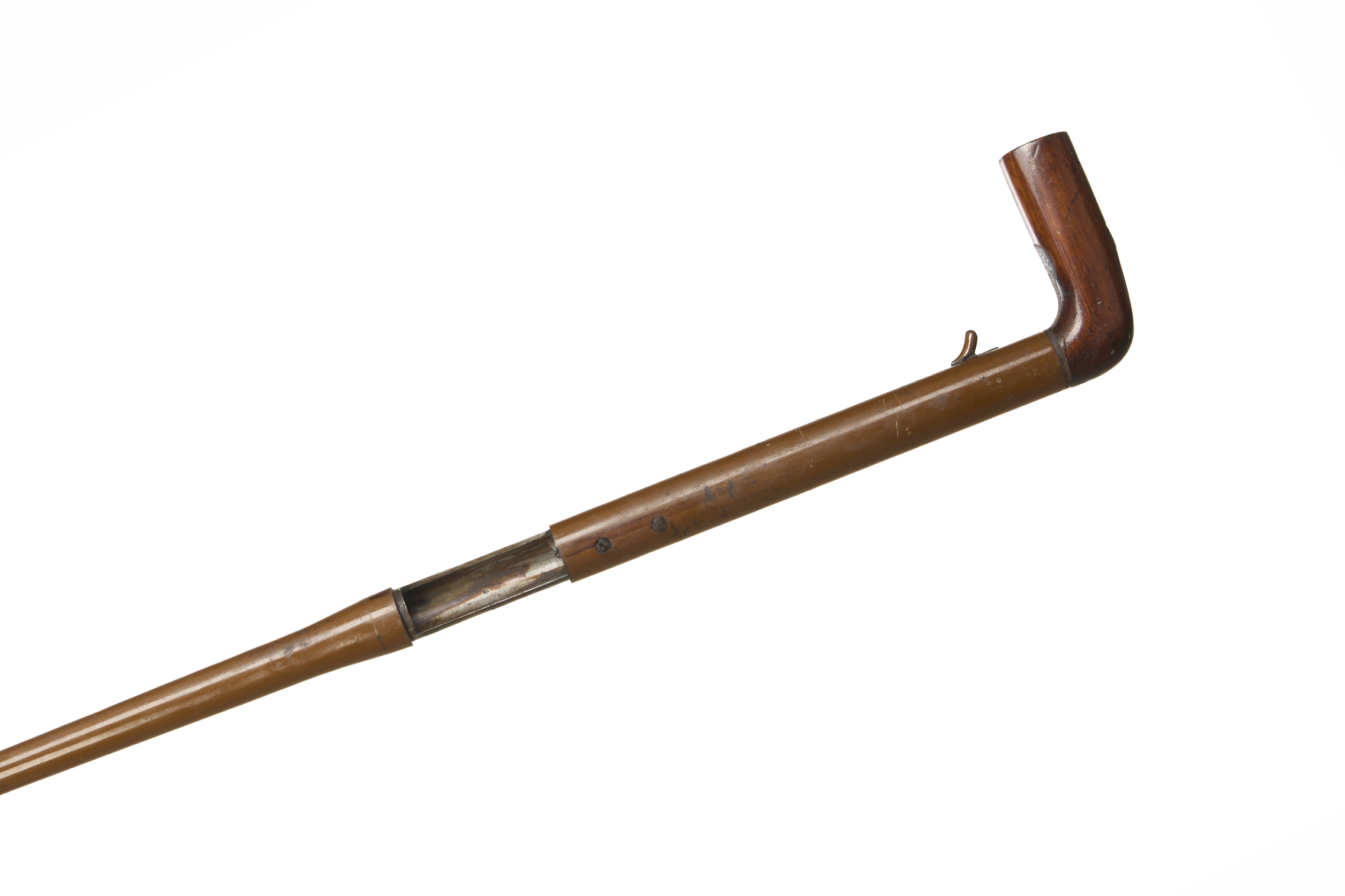 Walnut handle with socket for extension, twist and pull action, thumb safety, trigger. 2” chamber. Enamel coating to 25” barrel.