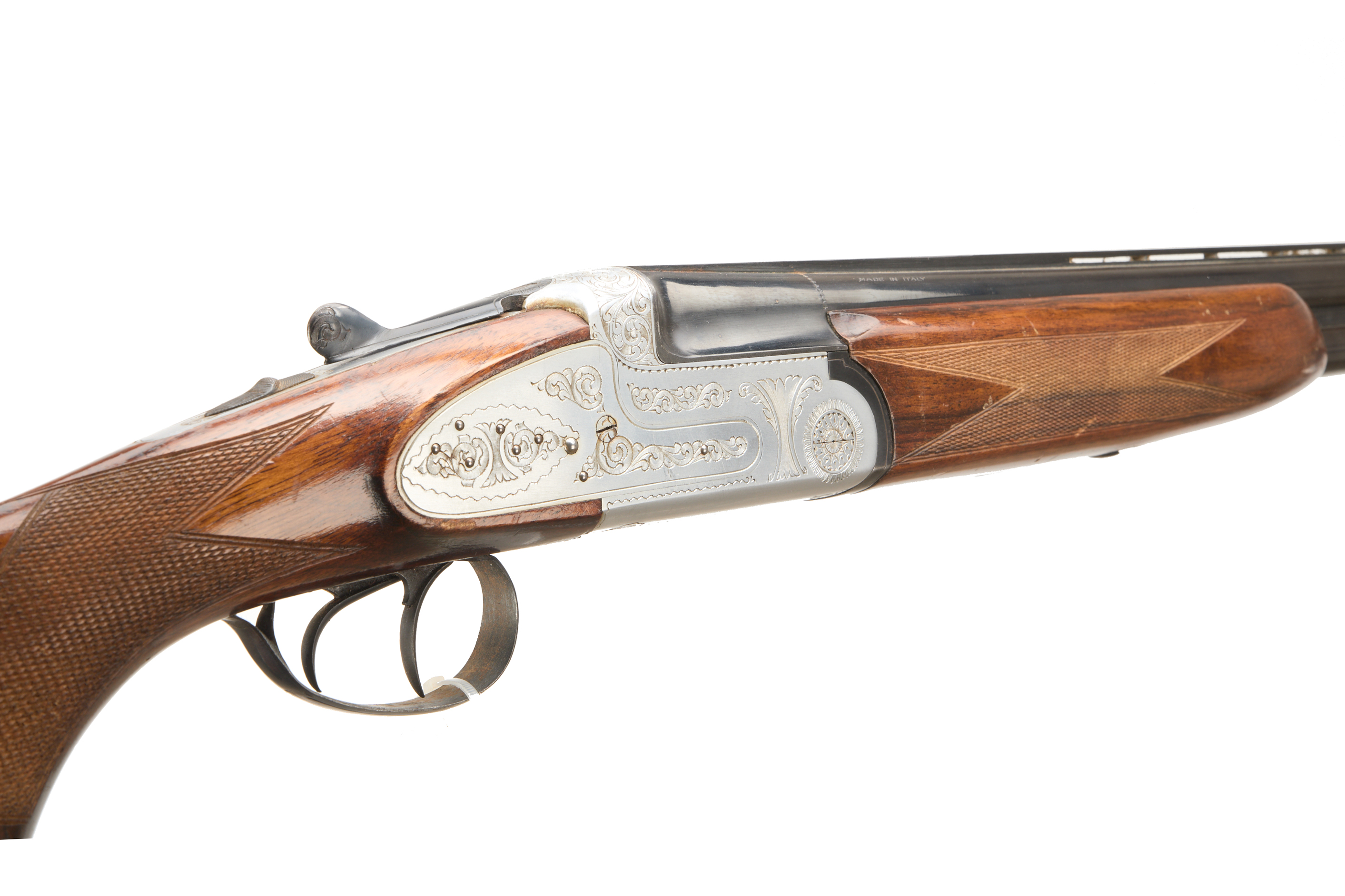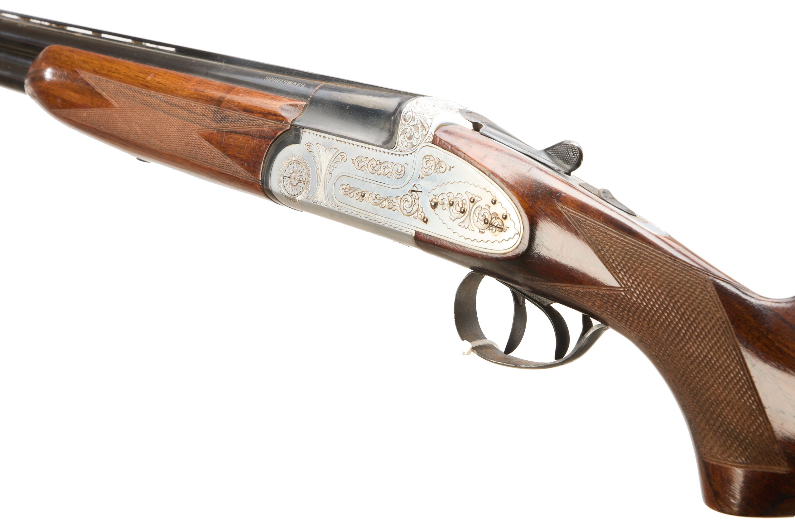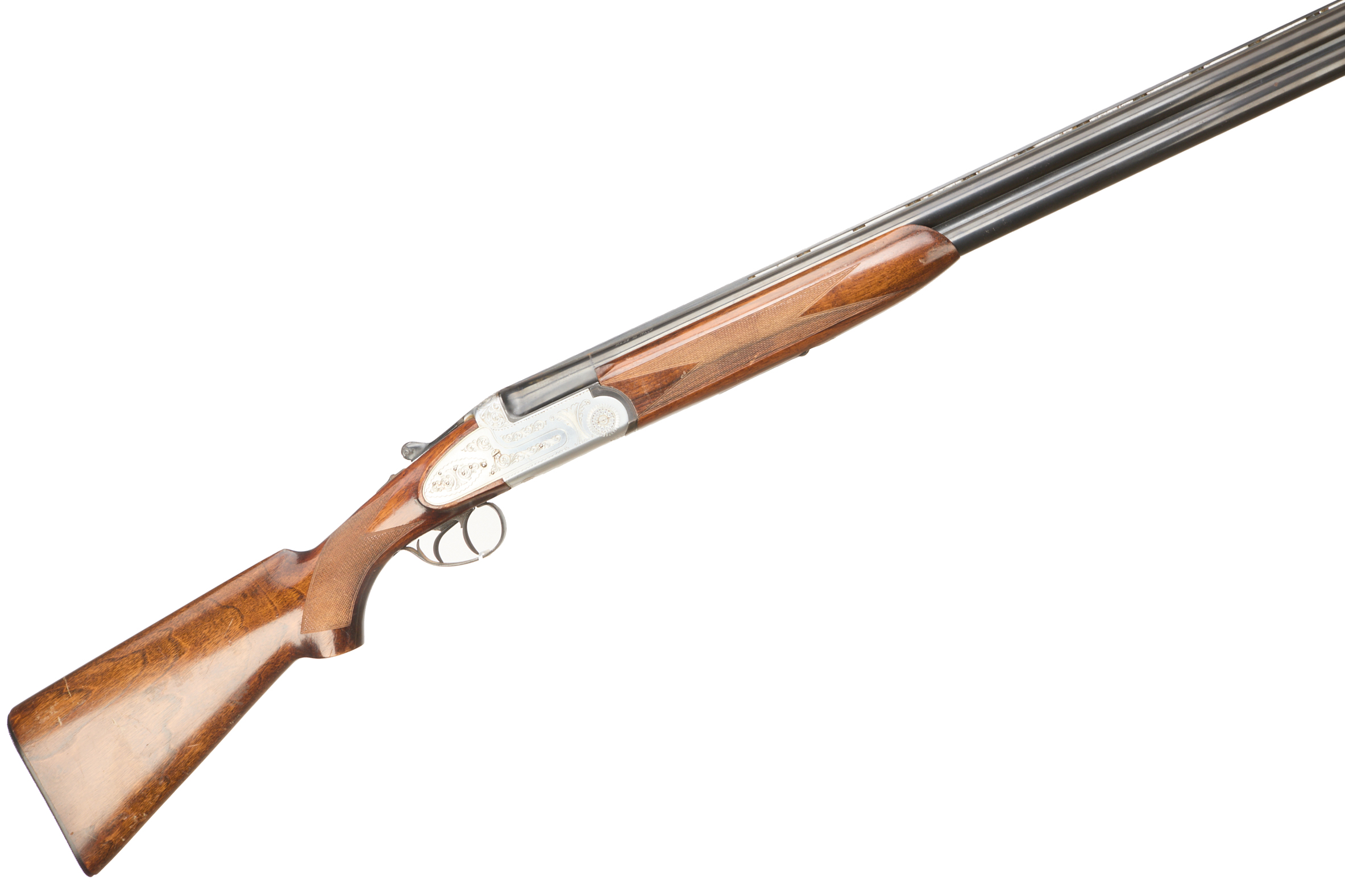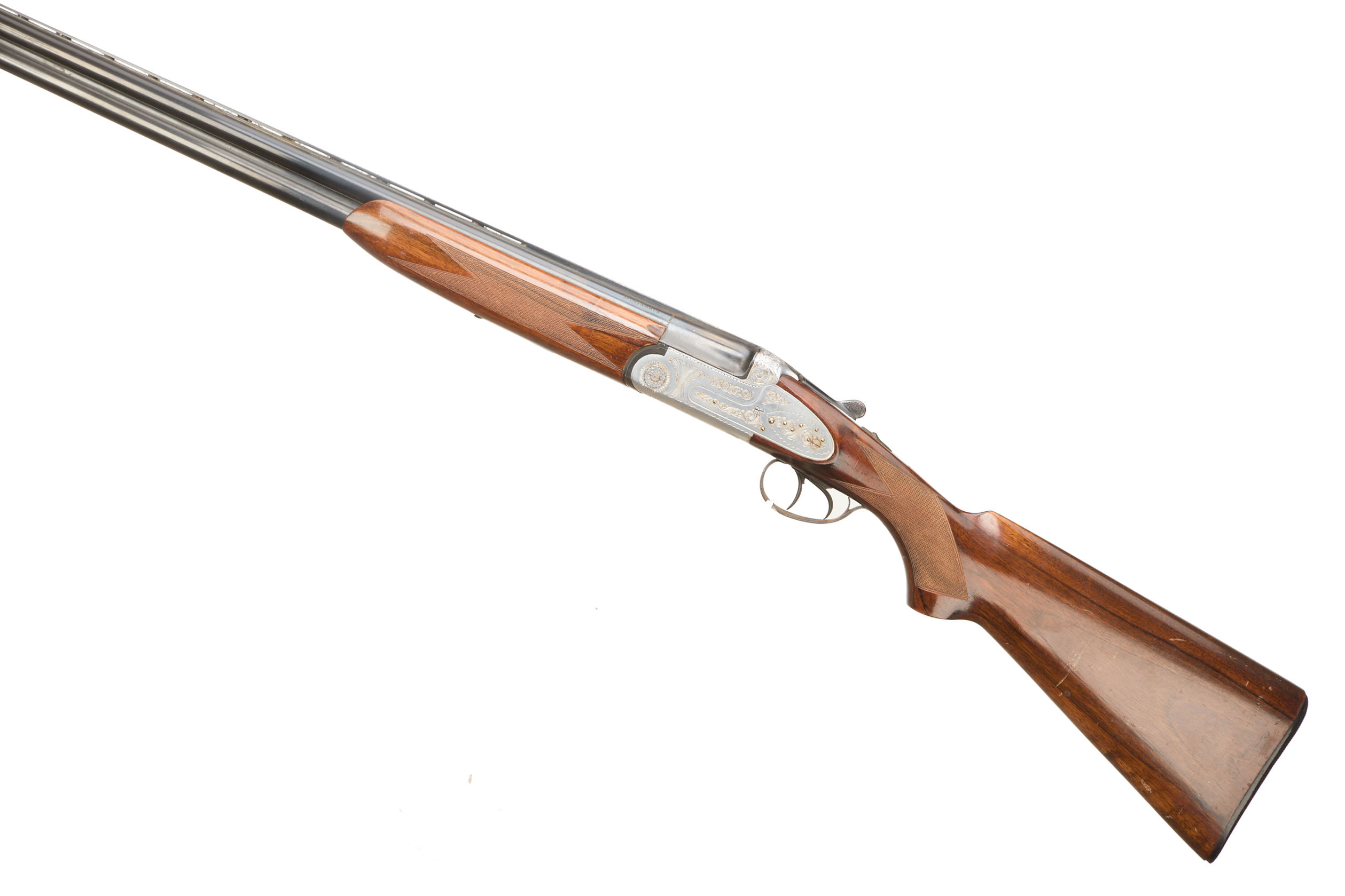 Plastic butt pad, chequered full-pistol grip and forend, ventilated top rib. Acanthus scrolls to action. Double trigger and safety.