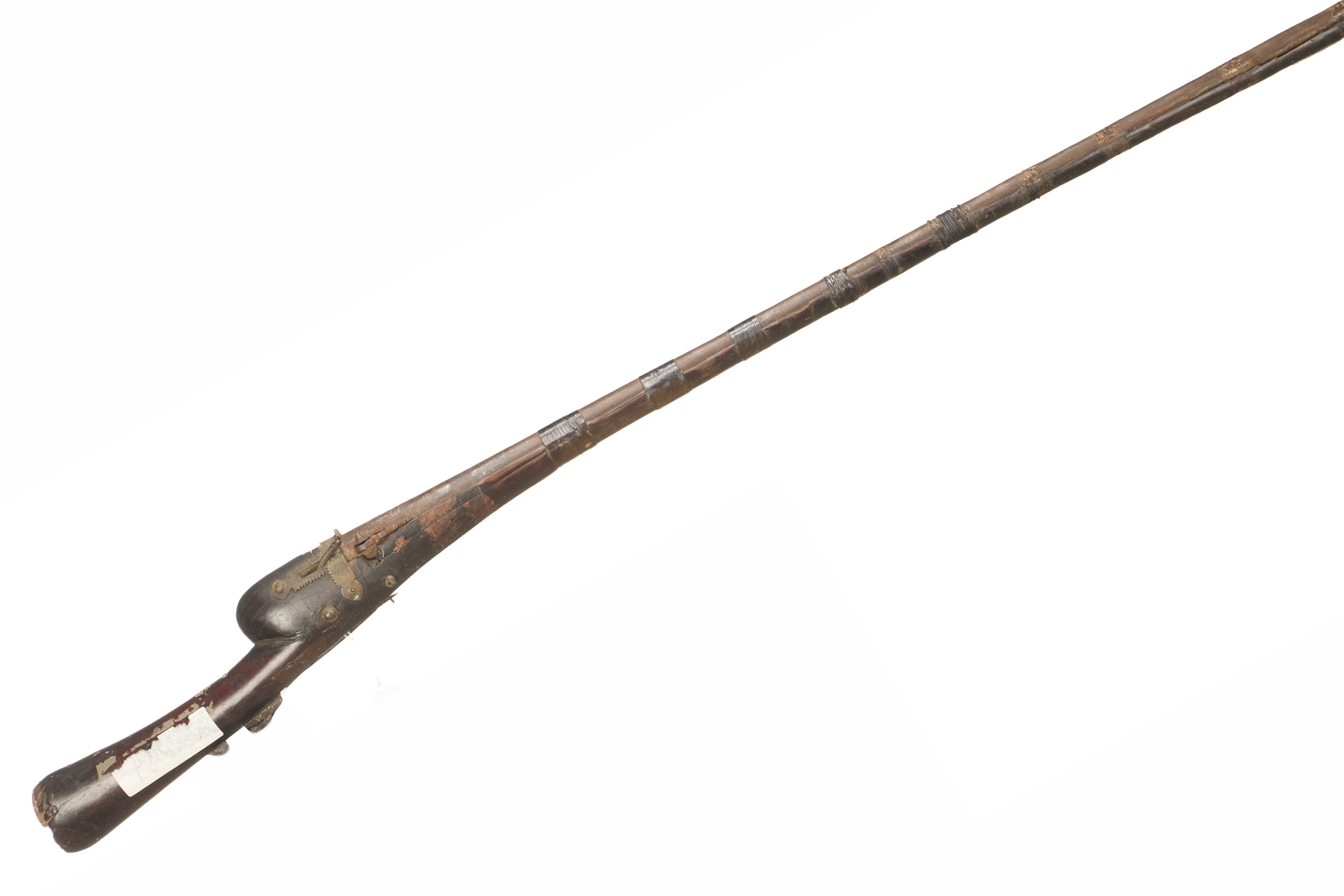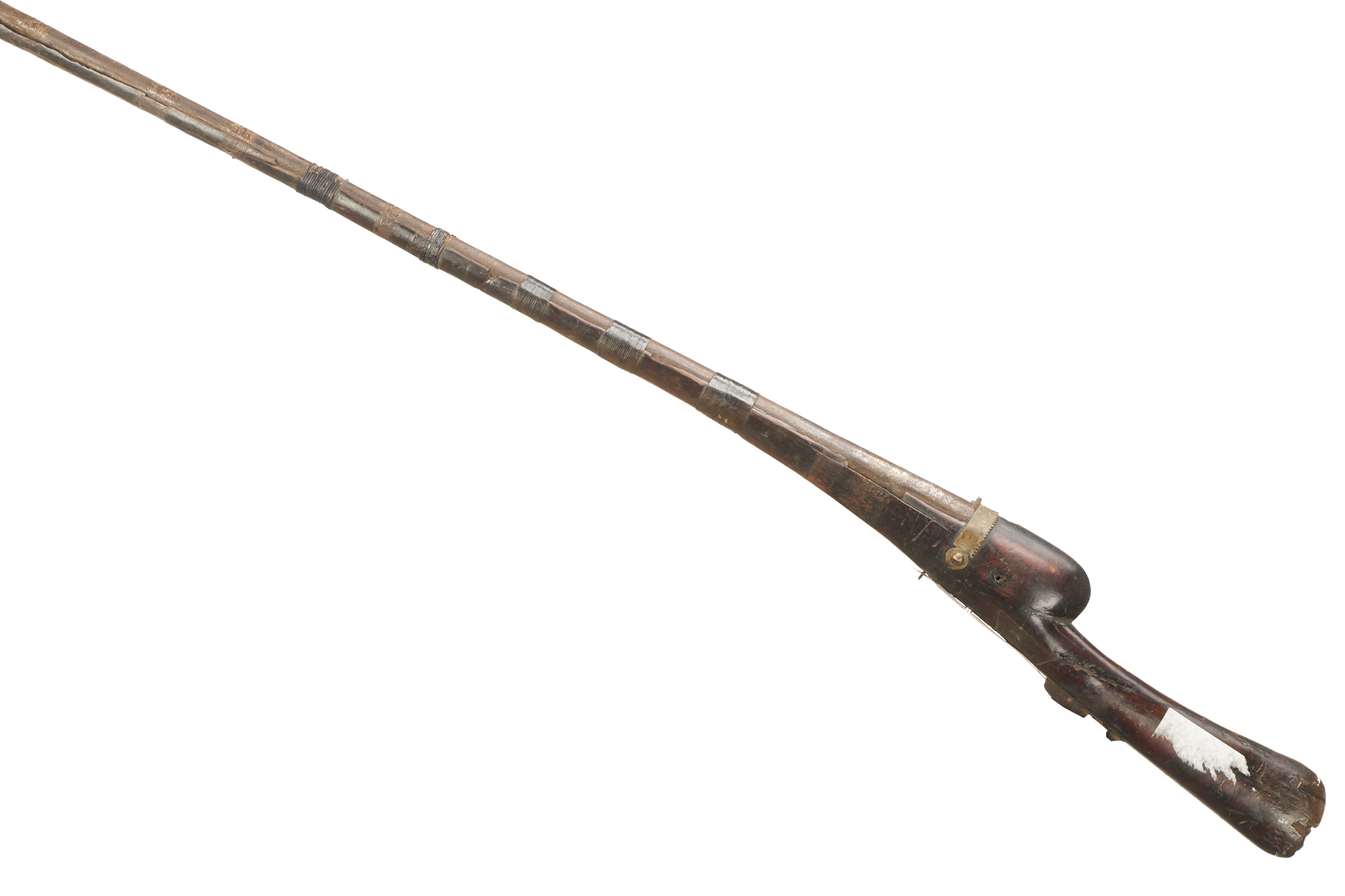 Crude, repaired full length stock, bound along barrel. Fore and rear sights, adaptations to remnants of action.