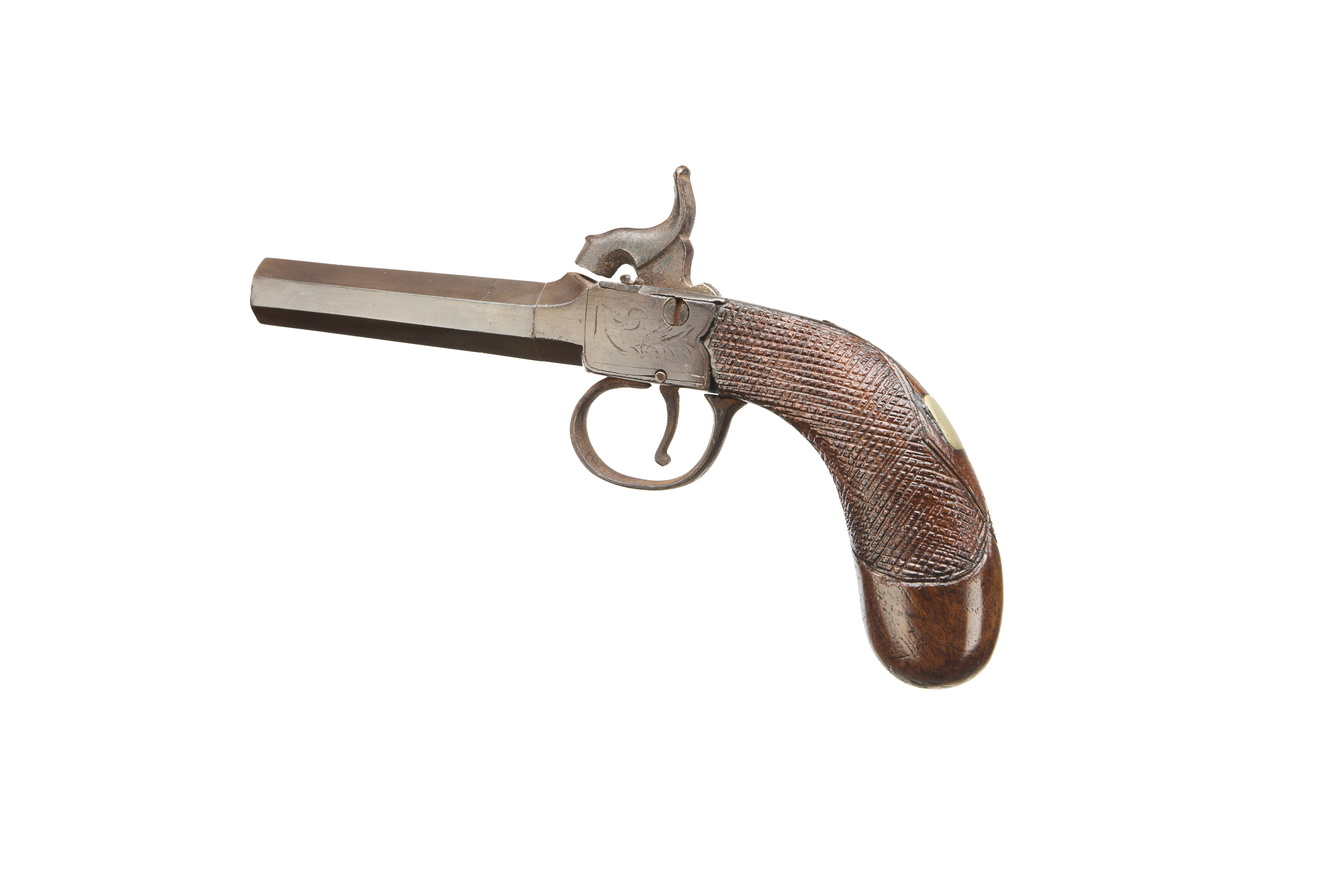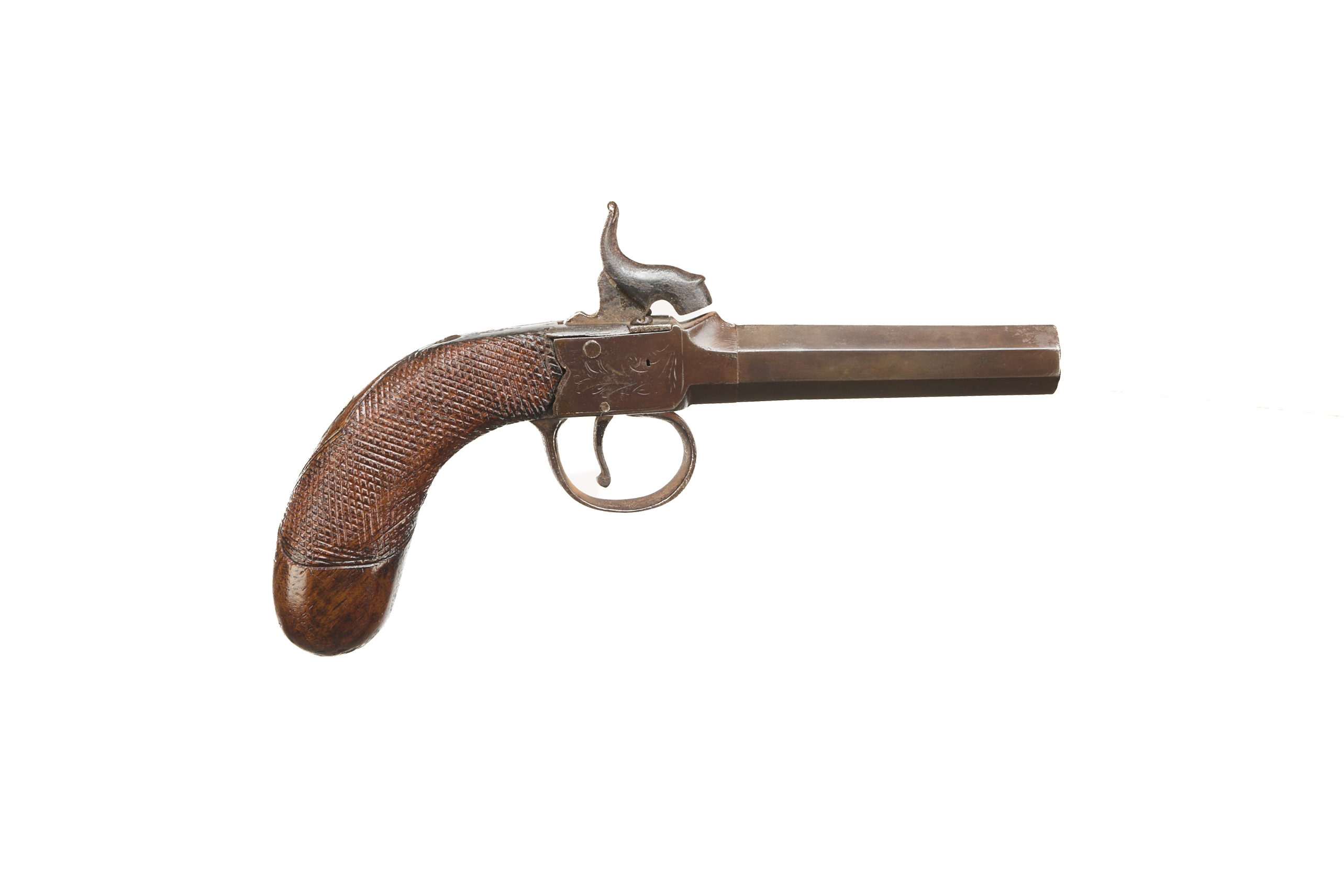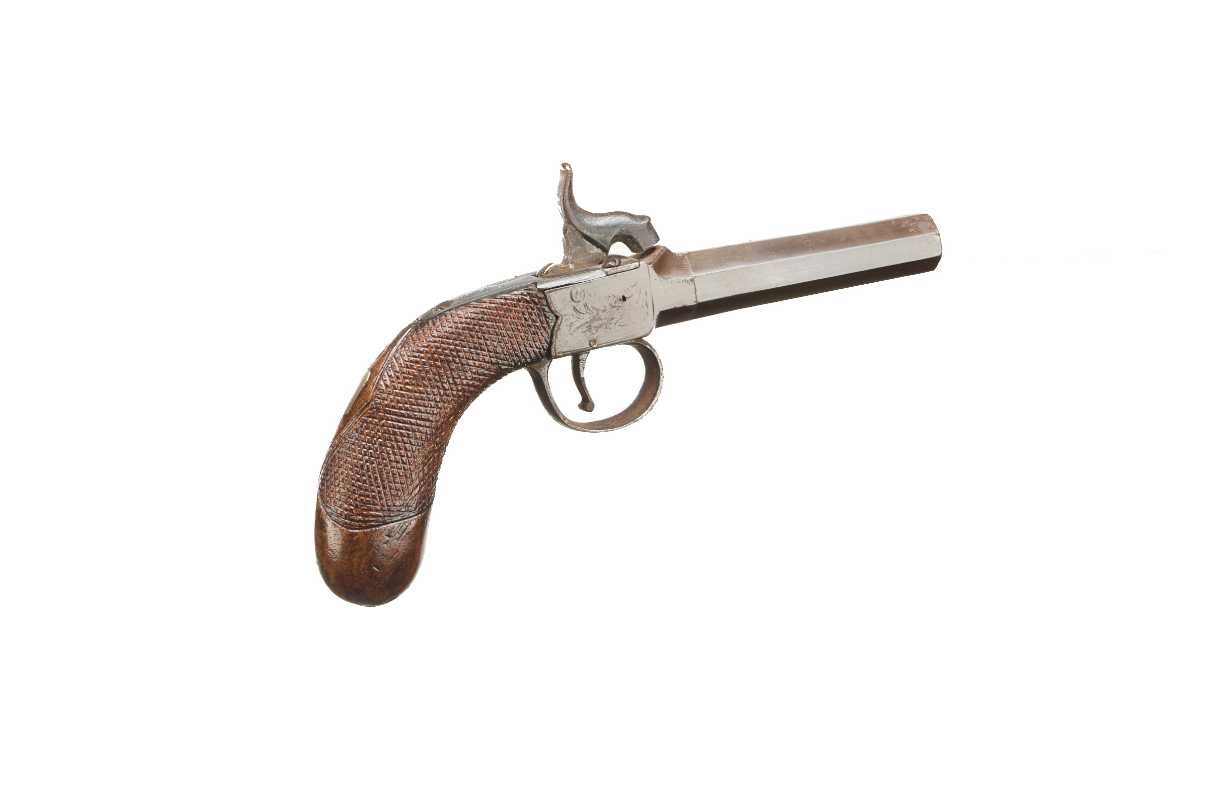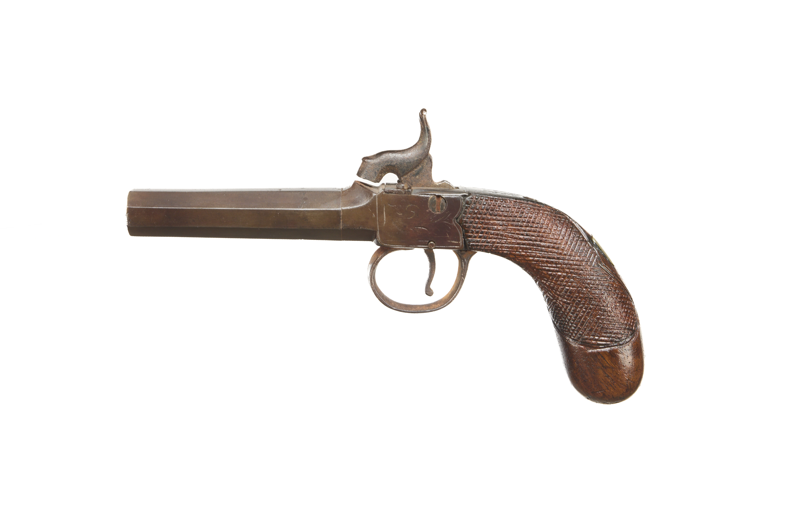 Turn off octagonal barrel, central hammer, nipple absent, worn engraving to action retaining much original colour, chequered grip.