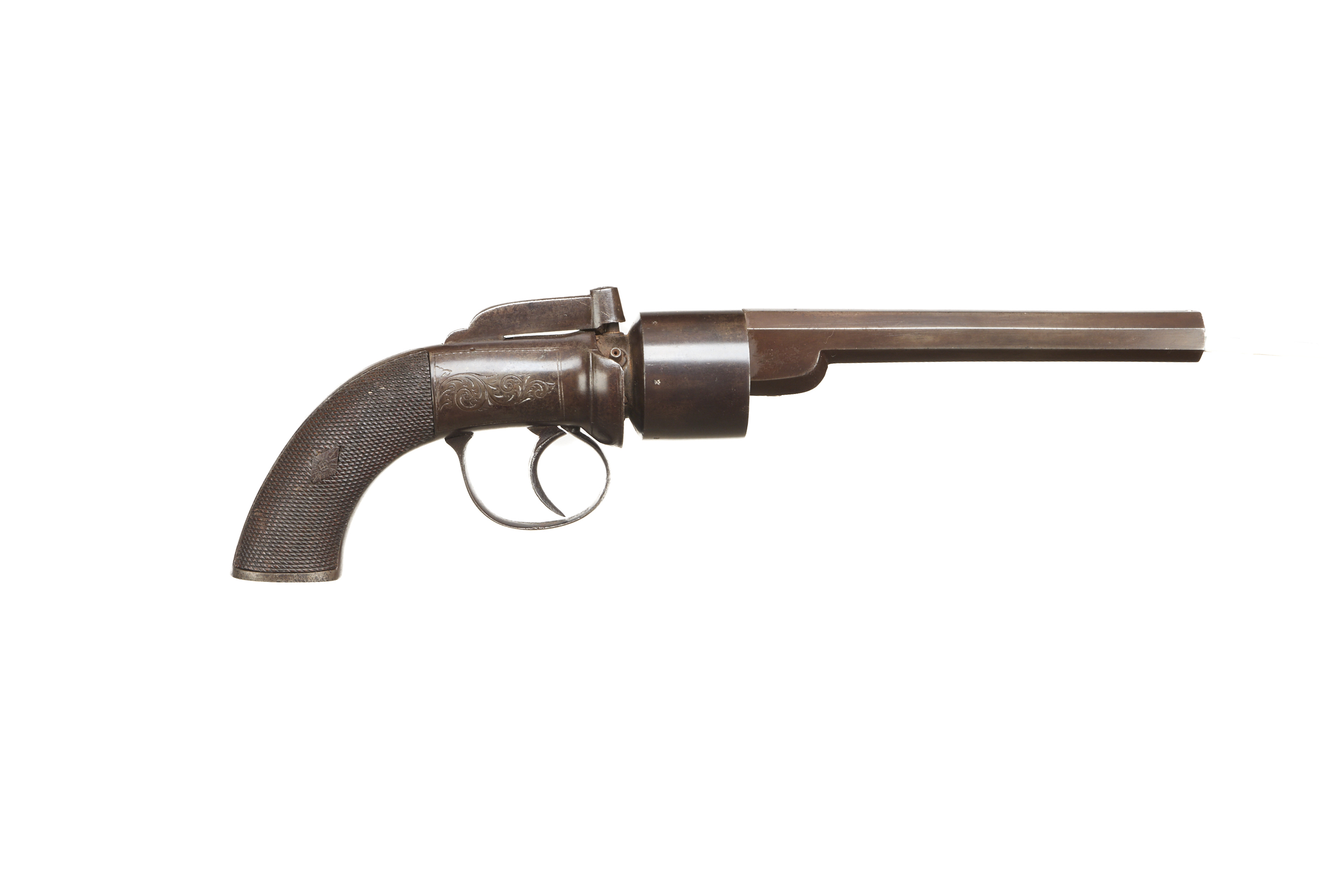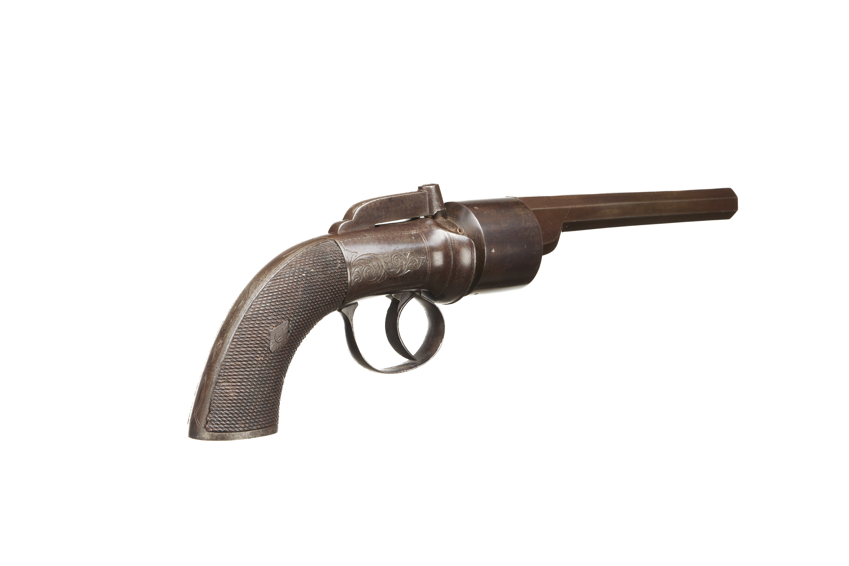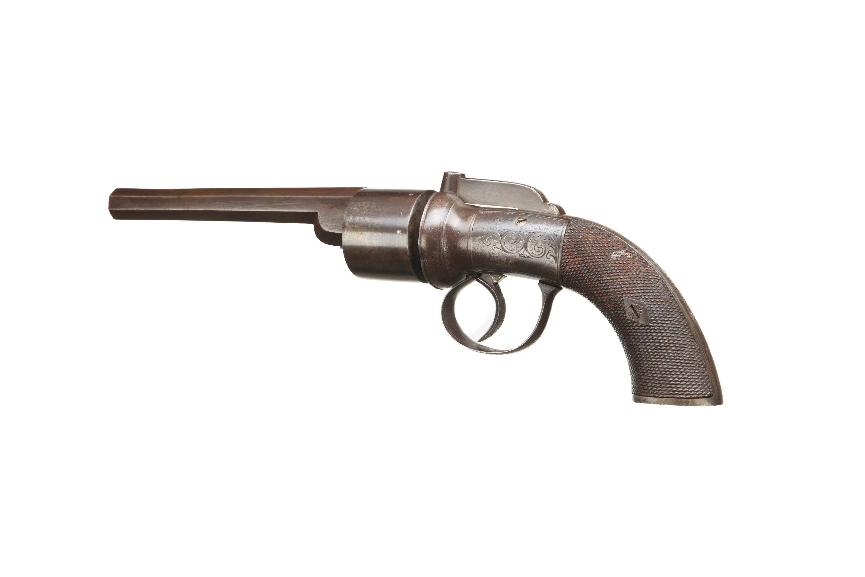 Unsighted hexagonal barrel, plain, 6-shot cylinder. Nipple shield, bar hammer with simple engraving, simple scroll to action and trigger. Original finish intact to barrel and much of action.