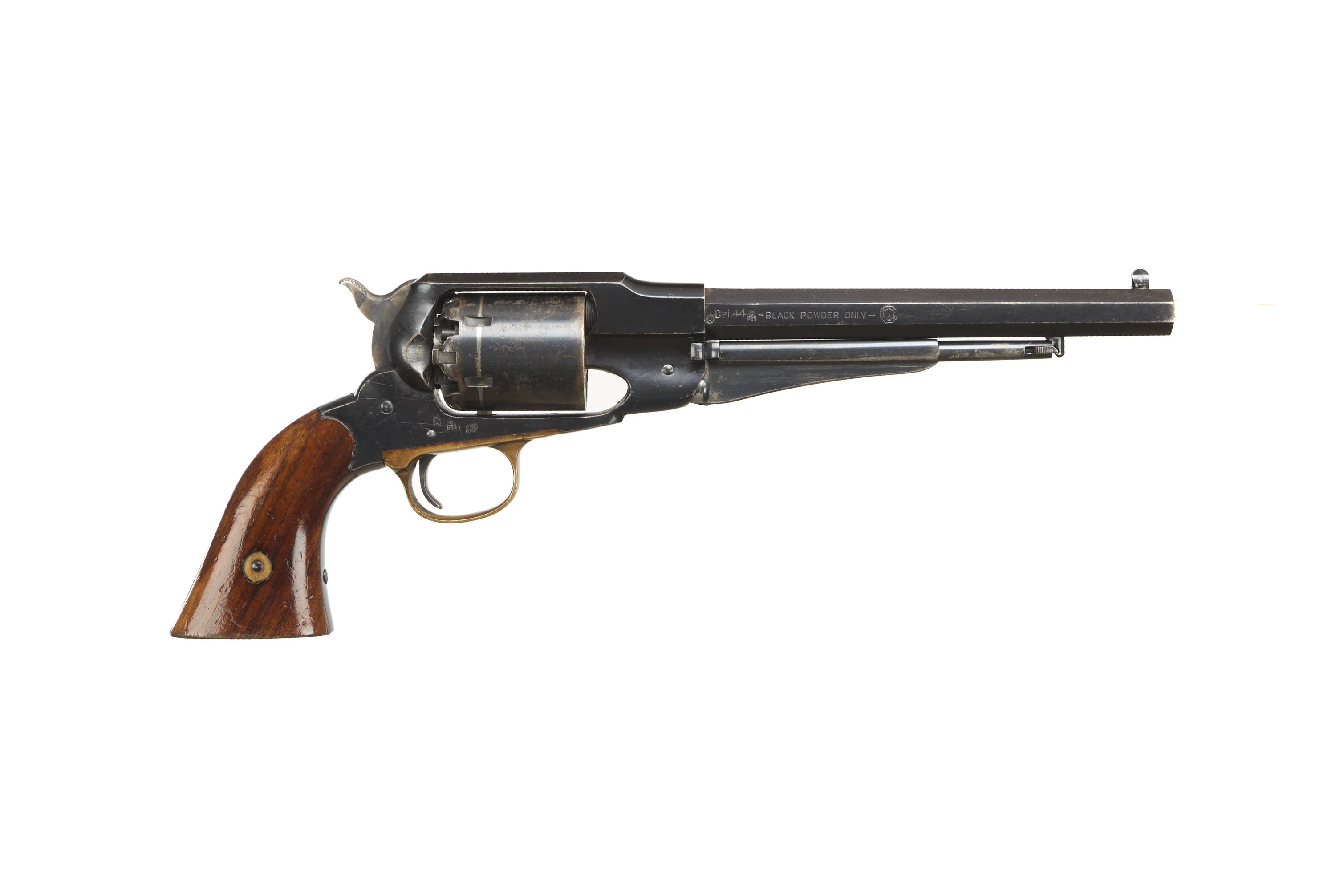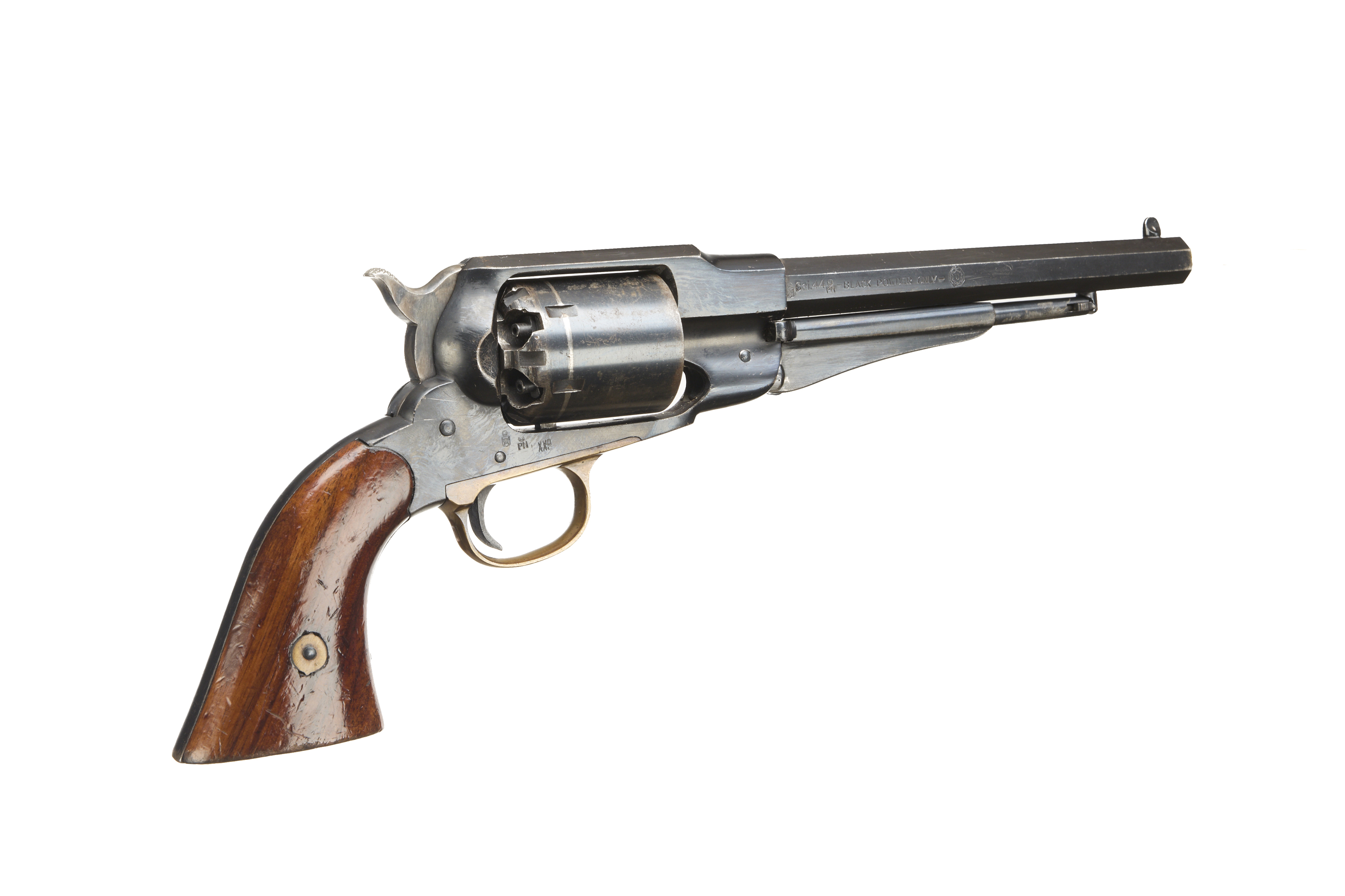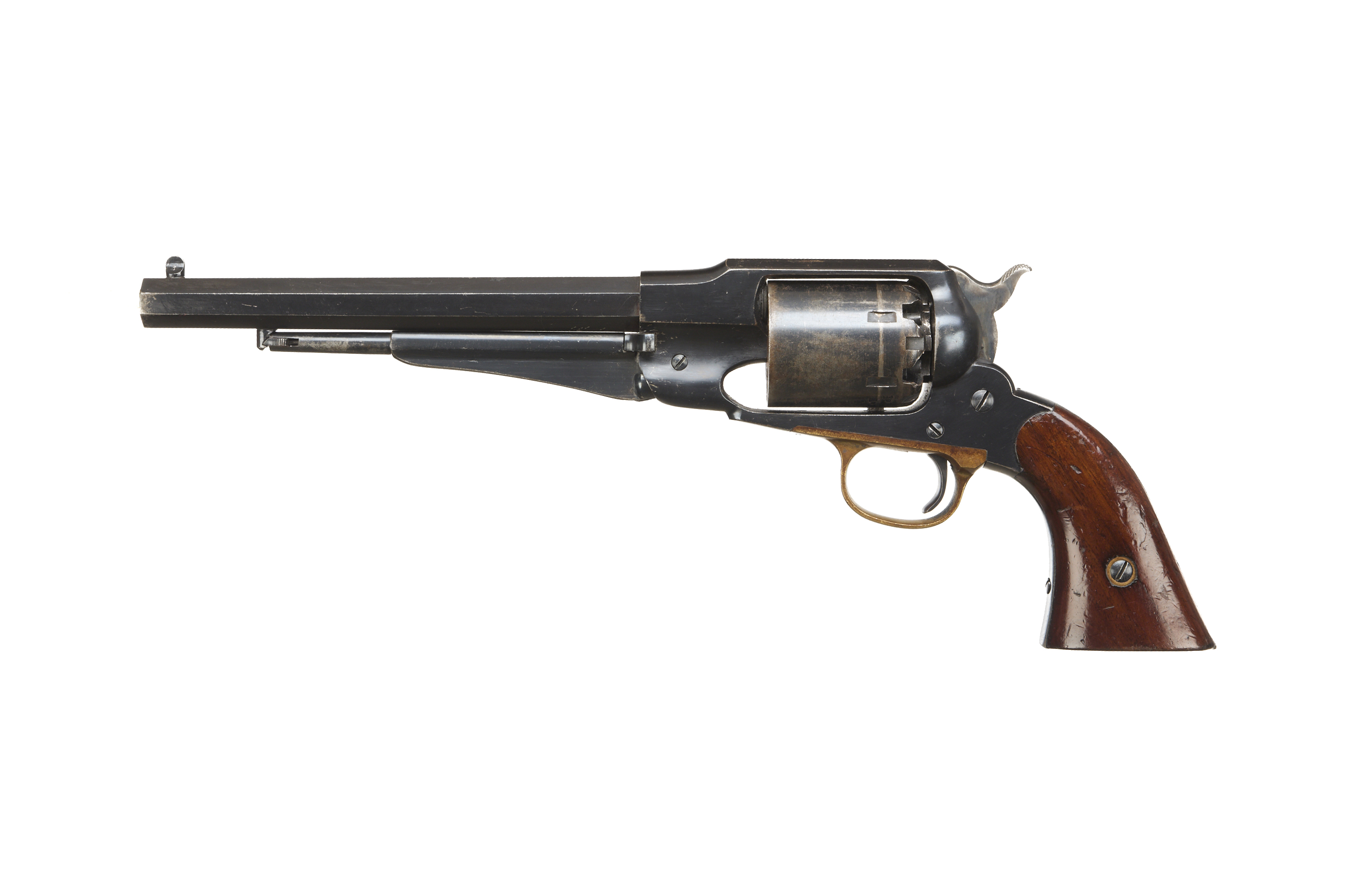 9" blued barrel, plain cylinder, brass trigger guard and smooth walnut grip.
