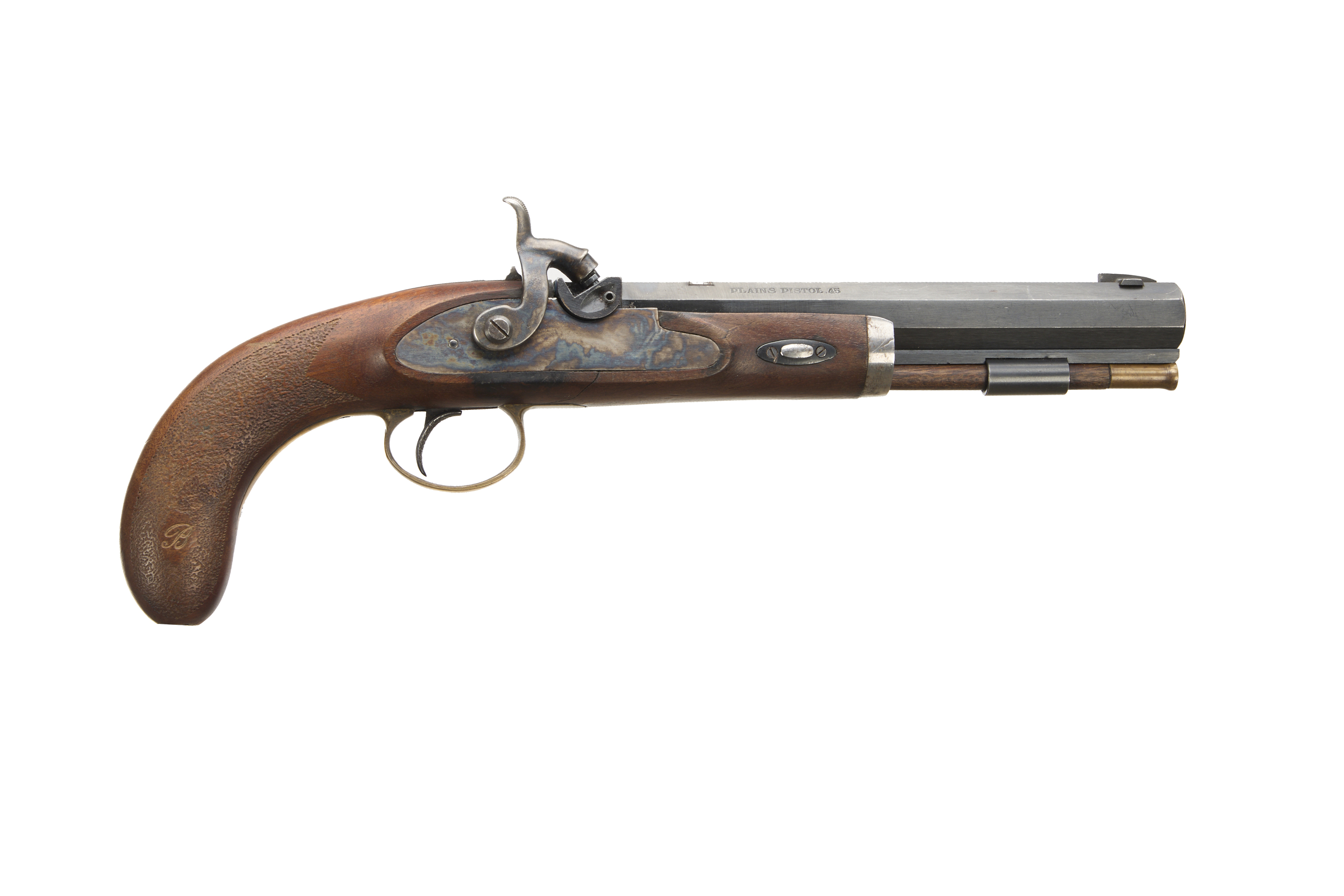 9" blued hexagonal barrel, tipped ramrod, brass trigger guard, walnut grips.