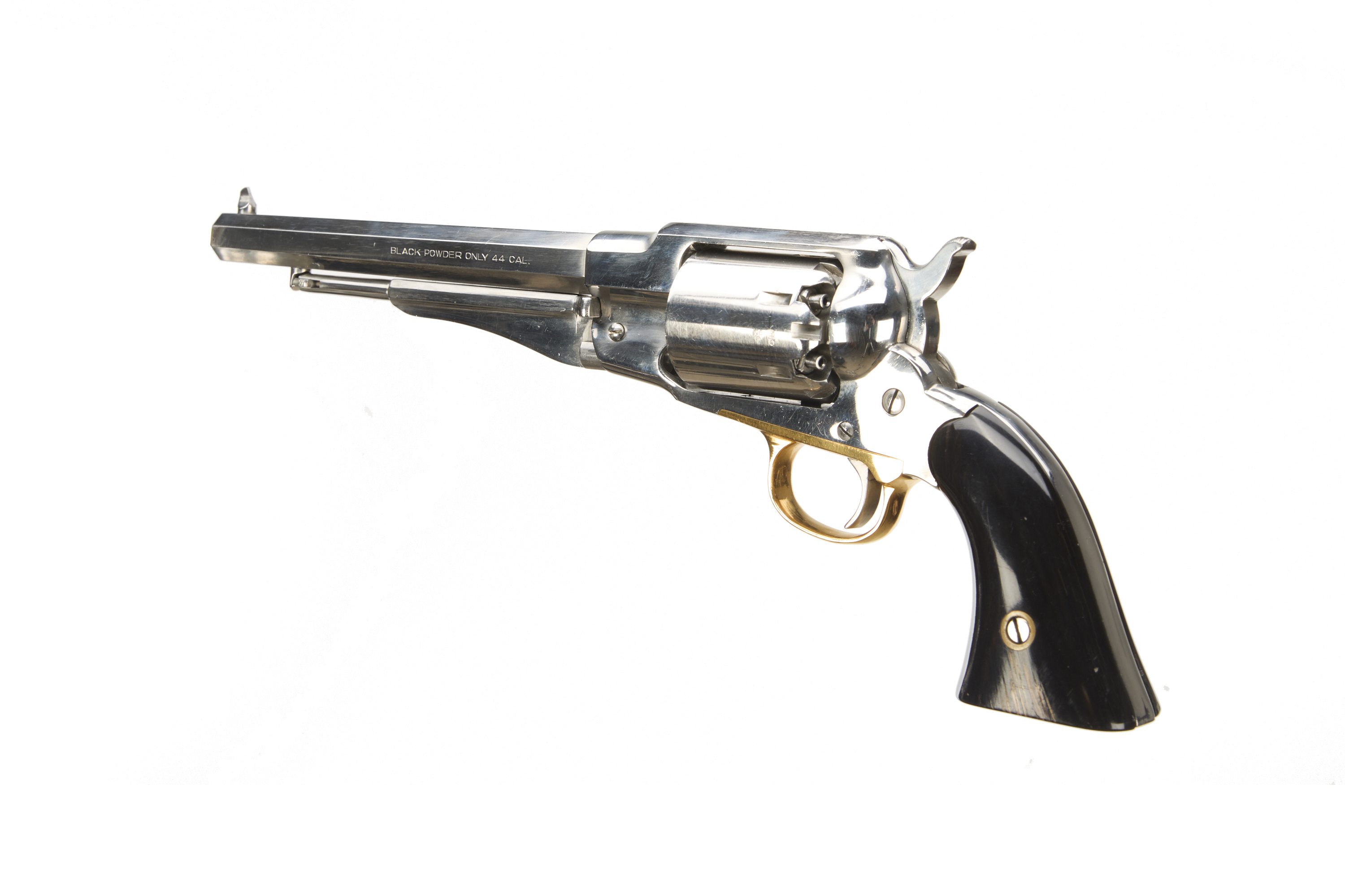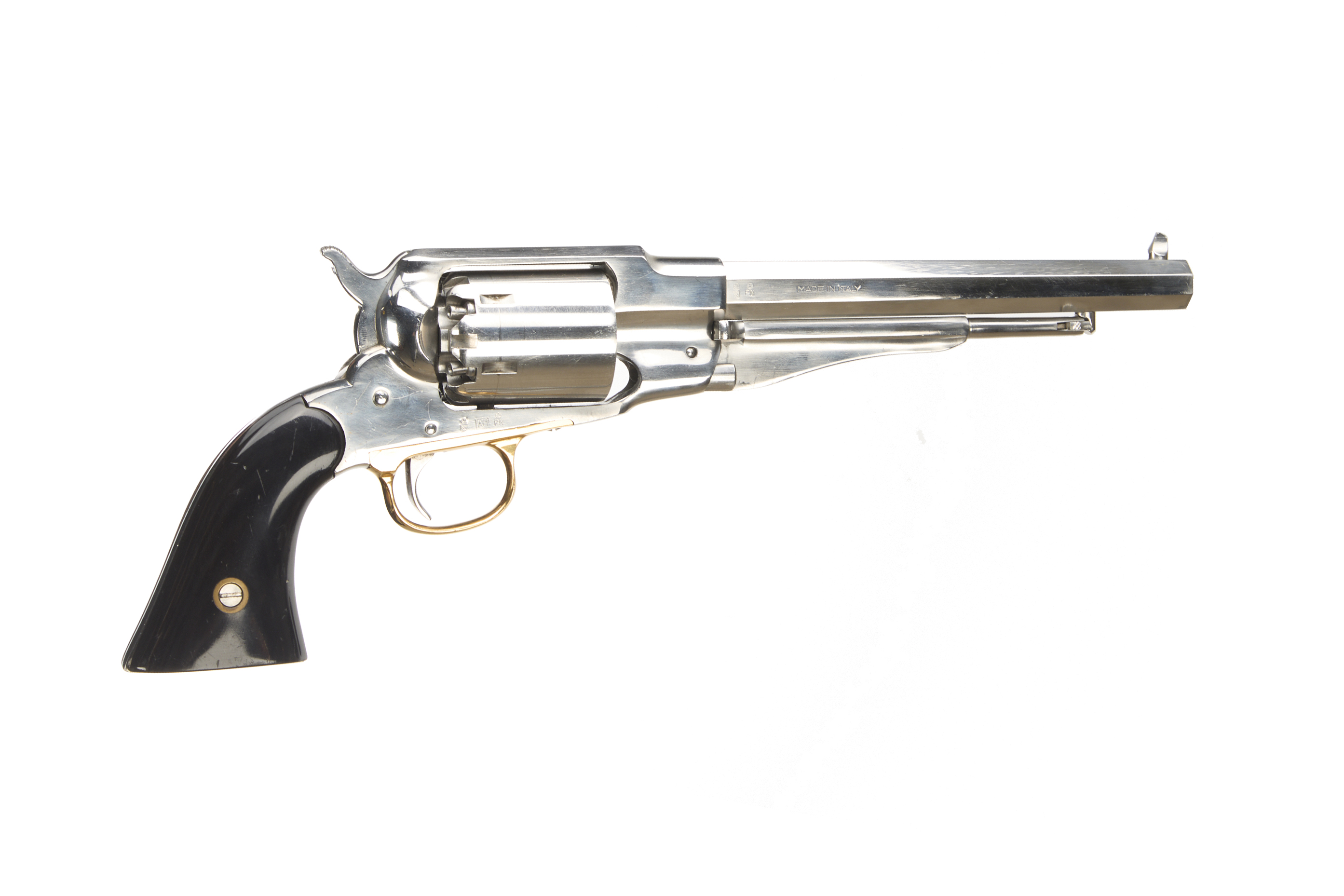 7 3/4" stainless barrel, plain cylinder, heavy frame, trigger guard and smooth horn grips.