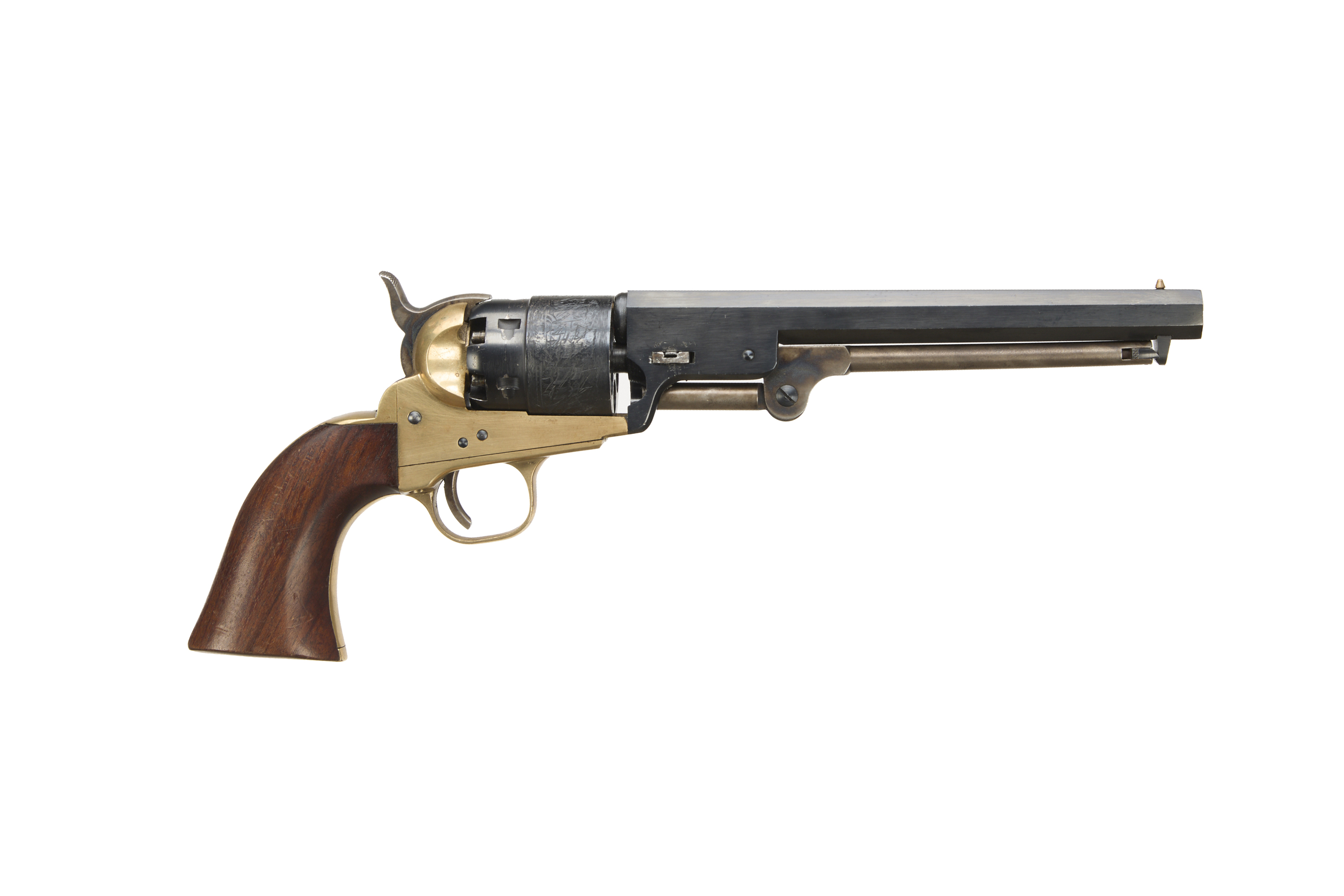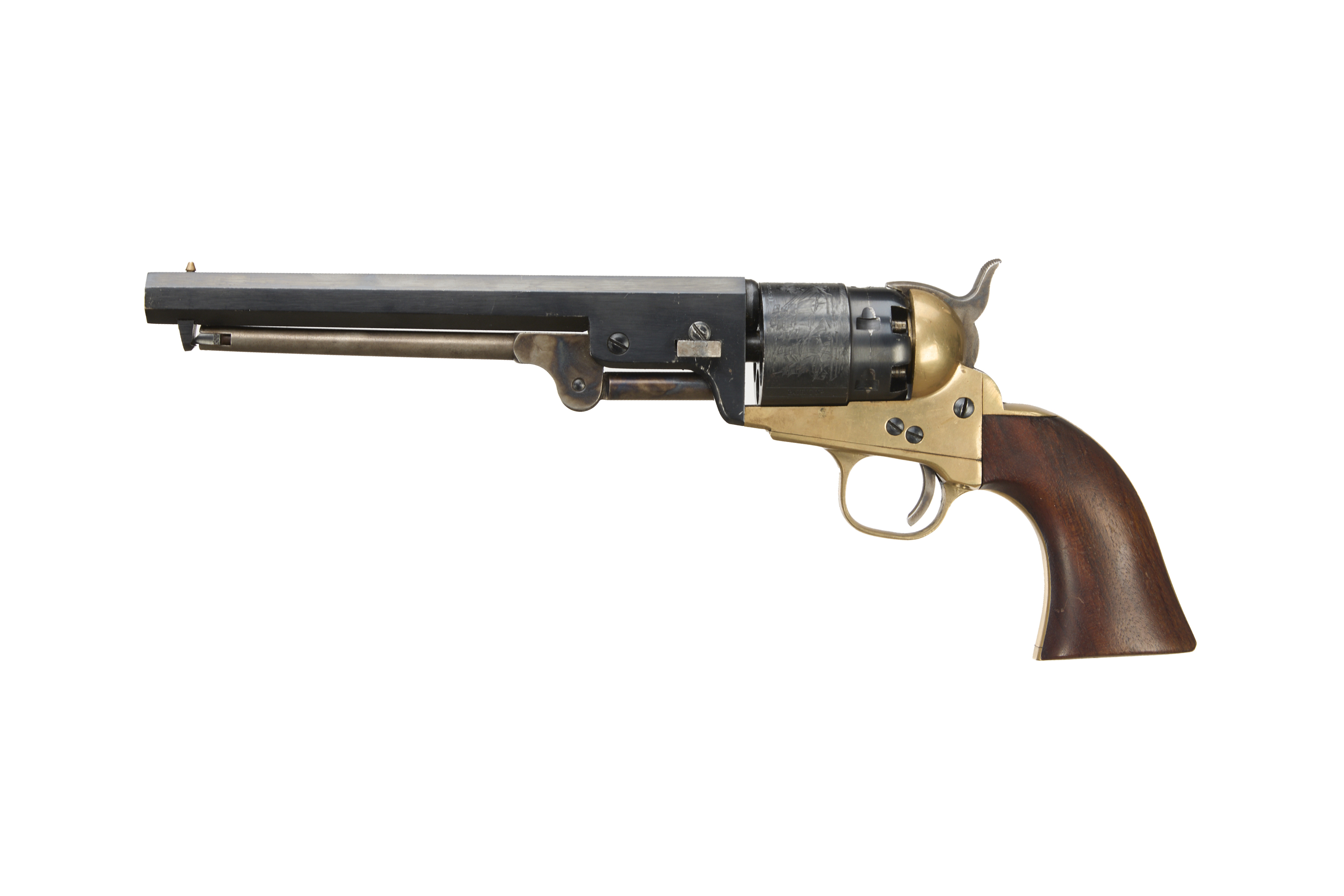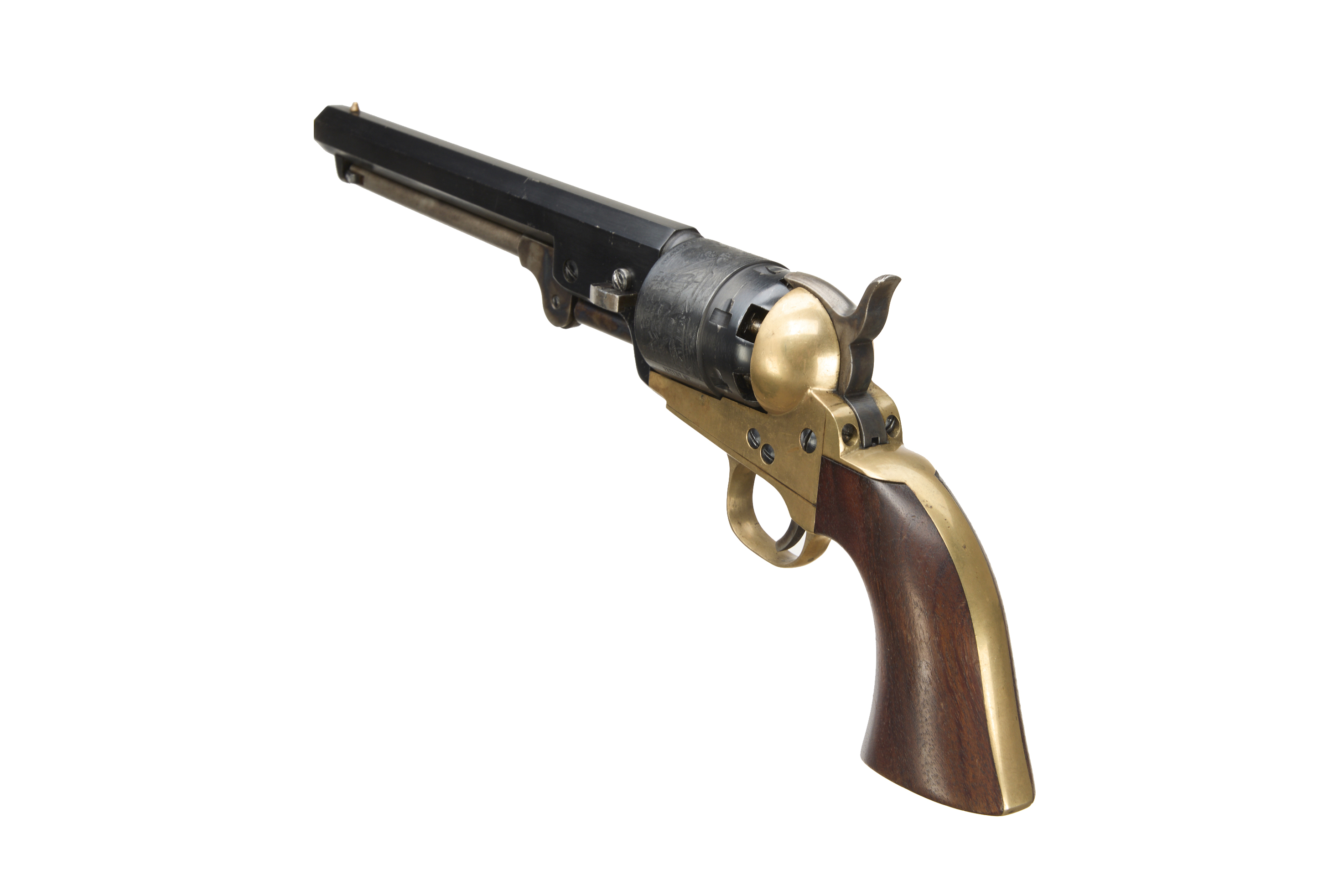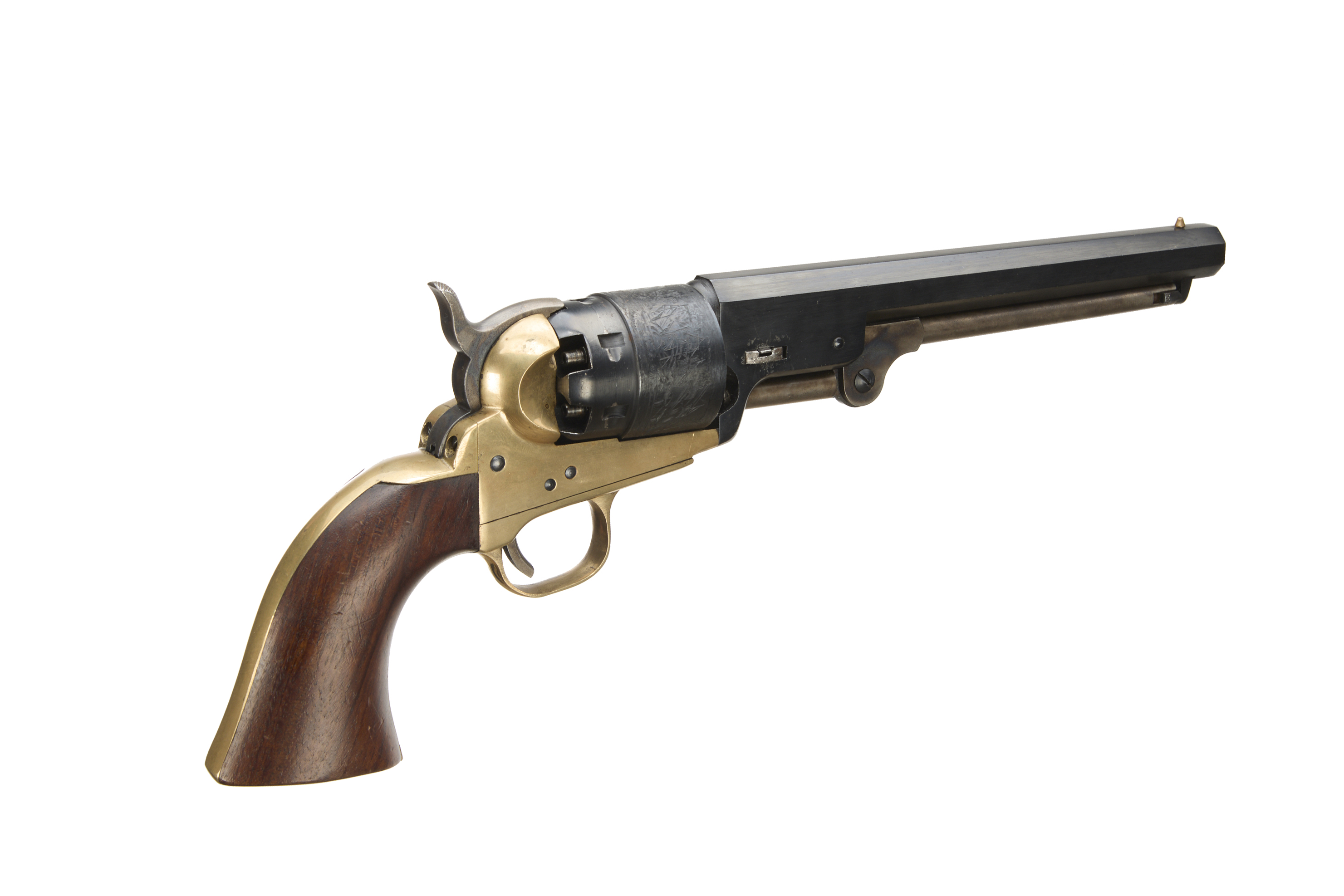 9" blued barrel, engraved plain cylinder, colour hardened open frame, brass grip-straps and smooth walnut grip.