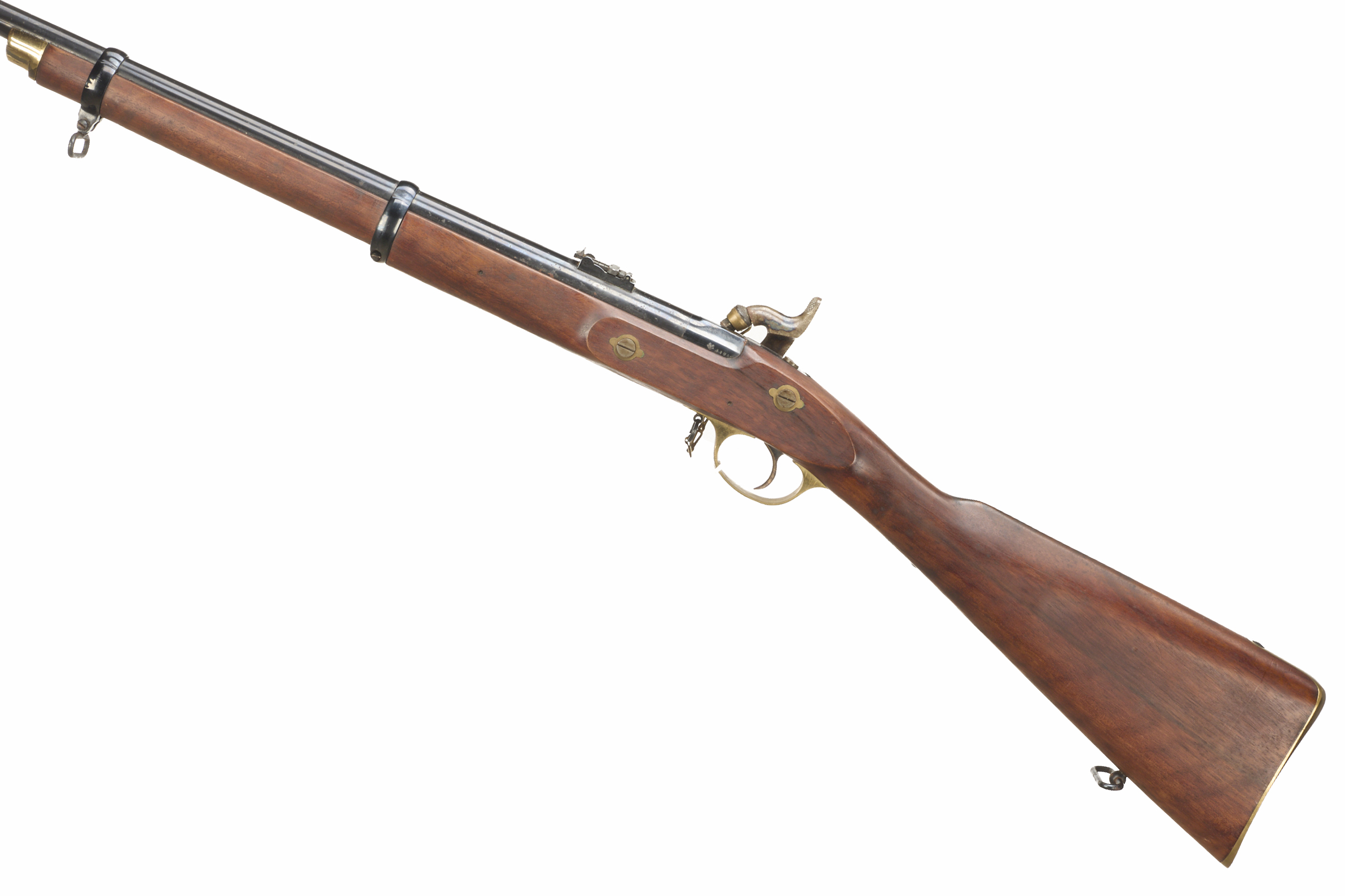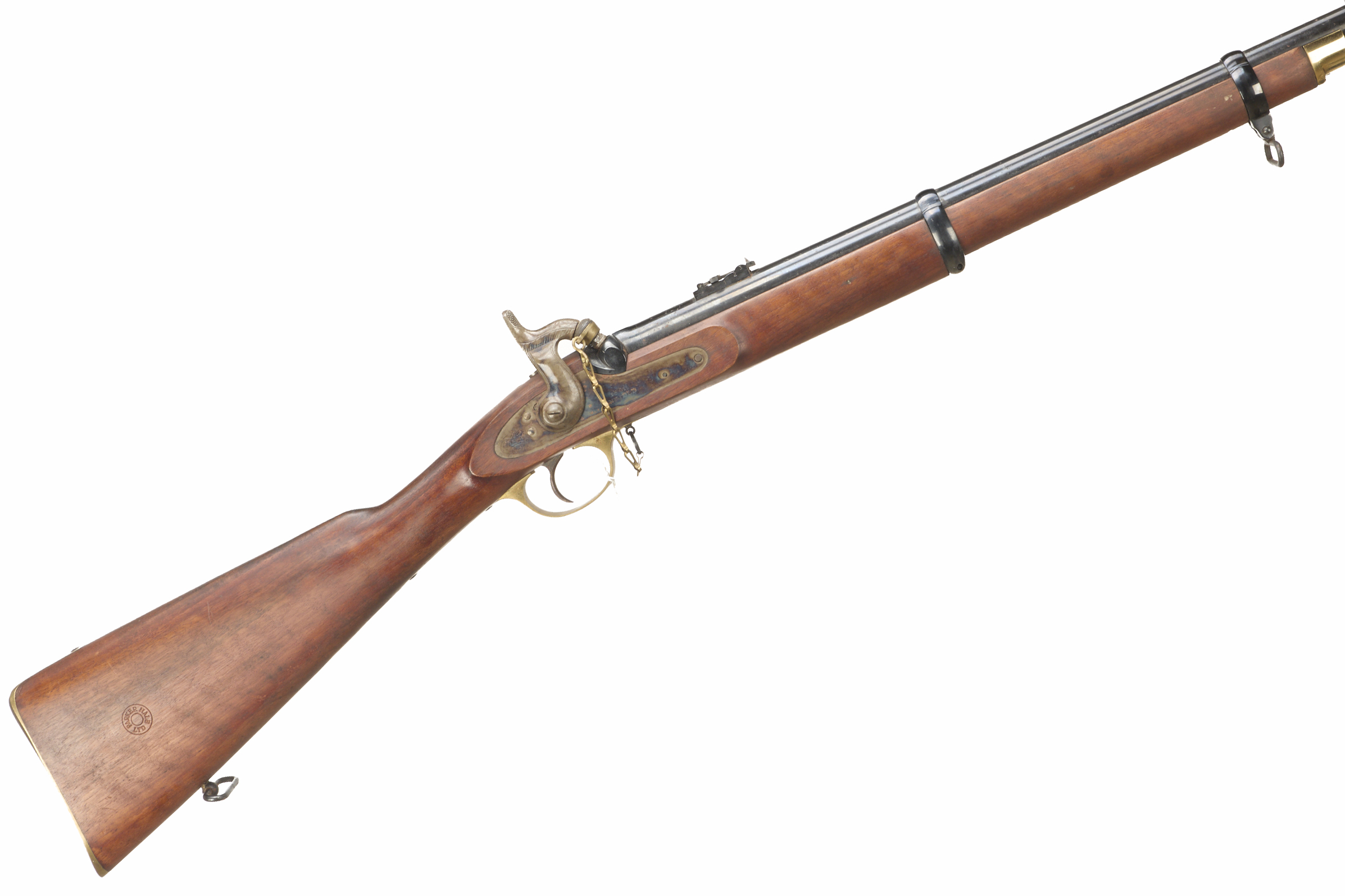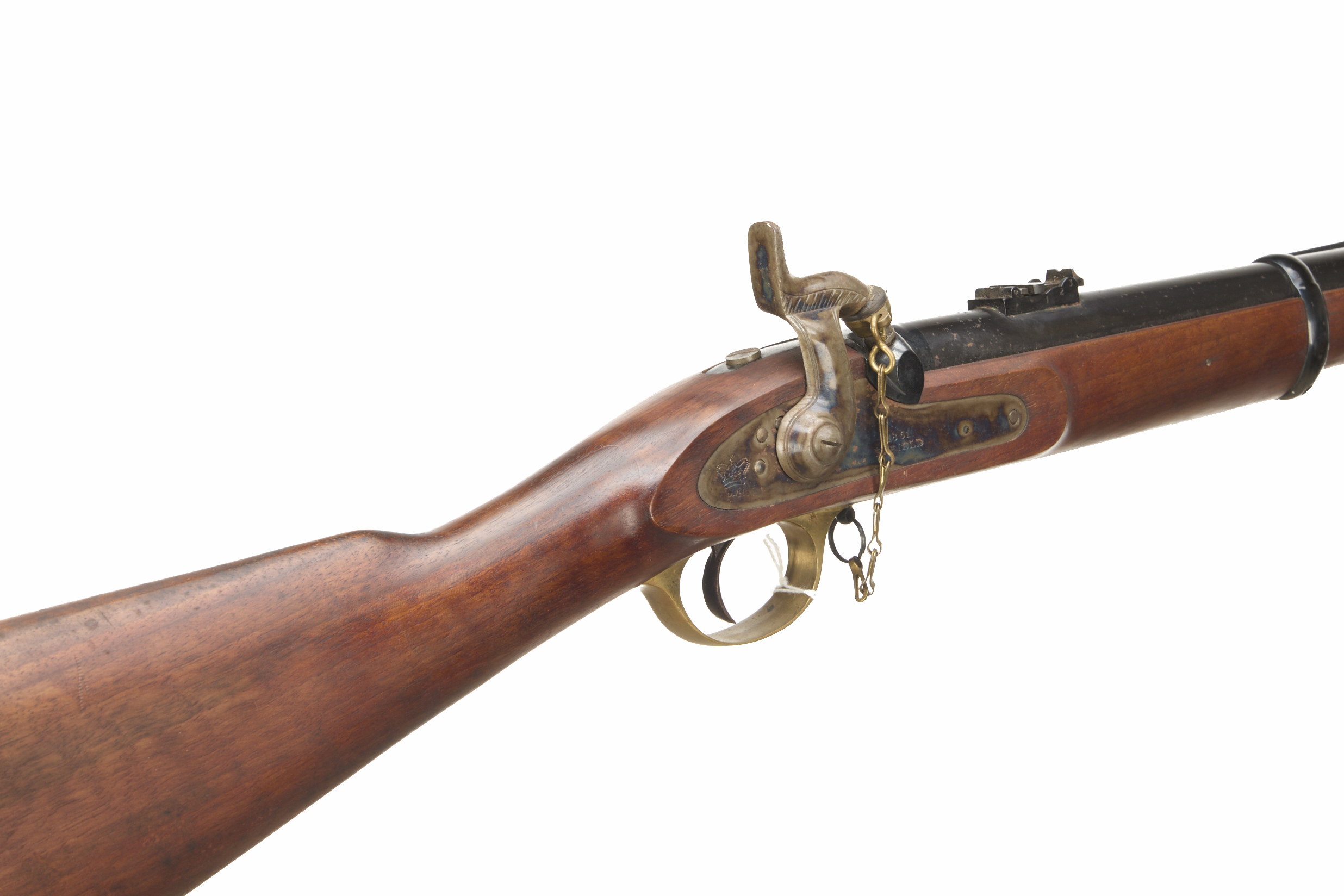 Brass butt plate, straight grip, 3/4-length stock, brass end cap, 2 barrel bands plain lock, swan-necked cock. Bead foresight, ladder rearsight , brass fittings throughout. Deactivated 2003 no certificate.