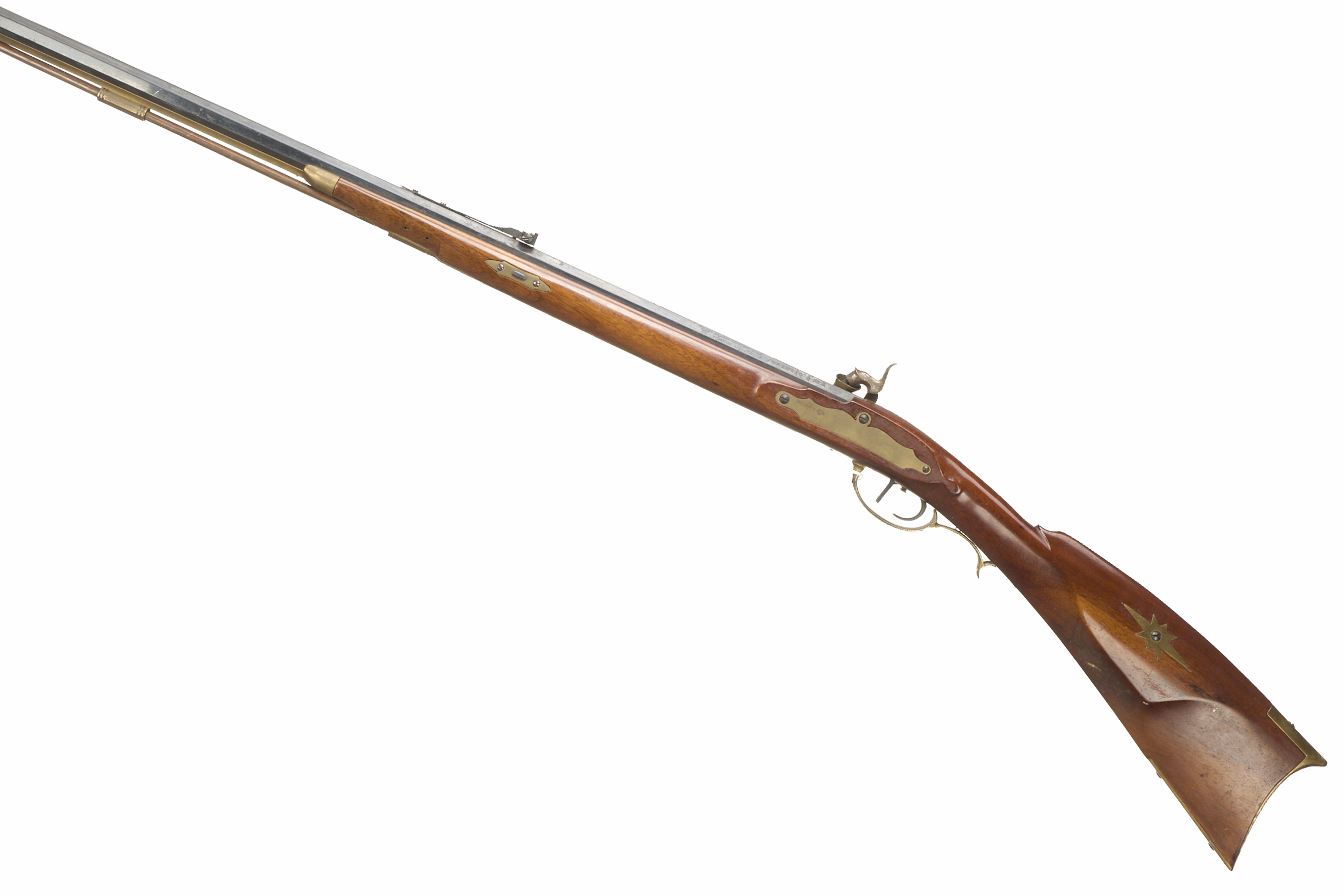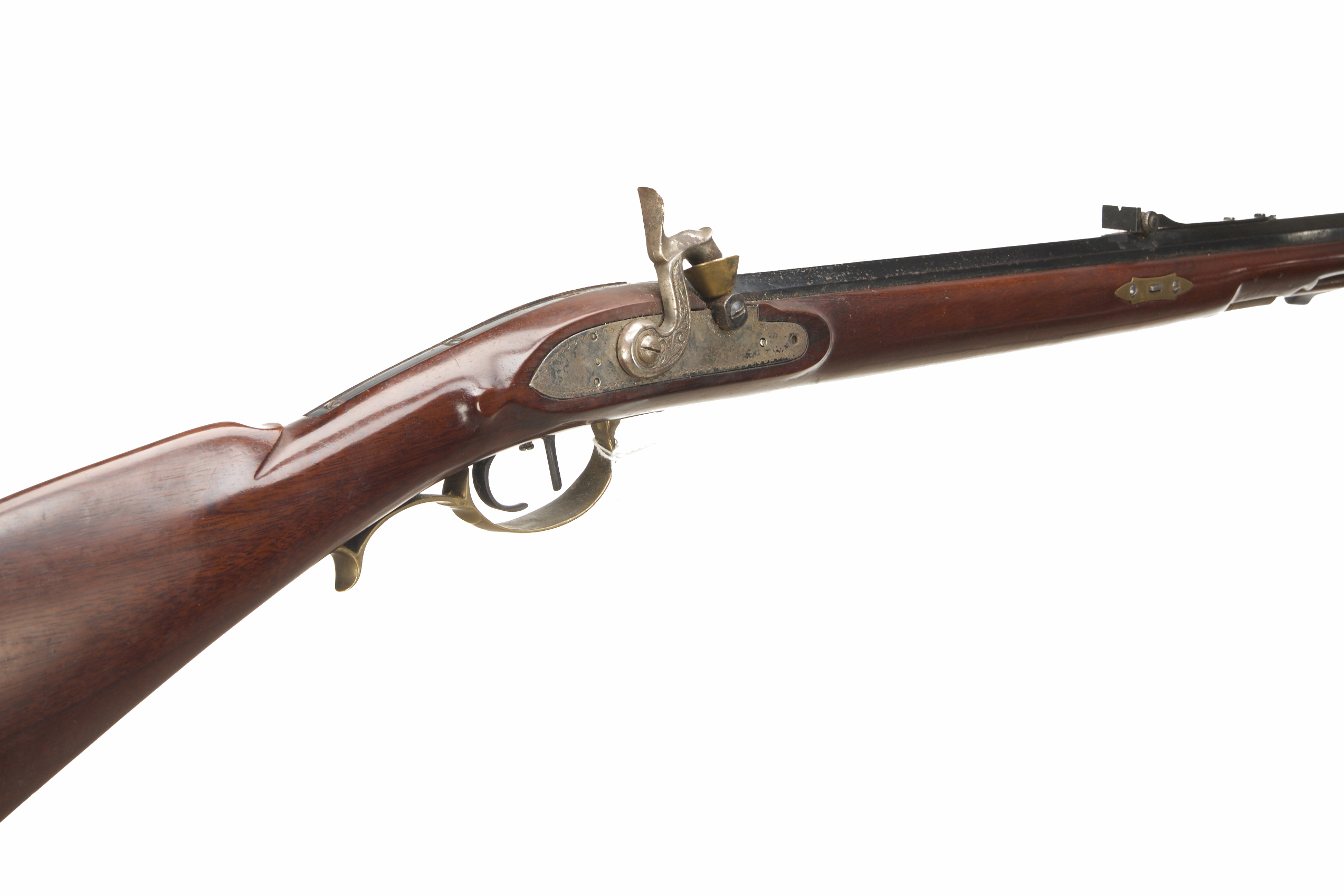 Brass butt plate with inserts to stock, straight grip, half-length stock, brass end cap, ram rod, plain lock, swan-necked cock. Post foresight, brass fittings throughout. Proved 1981.