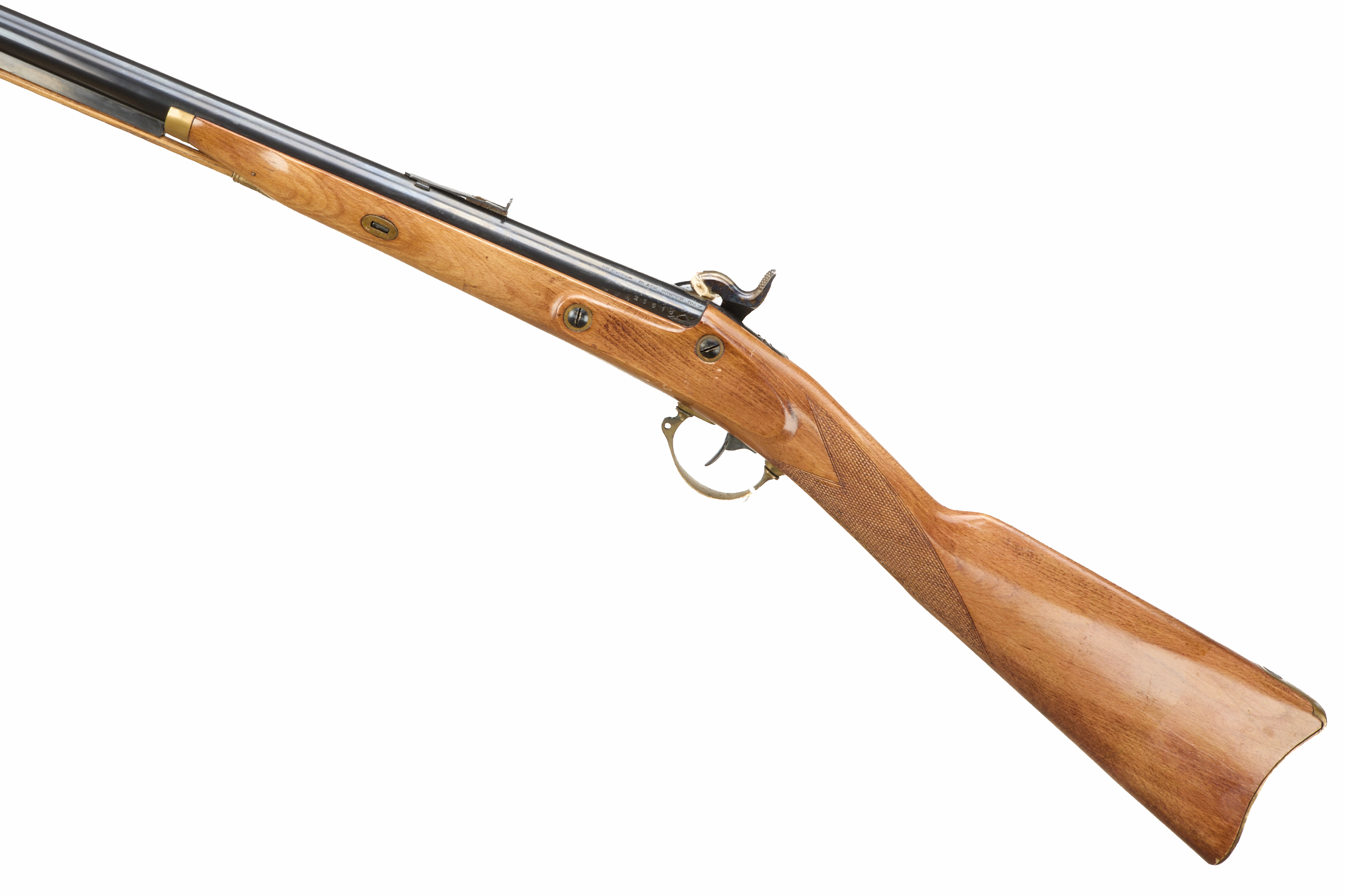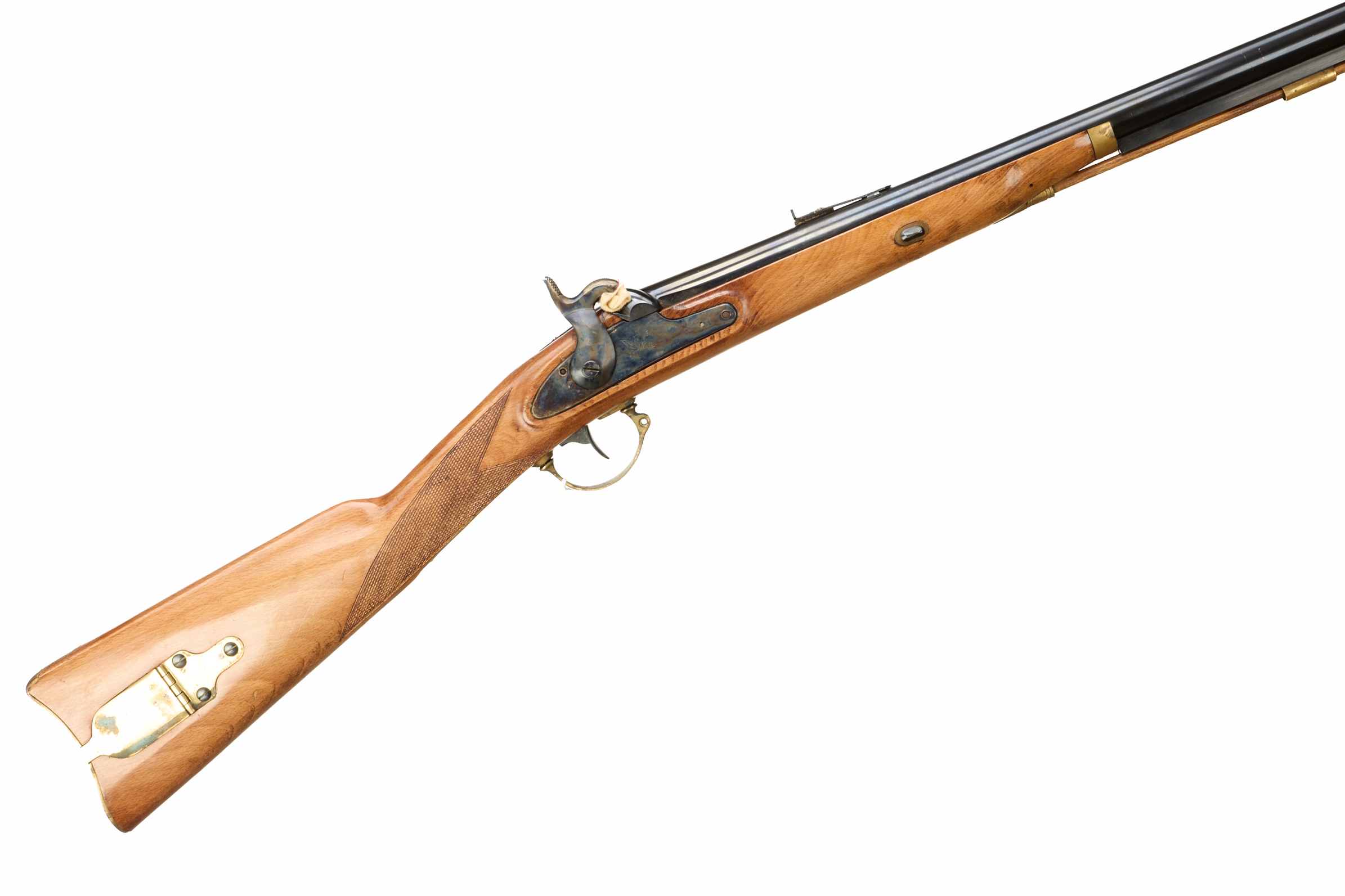Brass butt plate with compartment and cover, chequered straight grip, half length stock, brass end cap, plain lock, coloured hammer. Post foresight, spring rearsight , brass fittings throughout.