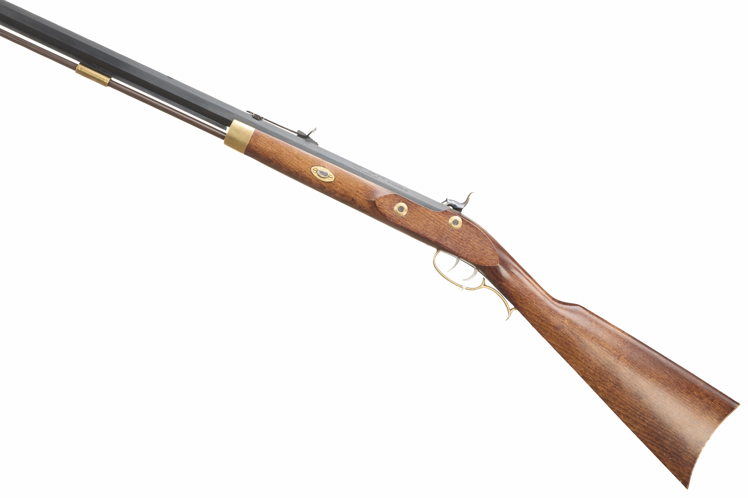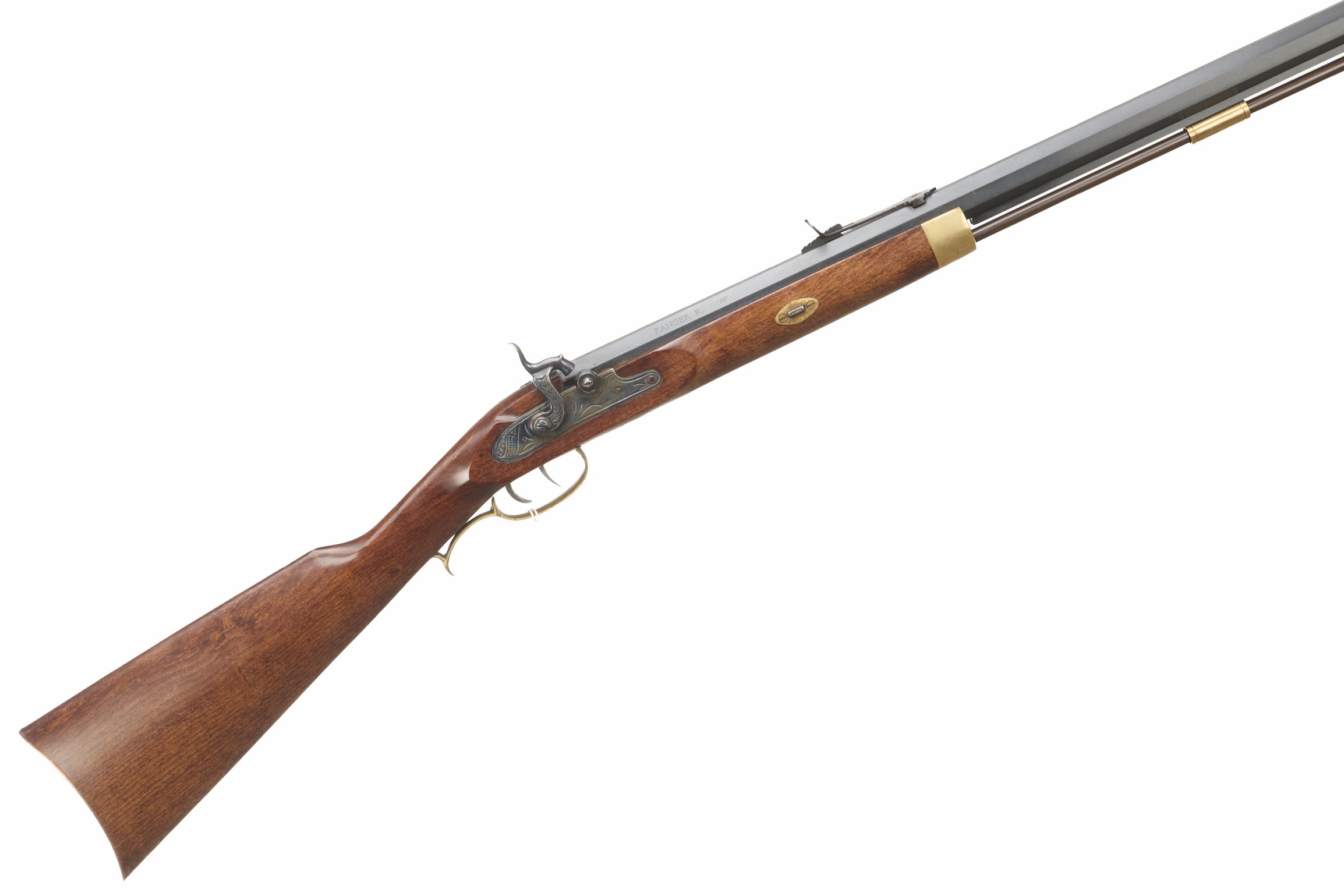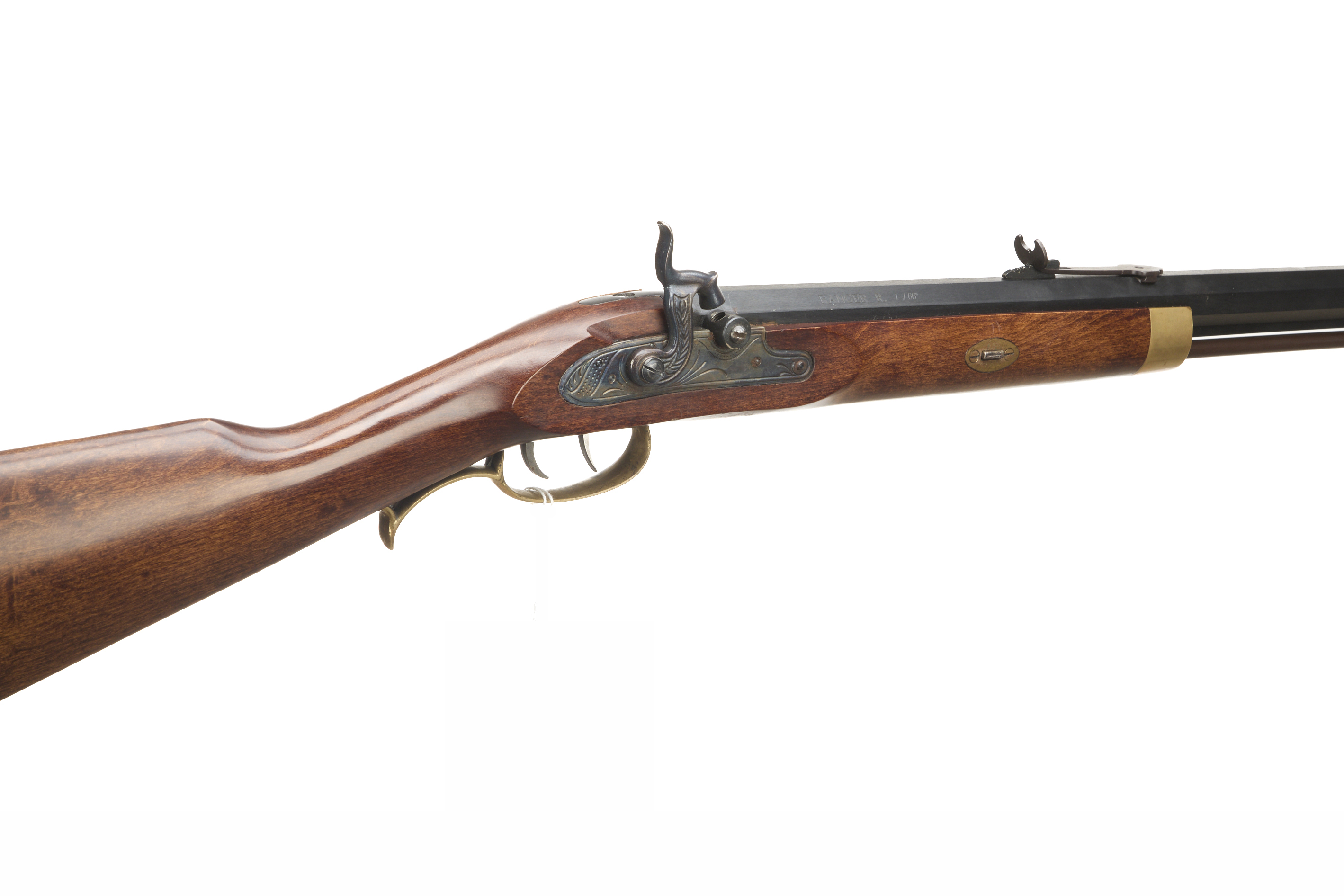 Brass butt plate, straight grip, half-length stock, brass end cap, ram rod, plain lock, swan-necked cock , nipple absent. Post foresight, buckhorn rear sight, brass fittings throughout. Set triggers.
