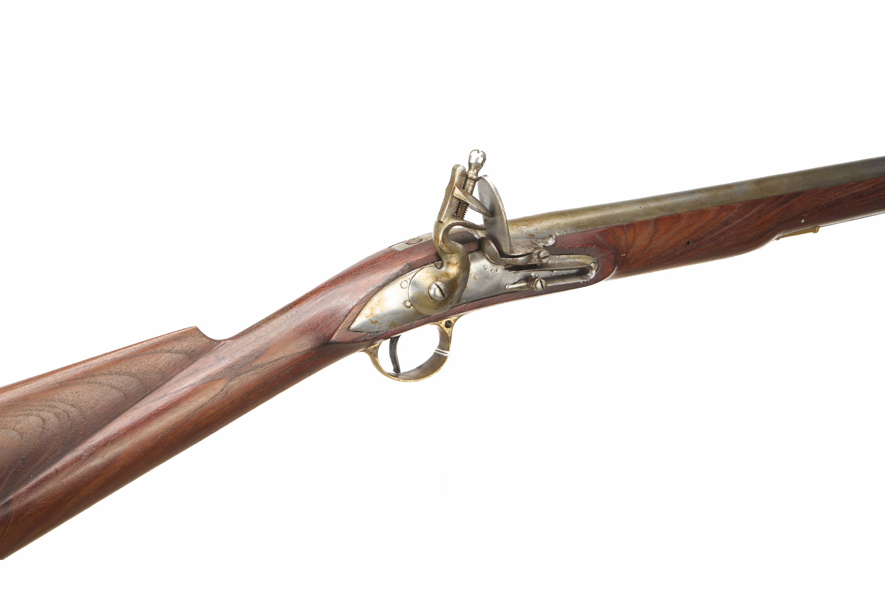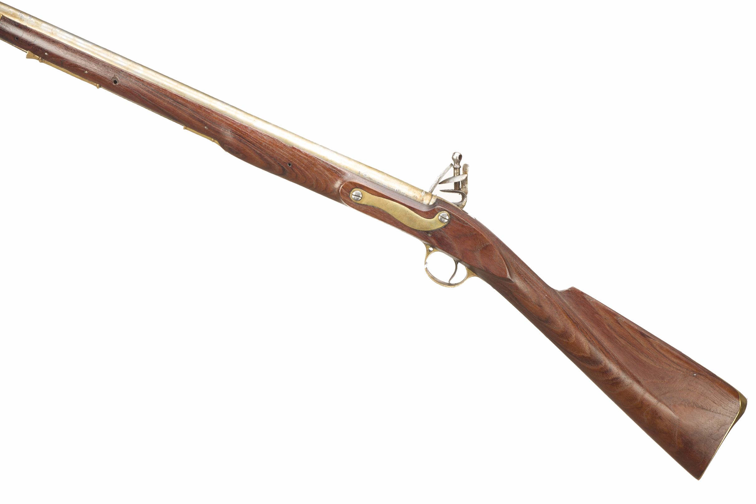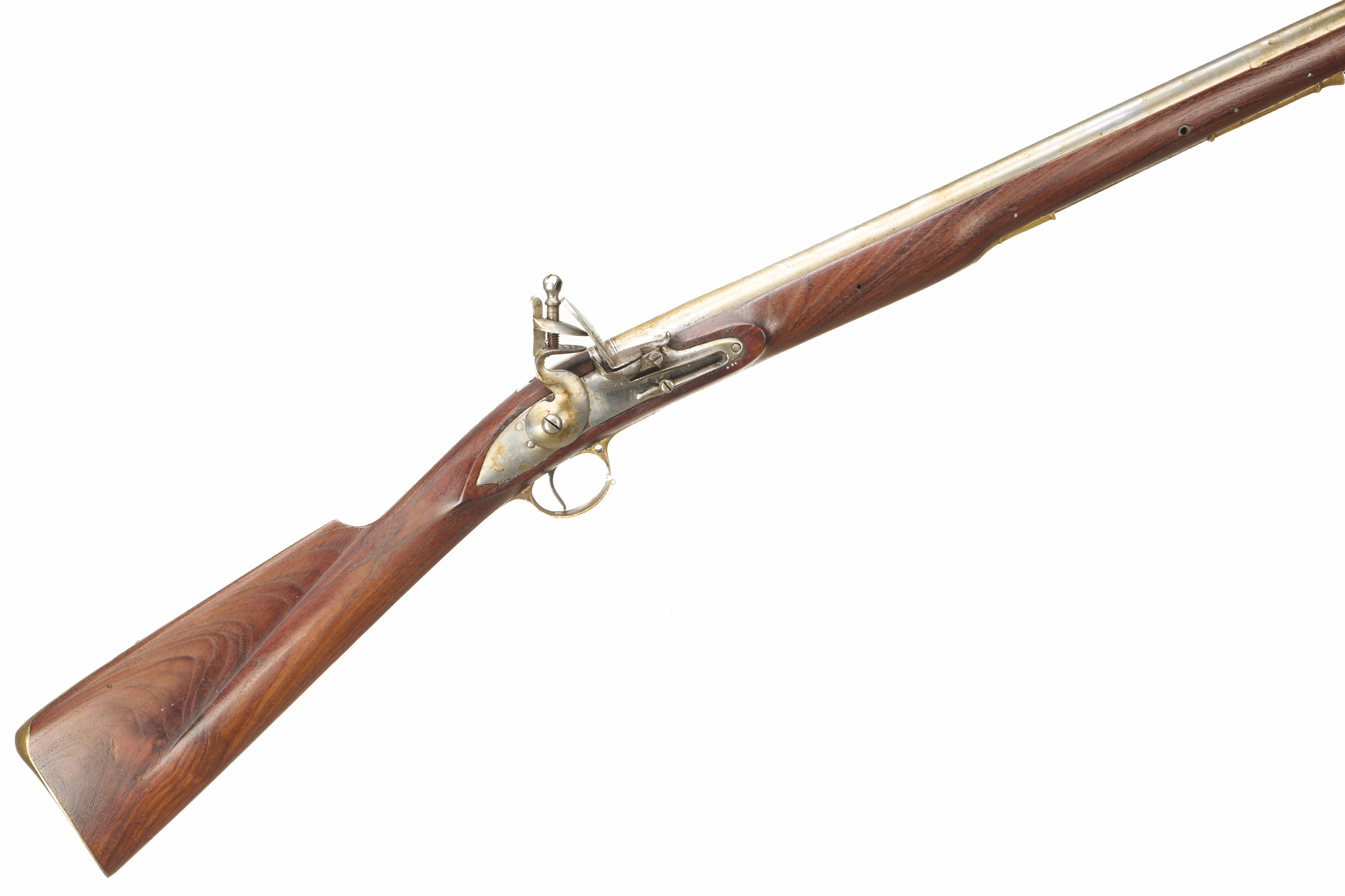 Brass butt plate, straight grip, full-length stock, brass end cap, ram rod, plain lock, swan-necked cock. Bead foresight, brass fittings throughout. Proved 1956.