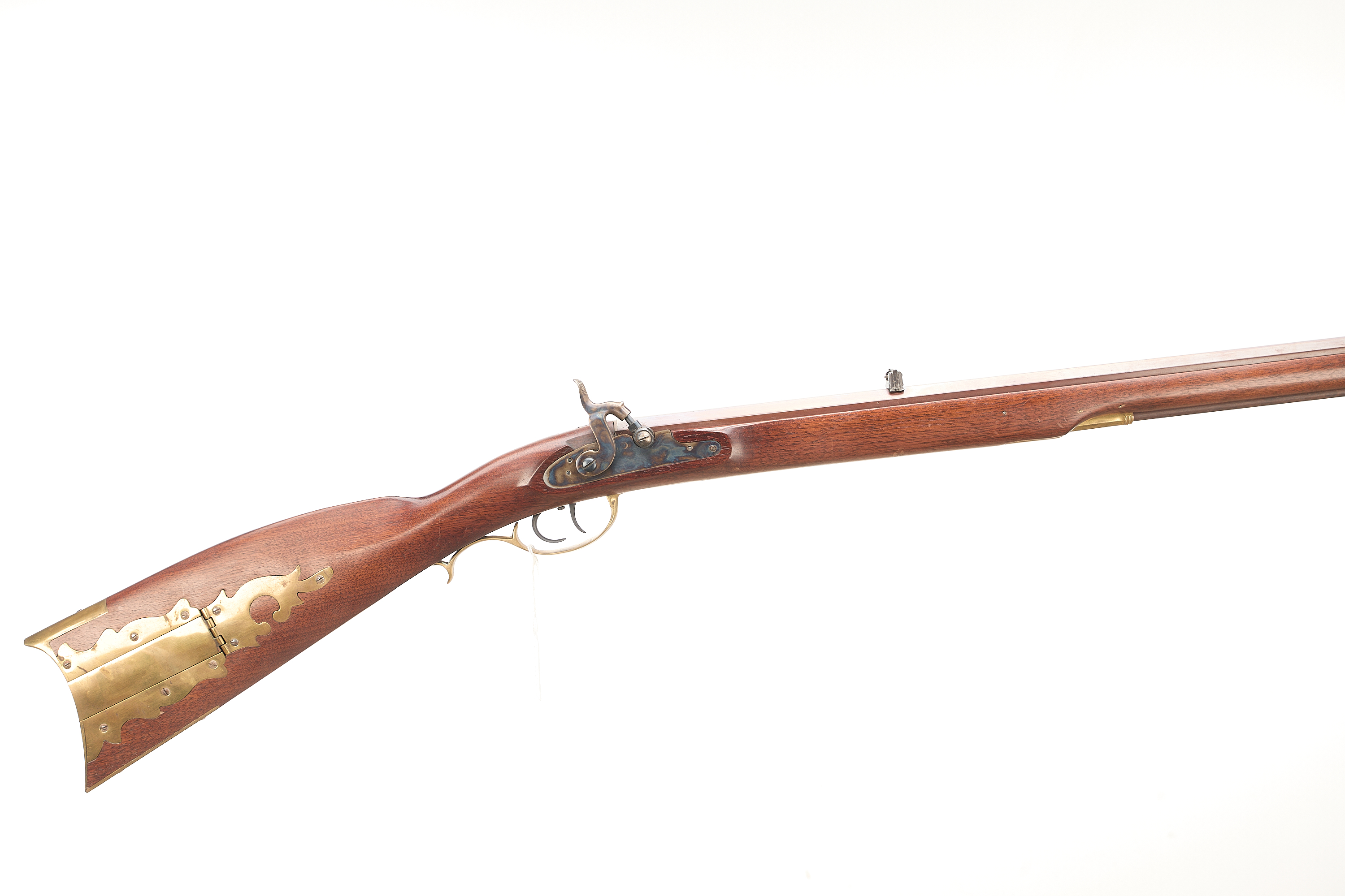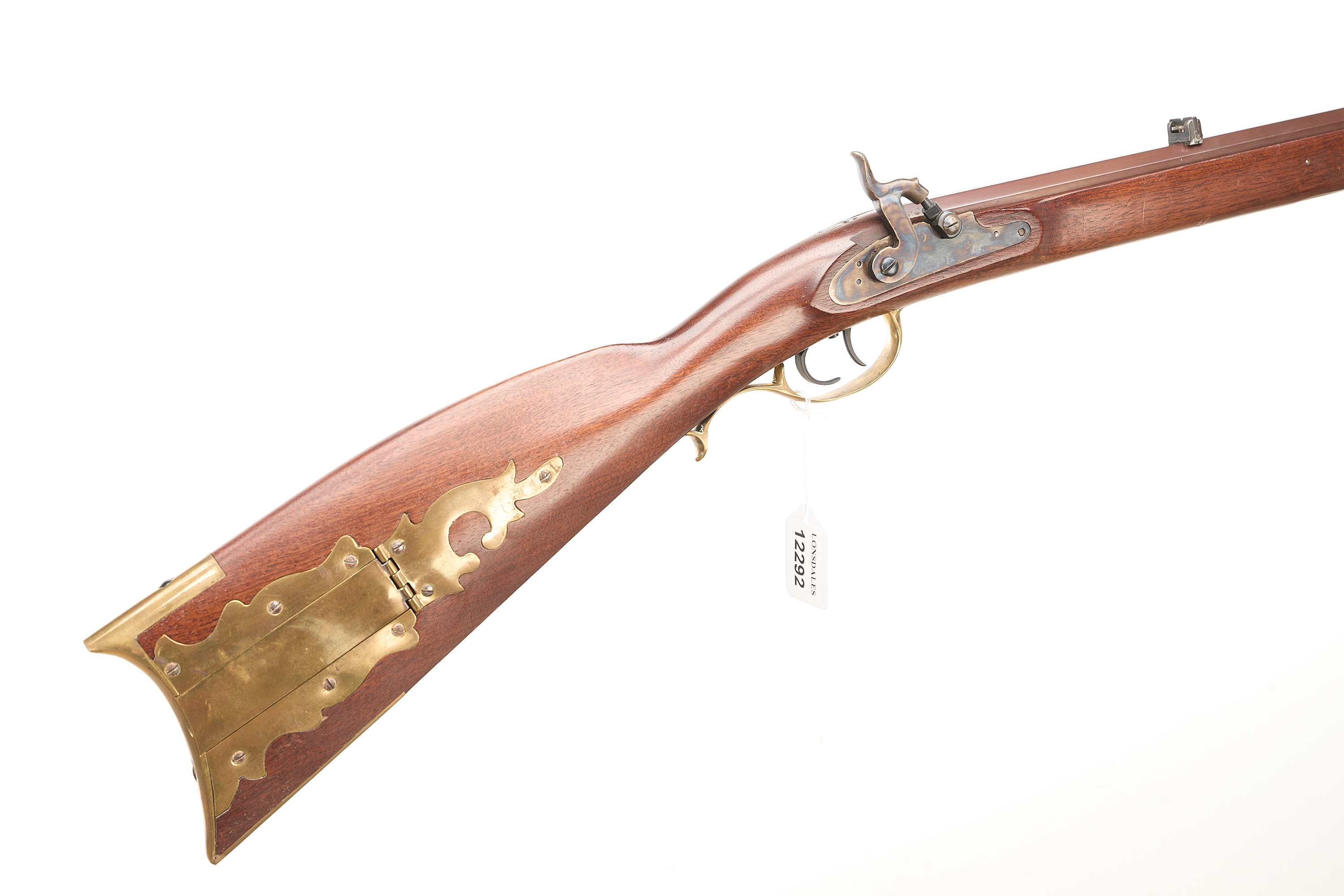 Brass butt plate with trap door detail. Browned octagonal barrel. Colour case hardened action. Post front sight, notch rear sight.