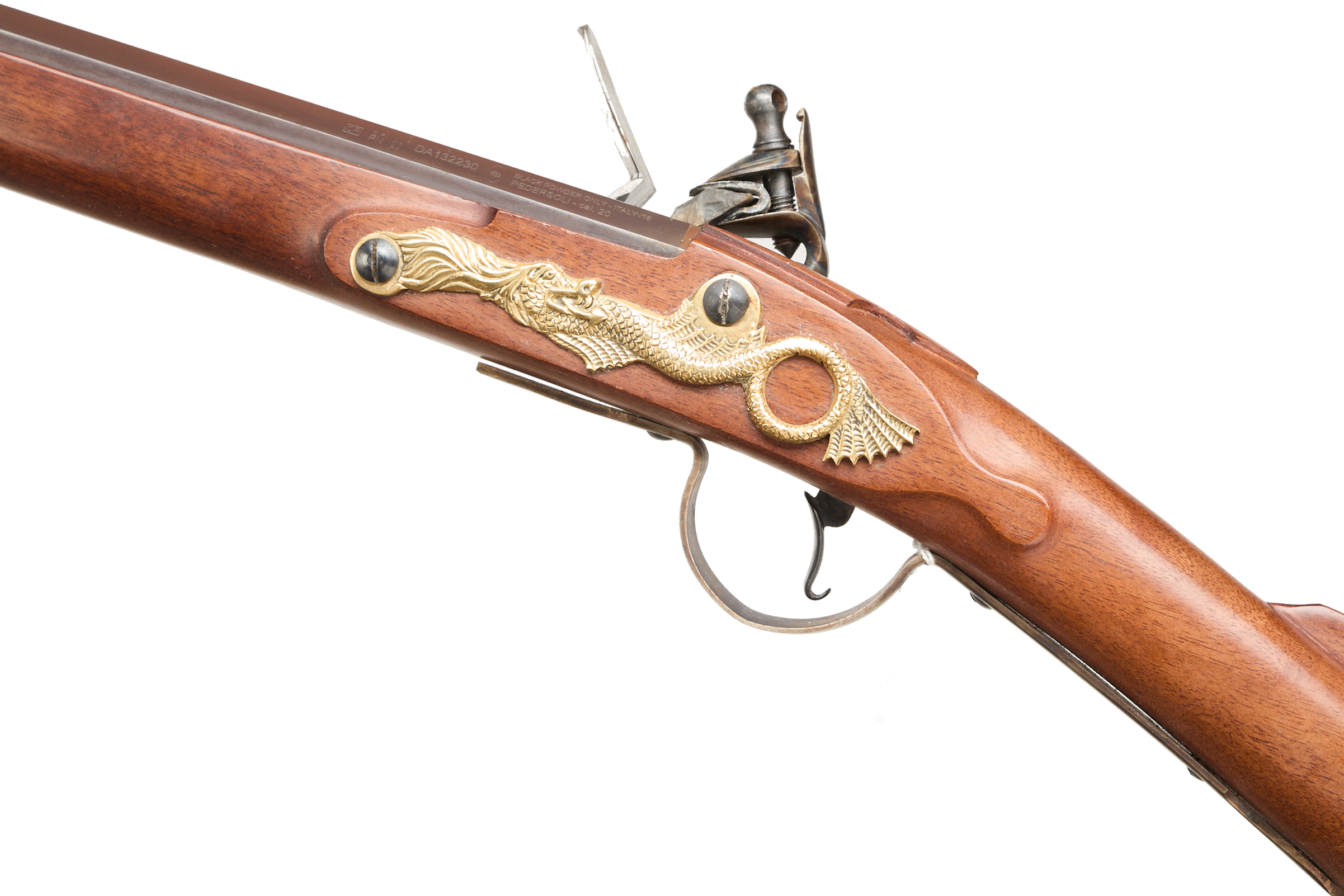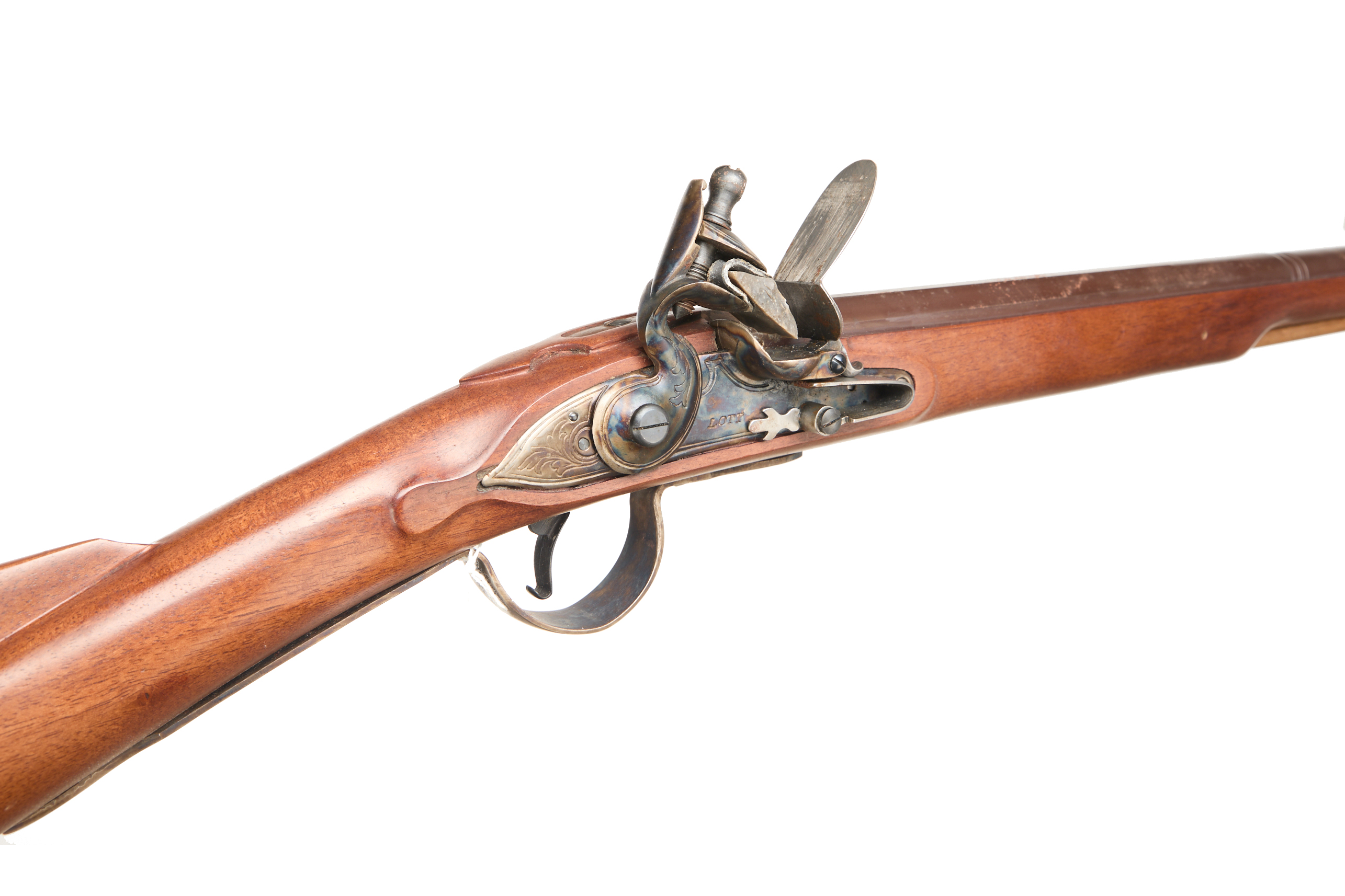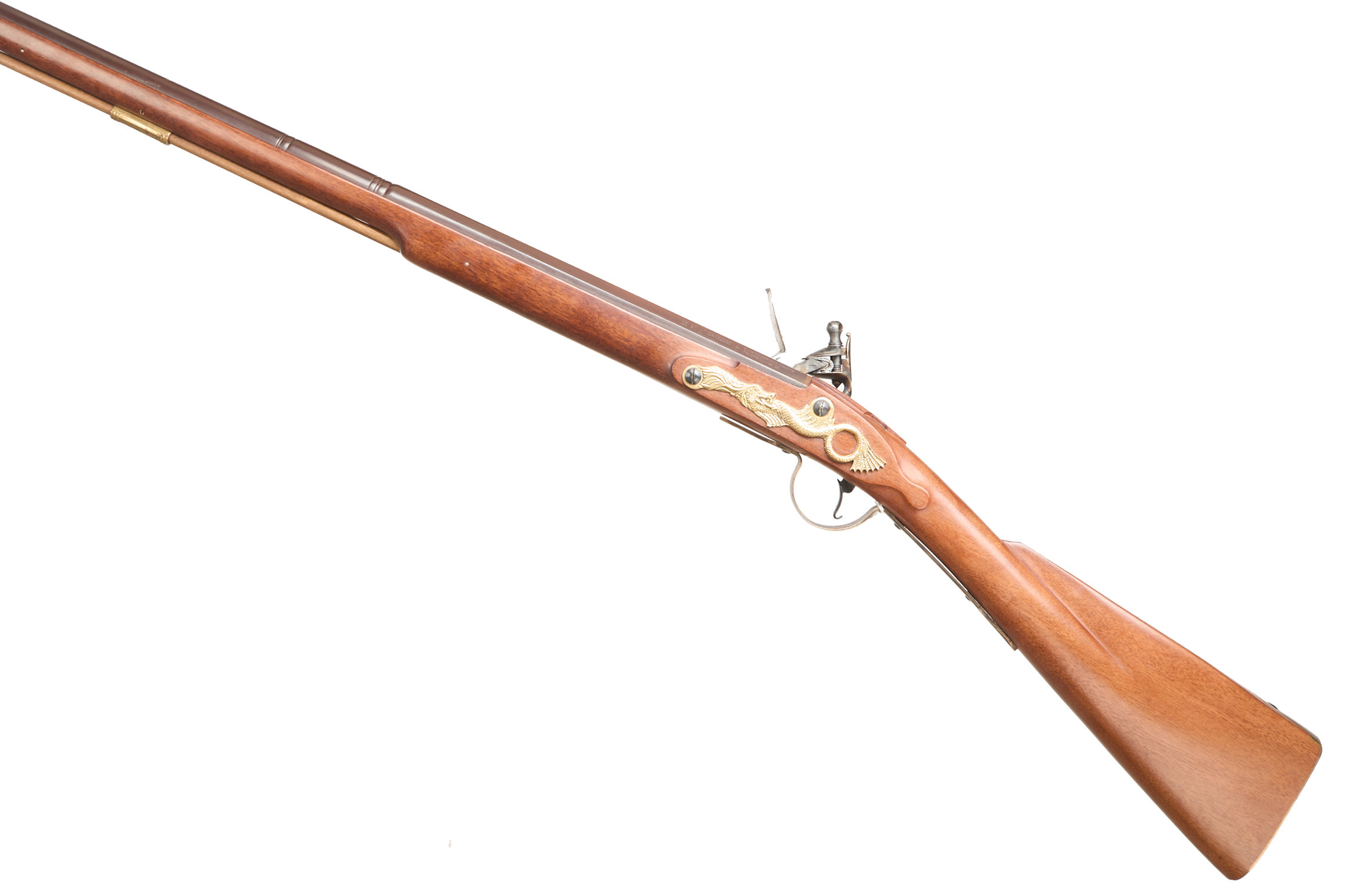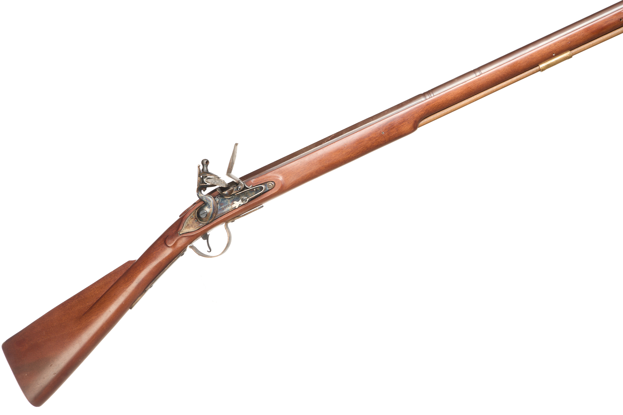 Brass butt plate, straight grip, full-length stock, ram rod, plain lock with brass highlight to left side, swan-necked cock. Post foresight, 2 stage barrel.
