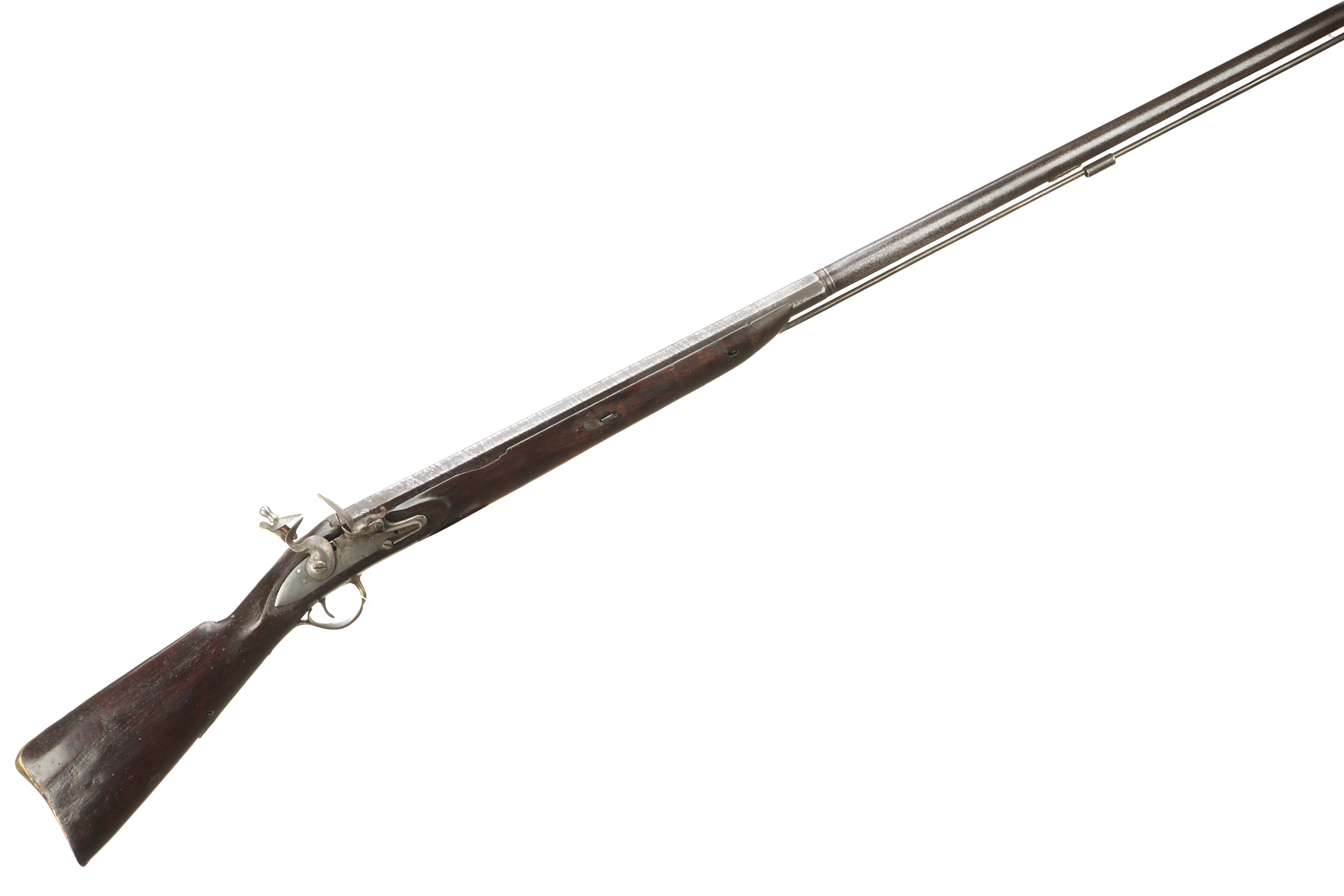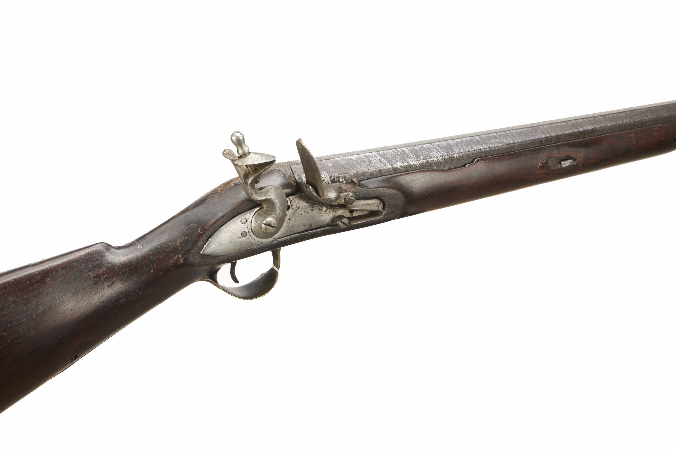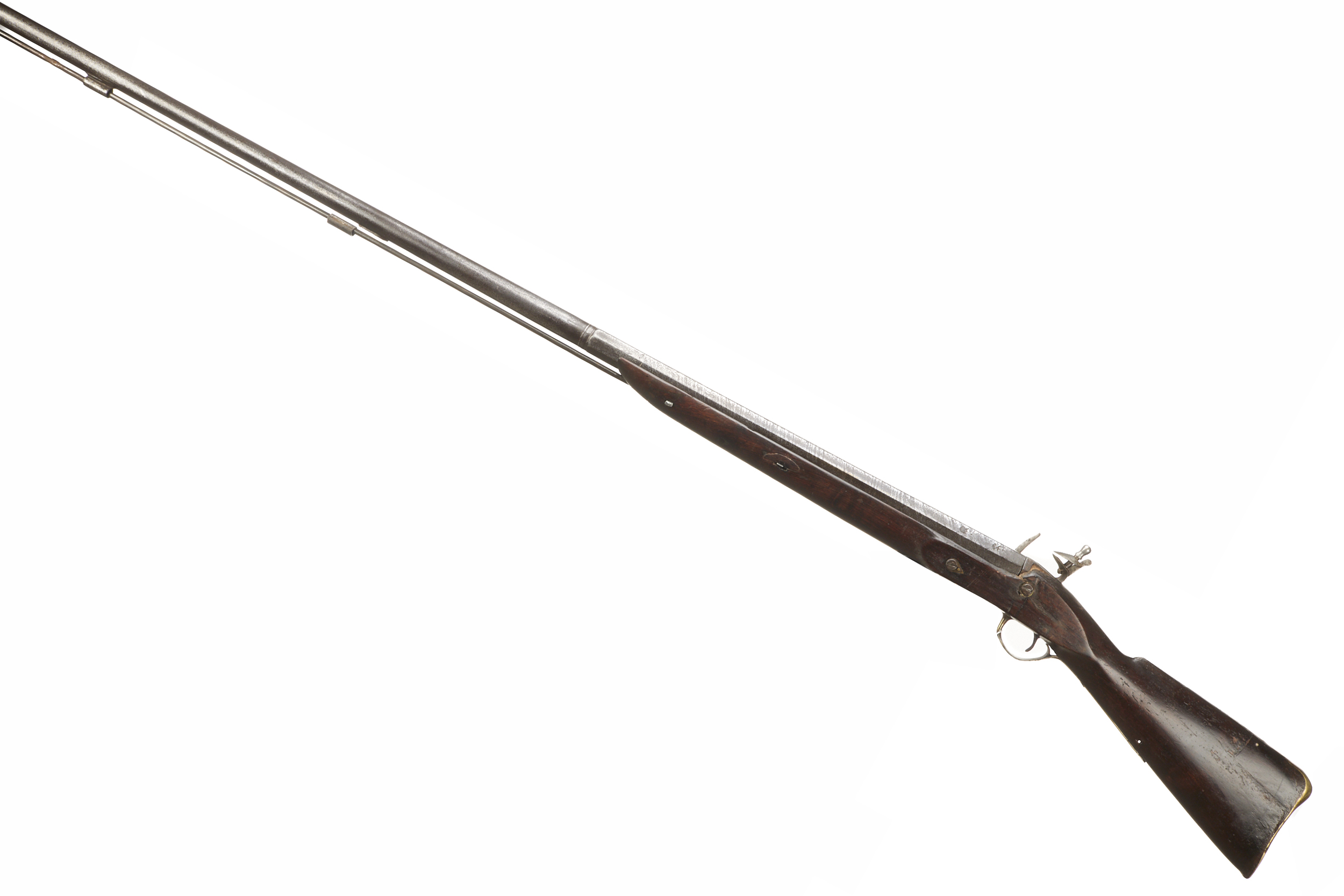 Brass butt plate, straight grip, 1/4-length stock, ram rod, 2 stage barrel, plain lock, swan-necked cock. Bead foresight. Original black powder proved early 19th century.