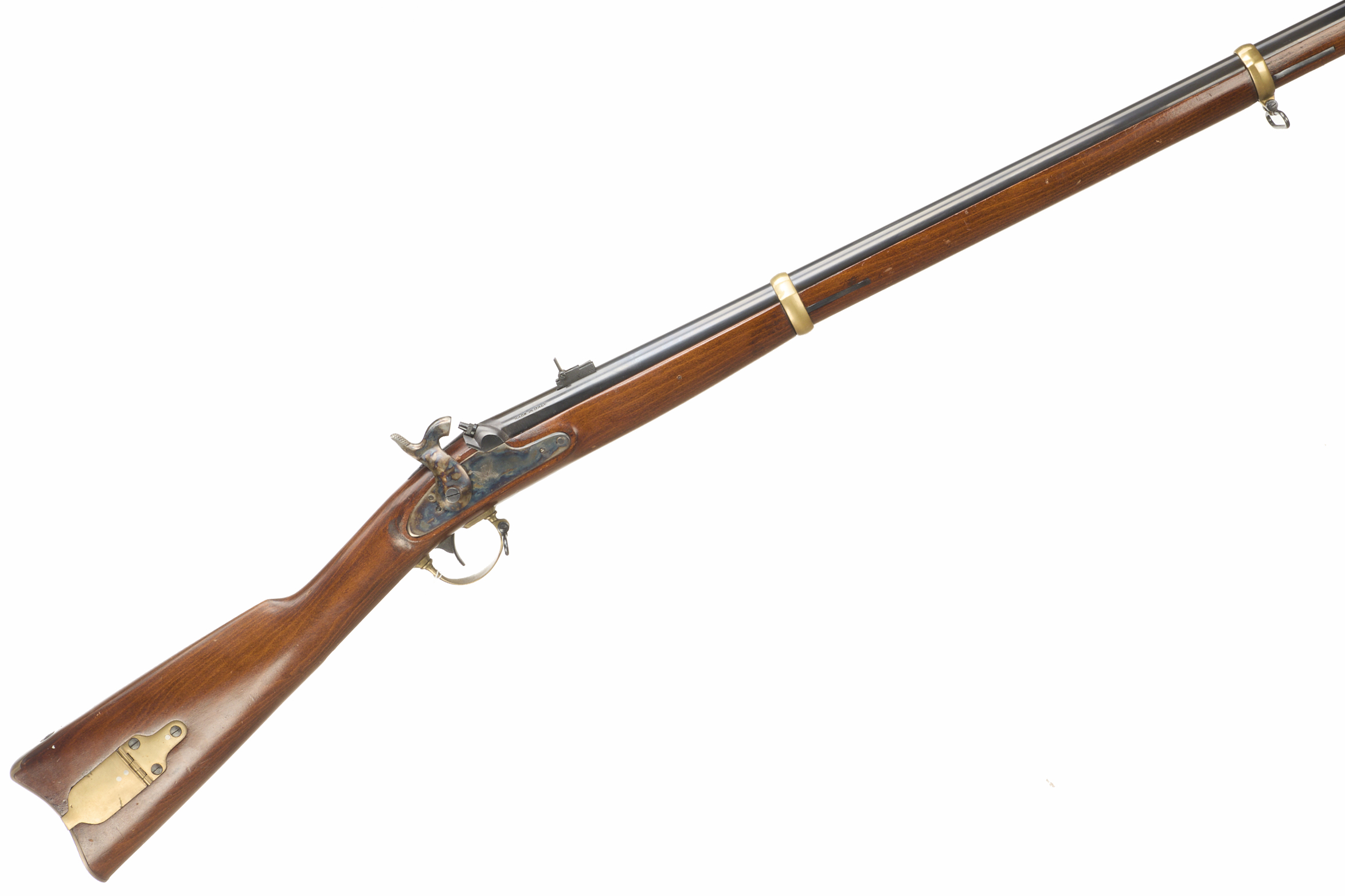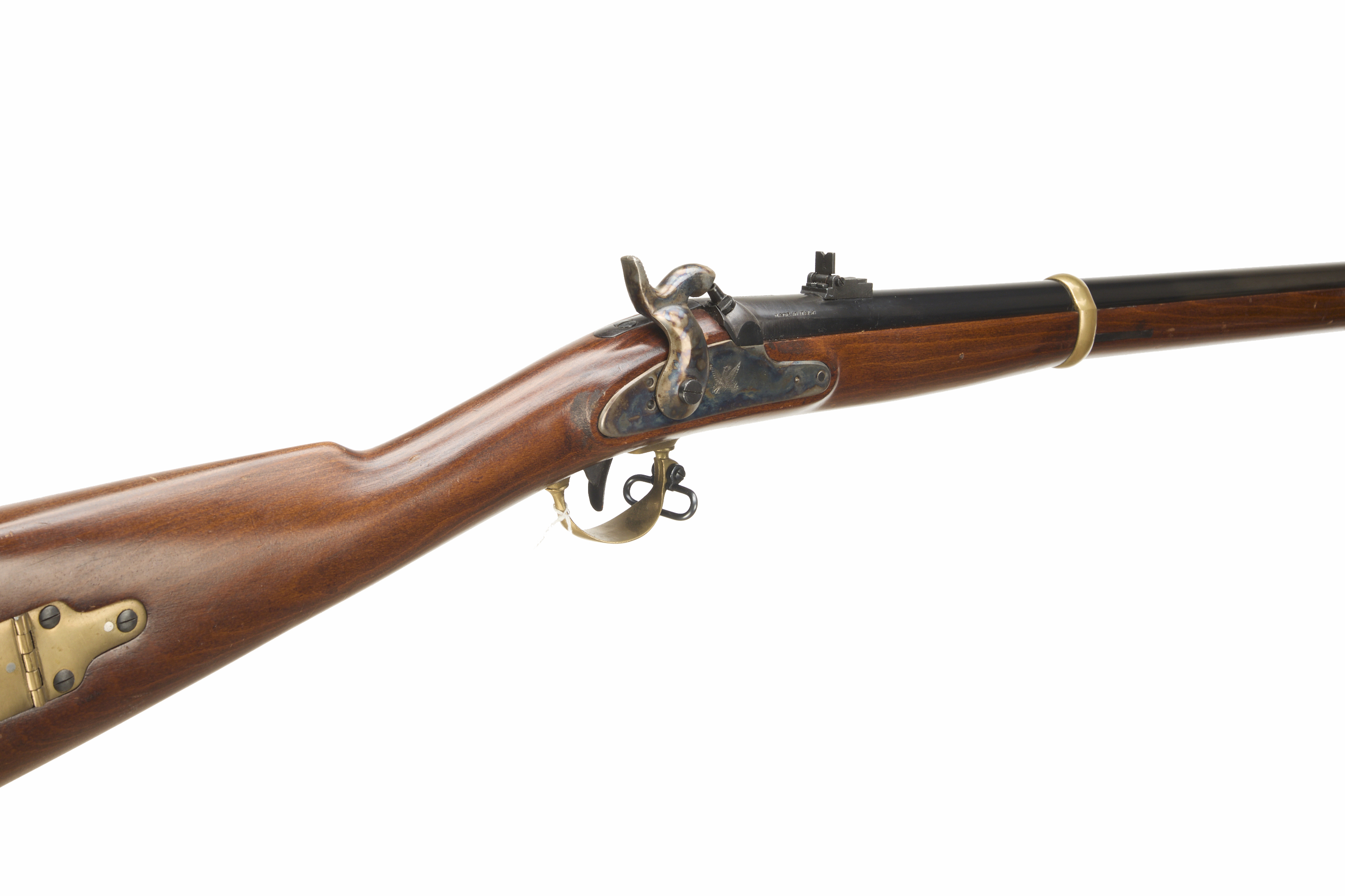 Brass butt plate, straight grip, 3/4-length stock, brass end cap, 2 barrel bands plain lock, swan-necked cock. Bead foresight, ladder rearsight , brass fittings throughout.