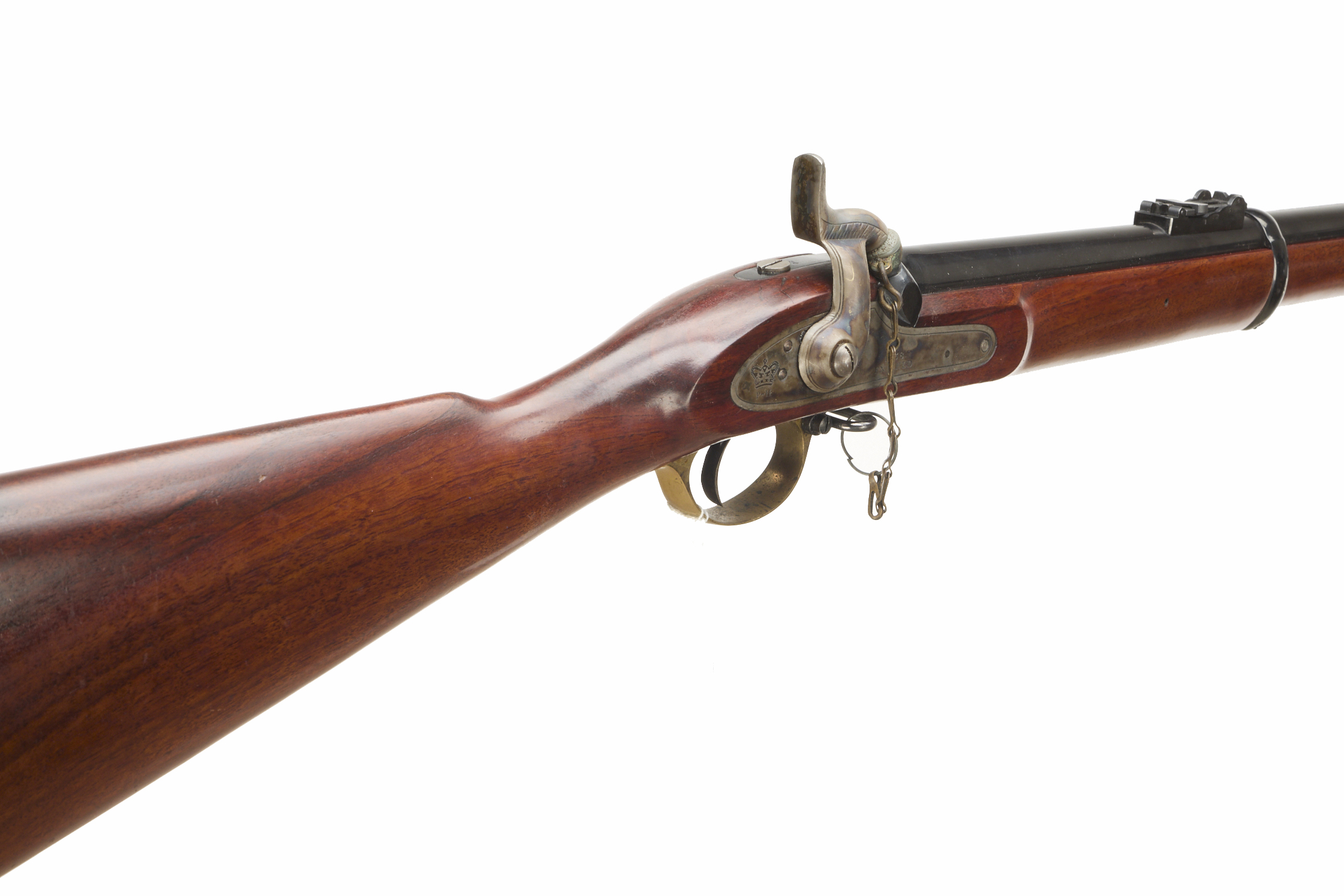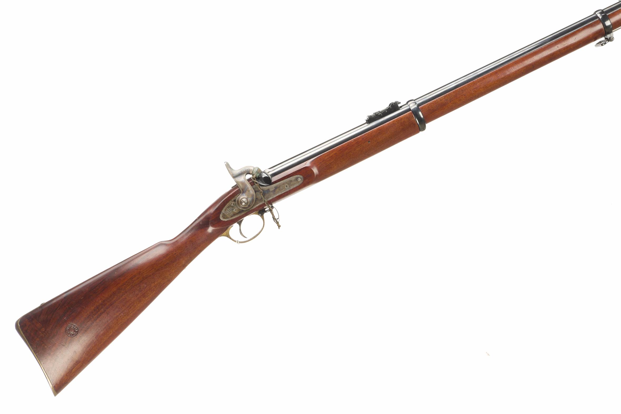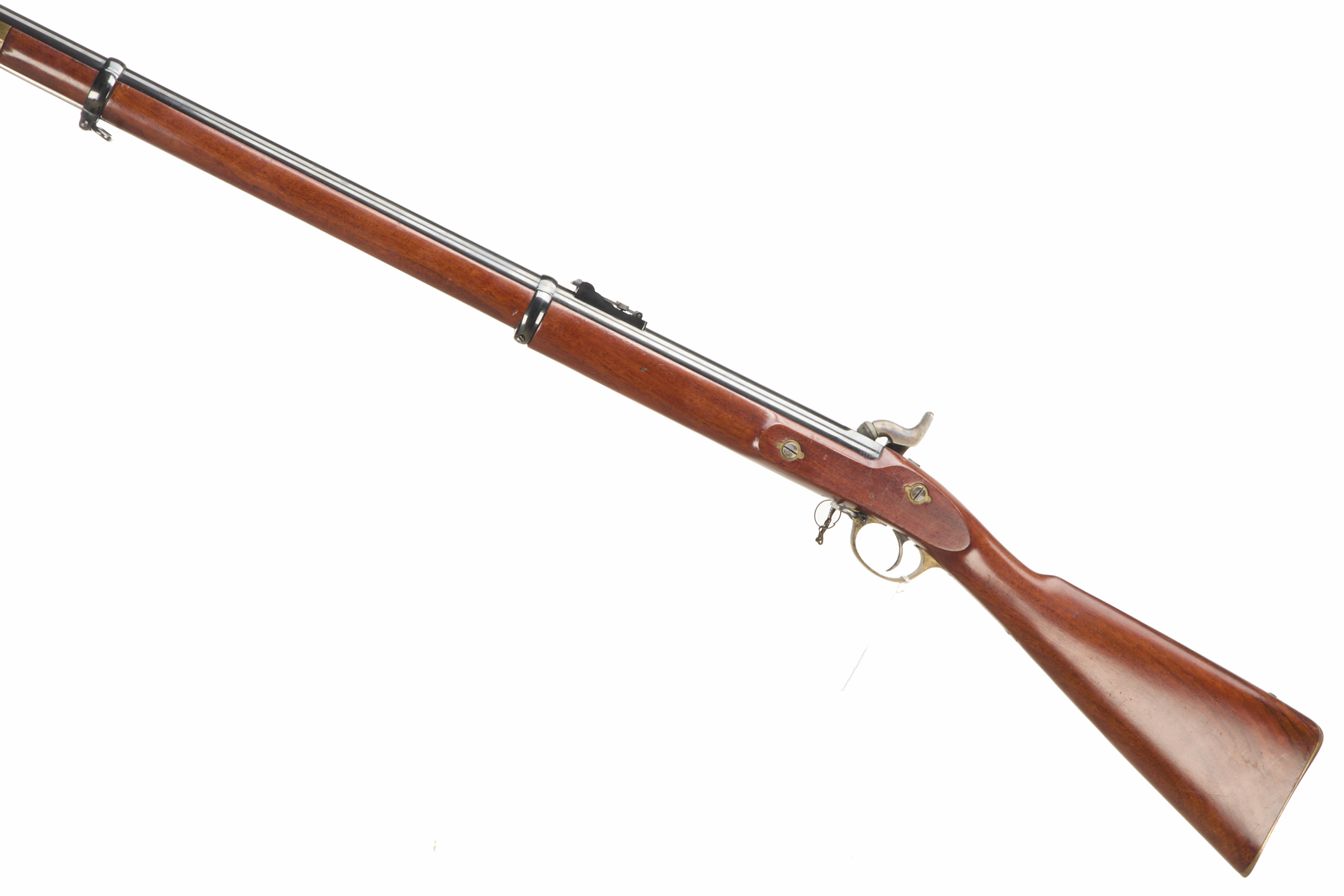 Brass butt plate, straight grip, 3/4-length stock, brass end cap, 2 barrel bands plain lock, swan-necked cock. Bead foresight, ladder rearsight , brass fittings throughout. Proved.